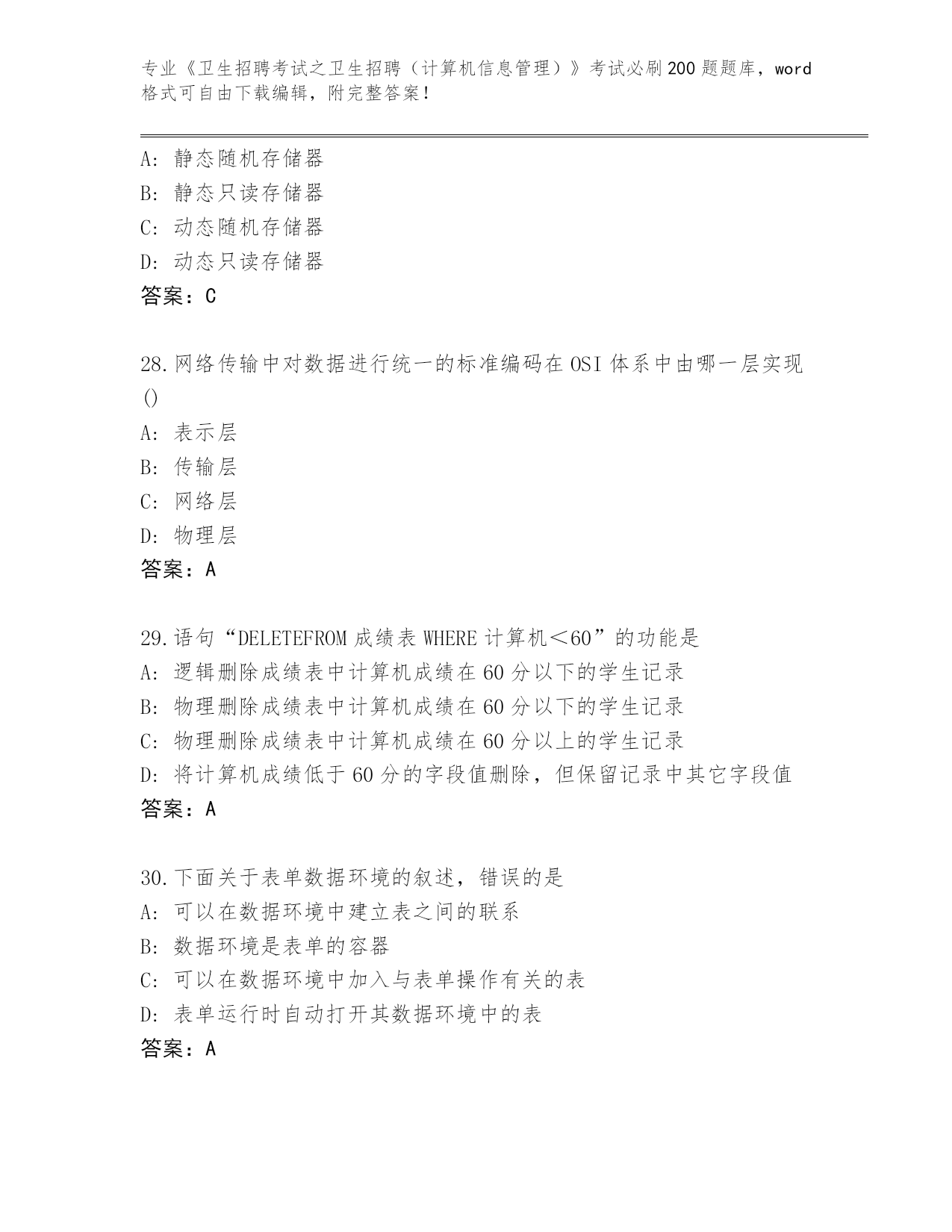 内部使用河南省卫滨区《卫生招聘考试之卫生招聘(计算机信息管理)》考试必刷200题题库带答案(预热题)