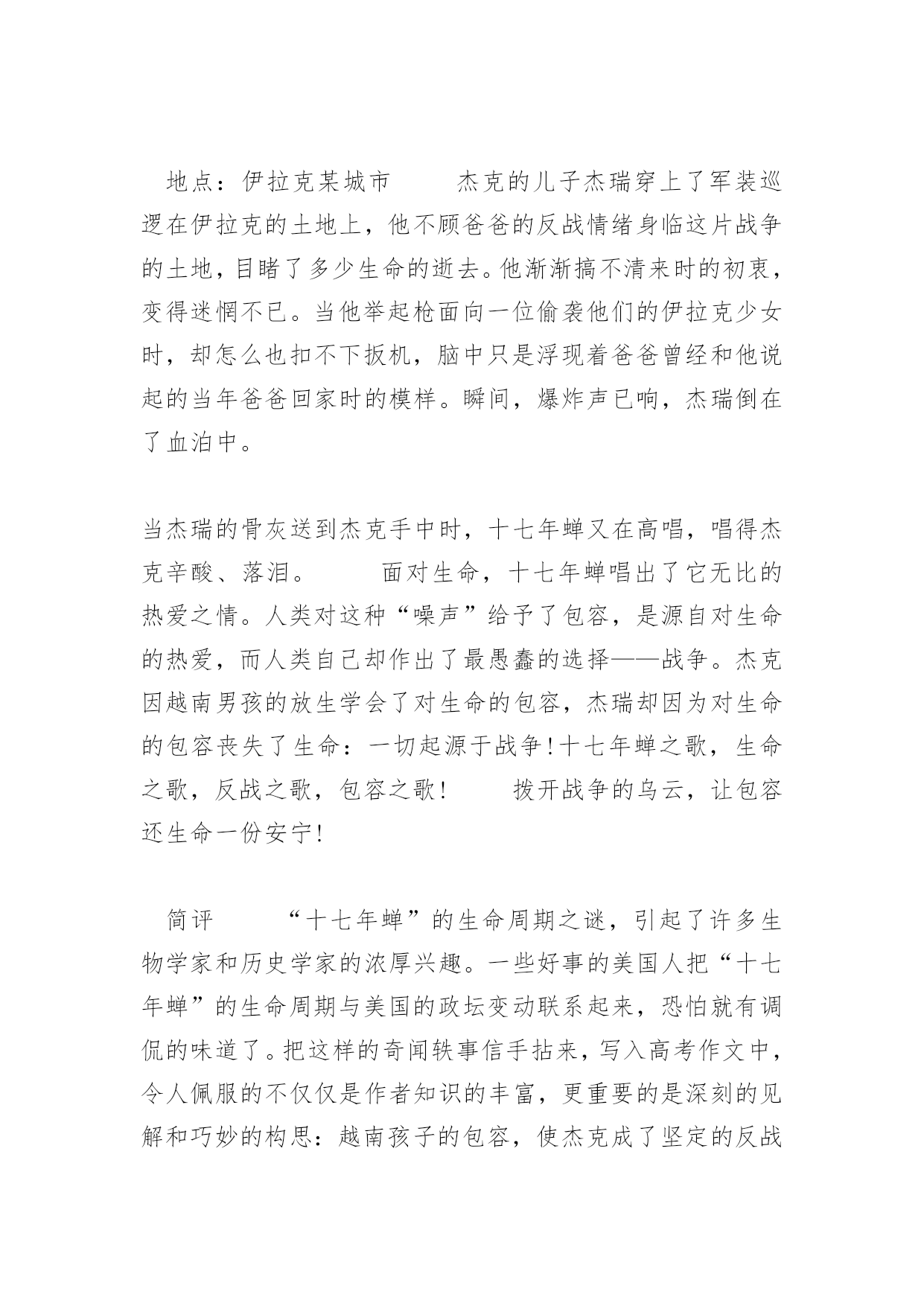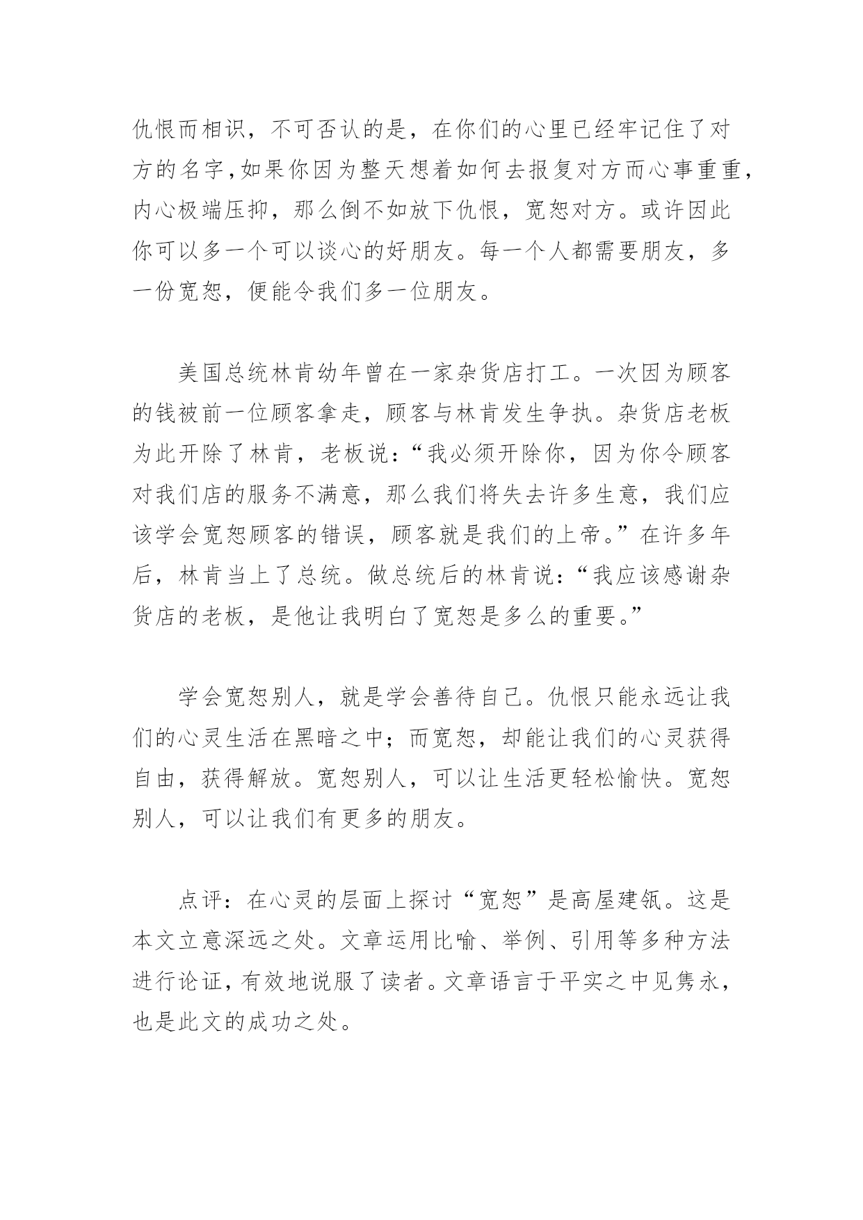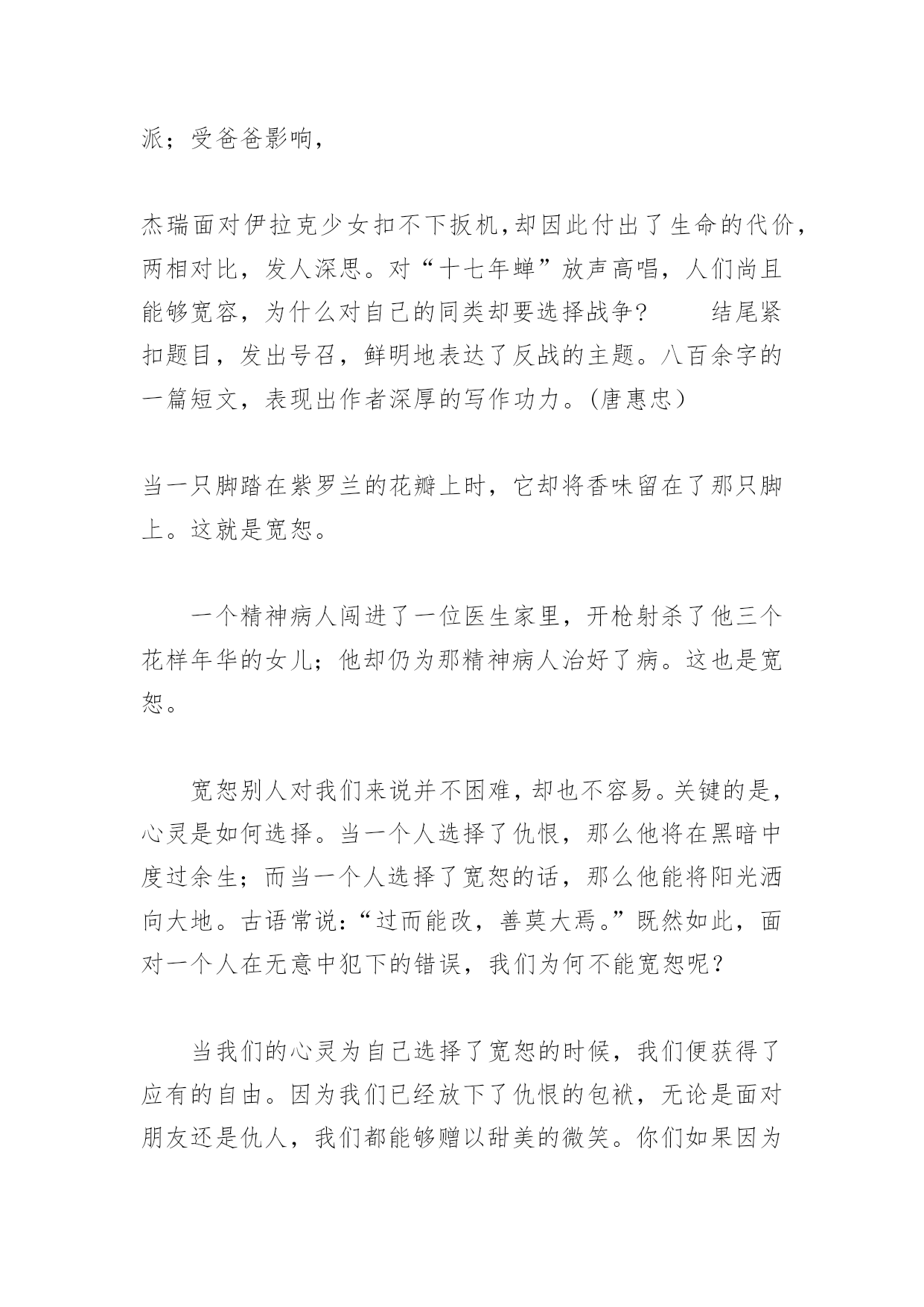 高考满分作文宽容高考满分作文宽容时隔十七年,美国本土的“十七年蝉”又跃上了枝头,放声高歌。人们也许无法忍受这突如其来的躁动。而一位评论家曾说:“谁又能阻止这些在黑暗中等待了十七年的生命,在阳光下为生命欢歌呢?”一时间:美国发动的越战期间地点:越南的某个村庄美国大兵杰克是美军陆战队的一员,由于美国陷入越战之中无法自拔,杰克已经多年不见故土、亲人。一次巡查之中,杰克的分队受到越军的突袭,杰克因负伤脱离了队伍,受到越军的追捕。杰克在丛林的掩护下仓皇逃窜,跑着跑着没了道路,前面只是一座已被收起的吊桥。杰克心中顿时感到了生命将尽的恐慌。此时,一个十六七岁的越南小男孩出现在吊桥的另一头。“举起枪,胁迫他放下吊桥,该死的越佬!”杰克心生一计,可在他举枪之前,小男孩却放下了吊桥。无暇多想,杰克立即冲了过去。他接近了小男孩,手中仍举着枪。小男孩瑟瑟发抖,只是在说:“我想你活着!”杰克仿佛看到了弟弟在给自己祈祷的面庞……之后,杰克因负伤被遣送回国,正是1970年十七年蝉枝头高歌的日子,这歌声在杰克心中是如此甜美。二时间:2004年地点:伊拉克某城市杰克的儿子杰瑞穿上了军装巡逻在伊拉克的土地上,他不顾爸爸的反战情绪身临这片战争的土地,目睹了多少生命的逝去。他渐渐搞不清来时的初衷,变得迷惘不已。当他举起枪面向一位偷袭他们的伊拉克少女时,却怎么也扣不下扳机,脑中只是浮现着爸爸曾经和他说起的当年爸爸回家时的模样。瞬间,爆炸声已响,杰瑞倒在了血泊中。当杰瑞的骨灰送到杰克手中时,十七年蝉又在高唱,唱得杰克辛酸、落泪。面对生命,十七年蝉唱出了它无比的热爱之情。人类对这种“噪声”给予了包容,是源自对生命的热爱,而人类自己却作出了最愚蠢的选择——战争。杰克因越南男孩的放生学会了对生命的包容,杰瑞却因为对生命的包容丧失了生命:一切起源于战争!十七年蝉之歌,生命之歌,反战之歌,包容之歌!拨开战争的乌云,让包容还生命一份安宁!简评“十七年蝉”的生命周期之谜,引起了许多生物学家和历史学家的浓厚兴趣。一些好事的美国人把“十七年蝉”的生命周期与美国的政坛变动联系起来,恐怕就有调侃的味道了。把这样的奇闻轶事信手拈来,写入高考作文中,令人佩服的不仅仅是作者知识的丰富,更重要的是深刻的见解和巧妙的构思:越南孩子的包容,使杰克成了坚定的反战派;受爸爸影响,杰瑞面对伊拉克少女扣不下扳机,却因此付出了生命的代价,两相对比,发人深思。对“十七年蝉”放声高唱,人们尚且能够宽容,为什么对自己的同类却要选择战争?结尾紧扣题目,发出号召,鲜明地表达了反战的主题。八百余字的一篇短文,表现出作者深厚的写作功力。(唐惠忠)当一只脚踏在紫罗兰的花瓣上时,它却将香味留在了那只脚上。这就是宽恕。一个精神病人闯进了一位医生家里,开枪射杀了他三个花样年华的女儿;他却仍为那精神病人治好了病。这也是宽恕。宽恕别人对我们来说并不困难,却也不容易。关键的是,心灵是如何选择。当一个人选择了仇恨,那么他将在黑暗中度过余生;而当一个人选择了宽恕的话,那么他能将阳光洒向大地。古语常说:“过而能改,善莫大焉。”既然如此,面对一个人在无意中犯下的错误,我们为何不能宽恕呢?当我们的心灵为自己选择了宽恕的时候,我们便获得了应有的自由。因为我们已经放下了仇恨的包袱,无论是面对朋友还是仇人,我们都能够赠以甜美的微笑。你们如果因为仇恨而相识,不可否认的是,在你们的心里已经牢记住了对方的名字,如果你因为整天想着如何去报复对方而心事重重,内心极端压抑,那么倒不如放下仇恨,宽恕对方。或许因此你可以多一个可以谈心的好朋友。每一个人都需要朋友,多一份宽恕,便能令我们多一位朋友。美国总统林肯幼年曾在一家杂货店打工。一次因为顾客的钱被前一位顾客拿走,顾客与林肯发生争执。杂货店老板为此开除了林肯,老板说:“我必须开除你,因为你令顾客对我们店的服务不满意,那么我们将失去许多生意,我们应该学会宽恕顾客的错误,顾客就是我们的上帝。”在许多年后,林肯当上了总统。做总统后的林肯说:“我应该感谢杂货店的老板,是他让我明白了宽恕是多么的重要。”学会宽恕别人,就是学会善待自己。仇恨只能永远让我们的心灵生活在黑暗之中;而宽恕,却能让我们的心灵获得自由,获得解放。宽恕别人,可以让生活更轻松愉快。宽恕别人,可以让我们有更多的朋友。点评:在心灵的层面上探讨“宽恕”是高屋建瓴。这是本文立意深远之处。文章运用比喻、举例、引用等多种方法进行论证,有效地说服了读者。文章语言于平实之中见隽永,也是此文的成功之处。