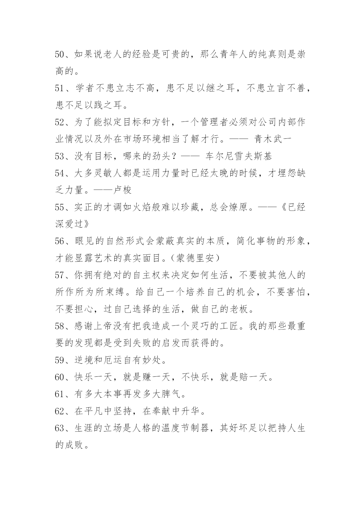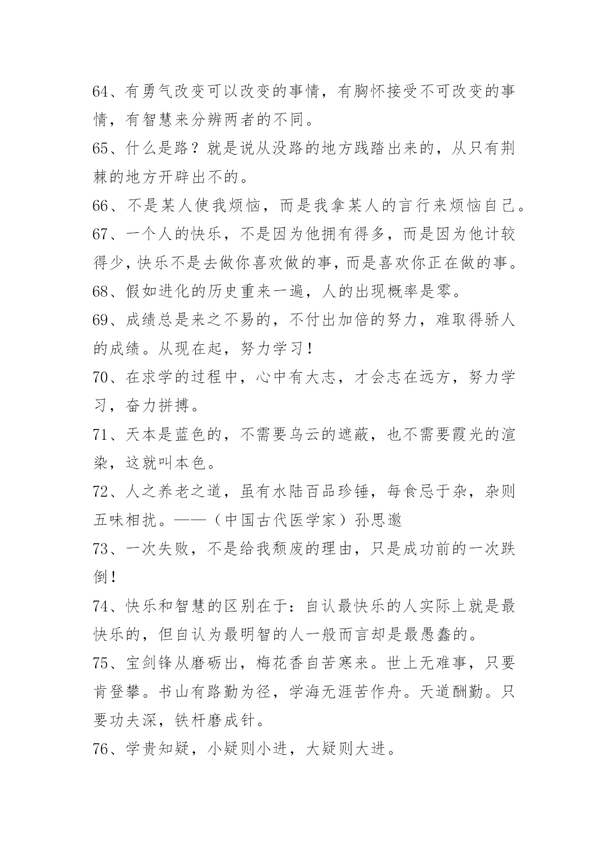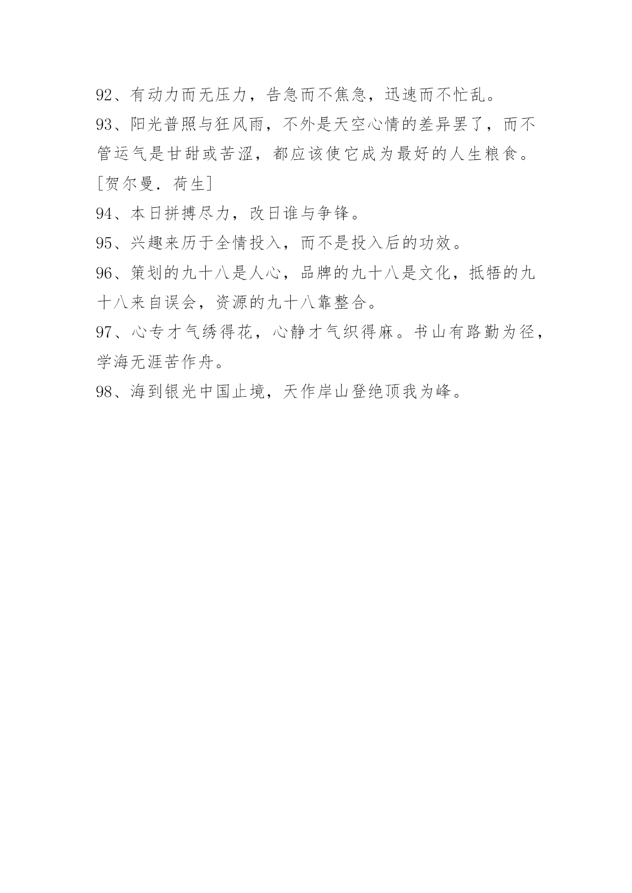 常用励志的格言98条常用励志的格言汇编98条心有多大,舞台就有多大。以下是小编帮大家整理的励志的格言98条,欢迎大家分享。1、优质服务,追求卓越。2、阅读一本不适合自己阅读的书,比不阅读还要坏。我们必须学会这样的本领:选择最有价值、最适合自己所需要的读物。——[俄国]别林斯基3、相思就像许多小音符,密密麻麻爬满在心底。虽然相隔两地,思念,却在乐声中传递,随着风飘到你窗前。4、重为轻根,静为躁君。轻则失根,躁则失君。5、上德不德,是以有德;下德不失德,是以无德。上德无为而无以为;下德无为而有以为。上仁为之而无以为;上义为之而有以为。上礼为之而莫之应,则攘臂而扔之。故失道而后德,失德而后仁,失仁而后义,失义而后礼。6、天下万物生于有,有生于无。7、个人是微弱的,整体就是力量。8、两朵浪花一碰,便漫成一片汪洋。9、怀抱理想,追寻梦想,让自己的生活充满希望。10、文学是人的生活的教科书。——车尔尼雪夫斯基11、乌云过后阳光更欢,不和之后爱情愈甜。——拉丁语12、运动的作用代替药物,但所有的药物都不能代替运动。13、行走在智慧中的女人最美丽,而要得到智慧就要参与一个智慧的环境,在里面学习提高,只有学习,才不会被淘汰!因为竞争太激烈了,已经竞争到家庭了!14、心态决定状态——闭上眼睛就睡,睁开眼睛就吃,身体状态非常好,这就挺幸福。15、坦诚相见,才能心心相印。16、少之时,血气未定,戒之在色;及其壮也,血气方刚,戒之在斗;及其老也,血气既衰,戒之在得。17、父爱是一座山,高大威严;父爱是一汪水,深藏不露;父爱更是一双手,抚摸着我们走过春夏秋冬;而父爱更是一滴泪,一滴饱含温度的泪水。18、静坐当思己过,闲谈莫论人非。19、忧劳可以兴国,逸豫可以亡身。——《新五代史》20、别成为你当初最厌恶的人。21、想得好是聪明,计划得好更聪明,做得好是最聪明又最好。22、认为痛苦是最大的不幸,是不可能勇敢的;认为享受是最大的幸福的人,是不可能有节制的。——西塞罗23、解铃还需系铃人,躲避责任会解决不了任何问题,它只导致一个失败的人生。24、人生就像一盒巧克力,你永远不知道你会吃到什么口味,每天都要吃点苦的东西,以免忘记苦味。25、再耀眼的骄阳,也有落下来的时候,何况是人呢?26、没什么可以让你倒下,除非你自己不愿意站起来。27、一切真正美好的东西都是从斗争和牺牲中获得的,而美好的将来也要以同样的方法来获取。28、性命的好处是在于活得充实,而不是在于活得长久。29、开拓者朝着理想的目标前进,踩在荆棘、泥泞上,生活也充满着欢乐。30、活着,其实就是一次远行。遥远的路途,坎坷崎岖,难以预设难以掌握,但风景依然心依然;一路的奔波,尽管劳碌,难以寄托难以言说,可不再重来也回不到最初;许是越走越累,许是越走越轻松,许是越走越无奈,可总得要走,不停的走,一直朝前走。不怕陌路,不怕没有路,因为脚下就是路,路的旁边也是路。31、勇气很有理由被当作人类德性之首,因为这种德性保证了所有其余德性。32、唯一的阻碍,不是不能改变自己,也不是改变的困难,而是我们不要改变。现在就是开始的时候了——你可以像一般成功快乐的人那样,好好地发挥自卑感原有的作用,利用它,不懈努力,获得更多更丰富的生活。33、戒傲戒惰,保家之道也。34、幸运的时机好比市场上的交易,只要你稍有延误,它就将掉价了。35、思想像胡须,不成熟就不可能长出来。36、教育应由法律规定,并且应是国家的事务。37、人生就像蒲公英,看似自由,却身不由己。有些事,不是不在意,而是在意了又能怎样。自己尽力了就好,人生没有如果,只有后果和结果。38、每一棵大树的成长都要理解阳光,也包容风雨。39、聪明人什么事情都能感悟出人生的道理,木头学什么理论也是木头,最多是个写满哲学的木头。40、默而识之,学而不厌,诲人不倦,何有於我哉?41、目标是所有成就的出发点。42、在科学上重要的是研究出来的"东西",不是研究者"个人"。——居里夫人43、离别,能使浅薄的感情削弱,却使深挚的感情更加深厚,正如风能吹灭烛光,却会把火扇得更旺。流水匆匆,岁月匆匆,唯有友情永存心中。朋友,再见!朋友,珍重!44、分享是一种思想的深度,深思的同时,你分享了朋友的痛苦。45、一个人如果对待陌生人亲切而有礼貌,那他必须是一位真诚而富有同情心的`好人,他的心常和别人的心联系在一齐,而不是孤立的。46、知道自己的起跑点及目的地,想出最适合自己的方式,按部就班跑向目的地。47、只要我们善于开动脑筋,认识自己,就能找到自已的优势,打开你人生的突破口。48、人之所以伟大,是因为他与别人共处逆境时,别人失去了信心,他却下决心实现自己的目标。49、内容丰富的言辞就像闪闪发光的珠子。真正聪明睿智的却是言辞简短的。——培根50、如果说老人的经验是可贵的,那么青年人的纯真则是崇高的。