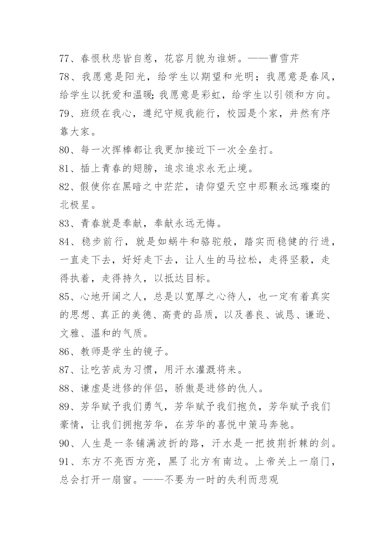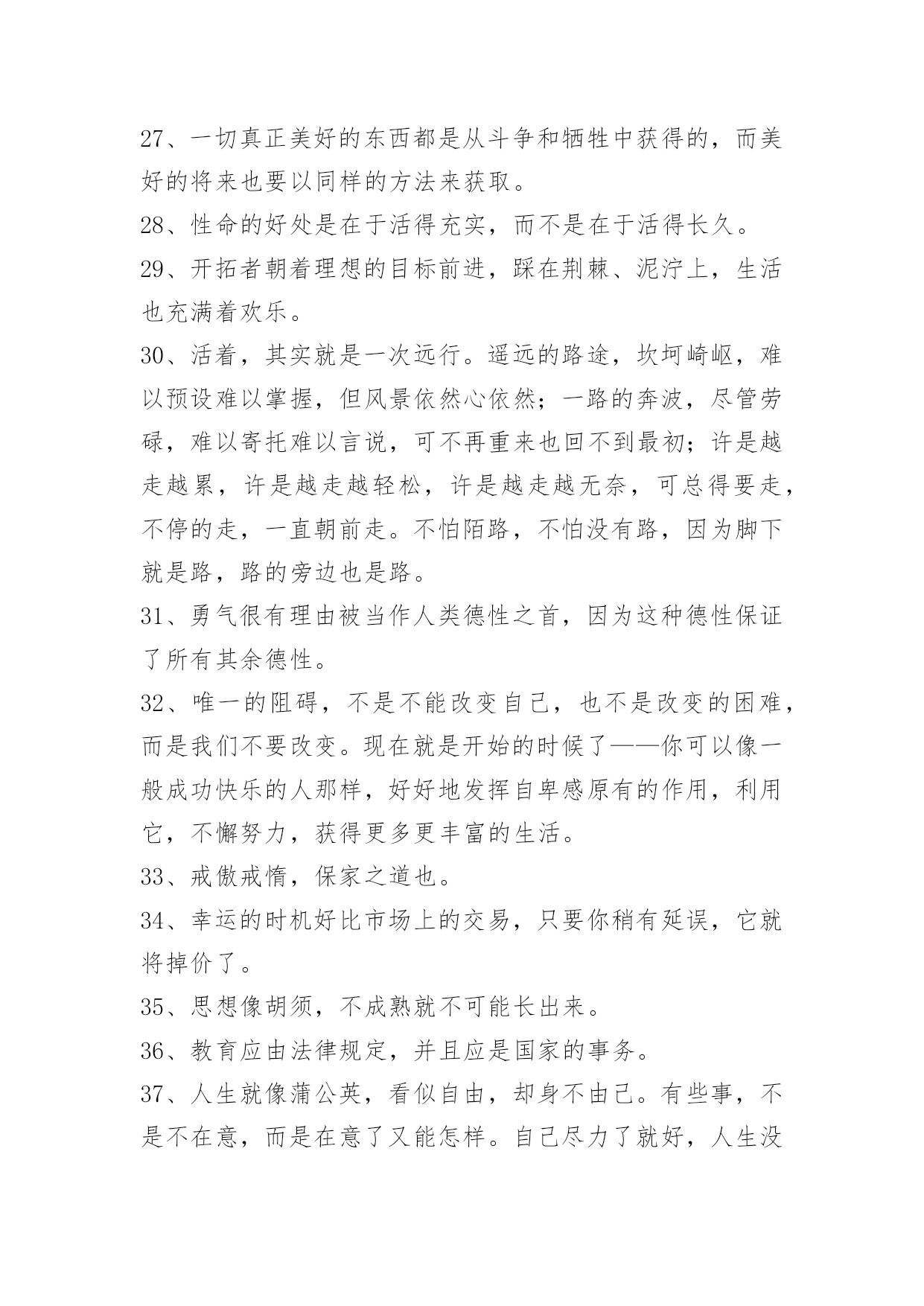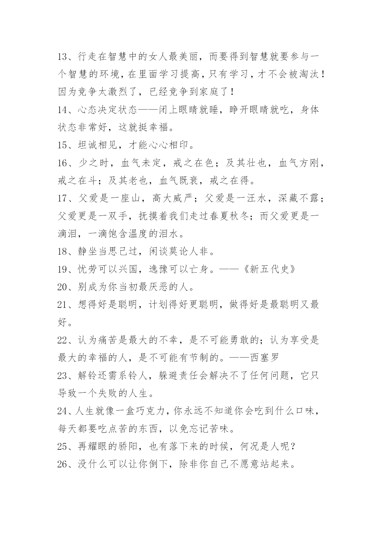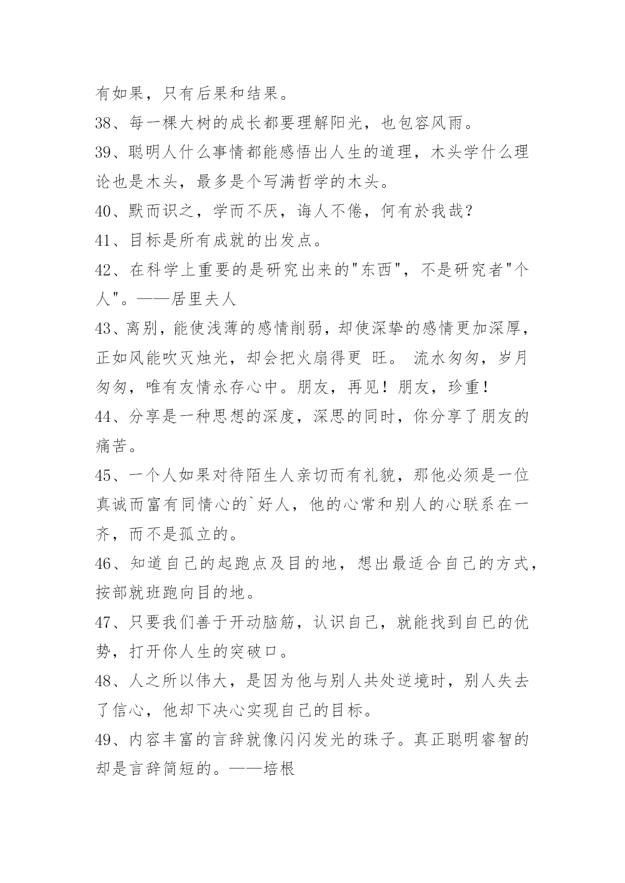 常用励志的格言98条常用励志的格言汇编98条心有多大,舞台就有多大。以下是小编帮大家整理的励志的格言98条,欢迎大家分享。1、优质服务,追求卓越。2、阅读一本不适合自己阅读的书,比不阅读还要坏。我们必须学会这样的本领:选择最有价值、最适合自己所需要的读物。——[俄国]别林斯基3、相思就像许多小音符,密密麻麻爬满在心底。虽然相隔两地,思念,却在乐声中传递,随着风飘到你窗前。4、重为轻根,静为躁君。轻则失根,躁则失君。5、上德不德,是以有德;下德不失德,是以无德。上德无为而无以为;下德无为而有以为。上仁为之而无以为;上义为之而有以为。上礼为之而莫之应,则攘臂而扔之。故失道而后德,失德而后仁,失仁而后义,失义而后礼。6、天下万物生于有,有生于无。7、个人是微弱的,整体就是力量。8、两朵浪花一碰,便漫成一片汪洋。9、怀抱理想,追寻梦想,让自己的生活充满希望。10、文学是人的生活的教科书。——车尔尼雪夫斯基11、乌云过后阳光更欢,不和之后爱情愈甜。——拉丁语12、运动的作用代替药物,但所有的药物都不能代替运动。13、行走在智慧中的女人最美丽,而要得到智慧就要参与一个智慧的环境,在里面学习提高,只有学习,才不会被淘汰!因为竞争太激烈了,已经竞争到家庭了!14、心态决定状态——闭上眼睛就睡,睁开眼睛就吃,身体状态非常好,这就挺幸福。15、坦诚相见,才能心心相印。16、少之时,血气未定,戒之在色;及其壮也,血气方刚,戒之在斗;及其老也,血气既衰,戒之在得。17、父爱是一座山,高大威严;父爱是一汪水,深藏不露;父爱更是一双手,抚摸着我们走过春夏秋冬;而父爱更是一滴泪,一滴饱含温度的泪水。18、静坐当思己过,闲谈莫论人非。19、忧劳可以兴国,逸豫可以亡身。——《新五代史》20、别成为你当初最厌恶的人。21、想得好是聪明,计划得好更聪明,做得好是最聪明又最好。22、认为痛苦是最大的不幸,是不可能勇敢的;认为享受是最大的幸福的人,是不可能有节制的。——西塞罗23、解铃还需系铃人,躲避责任会解决不了任何问题,它只导致一个失败的人生。24、人生就像一盒巧克力,你永远不知道你会吃到什么口味,每天都要吃点苦的东西,以免忘记苦味。25、再耀眼的骄阳,也有落下来的时候,何况是人呢?26、没什么可以让你倒下,除非你自己不愿意站起来。27、一切真正美好的东西都是从斗争和牺牲中获得的,而美好的将来也要以同样的方法来获取。28、性命的好处是在于活得充实,而不是在于活得长久。29、开拓者朝着理想的目标前进,踩在荆棘、泥泞上,生活也充满着欢乐。30、活着,其实就是一次远行。遥远的路途,坎坷崎岖,难以预设难以掌握,但风景依然心依然;一路的奔波,尽管劳碌,难以寄托难以言说,可不再重来也回不到最初;许是越走越累,许是越走越轻松,许是越走越无奈,可总得要走,不停的走,一直朝前走。不怕陌路,不怕没有路,因为脚下就是路,路的旁边也是路。31、勇气很有理由被当作人类德性之首,因为这种德性保证了所有其余德性。32、唯一的阻碍,不是不能改变自己,也不是改变的困难,而是我们不要改变。现在就是开始的时候了——你可以像一般成功快乐的人那样,好好地发挥自卑感原有的作用,利用它,不懈努力,获得更多更丰富的生活。33、戒傲戒惰,保家之道也。34、幸运的时机好比市场上的交易,只要你稍有延误,它就将掉价了。35、思想像胡须,不成熟就不可能长出来。36、教育应由法律规定,并且应是国家的事务。37、人生就像蒲公英,看似自由,却身不由己。有些事,不是不在意,而是在意了又能怎样。自己尽力了就好,人生没有如果,只有后果和结果。38、每一棵大树的成长都要理解阳光,也包容风雨。39、聪明人什么事情都能感悟出人生的道理,木头学什么理论也是木头,最多是个写满哲学的木头。40、默而识之,学而不厌,诲人不倦,何有於我哉?41、目标是所有成就的出发点。42、在科学上重要的是研究出来的"东西",不是研究者"个人"。——居里夫人43、离别,能使浅薄的感情削弱,却使深挚的感情更加深厚,正如风能吹灭烛光,却会把火扇得更旺。流水匆匆,岁月匆匆,唯有友情永存心中。朋友,再见!朋友,珍重!44、分享是一种思想的深度,深思的同时,你分享了朋友的痛苦。45、一个人如果对待陌生人亲切而有礼貌,那他必须是一位真诚而富有同情心的`好人,他的心常和别人的心联系在一齐,而不是孤立的。46、知道自己的起跑点及目的地,想出最适合自己的方式,按部就班跑向目的地。47、只要我们善于开动脑筋,认识自己,就能找到自已的优势,打开你人生的突破口。48、人之所以伟大,是因为他与别人共处逆境时,别人失去了信心,他却下决心实现自己的目标。49、内容丰富的言辞就像闪闪发光的珠子。真正聪明睿智的却是言辞简短的。——培根50、如果说老人的经验是可贵的,那么青年人的纯真则是崇高的。