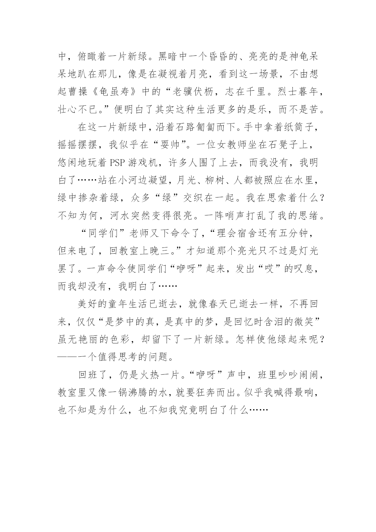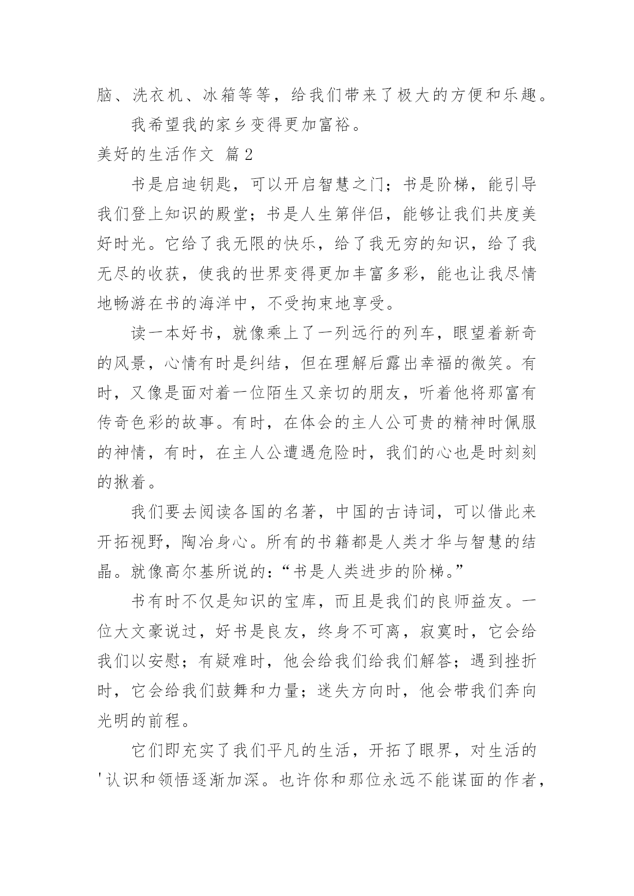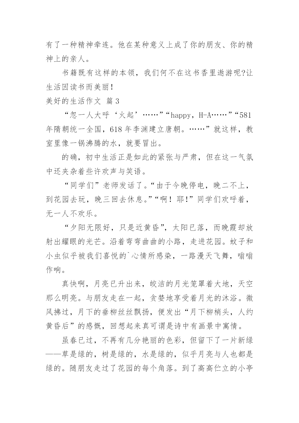 美好的生活作文美好的生活作文三篇在平平淡淡的日常中,许多人都有过写作文的经历,对作文都不陌生吧,作文是通过文字来表达一个主题意义的记叙方法。作文的注意事项有许多,你确定会写吗?下面是小编精心整理的美好的生活作文3篇,希望对大家有所帮助。美好的生活作文篇1我的家乡是农村,以前的马路很窄不好走,路上都是泥,现在条件变好了。马路变得更宽阔了,路的两旁都装着明亮的灯,人们吃过晚饭都来这里散步。听妈妈说;“以前的房子都是平房,点着灯还是暗暗的`,现在经济条件好了,人们都住上了又亮又宽的楼房”。环境变美了。以前的时候,污水横流,天热的时候,河水发出一股股臭味。现在都设计了排污管,垃圾也不乱丢了,变的很整洁。公路的两旁种着许多花草树木。看!我们的公园,花草树木长得多茂盛啊!桂花开了,人们走过桂花树就会闻到了一阵阵香气扑鼻而来令人心旷神怡。生活变好了,我们去散步的时候,从超市可以买到很多东西。以前都是老式的电视,现在是液晶电视,比以前变得更大、更省电了。以前我的房间是电风扇,到夏天了,扇着电风扇还是很热,今年我们家装了新空调,我一进去,凉风吹着很舒服。现在科技越来越发达了,有很多人都买了电脑、洗衣机、冰箱等等,给我们带来了极大的方便和乐趣。我希望我的家乡变得更加富裕。美好的生活作文篇2书是启迪钥匙,可以开启智慧之门;书是阶梯,能引导我们登上知识的殿堂;书是人生第伴侣,能够让我们共度美好时光。它给了我无限的快乐,给了我无穷的知识,给了我无尽的收获,使我的世界变得更加丰富多彩,能也让我尽情地畅游在书的海洋中,不受拘束地享受。读一本好书,就像乘上了一列远行的列车,眼望着新奇的风景,心情有时是纠结,但在理解后露出幸福的微笑。有时,又像是面对着一位陌生又亲切的朋友,听着他将那富有传奇色彩的故事。有时,在体会的主人公可贵的精神时佩服的神情,有时,在主人公遭遇危险时,我们的心也是时刻刻的揪着。我们要去阅读各国的名著,中国的古诗词,可以借此来开拓视野,陶冶身心。所有的书籍都是人类才华与智慧的结晶。就像高尔基所说的:“书是人类进步的阶梯。”书有时不仅是知识的宝库,而且是我们的良师益友。一位大文豪说过,好书是良友,终身不可离,寂寞时,它会给我们以安慰;有疑难时,他会给我们给我们解答;遇到挫折时,它会给我们鼓舞和力量;迷失方向时,他会带我们奔向光明的前程。它们即充实了我们平凡的生活,开拓了眼界,对生活的'认识和领悟逐渐加深。也许你和那位永远不能谋面的作者,有了一种精神牵连。他在某种意义上成了你的朋友、你的精神上的亲人。书籍既有这样的本领,我们何不在这书香里遨游呢?让生活因读书而美丽!美好的生活作文篇3“忽一人大呼‘火起’……”“happy,H-A……”“581年隋朝统一全国,618年李渊建立唐朝。……”就这样,教室里像一锅沸腾的水,就要冒出。的确,初中生活正是如此的紧张与严肃,但在这一气氛中还夹杂着些许欢声与笑语。“同学们”老师发话了。“由于今晚停电,晚二不上,到花园去玩,晚三回去休息。”“啊!耶!”同学们欢呼着,无一人不欢乐。“夕阳无限好,只是近黄昏”,太阳已落,而晚霞却放射出耀眼的光芒。沿着弯弯曲曲的小路,走进花园。蚊子和小虫似乎被我们喜悦的`心情所感染,一路漫天飞舞,嗡嗡作响。真快啊,月亮已升出来,皎洁的月光笼罩着大地,天空那么明亮。与朋友走在一起,贪婪地享受着月光的沐浴。微风拂过,月下的垂柳丝丝飘扬,便发出“月下柳梢头,人约黄昏后”的感慨,回想起来真可谓是诗中有画景中寓情。虽春已过,不再有几分艳丽的色彩,但留下了一片新绿——草是绿的,树是绿的,水是绿的,似乎月亮与人也都是绿的。随朋友走过了花园的每个角落。到了高高伫立的小亭中,俯瞰着一片新绿。黑暗中一个昏昏的、亮亮的是神龟呆呆地趴在那儿,像是在凝视着月亮,看到这一场景,不由想起曹操《龟虽寿》中的“老骥伏枥,志在千里。烈士暮年,壮心不已。”便明白了其实这种生活更多的是乐,而不是苦。在这一片新绿中,沿着石路匍匐而下。手中拿着纸筒子,摇摇摆摆,我似乎在“耍帅”。一位女教师坐在石凳子上,悠闲地玩着PSP游戏机,许多人围了上去,而我没有,我明白了……站在小河边凝望,月光、柳树、人都被照应在水里,绿中掺杂着绿,众多“绿”交织在一起。我在思索着什么?不知为何,河水突然变得很亮。一阵哨声打乱了我的思绪。“同学们”老师又下命令了,“理会宿舍还有五分钟,但来电了,回教室上晚三。”才知道那个亮光只不过是灯光罢了。一声命令使同学们“咿呀”起来,发出“哎”的叹息,而我却没有,我明白了……美好的童年生活已逝去,就像春天已逝去一样,不再回来,仅仅“是梦中的真,是真中的梦,是回忆时含泪的微笑”虽无艳丽的色彩,却留下了一片新绿。怎样使他绿起来呢?——一个值得思考的问题。回班了,仍是火热一片。“咿呀”声中,班里吵吵闹闹,教室里又像一锅沸腾