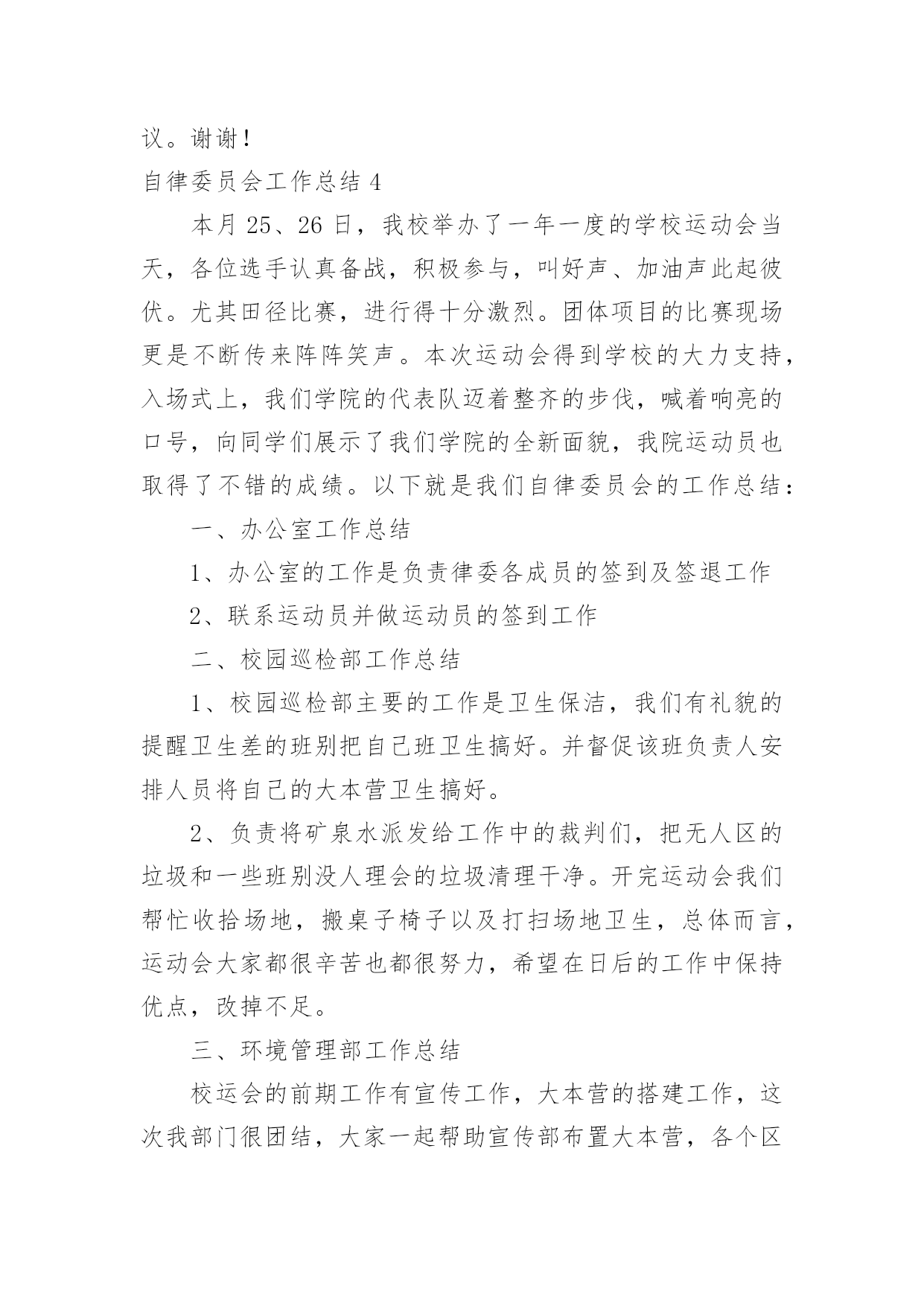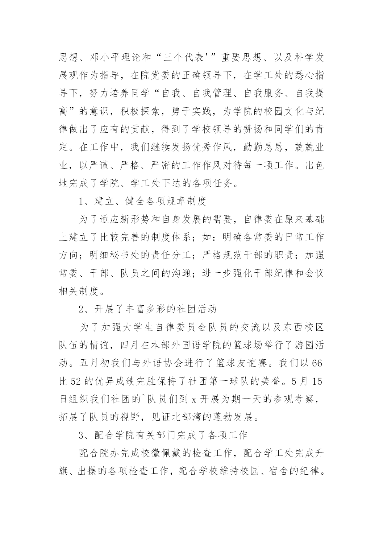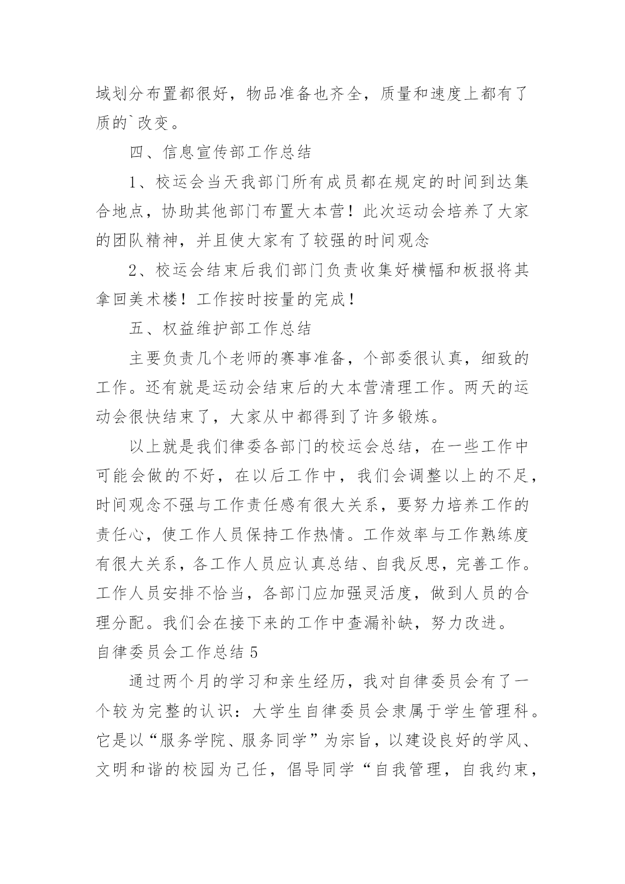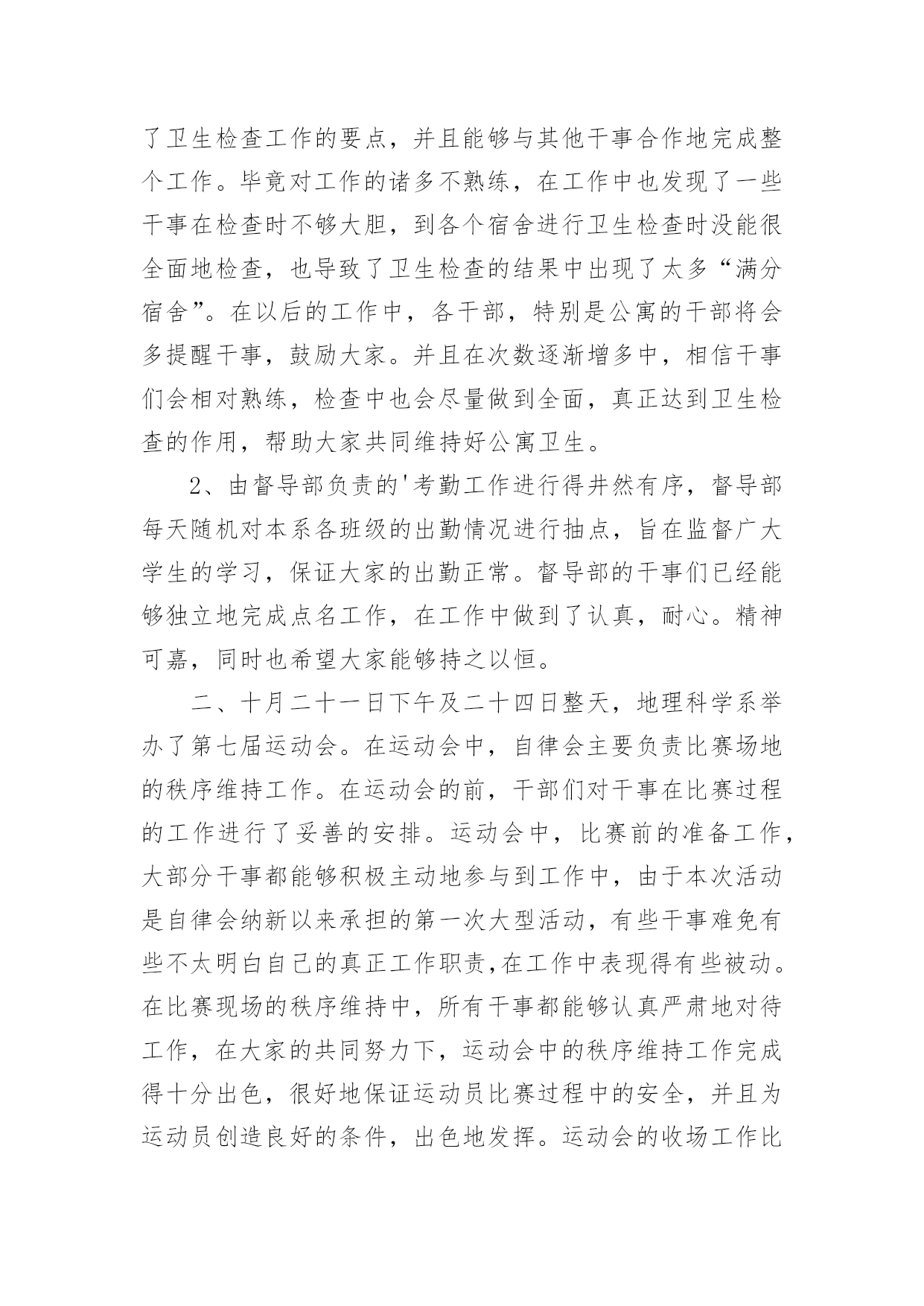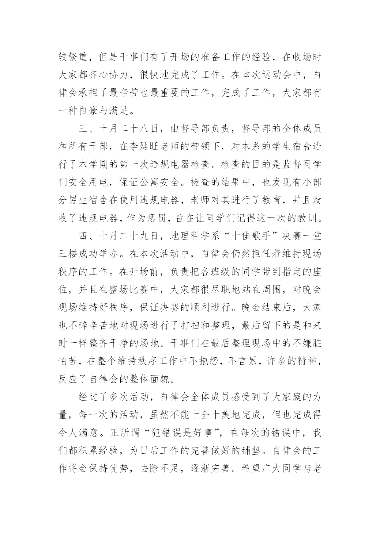 自律委员会工作总结自律委员会工作总结总结是对过去一定时期的工作、学习或思想情况进行回顾、分析,并做出客观评价的书面材料,它可以提升我们发现问题的能力,不妨让我们认真地完成总结吧。如何把总结做到重点突出呢?下面是小编整理的自律委员会工作总结,希望能够帮助到大家。自律委员会工作总结1充实的x月,忙碌的x月。本月,自律会的新成员们体验到了在这个大家庭里工作的温馨,也在一次次的活动中逐步地理解在自律会里自己应该承担的责任。在与其他五委的合作,出色完成每一次活动。计划赶不上变化,工作中难免有不如人意的情况,但在大家的齐协作下圆满完成,在一次次的活动里我们发现不足,总结经验。悄悄地,时光在流逝,渐渐地,我们在成长,工作留给我们的不仅仅是疲惫,更多的是心里的满足与收获,圆满完成工作后,总有成就感发自内心。现将十月份工作总结如下:一、常规工作1、由公寓部负责的每周三的卫生检查工作如序进行,在头两周的干部和老干事的带领下,新干事们已经基本掌握了卫生检查工作的要点,并且能够与其他干事合作地完成整个工作。毕竟对工作的诸多不熟练,在工作中也发现了一些干事在检查时不够大胆,到各个宿舍进行卫生检查时没能很全面地检查,也导致了卫生检查的结果中出现了太多“满分宿舍”。在以后的工作中,各干部,特别是公寓的干部将会多提醒干事,鼓励大家。并且在次数逐渐增多中,相信干事们会相对熟练,检查中也会尽量做到全面,真正达到卫生检查的作用,帮助大家共同维持好公寓卫生。2、由督导部负责的'考勤工作进行得井然有序,督导部每天随机对本系各班级的出勤情况进行抽点,旨在监督广大学生的学习,保证大家的出勤正常。督导部的干事们已经能够独立地完成点名工作,在工作中做到了认真,耐心。精神可嘉,同时也希望大家能够持之以恒。二、十月二十一日下午及二十四日整天,地理科学系举办了第七届运动会。在运动会中,自律会主要负责比赛场地的秩序维持工作。在运动会的前,干部们对干事在比赛过程的工作进行了妥善的安排。运动会中,比赛前的准备工作,大部分干事都能够积极主动地参与到工作中,由于本次活动是自律会纳新以来承担的第一次大型活动,有些干事难免有些不太明白自己的真正工作职责,在工作中表现得有些被动。在比赛现场的秩序维持中,所有干事都能够认真严肃地对待工作,在大家的共同努力下,运动会中的秩序维持工作完成得十分出色,很好地保证运动员比赛过程中的安全,并且为运动员创造良好的条件,出色地发挥。运动会的收场工作比较繁重,但是干事们有了开场的准备工作的经验,在收场时大家都齐心协力,很快地完成了工作。在本次运动会中,自律会承担了最辛苦也最重要的工作,完成了工作,大家都有一种自豪与满足。三、十月二十八日,由督导部负责,督导部的全体成员和所有干部,在李廷旺老师的带领下,对本系的学生宿舍进行了本学期的第一次违规电器检查。检查的目的是监督同学们安全用电,保证公寓安全。检查的结果中,也发现有小部分男生宿舍在使用违规电器,老师对其进行了教育,并且没收了违规电器,作为惩罚,旨在让同学们记得这一次的教训。四、十月二十九日,地理科学系“十佳歌手”决赛一堂三楼成功举办。在本次活动中,自律会仍然担任着维持现场秩序的工作。在开场前,负责把各班级的同学带到指定的座位,并且在整场比赛中,大家都很尽职地站在周围,对晚会现场维持好秩序,保证决赛的顺利进行。晚会结束后,大家也不辞辛苦地对现场进行了打扫和整理,最后留下的是和来时一样整齐干净的场地。干事们在最后整理现场中的不嫌脏怕苦,在整个维持秩序工作中不抱怨,不言累,许多的精神,反应了自律会的整体面貌。经过了多次活动,自律会全体成员感受到了大家庭的力量,每一次的活动,虽然不能十全十美地完成,但也完成得令人满意。正所谓“犯错误是好事”,在每次的错误中,我们都积累经验,为日后工作的完善做好的铺垫。自律会的工作将会保持优势,去除不足,逐渐完善。希望广大同学与老师监督,为我们提供宝贵的意见。自律委员会工作总结2转眼间大学已过一年,利用这段时间我安安静静的坐下深思了一整天,总结了自己的工作,感觉受益不少。日子如同白驹过隙,回首间,自己已站在学期之末。回忆这学期的工作,不知觉得略感失落,时间过的太快了,总是觉得自己在学生会这块令人瞩目的平台上得到的太少了。总是无法动笔写这份总结,但是总结还是要写的,因为只有总结了过去,才能更好的提高自己,以至于来开展以后的工作。成功、失败,这就好比一对孪生兄妹,与生俱来,浑然天成,他们地位等同。胜不骄,败不馁,也许人在最痛苦的时候,成长的更快,在生活和工作中做个有心人一切都将会好起来的。匆匆忙忙一个学期又过去了,学生会面临换届,有了紧张感,但我们的工作还是井然有序。今年,是一个多雨、炎热的季节。给我们日常工作带来了许多困难但是我们始终坚持克服困难。顺利完成了我们的各项工作。为学院文明建设做