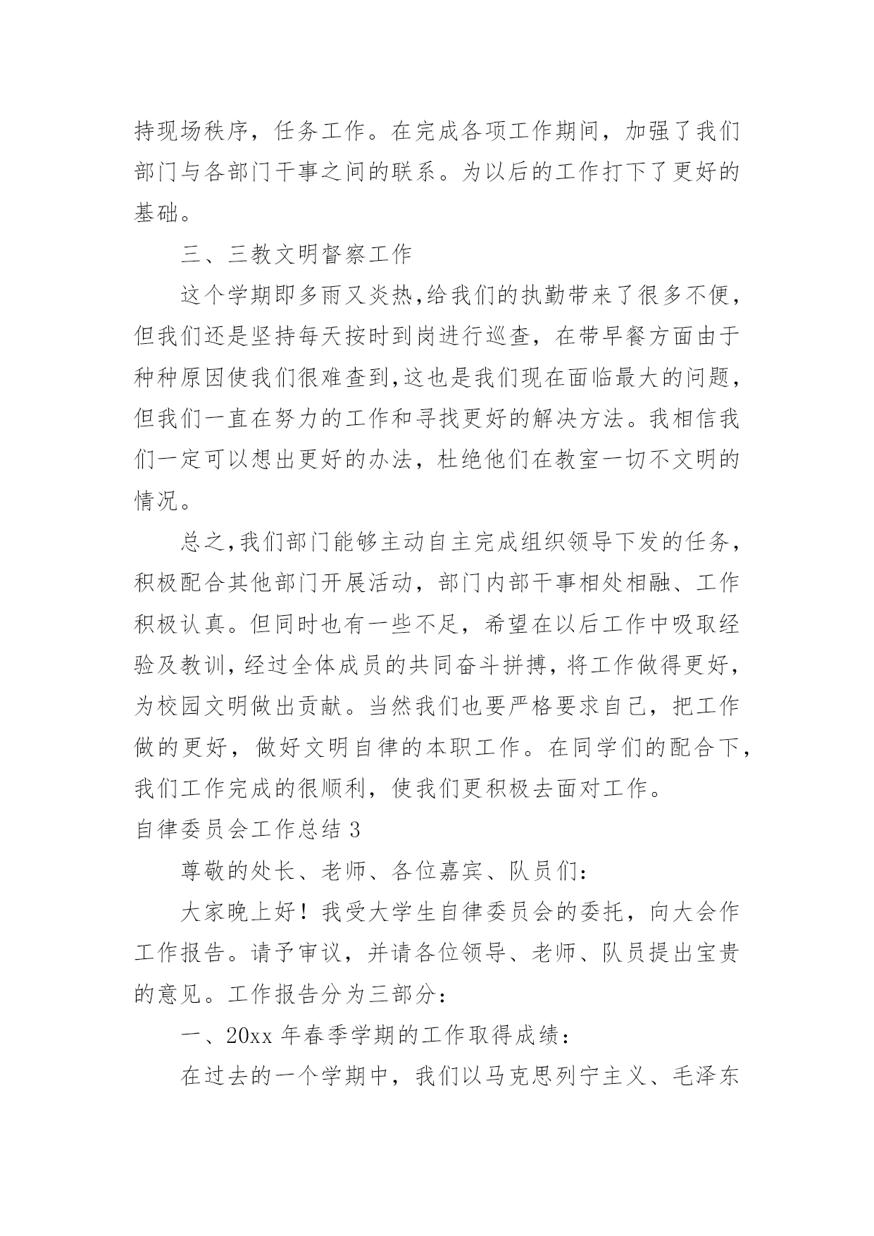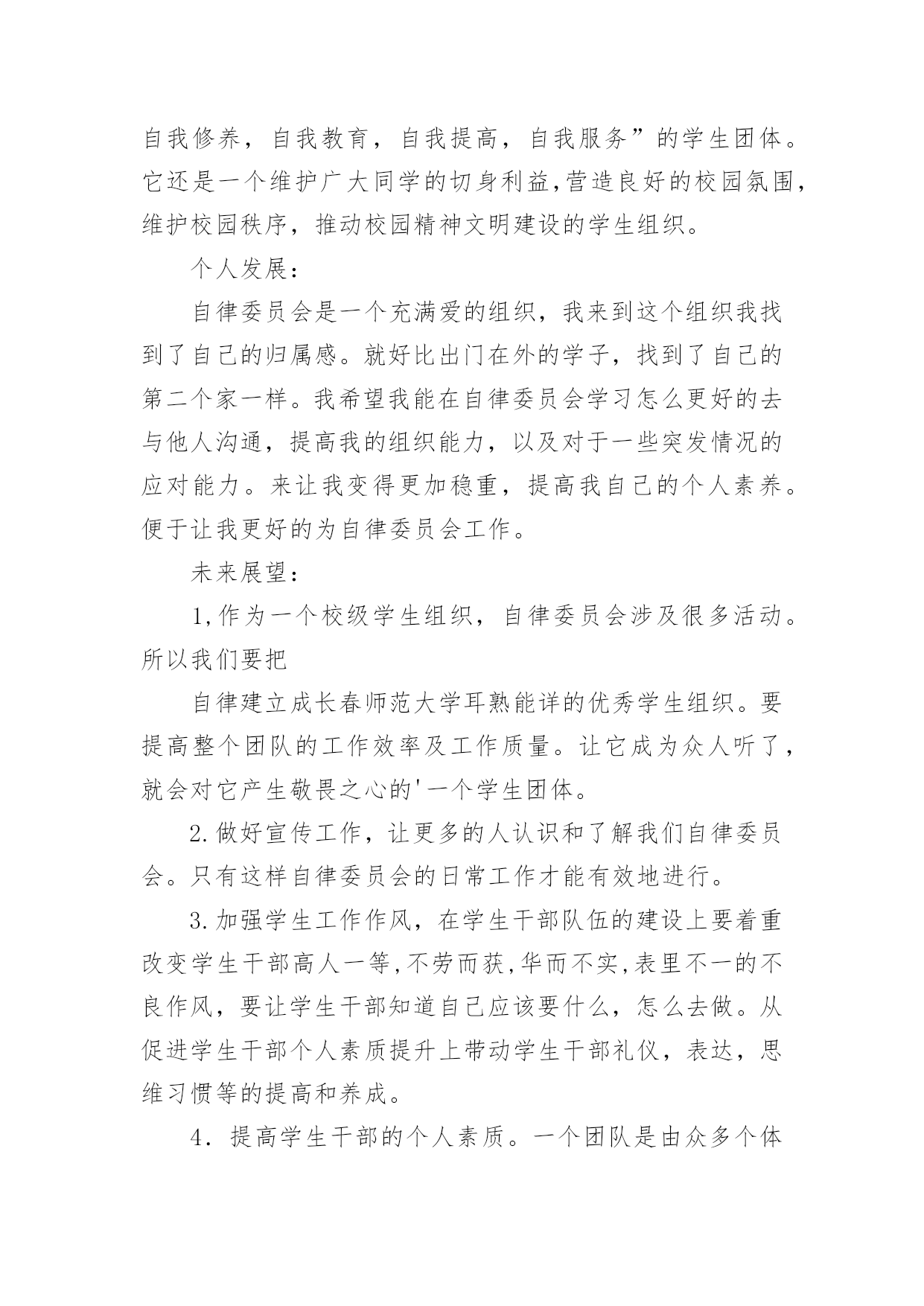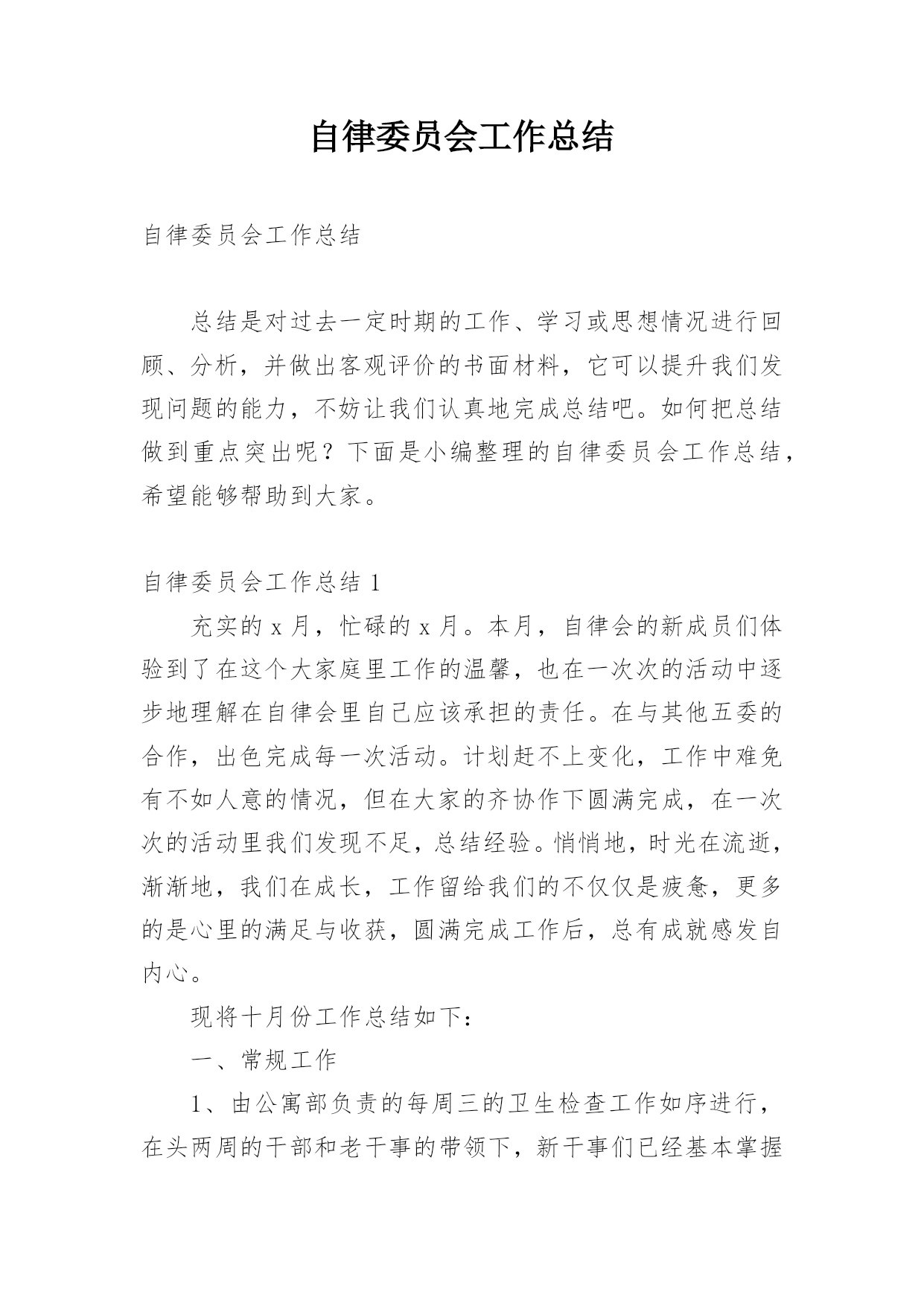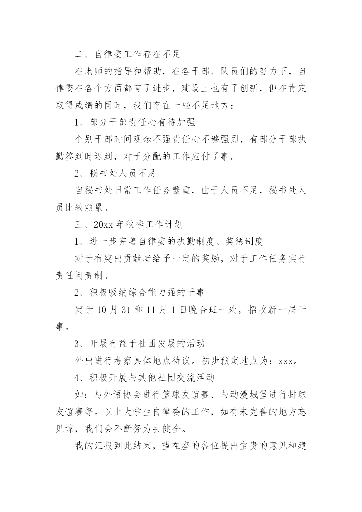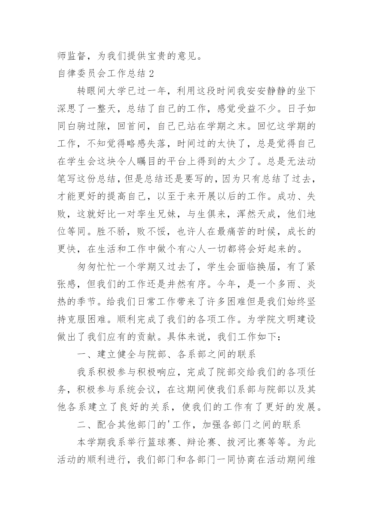 自律委员会工作总结自律委员会工作总结总结是对过去一定时期的工作、学习或思想情况进行回顾、分析,并做出客观评价的书面材料,它可以提升我们发现问题的能力,不妨让我们认真地完成总结吧。如何把总结做到重点突出呢?下面是小编整理的自律委员会工作总结,希望能够帮助到大家。自律委员会工作总结1充实的x月,忙碌的x月。本月,自律会的新成员们体验到了在这个大家庭里工作的温馨,也在一次次的活动中逐步地理解在自律会里自己应该承担的责任。在与其他五委的合作,出色完成每一次活动。计划赶不上变化,工作中难免有不如人意的情况,但在大家的齐协作下圆满完成,在一次次的活动里我们发现不足,总结经验。悄悄地,时光在流逝,渐渐地,我们在成长,工作留给我们的不仅仅是疲惫,更多的是心里的满足与收获,圆满完成工作后,总有成就感发自内心。现将十月份工作总结如下:一、常规工作1、由公寓部负责的每周三的卫生检查工作如序进行,在头两周的干部和老干事的带领下,新干事们已经基本掌握了卫生检查工作的要点,并且能够与其他干事合作地完成整个工作。毕竟对工作的诸多不熟练,在工作中也发现了一些干事在检查时不够大胆,到各个宿舍进行卫生检查时没能很全面地检查,也导致了卫生检查的结果中出现了太多“满分宿舍”。在以后的工作中,各干部,特别是公寓的干部将会多提醒干事,鼓励大家。并且在次数逐渐增多中,相信干事们会相对熟练,检查中也会尽量做到全面,真正达到卫生检查的作用,帮助大家共同维持好公寓卫生。2、由督导部负责的'考勤工作进行得井然有序,督导部每天随机对本系各班级的出勤情况进行抽点,旨在监督广大学生的学习,保证大家的出勤正常。督导部的干事们已经能够独立地完成点名工作,在工作中做到了认真,耐心。精神可嘉,同时也希望大家能够持之以恒。二、十月二十一日下午及二十四日整天,地理科学系举办了第七届运动会。在运动会中,自律会主要负责比赛场地的秩序维持工作。在运动会的前,干部们对干事在比赛过程的工作进行了妥善的安排。运动会中,比赛前的准备工作,大部分干事都能够积极主动地参与到工作中,由于本次活动是自律会纳新以来承担的第一次大型活动,有些干事难免有些不太明白自己的真正工作职责,在工作中表现得有些被动。在比赛现场的秩序维持中,所有干事都能够认真严肃地对待工作,在大家的共同努力下,运动会中的秩序维持工作完成得十分出色,很好地保证运动员比赛过程中的安全,并且为运动员创造良好的条件,出色地发挥。运动会的收场工作比较繁重,但是干事们有了开场的准备工作的经验,在收场时大家都齐心协力,很快地完成了工作。在本次运动会中,自律会承担了最辛苦也最重要的工作,完成了工作,大家都有一种自豪与满足。三、十月二十八日,由督导部负责,督导部的全体成员和所有干部,在李廷旺老师的带领下,对本系的学生宿舍进行了本学期的第一次违规电器检查。检查的目的是监督同学们安全用电,保证公寓安全。检查的结果中,也发现有小部分男生宿舍在使用违规电器,老师对其进行了教育,并且没收了违规电器,作为惩罚,旨在让同学们记得这一次的教训。四、十月二十九日,地理科学系“十佳歌手”决赛一堂三楼成功举办。在本次活动中,自律会仍然担任着维持现场秩序的工作。在开场前,负责把各班级的同学带到指定的座位,并且在整场比赛中,大家都很尽职地站在周围,对晚会现场维持好秩序,保证决赛的顺利进行。晚会结束后,大家也不辞辛苦地对现场进行了打扫和整理,最后留下的是和来时一样整齐干净的场地。干事们在最后整理现场中的不嫌脏怕苦,在整个维持秩序工作中不抱怨,不言累,许多的精神,反应了自律会的整体面貌。经过了多次活动,自律会全体成员感受到了大家庭的力量,每一次的活动,虽然不能十全十美地完成,但也完成得令人满意。正所谓“犯错误是好事”,在每次的错误中,我们都积累经验,为日后工作的完善做好的铺垫。自律会的工作将会保持优势,去除不足,逐渐完善。希望广大同学与老师监督,为我们提供宝贵的意见。自律委员会工作总结2转眼间大学已过一年,利用这段时间我安安静静的坐下深思了一整天,总结了自己的工作,感觉受益不少。日子如同白驹过隙,回首间,自己已站在学期之末。回忆这学期的工作,不知觉得略感失落,时间过的太快了,总是觉得自己在学生会这块令人瞩目的平台上得到的太少了。总是无法动笔写这份总结,但是总结还是要写的,因为只有总结了过去,才能更好的提高自己,以至于来开展以后的工作。成功、失败,这就好比一对孪生兄妹,与生俱来,浑然天成,他们地位等同。胜不骄,败不馁,也许人在最痛苦的时候,成长的更快,在生活和工作中做个有心人一切都将会好起来的。匆匆忙忙一个学期又过去了,学生会面临换届,有了紧张感,但我们的工作还是井然有序。今年,是一个多雨、炎热的季节。给我们日常工作带来了许多困难但是我们始终坚持克服困难。顺利完成了我们的各项工作。为学院文明建设做