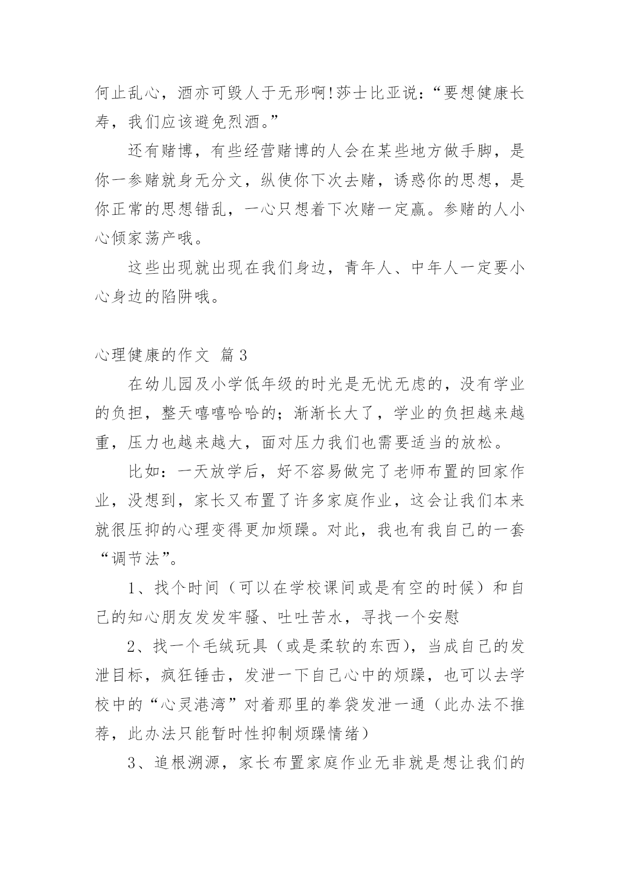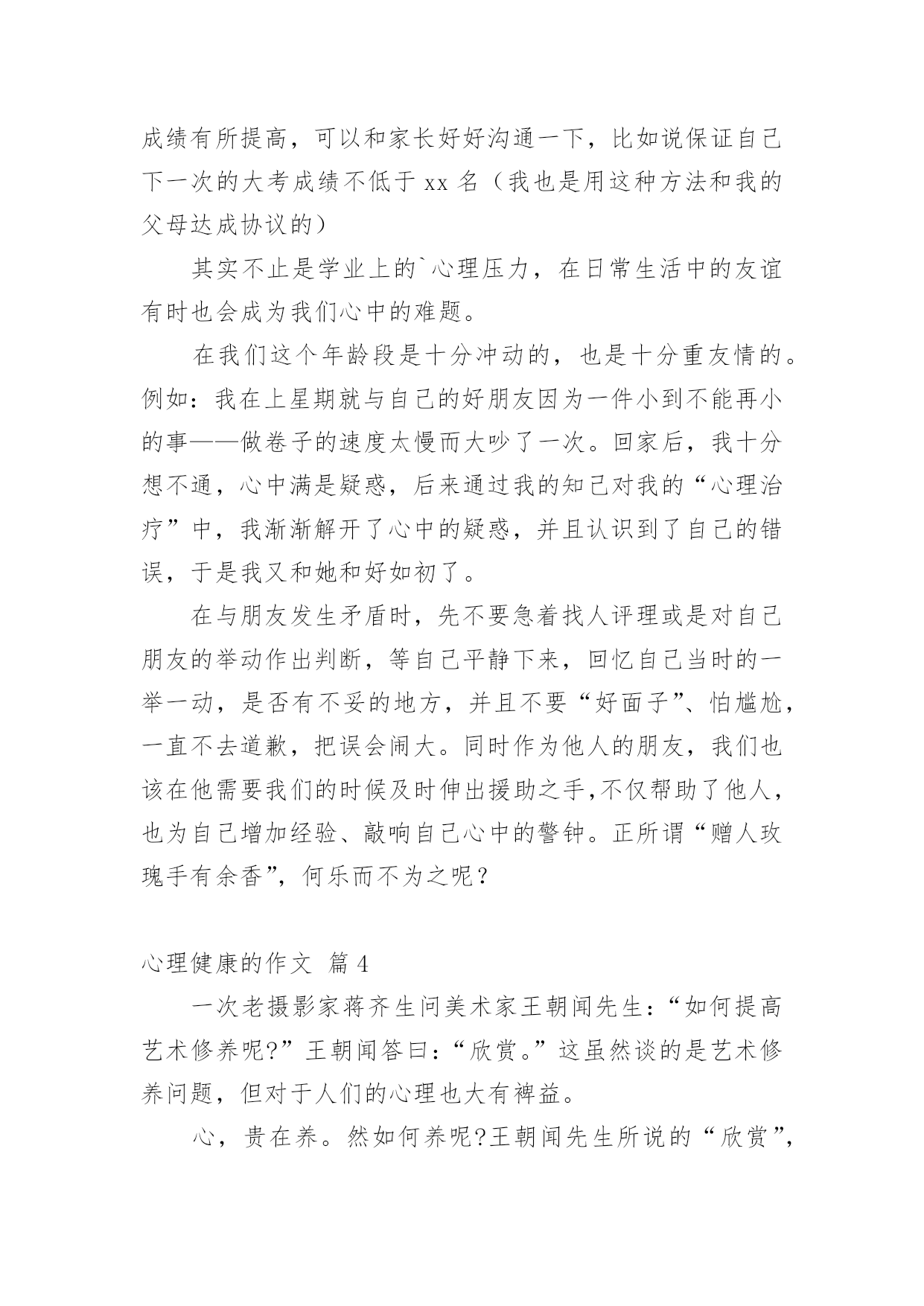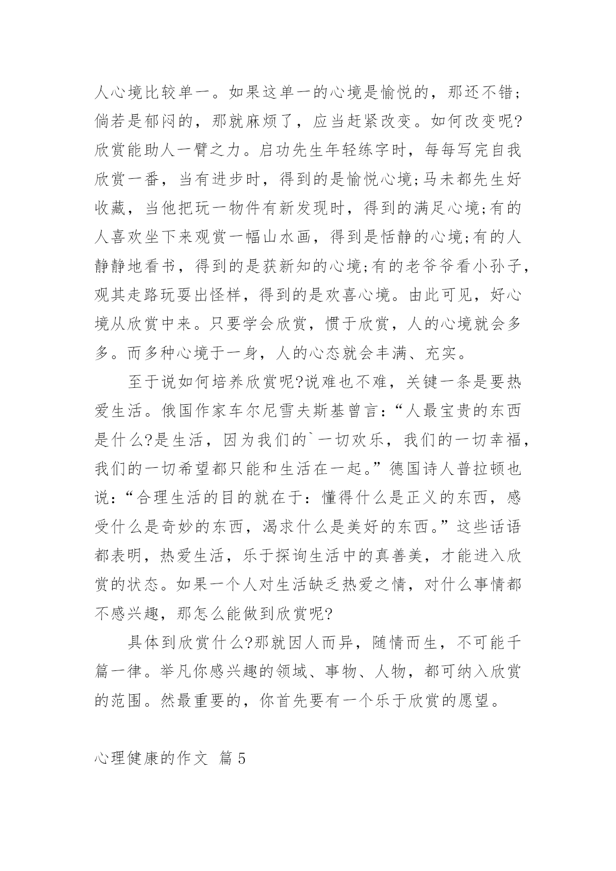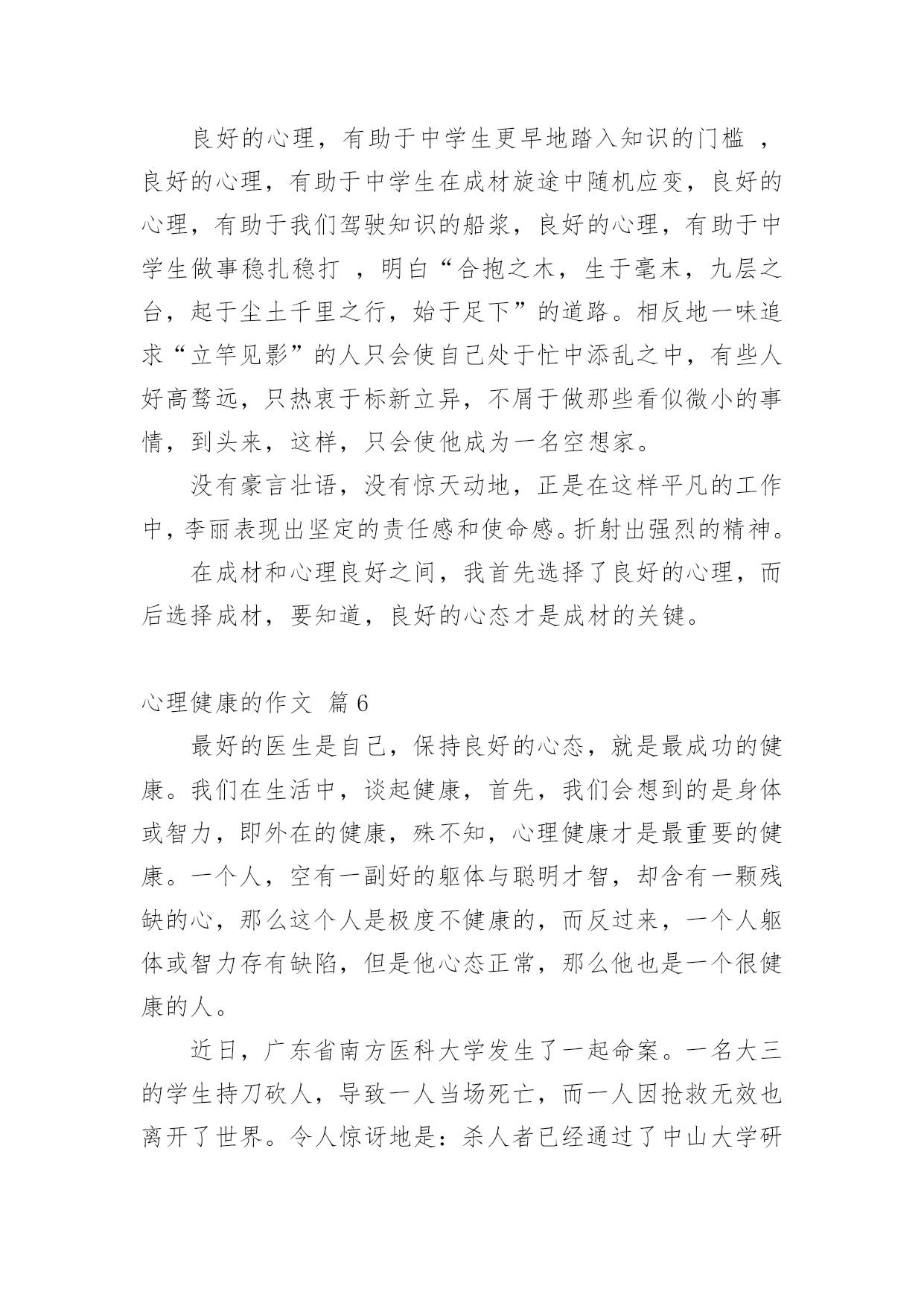 心理健康的作文关于心理健康的作文汇总6篇在生活、工作和学习中,大家对作文都再熟悉不过了吧,根据写作命题的特点,作文可以分为命题作文和非命题作文。那么一般作文是怎么写的呢?下面是小编收集整理的心理健康的作文6篇,欢迎阅读与收藏。心理健康的作文篇1健康是人生的第一财富。那么,怎样才算健康呢?同学们也许会说:“健康就是不生病,身体好。”其实,这样的回答是不全面的,健康除了指身体健康,最关键的是心理要健康。健康的心理有利于培养优秀品德,有利于提高学习成绩,有利于身体健康,更是个人事业成功的重要保证。而心理不健康能导致内脏功能受阻、思维紊乱、记忆力衰退等。长期被不良心理笼罩,就会导致生病。所以我们必须拥有健康的心理。健康不是天生的,需要在家庭、学校、社会所提供的良好的环境中,依靠自身努力和锻炼形成。在班里,我是一名清洁委员,也许有的人会看不上这个“七品芝麻官”,但我深知整洁的环境不仅能使我们的校园更加美丽,而且对我们的学习也有很大的帮助,所以我总是认认真真把自己的本职工作做好,因此经常受到老师的表扬。可是有一天,我一直忙着做作业,忘了检查卫生,教室里被几个平时不讲卫生的同学弄脏了,老师毫不留情地批评了我,还扣了我的分。当时,我心里甭提有多难过了,真想痛痛快快地哭一场。但我很快就平静下来,心想:这次扣了就扣了,自己端正工作态度,以后一定更好地做好检查督促工作,为班级的卫生工作尽力。正因为我有这样良好的心理品质,真正做到了“胜不骄,败不馁”,所以我很快调整了自己的心态,以一颗平常心接受了老师的批评。后来,我以更积极的'态度对待工作。在我的努力下,我班的卫生工作真的搞上去了,教室里再也不见乱丢纸屑的人。我们整天都在洁净的环境里愉快地学习和生活,同学间的关系也更加融洽了,大家的集体荣誉感也增强了。由此可见,健康的心理对于我们的学习、生活是多么重要。正如巴德舒尔伯格说的,只有在受批评时不气馁,受表扬时不骄傲,才会取得成功。是啊,健康的心理对于我们每一个人都很重要。只有平衡好自己的心理,以健康的心态对待一切,我们才能把事情做得更好。时代呼唤心理健康,让我们每一个人都拥有健康的心理。心理健康的作文篇2身心健康知识镜头大家好,你们一定没发现吧,在你们身边潜伏着许多不良现象吧,比如吸烟、酗酒、赌博……我们来谈谈吧,就说吸烟吧。吸烟20年的人的肺癌的机率是不吸烟人的2倍,香烟所含有尼古丁,尼古丁是一种剧毒物质,实验证明,一支香烟所含的尼古丁为5至15毫克,足可毒死一只老鼠;20支香烟所含的尼古丁可毒死一只牛。很多人一天抽一包烟,为什么不中毒呢?这是因为每次抽烟进入人体的尼古丁不多!但如果长年累月地吸烟,人体便会引起慢性中毒。青少年正处于发育阶段,组织器官都很娇嫩,对有害物质比成年人吸收得快,造成的危害也更大,世界上每年约有200万人由于吸烟而死亡;英国皇家医学会的'报告说“每吸一支烟,生命就缩短5分30秒。”由此可见,烟是杀人不见血的刀!吸烟引发种疾病,其中最明显的就是肺癌!所以吸烟危险。还有酒的危害,饮酒过量会使自己的神经受到麻醉,有时还会使自己的理智大量丧失。很多经常酗酒的人都有过这样的体验:喝酒过后,人的记忆力会受到严重破坏,从而影响很多事情的正常进行。据记者所知,我省一山区基层干部,因酗酒过度,几乎变成植物人,三次手术至今未见康复。有报道称年前,一名外商满怀信心到某市投资,市府设宴款待。第一天,官员轮番劝酒,外商勉强应付;第二天,外商烂醉如泥,无法招架;第三天,外商逃之夭夭,投资“泡汤”。有句话说“车祸猛于虎”,这其中少不了是酒后驾车而引起的血的教训。酒的贪杯换来的是冷冰冰的尸体,还有那丧亲的泪人,悲伤的泣声。等待你的将是法律的制裁,。酒何止乱心,酒亦可毁人于无形啊!莎士比亚说:“要想健康长寿,我们应该避免烈酒。”还有赌博,有些经营赌博的人会在某些地方做手脚,是你一参赌就身无分文,纵使你下次去赌,诱惑你的思想,是你正常的思想错乱,一心只想着下次赌一定赢。参赌的人小心倾家荡产哦。这些出现就出现在我们身边,青年人、中年人一定要小心身边的陷阱哦。心理健康的作文篇3在幼儿园及小学低年级的时光是无忧无虑的,没有学业的负担,整天嘻嘻哈哈的;渐渐长大了,学业的负担越来越重,压力也越来越大,面对压力我们也需要适当的放松。比如:一天放学后,好不容易做完了老师布置的回家作业,没想到,家长又布置了许多家庭作业,这会让我们本来就很压抑的心理变得更加烦躁。对此,我也有我自己的一套“调节法”。1、找个时间(可以在学校课间或是有空的时候)和自己的知心朋友发发牢骚、吐吐苦水,寻找一个安慰2、找一个毛绒玩具(或是柔软的东西),当成自己的发泄目标,疯狂锤击,发泄一下自己心中的烦躁,也可以去学校中的“心灵港湾”对着那里的拳袋发泄一通(此办法不推荐,此办法只能暂时性抑制烦躁情绪)3、