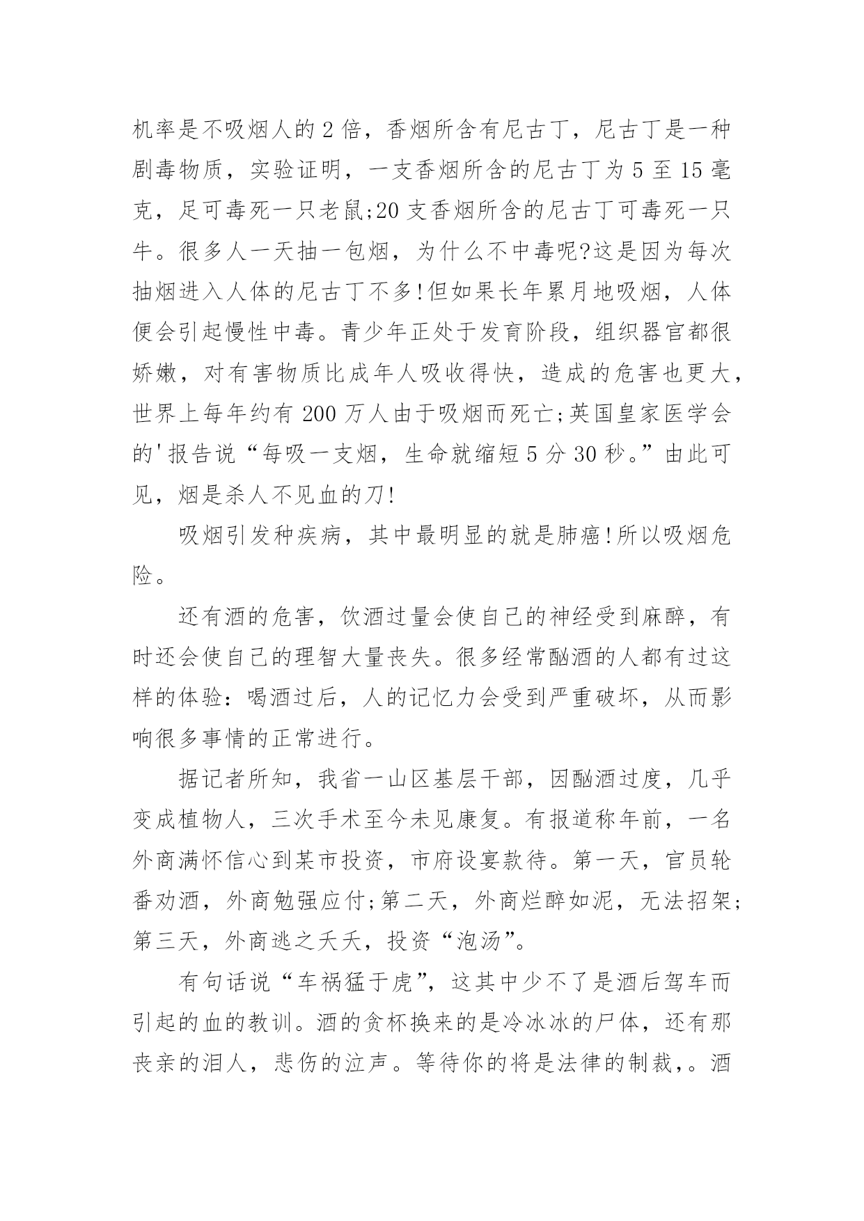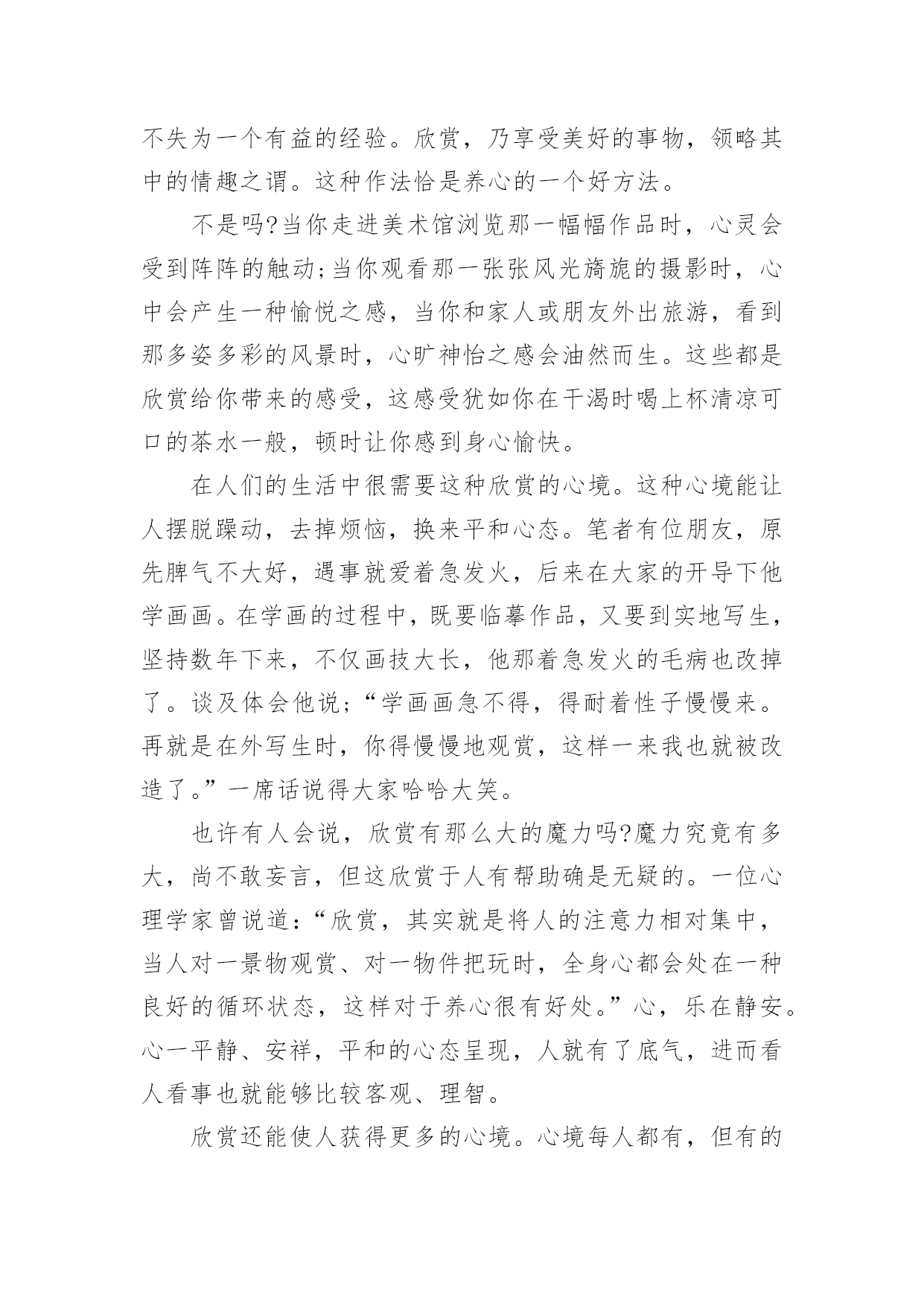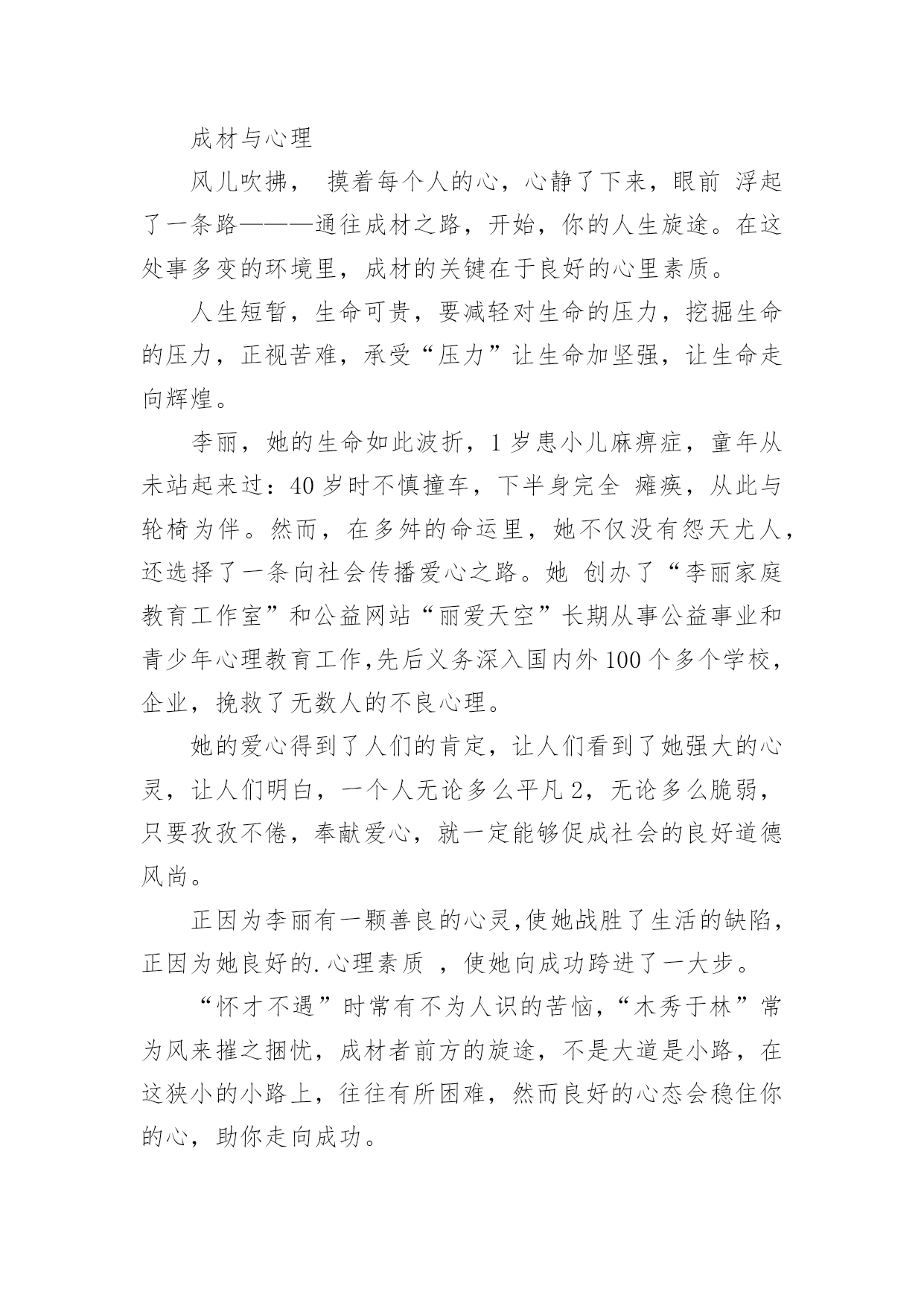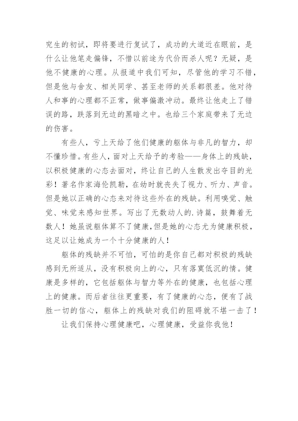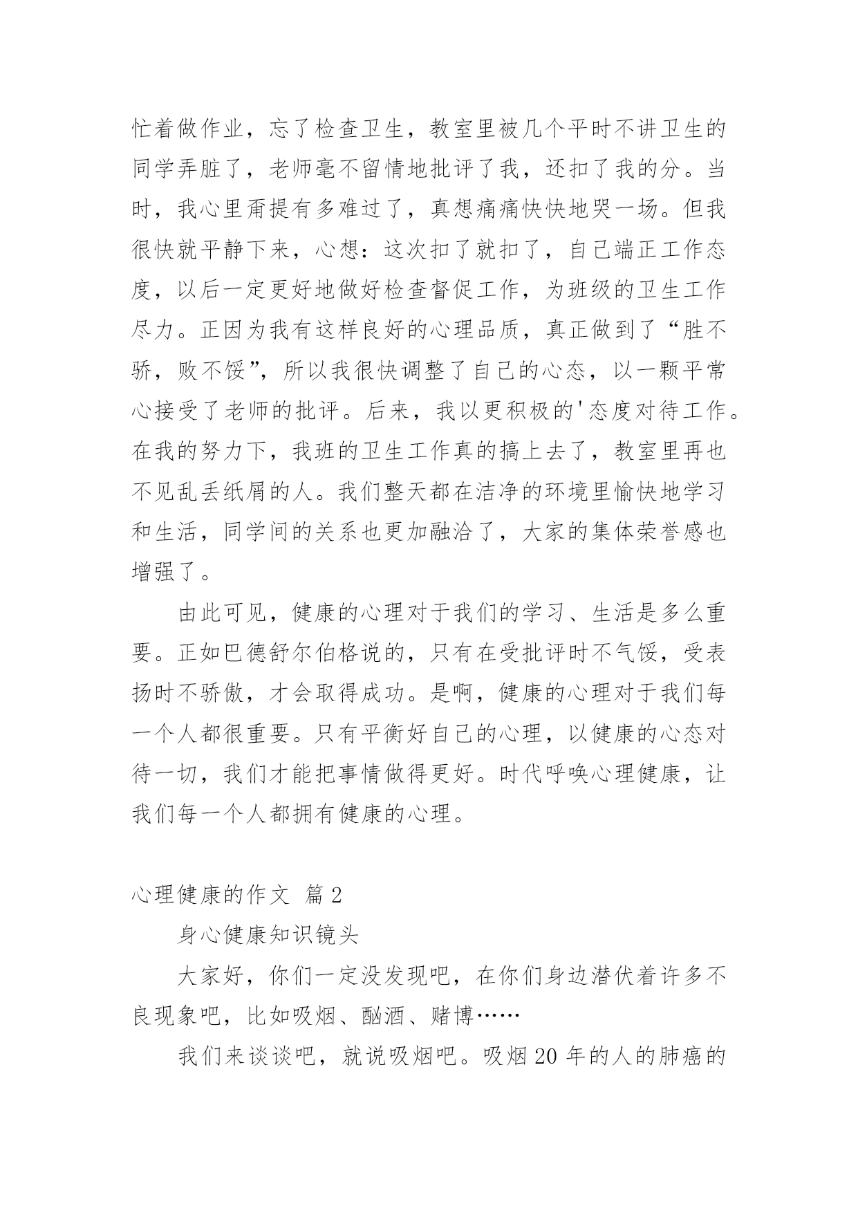 心理健康的作文关于心理健康的作文汇总6篇在生活、工作和学习中,大家对作文都再熟悉不过了吧,根据写作命题的特点,作文可以分为命题作文和非命题作文。那么一般作文是怎么写的呢?下面是小编收集整理的心理健康的作文6篇,欢迎阅读与收藏。心理健康的作文篇1健康是人生的第一财富。那么,怎样才算健康呢?同学们也许会说:“健康就是不生病,身体好。”其实,这样的回答是不全面的,健康除了指身体健康,最关键的是心理要健康。健康的心理有利于培养优秀品德,有利于提高学习成绩,有利于身体健康,更是个人事业成功的重要保证。而心理不健康能导致内脏功能受阻、思维紊乱、记忆力衰退等。长期被不良心理笼罩,就会导致生病。所以我们必须拥有健康的心理。健康不是天生的,需要在家庭、学校、社会所提供的良好的环境中,依靠自身努力和锻炼形成。在班里,我是一名清洁委员,也许有的人会看不上这个“七品芝麻官”,但我深知整洁的环境不仅能使我们的校园更加美丽,而且对我们的学习也有很大的帮助,所以我总是认认真真把自己的本职工作做好,因此经常受到老师的表扬。可是有一天,我一直忙着做作业,忘了检查卫生,教室里被几个平时不讲卫生的同学弄脏了,老师毫不留情地批评了我,还扣了我的分。当时,我心里甭提有多难过了,真想痛痛快快地哭一场。但我很快就平静下来,心想:这次扣了就扣了,自己端正工作态度,以后一定更好地做好检查督促工作,为班级的卫生工作尽力。正因为我有这样良好的心理品质,真正做到了“胜不骄,败不馁”,所以我很快调整了自己的心态,以一颗平常心接受了老师的批评。后来,我以更积极的'态度对待工作。在我的努力下,我班的卫生工作真的搞上去了,教室里再也不见乱丢纸屑的人。我们整天都在洁净的环境里愉快地学习和生活,同学间的关系也更加融洽了,大家的集体荣誉感也增强了。由此可见,健康的心理对于我们的学习、生活是多么重要。正如巴德舒尔伯格说的,只有在受批评时不气馁,受表扬时不骄傲,才会取得成功。是啊,健康的心理对于我们每一个人都很重要。只有平衡好自己的心理,以健康的心态对待一切,我们才能把事情做得更好。时代呼唤心理健康,让我们每一个人都拥有健康的心理。心理健康的作文篇2身心健康知识镜头大家好,你们一定没发现吧,在你们身边潜伏着许多不良现象吧,比如吸烟、酗酒、赌博……我们来谈谈吧,就说吸烟吧。吸烟20年的人的肺癌的机率是不吸烟人的2倍,香烟所含有尼古丁,尼古丁是一种剧毒物质,实验证明,一支香烟所含的尼古丁为5至15毫克,足可毒死一只老鼠;20支香烟所含的尼古丁可毒死一只牛。很多人一天抽一包烟,为什么不中毒呢?这是因为每次抽烟进入人体的尼古丁不多!但如果长年累月地吸烟,人体便会引起慢性中毒。青少年正处于发育阶段,组织器官都很娇嫩,对有害物质比成年人吸收得快,造成的危害也更大,世界上每年约有200万人由于吸烟而死亡;英国皇家医学会的'报告说“每吸一支烟,生命就缩短5分30秒。”由此可见,烟是杀人不见血的刀!吸烟引发种疾病,其中最明显的就是肺癌!所以吸烟危险。还有酒的危害,饮酒过量会使自己的神经受到麻醉,有时还会使自己的理智大量丧失。很多经常酗酒的人都有过这样的体验:喝酒过后,人的记忆力会受到严重破坏,从而影响很多事情的正常进行。据记者所知,我省一山区基层干部,因酗酒过度,几乎变成植物人,三次手术至今未见康复。有报道称年前,一名外商满怀信心到某市投资,市府设宴款待。第一天,官员轮番劝酒,外商勉强应付;第二天,外商烂醉如泥,无法招架;第三天,外商逃之夭夭,投资“泡汤”。有句话说“车祸猛于虎”,这其中少不了是酒后驾车而引起的血的教训。酒的贪杯换来的是冷冰冰的尸体,还有那丧亲的泪人,悲伤的泣声。等待你的将是法律的制裁,。酒何止乱心,酒亦可毁人于无形啊!莎士比亚说:“要想健康长寿,我们应该避免烈酒。”还有赌博,有些经营赌博的人会在某些地方做手脚,是你一参赌就身无分文,纵使你下次去赌,诱惑你的思想,是你正常的思想错乱,一心只想着下次赌一定赢。参赌的人小心倾家荡产哦。这些出现就出现在我们身边,青年人、中年人一定要小心身边的陷阱哦。心理健康的作文篇3在幼儿园及小学低年级的时光是无忧无虑的,没有学业的负担,整天嘻嘻哈哈的;渐渐长大了,学业的负担越来越重,压力也越来越大,面对压力我们也需要适当的放松。比如:一天放学后,好不容易做完了老师布置的回家作业,没想到,家长又布置了许多家庭作业,这会让我们本来就很压抑的心理变得更加烦躁。对此,我也有我自己的一套“调节法”。1、找个时间(可以在学校课间或是有空的时候)和自己的知心朋友发发牢骚、吐吐苦水,寻找一个安慰2、找一个毛绒玩具(或是柔软的东西),当成自己的发泄目标,疯狂锤击,发泄一下自己心中的烦躁,也可以去学校中的“心灵港湾”对着那里的拳袋发泄一通(此办法不推荐,此办法只能暂时性抑制烦躁情绪)3、