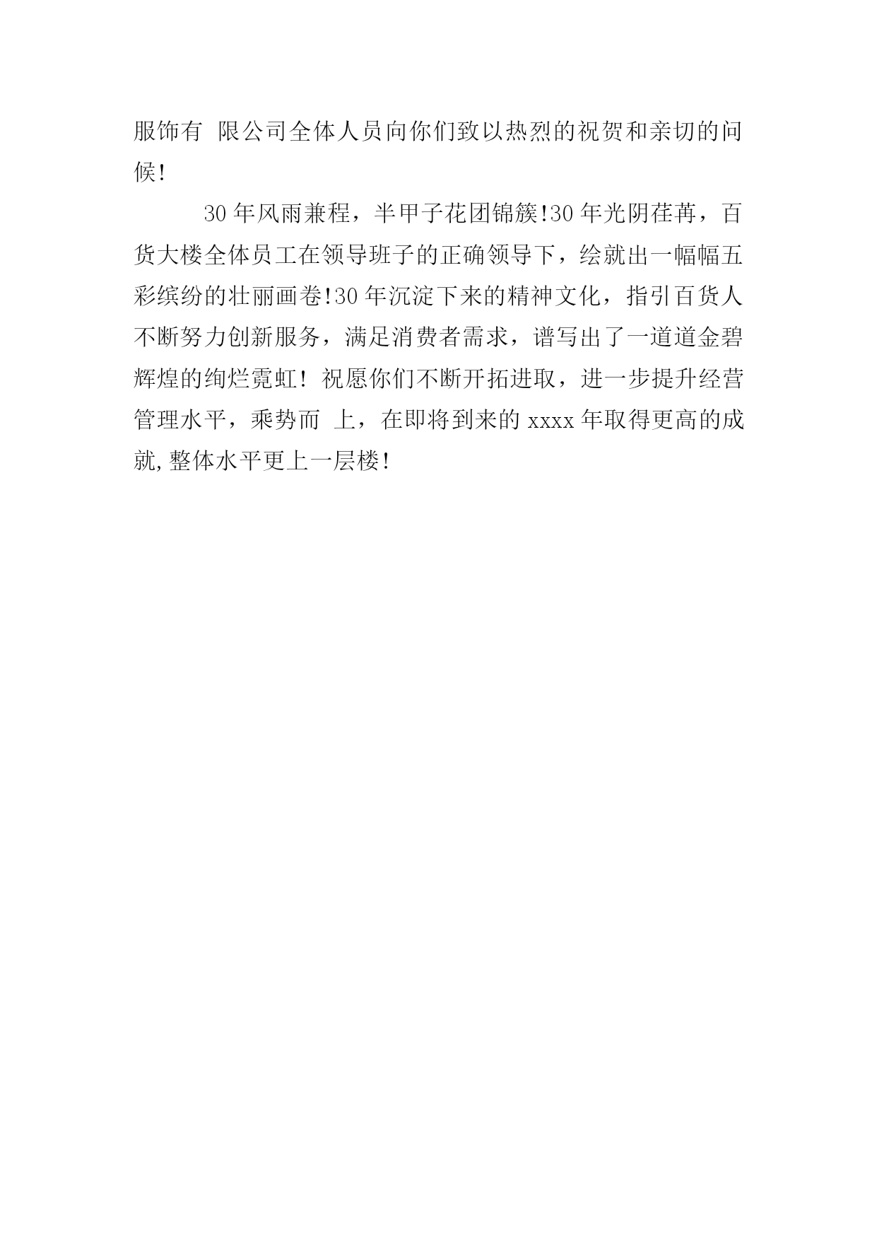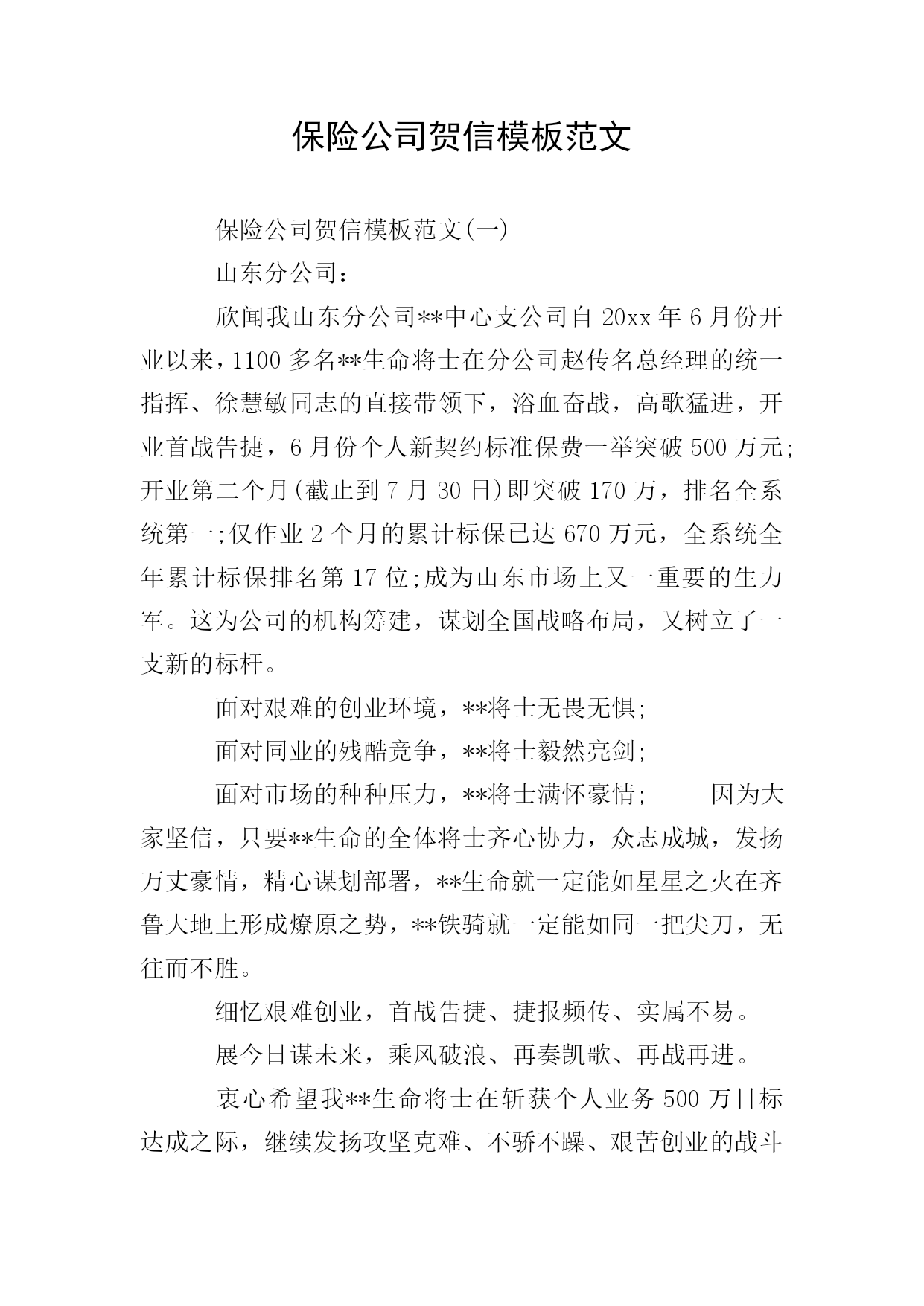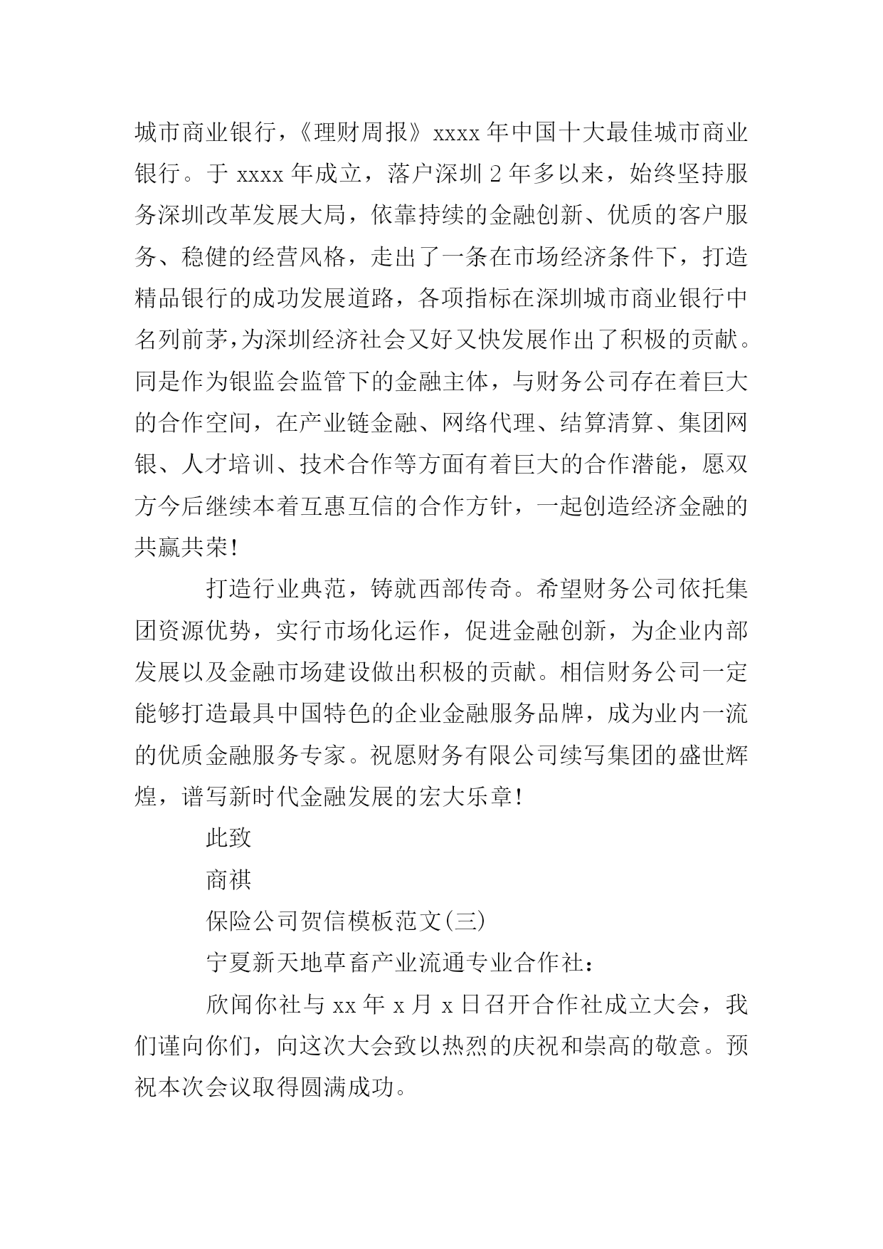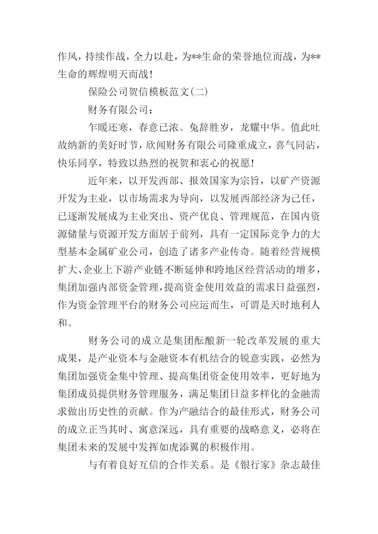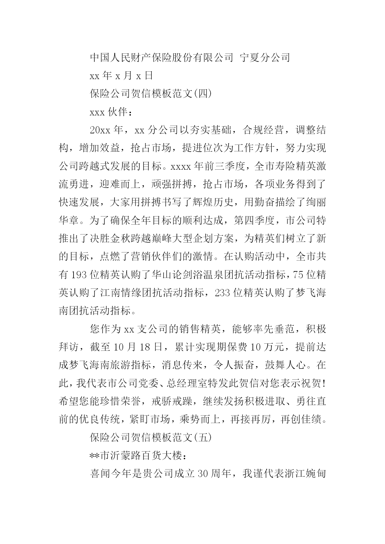 保险公司贺信模板范文保险公司贺信模板范文(一)山东分公司:欣闻我山东分公司**中心支公司自20xx年6月份开业以来,1100多名**生命将士在分公司赵传名总经理的统一指挥、徐慧敏同志的直接带领下,浴血奋战,高歌猛进,开业首战告捷,6月份个人新契约标准保费一举突破500万元;开业第二个月(截止到7月30日)即突破170万,排名全系统第一;仅作业2个月的累计标保已达670万元,全系统全年累计标保排名第17位;成为山东市场上又一重要的生力军。这为公司的机构筹建,谋划全国战略布局,又树立了一支新的标杆。面对艰难的创业环境,**将士无畏无惧;面对同业的残酷竞争,**将士毅然亮剑;面对市场的种种压力,**将士满怀豪情;因为大家坚信,只要**生命的全体将士齐心协力,众志成城,发扬万丈豪情,精心谋划部署,**生命就一定能如星星之火在齐鲁大地上形成燎原之势,**铁骑就一定能如同一把尖刀,无往而不胜。细忆艰难创业,首战告捷、捷报频传、实属不易。展今日谋未来,乘风破浪、再奏凯歌、再战再进。衷心希望我**生命将士在斩获个人业务500万目标达成之际,继续发扬攻坚克难、不骄不躁、艰苦创业的战斗作风,持续作战,全力以赴,为**生命的荣誉地位而战,为**生命的辉煌明天而战!保险公司贺信模板范文(二)财务有限公司:乍暖还寒,春意已浓。兔辞胜岁,龙耀中华。值此吐故纳新的美好时节,欣闻财务有限公司隆重成立,喜气同沾,快乐同享,特致以热烈的祝贺和衷心的祝愿!近年来,以开发西部、报效国家为宗旨,以矿产资源开发为主业,以市场需求为导向,以发展西部经济为己任,已逐渐发展成为主业突出、资产优良、管理规范,在国内资源储量与资源开发方面居于前列,具有一定国际竞争力的大型基本金属矿业公司,创造了诸多产业传奇。随着经营规模扩大、企业上下游产业链不断延伸和跨地区经营活动的增多,集团加强内部资金管理,提高资金使用效益的需求日益强烈,作为资金管理平台的财务公司应运而生,可谓是天时地利人和。财务公司的成立是集团酝酿新一轮改革发展的重大成果,是产业资本与金融资本有机结合的锐意实践,必然为集团加强资金集中管理、提高集团资金使用效率,更好地为集团成员提供财务管理服务,满足集团日益多样化的金融需求做出历史性的贡献。作为产融结合的最佳形式,财务公司的成立正当其时、寓意深远,具有重要的战略意义,必将在集团未来的发展中发挥如虎添翼的积极作用。与有着良好互信的合作关系。是《银行家》杂志最佳城市商业银行,《理财周报》xxxx年中国十大最佳城市商业银行。于xxxx年成立,落户深圳2年多以来,始终坚持服务深圳改革发展大局,依靠持续的金融创新、优质的客户服务、稳健的经营风格,走出了一条在市场经济条件下,打造精品银行的成功发展道路,各项指标在深圳城市商业银行中名列前茅,为深圳经济社会又好又快发展作出了积极的贡献。同是作为银监会监管下的金融主体,与财务公司存在着巨大的合作空间,在产业链金融、网络代理、结算清算、集团网银、人才培训、技术合作等方面有着巨大的合作潜能,愿双方今后继续本着互惠互信的合作方针,一起创造经济金融的共赢共荣!打造行业典范,铸就西部传奇。希望财务公司依托集团资源优势,实行市场化运作,促进金融创新,为企业内部发展以及金融市场建设做出积极的贡献。相信财务公司一定能够打造最具中国特色的企业金融服务品牌,成为业内一流的优质金融服务专家。祝愿财务有限公司续写集团的盛世辉煌,谱写新时代金融发展的宏大乐章!此致商祺保险公司贺信模板范文(三)宁夏新天地草畜产业流通专业合作社:欣闻你社与xx年x月x日召开合作社成立大会,我们谨向你们,向这次大会致以热烈的庆祝和崇高的敬意。预祝本次会议取得圆满成功。中国人民财产保险股份有限公司宁夏分公司xx年x月x日保险公司贺信模板范文(四)xxx伙伴:20xx年,xx分公司以夯实基础,合规经营,调整结构,增加效益,抢占市场,提进位次为工作方针,努力实现公司跨越式发展的目标。xxxx年前三季度,全市寿险精英激流勇进,迎难而上,顽强拼搏,抢占市场,各项业务得到了快速发展,大家用拼搏书写了辉煌历史,用勤奋描绘了绚丽华章。为了确保全年目标的顺利达成,第四季度,市公司特推出了决胜金秋跨越巅峰大型企划方案,为精英们树立了新的目标,点燃了营销伙伴们的激情。在认购活动中,全市共有193位精英认购了华山论剑浴温泉团抗活动指标,75位精英认购了江南情缘团抗活动指标,233位精英认购了梦飞海南团抗活动指标。您作为xx支公司的销售精英,能够率先垂范,积极拜访,截至10月18日,累计实现期保费10万元,提前达成梦飞海南旅游指标,消息传来,令人振奋,鼓舞人心。在此,我代表市公司党委、总经理室特发此贺信对