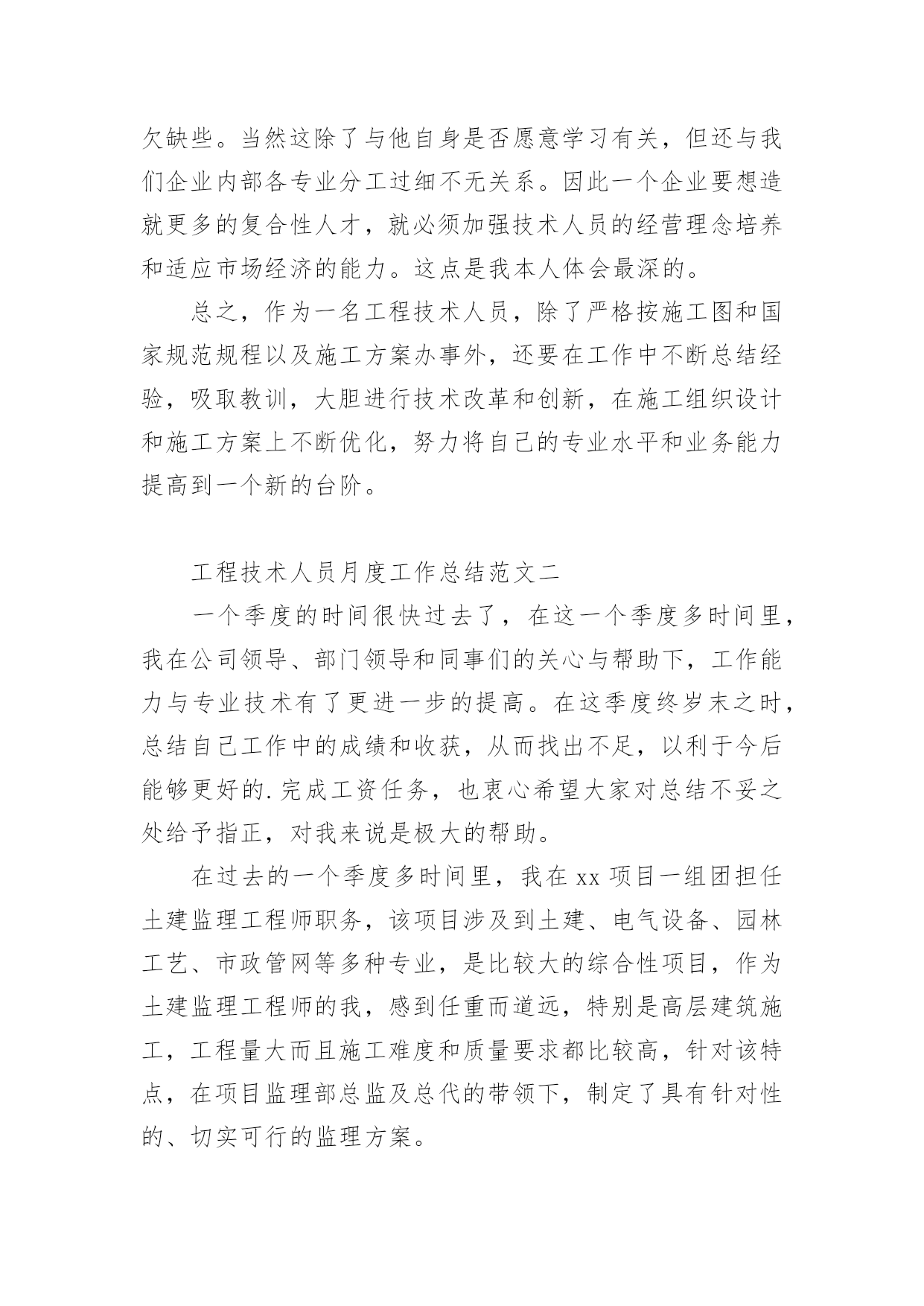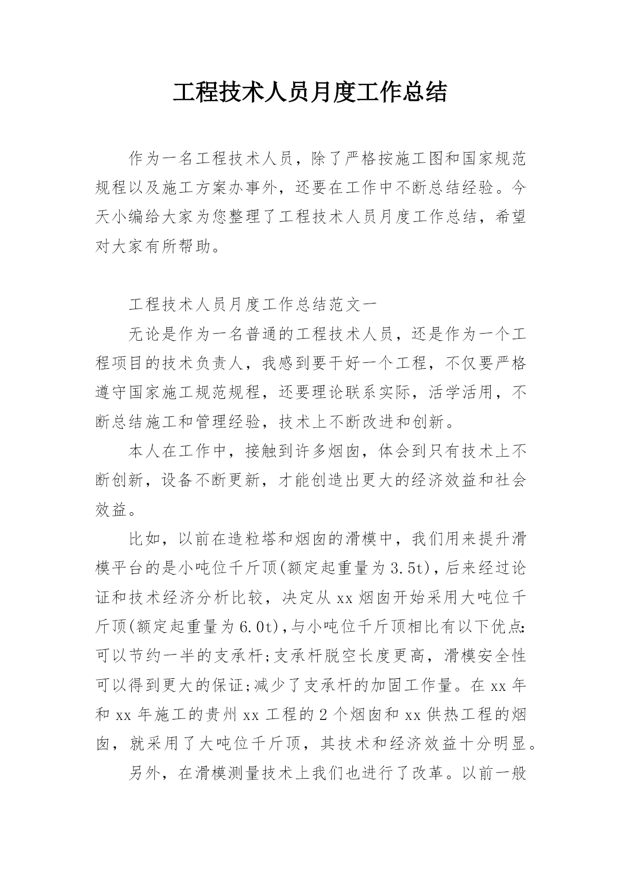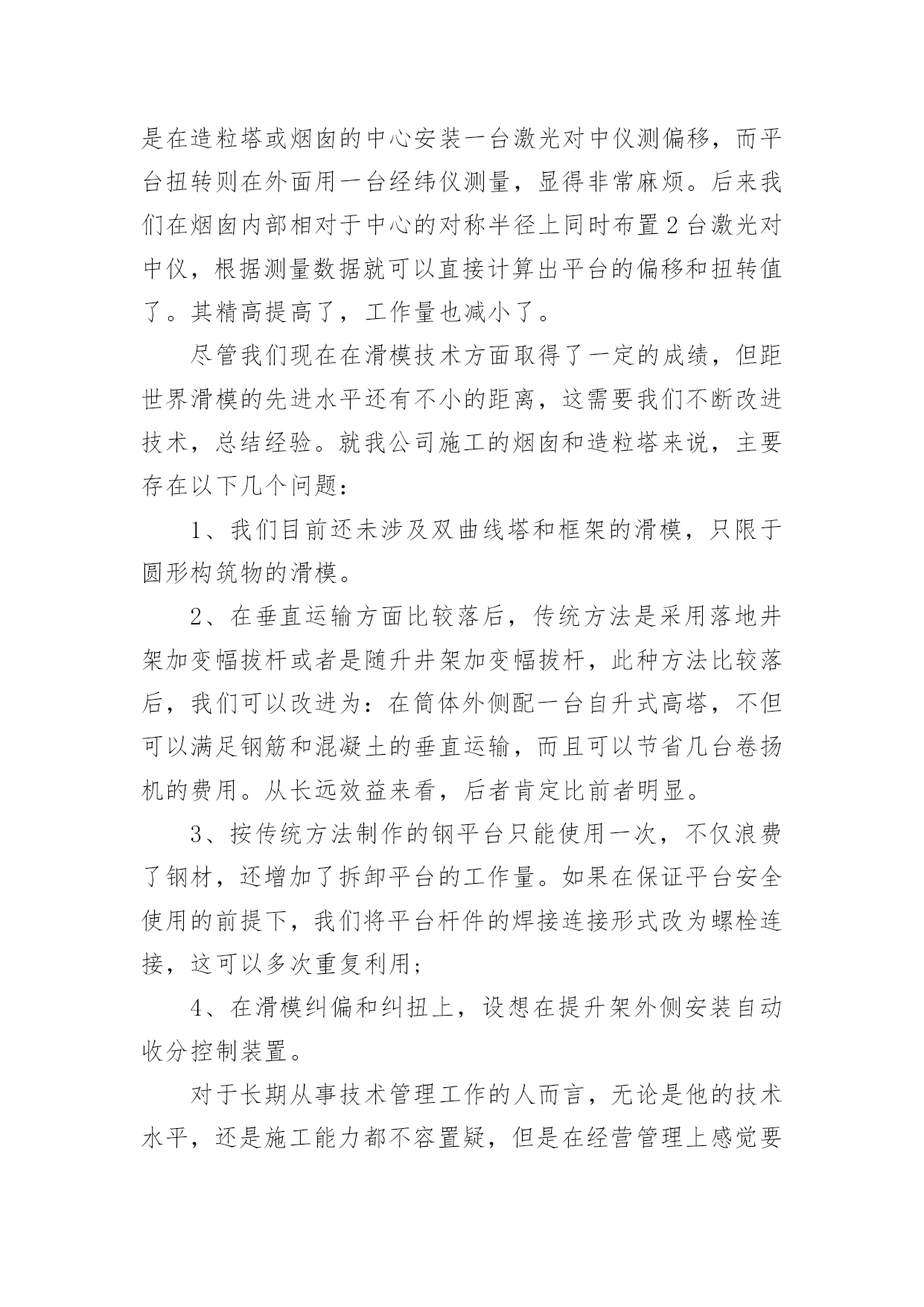 工程技术人员月度工作总结作为一名工程技术人员,除了严格按施工图和国家规范规程以及施工方案办事外,还要在工作中不断总结经验。今天小编给大家为您整理了工程技术人员月度工作总结,希望对大家有所帮助。工程技术人员月度工作总结范文一无论是作为一名普通的工程技术人员,还是作为一个工程项目的技术负责人,我感到要干好一个工程,不仅要严格遵守国家施工规范规程,还要理论联系实际,活学活用,不断总结施工和管理经验,技术上不断改进和创新。本人在工作中,接触到许多烟囱,体会到只有技术上不断创新,设备不断更新,才能创造出更大的经济效益和社会效益。比如,以前在造粒塔和烟囱的滑模中,我们用来提升滑模平台的是小吨位千斤顶(额定起重量为3.5t),后来经过论证和技术经济分析比较,决定从xx烟囱开始采用大吨位千斤顶(额定起重量为6.0t),与小吨位千斤顶相比有以下优点:可以节约一半的支承杆;支承杆脱空长度更高,滑模安全性可以得到更大的保证;减少了支承杆的加固工作量。在xx年和xx年施工的贵州xx工程的2个烟囱和xx供热工程的烟囱,就采用了大吨位千斤顶,其技术和经济效益十分明显。另外,在滑模测量技术上我们也进行了改革。以前一般是在造粒塔或烟囱的中心安装一台激光对中仪测偏移,而平台扭转则在外面用一台经纬仪测量,显得非常麻烦。后来我们在烟囱内部相对于中心的对称半径上同时布置2台激光对中仪,根据测量数据就可以直接计算出平台的偏移和扭转值了。其精高提高了,工作量也减小了。尽管我们现在在滑模技术方面取得了一定的成绩,但距世界滑模的先进水平还有不小的距离,这需要我们不断改进技术,总结经验。就我公司施工的烟囱和造粒塔来说,主要存在以下几个问题:1、我们目前还未涉及双曲线塔和框架的滑模,只限于圆形构筑物的滑模。2、在垂直运输方面比较落后,传统方法是采用落地井架加变幅拔杆或者是随升井架加变幅拔杆,此种方法比较落后,我们可以改进为:在筒体外侧配一台自升式高塔,不但可以满足钢筋和混凝土的垂直运输,而且可以节省几台卷扬机的费用。从长远效益来看,后者肯定比前者明显。3、按传统方法制作的钢平台只能使用一次,不仅浪费了钢材,还增加了拆卸平台的工作量。如果在保证平台安全使用的前提下,我们将平台杆件的焊接连接形式改为螺栓连接,这可以多次重复利用;4、在滑模纠偏和纠扭上,设想在提升架外侧安装自动收分控制装置。对于长期从事技术管理工作的人而言,无论是他的技术水平,还是施工能力都不容置疑,但是在经营管理上感觉要欠缺些。当然这除了与他自身是否愿意学习有关,但还与我们企业内部各专业分工过细不无关系。因此一个企业要想造就更多的复合性人才,就必须加强技术人员的经营理念培养和适应市场经济的能力。这点是我本人体会最深的。总之,作为一名工程技术人员,除了严格按施工图和国家规范规程以及施工方案办事外,还要在工作中不断总结经验,吸取教训,大胆进行技术改革和创新,在施工组织设计和施工方案上不断优化,努力将自己的专业水平和业务能力提高到一个新的台阶。工程技术人员月度工作总结范文二一个季度的时间很快过去了,在这一个季度多时间里,我在公司领导、部门领导和同事们的关心与帮助下,工作能力与专业技术有了更进一步的提高。在这季度终岁末之时,总结自己工作中的成绩和收获,从而找出不足,以利于今后能够更好的.完成工资任务,也衷心希望大家对总结不妥之处给予指正,对我来说是极大的帮助。在过去的一个季度多时间里,我在xx项目一组团担任土建监理工程师职务,该项目涉及到土建、电气设备、园林工艺、市政管网等多种专业,是比较大的综合性项目,作为土建监理工程师的我,感到任重而道远,特别是高层建筑施工,工程量大而且施工难度和质量要求都比较高,针对该特点,在项目监理部总监及总代的带领下,制定了具有针对性的、切实可行的监理方案。从基础到主体,每道施工工序严格按照监理规范、图纸设计和国家现行施工质量验收规范实施监理工作,以抓好对建筑材料的质量控制和对施工工艺的质量控制为重点工作,确保建筑物结构安全,对工程所需的原材料审查其材料质保单、复检报告、见证取样、送检,审查其试验结果,确保原材料质量。在高层主体施工中严格检查钢筋的绑扎质量和钢筋的保护层厚度以及砼的浇筑振捣,对各施工过程中的巡视、检查所发现的问题及时采用口头形式或书面形式通知施工单位项目部,做到发现问题及时向总监汇报,并督促施工单位落实整改及进行再次的复核检查,并要求监理人员做好关键部位的旁站监理,尽自己最大的努力做好监理控制质量的事前与事中控制,尽职尽职的做好我应该做的工作,坚持了严格按图、按规范、合同实施监理,确保各分项、分部工程的合格验收。在1-5#楼及37#楼主体结构施工现场的监理工作中,我深感自己对主体结构工程的不足之处,对此我查阅了大量的技术规范和施工验收规范,通过自身的学习和实践掌握了与主体结构