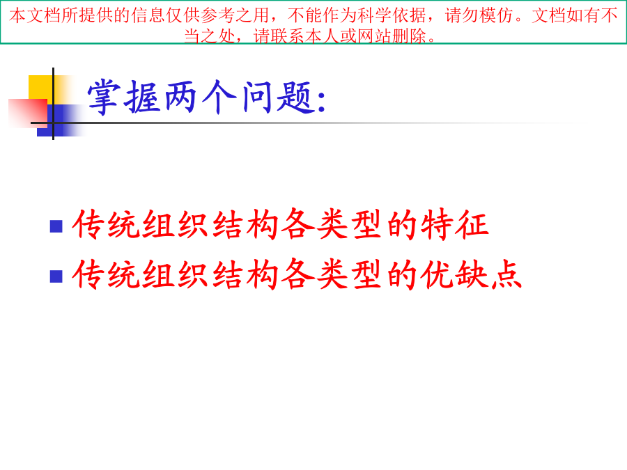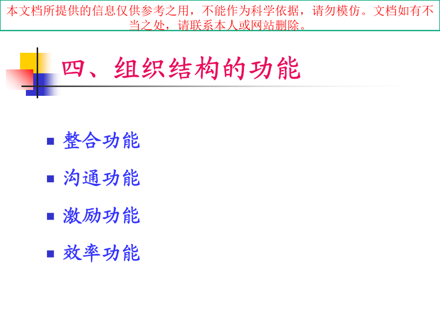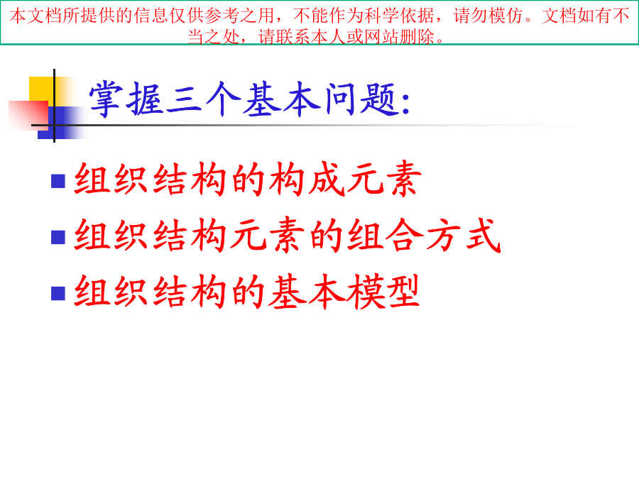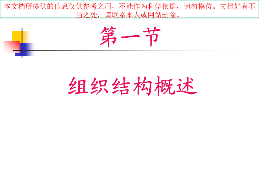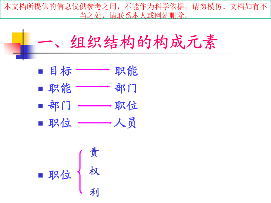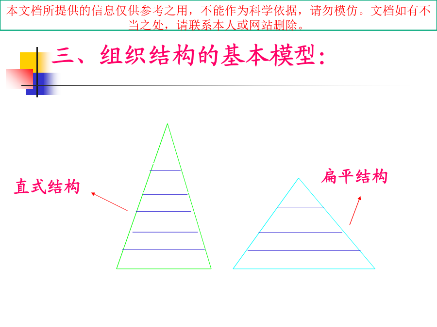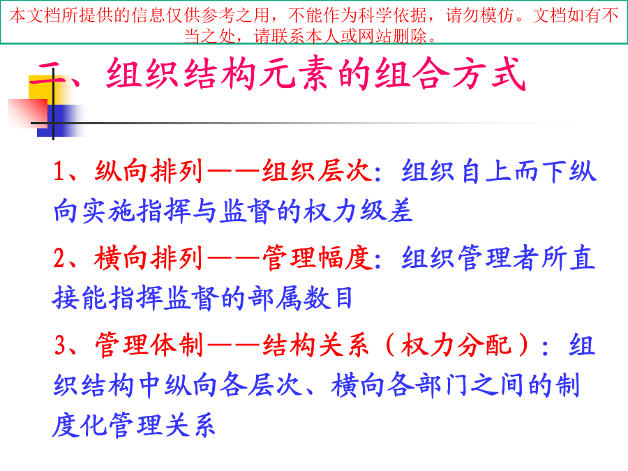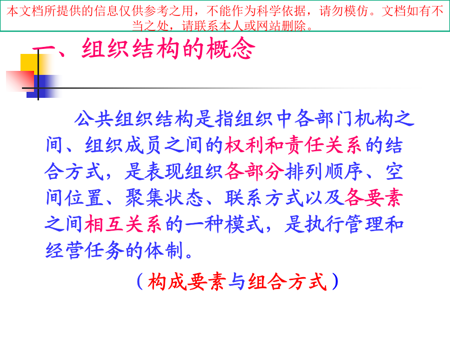 主要内容第一节掌握三个基本问题:一、组织结构的概念一、组织结构的构成元素二、组织结构元素的组合方式四、组织结构的功能第二节掌握两个问题:传统组织结构类型有:一、直线制二、职能制校长省长思考并画出:四、事业部制五、矩阵制提问:第三节新型组织结构类型主要有:委员会制(民主决策导向)团队型(平等协作导向)虚拟型(弹性运行导向)网络型(无边界导向)任务型(任务效率导向)第四节主要内容一、公共组织结构的设计思路2.影响因素组织环境组织战略组织规模组织技术权力体制3.设计内容职能部门管理幅度和层次设计职权设计(管理体制)管理规范设计二、公共组织结构基本模式——科层制三、公共组织结构现状(以我国政府组织为案例)我国政府组织的纵向层级:国务院一、国务院秘书机构(1个)国务院办公厅二、国务院组成部委(25个)三、国务院直属机构(16个)四、国务院直属特设机构(1个)国务院国有资产监督管理委员会五、国务院办事机构(7个)国务院侨务办公室六、国务院直属事业单位(13个)新华通讯社国务院部委管理的局(19个)国务院办公厅——国家信访局国务院议事协调机构(19个)国家国防动员委员会国家边海防委员会国务院中央军委空中交通管制委员会全国爱国卫生运动会全国绿化委员会国务院学位委员会国家防汛抗旱总指挥部国务院妇女儿童工作委员会全国拥军优属拥政爱民工作领导小组国务院残疾人工作委员会国务院扶贫开发领导小组国务院关税税则委员会国家减灾委员会国家科技教育领导小组国家军队干部转业安置领导小组国家禁毒委员会全国老龄工作委员会国务院西部地区开发领导小组国务院抗震救灾指挥部国家信息化领导小组国务院安全生产委员会国务院防治艾滋病工作委员会国家森林防火指挥部国务院三峡工程建设委员会国务院南水北调工程建设委员会国务院纠正行业不正之风办公室国务院防范和处理邪教办公室国务院反垄断委员会国务院食品安全委员会国务院深化医药卫生体制改革领导小组国务院新型农村社会养老保险试点工作领导小组国务院促进中小企业发展领导小组中央机构编制委员会管理体制:同级组织权力归属关系——行政首长负责制各级行政部门权力隶属关系——分离制(双重领导)中央与地方权力分配关系——民主集中制管理规范:中华人民共和国宪法中华人民共和国国务院组织法中华人民共和国地方各级人民政府组织法我国政府组织结构的生长趋势:课外作业:四、我国公共组织结构改造案例分析案例一:2008年国务院机构改革(横向)本次国务院机构改革主要内容:本次机构改革重点——大部门制的试点推行大部门制改革的背景大部门制改革的必要性大部门制改革的目的本次改革与以往改革的比较2013年国务院机构改革(横向)2013大部制改革方案案例二:省直管县改革(纵向)改革起因:改革进展:改革动因:“市管县”体制的弊端一是过多的行政层级造成管理效率低下,出现“市卡县”现象。“市管县”体制增加了行政管理的层级,造成行政管理效率的损失。一方面,行政层级的增加,导致信息传递速度的降低和信息失真风险的扩大,上情难以及时准确地下达,下情也难以及时准确地上达,影响行政效率。行政管理的层次增加必然导致更多的政府干预,不利于市场作用的充分发挥。二是城市偏向导致市与县争利,出现“市刮县”现象,县域发展机能弱化。“市管县”体制实际上是缩小了县级政府的自主权,而扩大了市级政府的管理权限,带有明显的城市偏向性,社会经济资源主要被市所汲取,县只能听命于市,地位被矮化,发展机能弱化;一些中心城市以“摊大饼”的方式盲目无序扩张的现象,与县争资源、争土地、争项目。由此带来耕地流失、农民失地等一系列问题。三是县乡财权与事权不对称,县乡财力弱化。权力特别是财权集中在市级政府的后果是县财权减少,事权却无法推卸。“市管县”的体制下市级政府上提财权,下压事权的空间很大。县域财政的财源结构单一,财政实力弱;同时财权与事权不对称,财权及财力向上集中,事权及责任不断下移,县级财政处于“小斗进,大斗出”的尴尬境地,个别地市成了县财力的“抽水机”。转移支付制度不完善,中央财政和省市级财政对县乡财政转移支付的规模较小,分配不规范,各种转移支付形式之间缺乏协调。一些地方还存在市级政府截留的现象,县乡财政负债严重。四是“小马拉大车”的城乡格局使市难以带县。在我国现有的地级市中,除了一部分本身经济实力较强,对周边县具有天然的辐射带动作用的市以外,还有很大部分是在“合并、升格”的大趋势中通过行政指定的方式形成的,经济实力有限,辐射带动作用不强,出现“小马拉大车”的局面,有些市级政府基本上无暇顾及所辖县域经济发展。国务院机构改革和职能转变方案计划表课外思考题: