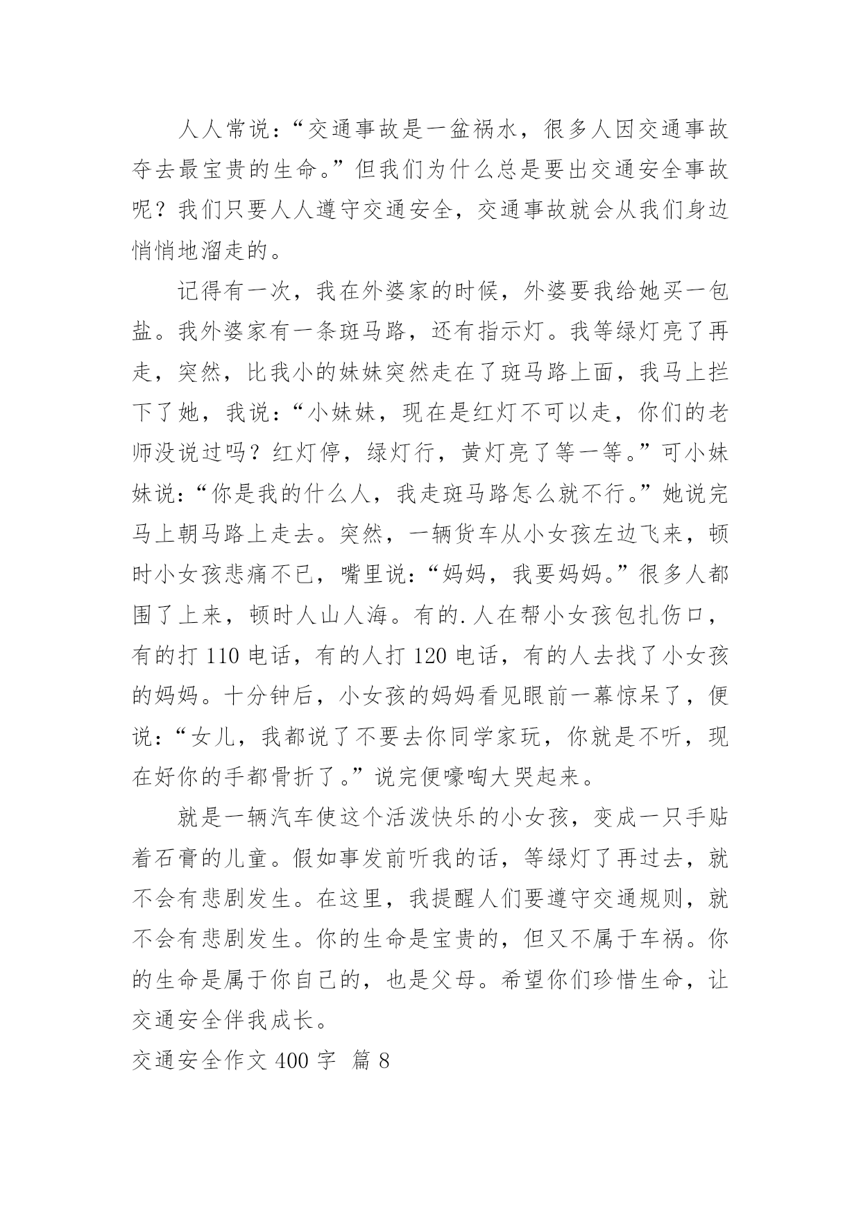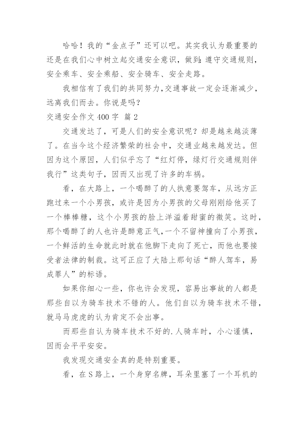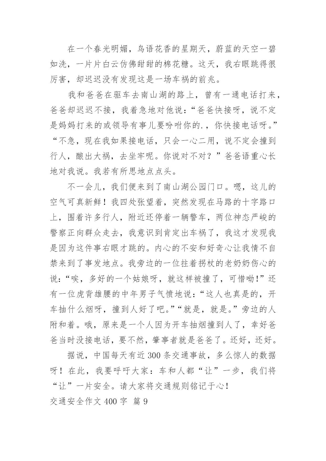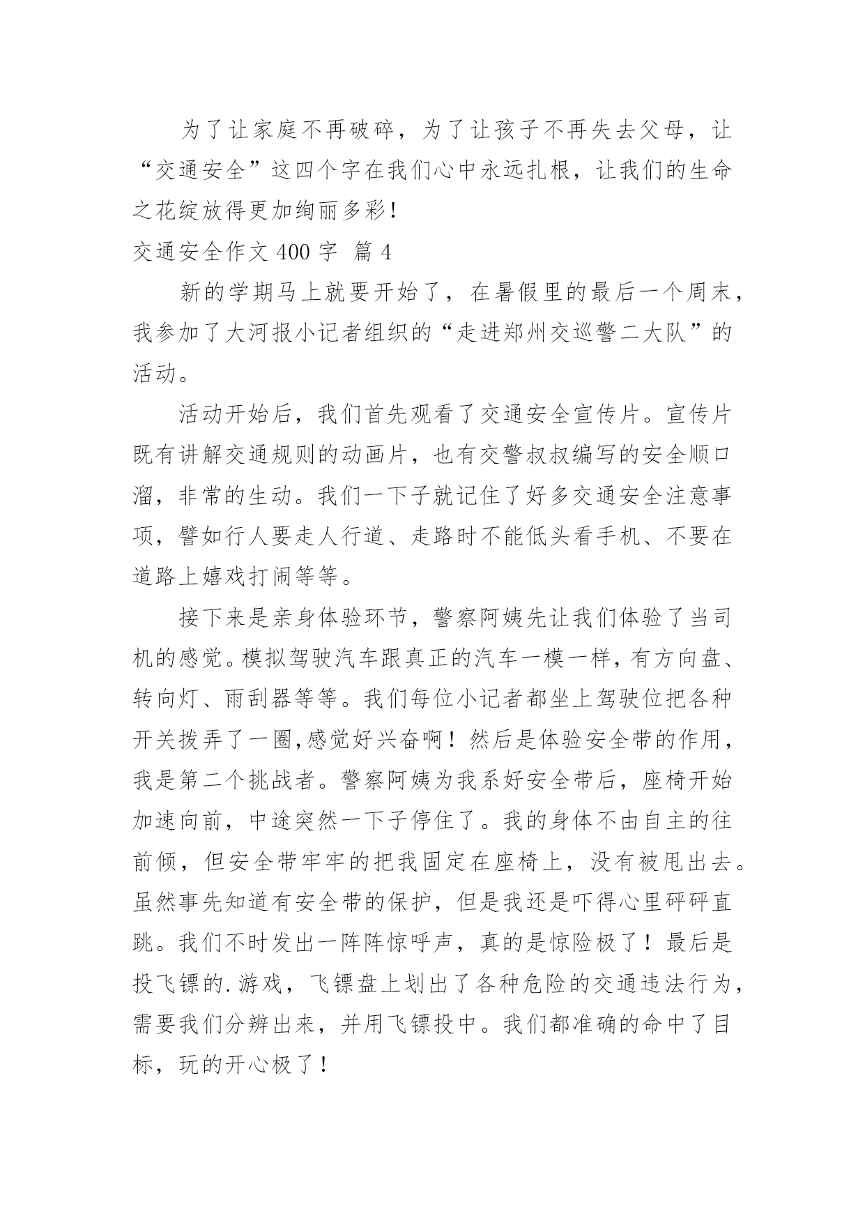 交通安全作文400字交通安全作文400字10篇(优选)在日复一日的学习、工作或生活中,大家都尝试过写作文吧,借助作文可以宣泄心中的情感,调节自己的心情。那要怎么写好作文呢?下面是小编精心整理的交通安全作文400字10篇,供大家参考借鉴,希望可以帮助到有需要的朋友。交通安全作文400字篇1每天我陪爸爸看晚间新闻的时候,经常看到一些有关交通事故的报道,那情景惨不忍睹。我觉得主要原因是有的驾驶员叔叔酒后驾车、疲劳开车、违规超载,还有的驾驶报废车上路,有的行人不能自觉遵守交通规则而造成的`。在此,我提几个“金点子”与大家分享:一、在“紧急路口”两旁建一个“机器护栏”,如果遇到有汽车超速驶过来,护栏就自动放下,并亮起警灯,发出警报,等汽车靠近时就自动把这辆车的车牌和驾驶员拍摄下来,并通知驾驶员到交警大队进行培训学习。二、在汽车来往频繁的马路两旁放几个“马路机器手”,如果你急着到马路对面办事,你可以走到“马路机器手”前面按一下机器手身上的一个键,它就安全地伸手把你送到目的地。如果你不遵守交通规则,乱闯红灯,它就不客气地伸出机器手把你抓住,带到一个特殊的房子里,让你在里面背交通规则。哈哈!我的“金点子”还可以吧。其实我认为最重要的还是在我们心中树立起交通安全意识,做到:遵守交通规则,安全乘车、安全乘船、安全骑车、安全走路。我相信有了我们的共同努力,交通事故一定会逐渐减少,远离我们而去。你说是吗?交通安全作文400字篇2交通发达了,可是人们的安全意识呢?却是越来越淡薄了。在当今这个经济繁荣的社会中,交通业越来越发达。但因为这个原因,人们似乎忘了“红灯停,绿灯行交通规则伴我行”这类句子,因而又出现了许多的车祸。看,在大路上,一个喝醉了的人执意要驾车,从远方正跑过来一个小男孩,或许是因为小男孩的父母刚刚给他买了一个棒棒糖,这个小男孩的脸上洋溢着甜蜜的微笑。这时,那个喝醉了的人也许是醉意正气,一个不留神撞向了小男孩,一个鲜活的生命就此时就在他脚下走向了死亡,而他也要接受者法律的制裁。这可正应了大陆上那句话“醉人驾车,易成罪人”的标语。如果你细心一些,你也许会发现,容易出事故的人都是那些自以为骑车技术不错的人。他们自以为骑车技术不错,就马马虎虎的认为肯定不会出事。而那些自认为骑车技术不好的.人骑车时,小心谨慎,因而会平平安安。我发现交通安全真的是特别重要。看,在S路上,一个身穿名牌,耳朵里塞了一个耳机的男子正在骑着一辆电动车,或许他认为自己骑车技术良好,就大胆起来,他一会把手放开,一会飞速前进。忽然,在一个转弯处,他因行使太快而刹车失灵撞在了道路旁边的小花池上。此时,殷红的鲜血从他的头上汨汨流出,一幕人仰马翻的惨剧有在大道上上演了。交通安全作文400字篇3每当打开电视机收看新闻时,常常会看到一些车祸的消息。每当看到那些惨不忍睹的画面,总令人触目惊心。俗话说:“天有不测风云,人有旦夕祸福。”尤其是当今车辆发展迅猛的时代,交通安全问题显得日益严重。如果不遵守交通规则,车祸随时都有可能发生,一幕幕惨剧就会上演。记得有一次我也差一点没被车撞。早上我背着书包去上学,到了路口,一辆公交车停了下来,给我让路。我出于礼貌疾走了过去,可刚穿过去,公交车的另一侧却冲出来了一辆银色的别克君威,我一下子呆站在那儿不知所措,幸好车子刹住了。事后,我一直沉浸在后怕当中:如果他没有踩刹车怎么办?后果一定不堪设想。我告诫自己以后一定不能像今天一样太匆忙了,要等到没车了才能走。有一次,我在电视上看见一个三口之家在春节前夕兴致勃勃的乘坐一辆开往自己老家的大客车准备回家过节。可由于车上严重超载,在在凌晨2:00时,车子的刹车失灵,最终一家三口都葬身在这辆大客车上。血淋淋的.事实为我们敲响了交通安全的警钟。为了让家庭不再破碎,为了让孩子不再失去父母,让“交通安全”这四个字在我们心中永远扎根,让我们的生命之花绽放得更加绚丽多彩!交通安全作文400字篇4新的学期马上就要开始了,在暑假里的最后一个周末,我参加了大河报小记者组织的“走进郑州交巡警二大队”的活动。活动开始后,我们首先观看了交通安全宣传片。宣传片既有讲解交通规则的动画片,也有交警叔叔编写的安全顺口溜,非常的生动。我们一下子就记住了好多交通安全注意事项,譬如行人要走人行道、走路时不能低头看手机、不要在道路上嬉戏打闹等等。接下来是亲身体验环节,警察阿姨先让我们体验了当司机的感觉。模拟驾驶汽车跟真正的汽车一模一样,有方向盘、转向灯、雨刮器等等。我们每位小记者都坐上驾驶位把各种开关拨弄了一圈,感觉好兴奋啊!然后是体验安全带的作用,我是第二个挑战者。警察阿姨为我系好安全带后,座椅开始加速向前,中途突然一下子停住了。我的身体不由自主的往前倾,但安全带牢牢的把我固定在座椅上,没有被甩出去。虽然事先知道有安全带的保护,但是我还是吓得心里砰砰直跳。