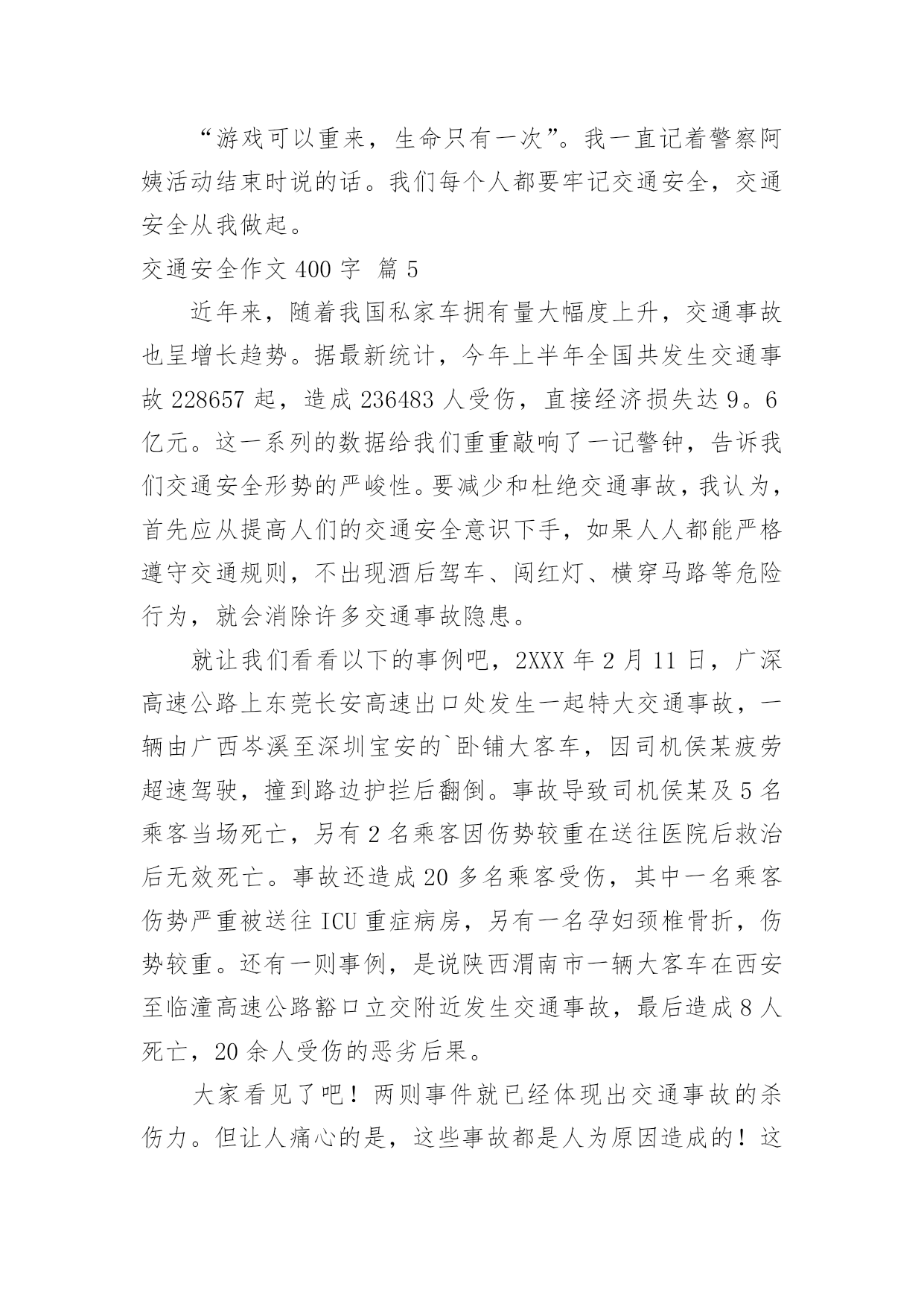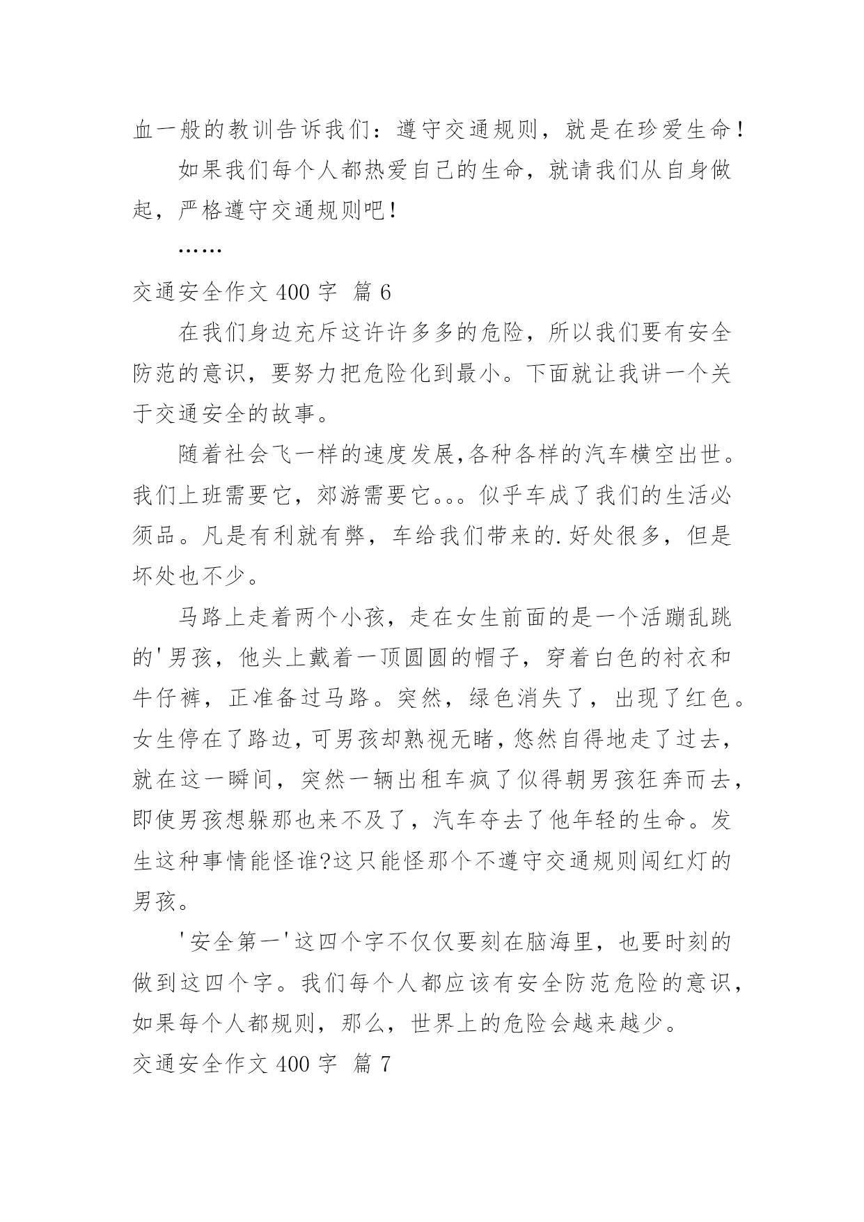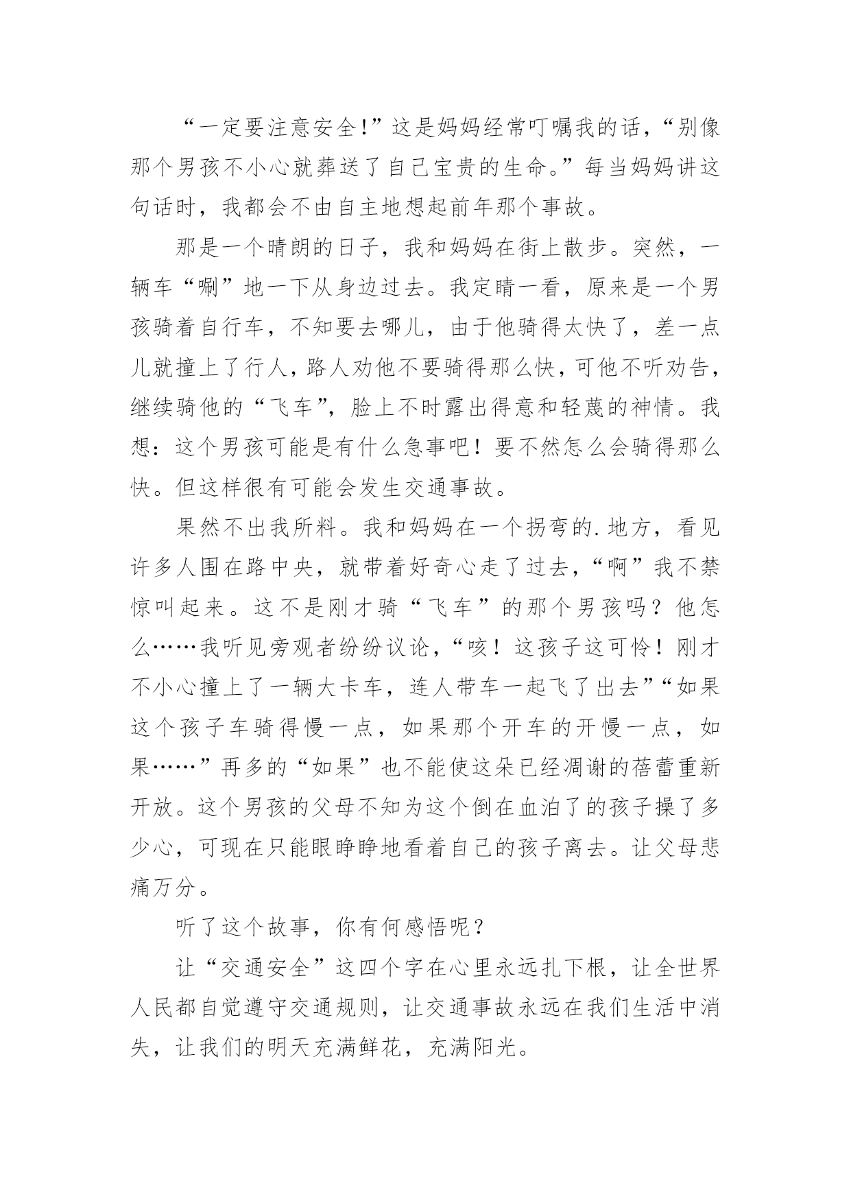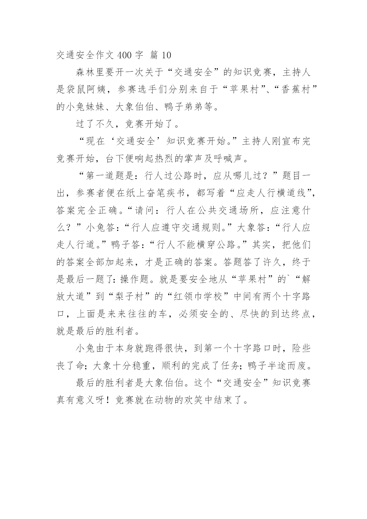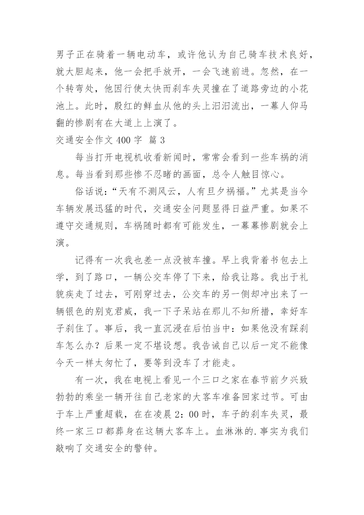 交通安全作文400字交通安全作文400字10篇(优选)在日复一日的学习、工作或生活中,大家都尝试过写作文吧,借助作文可以宣泄心中的情感,调节自己的心情。那要怎么写好作文呢?下面是小编精心整理的交通安全作文400字10篇,供大家参考借鉴,希望可以帮助到有需要的朋友。交通安全作文400字篇1每天我陪爸爸看晚间新闻的时候,经常看到一些有关交通事故的报道,那情景惨不忍睹。我觉得主要原因是有的驾驶员叔叔酒后驾车、疲劳开车、违规超载,还有的驾驶报废车上路,有的行人不能自觉遵守交通规则而造成的`。在此,我提几个“金点子”与大家分享:一、在“紧急路口”两旁建一个“机器护栏”,如果遇到有汽车超速驶过来,护栏就自动放下,并亮起警灯,发出警报,等汽车靠近时就自动把这辆车的车牌和驾驶员拍摄下来,并通知驾驶员到交警大队进行培训学习。二、在汽车来往频繁的马路两旁放几个“马路机器手”,如果你急着到马路对面办事,你可以走到“马路机器手”前面按一下机器手身上的一个键,它就安全地伸手把你送到目的地。如果你不遵守交通规则,乱闯红灯,它就不客气地伸出机器手把你抓住,带到一个特殊的房子里,让你在里面背交通规则。哈哈!我的“金点子”还可以吧。其实我认为最重要的还是在我们心中树立起交通安全意识,做到:遵守交通规则,安全乘车、安全乘船、安全骑车、安全走路。我相信有了我们的共同努力,交通事故一定会逐渐减少,远离我们而去。你说是吗?交通安全作文400字篇2交通发达了,可是人们的安全意识呢?却是越来越淡薄了。在当今这个经济繁荣的社会中,交通业越来越发达。但因为这个原因,人们似乎忘了“红灯停,绿灯行交通规则伴我行”这类句子,因而又出现了许多的车祸。看,在大路上,一个喝醉了的人执意要驾车,从远方正跑过来一个小男孩,或许是因为小男孩的父母刚刚给他买了一个棒棒糖,这个小男孩的脸上洋溢着甜蜜的微笑。这时,那个喝醉了的人也许是醉意正气,一个不留神撞向了小男孩,一个鲜活的生命就此时就在他脚下走向了死亡,而他也要接受者法律的制裁。这可正应了大陆上那句话“醉人驾车,易成罪人”的标语。如果你细心一些,你也许会发现,容易出事故的人都是那些自以为骑车技术不错的人。他们自以为骑车技术不错,就马马虎虎的认为肯定不会出事。而那些自认为骑车技术不好的.人骑车时,小心谨慎,因而会平平安安。我发现交通安全真的是特别重要。看,在S路上,一个身穿名牌,耳朵里塞了一个耳机的男子正在骑着一辆电动车,或许他认为自己骑车技术良好,就大胆起来,他一会把手放开,一会飞速前进。忽然,在一个转弯处,他因行使太快而刹车失灵撞在了道路旁边的小花池上。此时,殷红的鲜血从他的头上汨汨流出,一幕人仰马翻的惨剧有在大道上上演了。交通安全作文400字篇3每当打开电视机收看新闻时,常常会看到一些车祸的消息。每当看到那些惨不忍睹的画面,总令人触目惊心。俗话说:“天有不测风云,人有旦夕祸福。”尤其是当今车辆发展迅猛的时代,交通安全问题显得日益严重。如果不遵守交通规则,车祸随时都有可能发生,一幕幕惨剧就会上演。记得有一次我也差一点没被车撞。早上我背着书包去上学,到了路口,一辆公交车停了下来,给我让路。我出于礼貌疾走了过去,可刚穿过去,公交车的另一侧却冲出来了一辆银色的别克君威,我一下子呆站在那儿不知所措,幸好车子刹住了。事后,我一直沉浸在后怕当中:如果他没有踩刹车怎么办?后果一定不堪设想。我告诫自己以后一定不能像今天一样太匆忙了,要等到没车了才能走。有一次,我在电视上看见一个三口之家在春节前夕兴致勃勃的乘坐一辆开往自己老家的大客车准备回家过节。可由于车上严重超载,在在凌晨2:00时,车子的刹车失灵,最终一家三口都葬身在这辆大客车上。血淋淋的.事实为我们敲响了交通安全的警钟。为了让家庭不再破碎,为了让孩子不再失去父母,让“交通安全”这四个字在我们心中永远扎根,让我们的生命之花绽放得更加绚丽多彩!交通安全作文400字篇4新的学期马上就要开始了,在暑假里的最后一个周末,我参加了大河报小记者组织的“走进郑州交巡警二大队”的活动。活动开始后,我们首先观看了交通安全宣传片。宣传片既有讲解交通规则的动画片,也有交警叔叔编写的安全顺口溜,非常的生动。我们一下子就记住了好多交通安全注意事项,譬如行人要走人行道、走路时不能低头看手机、不要在道路上嬉戏打闹等等。接下来是亲身体验环节,警察阿姨先让我们体验了当司机的感觉。模拟驾驶汽车跟真正的汽车一模一样,有方向盘、转向灯、雨刮器等等。我们每位小记者都坐上驾驶位把各种开关拨弄了一圈,感觉好兴奋啊!然后是体验安全带的作用,我是第二个挑战者。警察阿姨为我系好安全带后,座椅开始加速向前,中途突然一下子停住了。我的身体不由自主的往前倾,但安全带牢牢的把我固定在座椅上,没有被甩出去。虽然事先知道有安全带的保护,但是我还是吓得心里砰砰直跳。