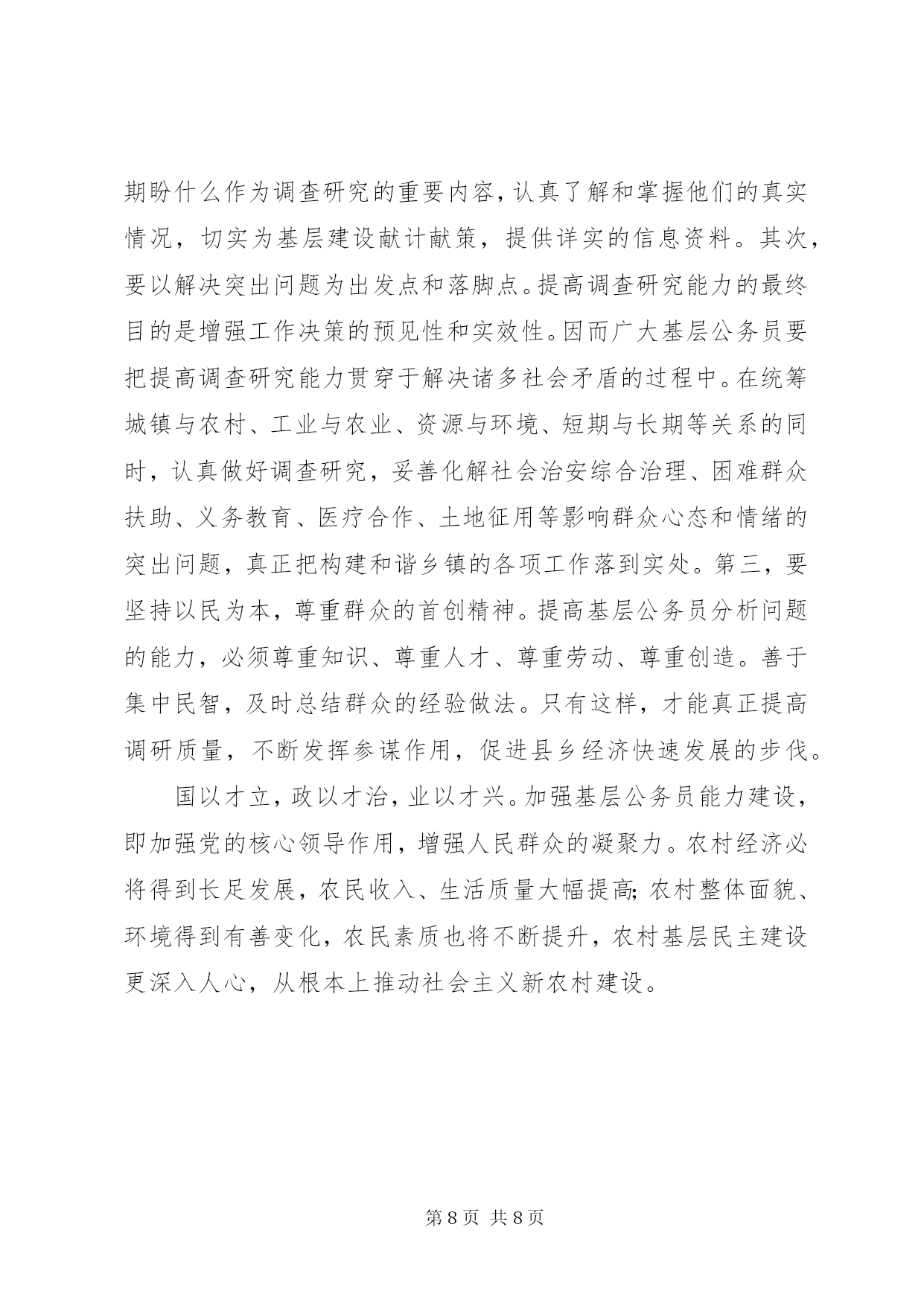 第PAGE\*Arabic\*MERGEFORMAT8页共NUMPAGES\*MERGEFORMAT8页县乡公务员能力建设现状调查与对策研究县乡公务员能力建设现状调查与对策研究加强公务员队伍建设,尤其是县乡基层公务员的能力建设,不仅是加强党的组织建设、巩固党的执政地位的现实需要,同时也是经济社会发展的客观需要。如何与时俱进、不断适应与满足新形势和新任务的需要,是公务员队伍素质能力建设的一个紧迫而重要的任务。一、基本情况市地处东北角,西北滨长江水道,与、隔江相望;东南依幕与amp;amp;amp;县和、、赤壁毗连;扼控的咽喉,自古是兵家必争之地,素有“湘北门户”之称。1992年撤县设市(县级市),市域面积1754平方公里,辖22个乡镇、2个办事处,总人口50万。自推行国家公务员制度以来,该市公务员队伍在市委市政府的高度重视下,历经10余年的建设和发展,已经初步形成了一支能够适应形势发展需要的充满生机与活力、勤政务实高效的公务员队伍。截止底,全市在职公务员共有1811人。其中:处级以上领导职务的有53人,具有科级职务的907人,分别占全市公务员总数的2.9%、50.01%。具有研究生以上学历的2人,占0.1%;具有大学本科学历的461人,占25.45%;具有专科学历的767人,占42.35%。在年龄结构上,45岁以上公务员为707人,占公务员总数的39.04%,35岁以下公务员441人,占公务员总数的24.35%。从总体上看,与1995年推行公务员制度初期相比,公务员队伍在数量上趋于精简,结构上不断优化,素质和能力上进一步提高。二、公务员队伍能力建设存在的问题虽然我市公务员队伍建设取得了一定成绩,但随着经济社会的发展,我市公务员队伍在思想观念、行为方式和工作效率等方面与经济建设和社会发展的要求还有一定的差距。(一)公务员队伍整体素质与农村经济发展还有差距。市是一个农业大市,随着市场经济的快速发展,我市急需一大批掌握现代经济管理、企业经营管理、外贸、农业、旅游、畜牧养殖和各类法律法规知识的复合型行政管理人才来支撑和推进经济社会事业的快速发展。而目前我市公务员队伍专业结构比较单一,懂经济、会管理的公务员相对缺乏。虽然从比例上看,具备大学本科和专科学历的公务员占公务员总数的67.8%,但大部分是参加工作后脱产、半脱产、函授的进修学历,理论基础不够扎实,学习内容不够系统,对经济政策和管理知识掌握不够充分,因而,不能有效地开展工作,指导基层,切实为农服务。(二)基层公务员处理突发事件、应对复杂局面的能力偏低。由于改革开放和各种改革利益关系的调整,各类群体性、突发性事件不断出现,面对复杂局面,不少基层公务员不去认识、不懂分析、不会处理,片面地、孤立地看待和处理问题和矛盾,经常把问题上交,把问题扩大化,从而导致“到市、赴省、上京”的上访事件时有发生。(三)公务员依法行政的能力偏低。随着我国依法治国进程的加快和人民群众法律意识的增强,公务员依法行政能力已相对滞后。有的公务员受传统重权轻法思想的影响,不尊重法律法规,工作中滥用职权,以权代法,以权压法,甚至目无法纪、为所欲为,违法施政;有的对上级、领导的招呼言听计从,从不考虑群众利益和法律后果。(四)公务员队伍作风建设亟待加强。一是思想不够先进,观念陈旧。有些机关公务员精神状态和工作作风方面存在着小富即安、小进则满,安于现状、不思进取,追求安逸、不图创新等问题,这些将成为制约全市投资环境改善和经济社会又好又快发展的“瓶颈”。二是服务意识不强、质量不高。一些部门、单位受利益驱动,过分强调部门和单位的权力,却忽视了应尽的义务,在工作中重管理轻服务,或只管理不服务,严重存在着服务缺位、管理错位和执法越位等问题,制约了全市发展的质量和进程。三、加强基层公务员队伍建设的几点思考众所周知,基层公务员与人民群众的关系最直接、最密切,大都担负着团结群众、服务群众、建设农村、稳定农村的重任,是引导群众积极发展的先锋队和主力军。其能力建设的优劣不仅影响民心向背、事业兴衰,更从某种程度上促进或制约着农村经济和社会事业发展的进程。为此,笔者认为,加强基层公务员队伍建设,更需要提高五种能力,发挥五员作用。一是提高公共服务能力,当好为民排忧的服务员。皇粮国税的取消进一步彰显出政府转型的决心,说到底是政府从审批型向服务型的转变。小政府,大服务已不仅仅是一句空洞的口号,而是党在新时期坚持与时俱进、以人为本,为促进社会和谐发展所迈出的坚实步伐。当然,政府的服务离不开广大基层公务员的认真贯彻和具体操作。因而,提高基层公务员的公共服务能力便成了一项重要而紧迫的任务。提高基层公务员的公共服务能力,首先要彻底破除公务员的官本位思想,树立一心为民的公仆意识。从思想上、感情上、作风上真正解决好为群众与靠群众的问题,自觉