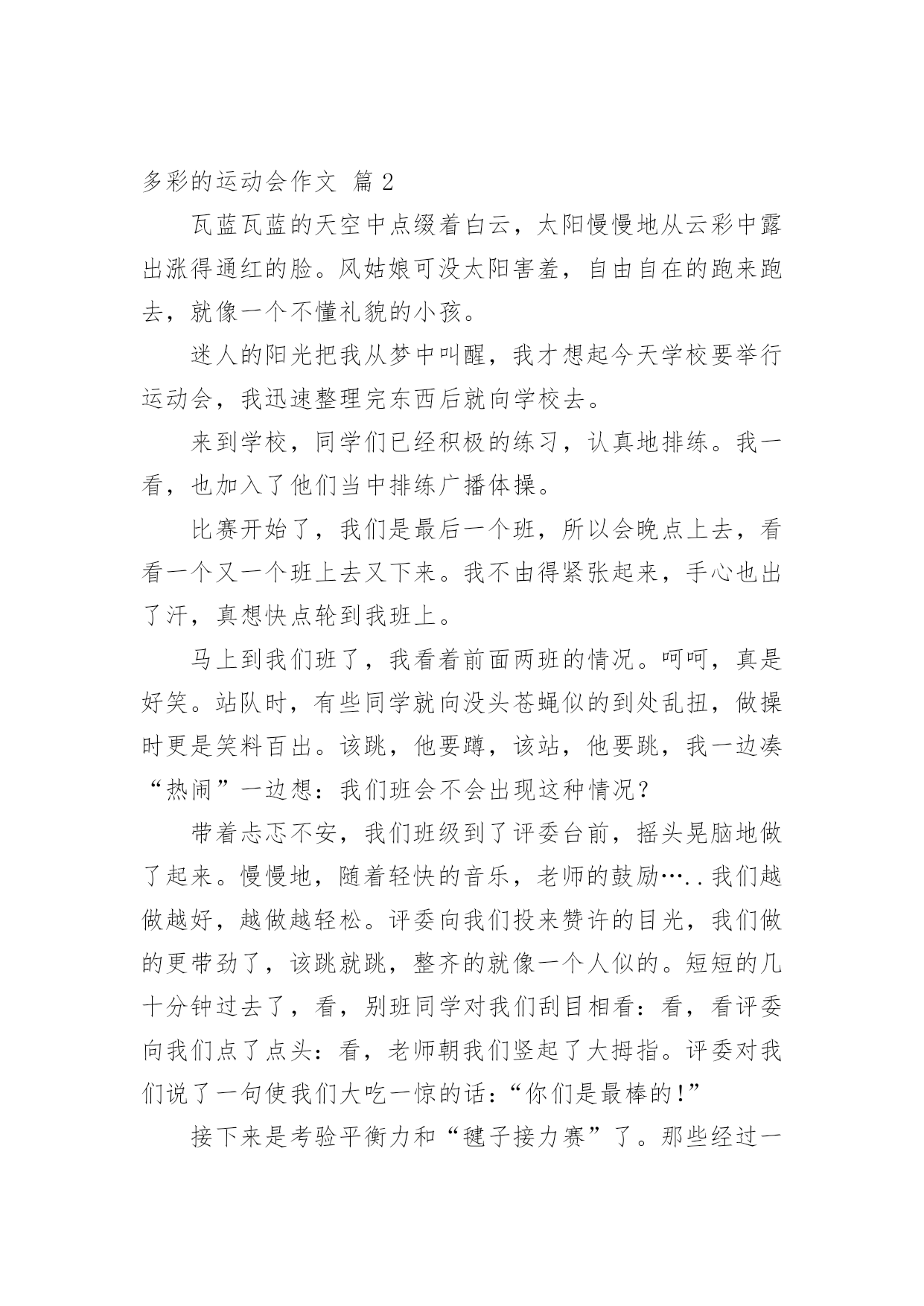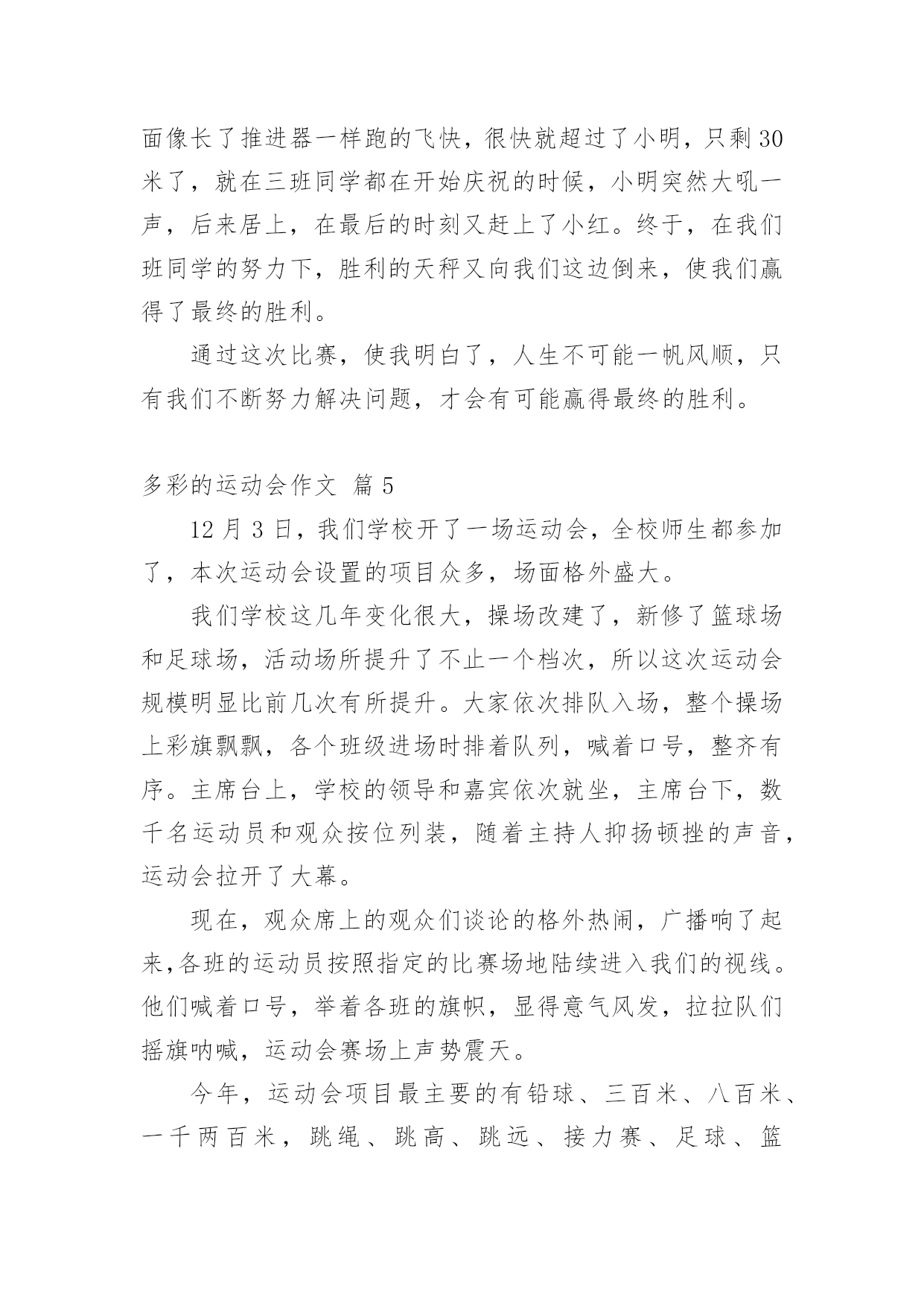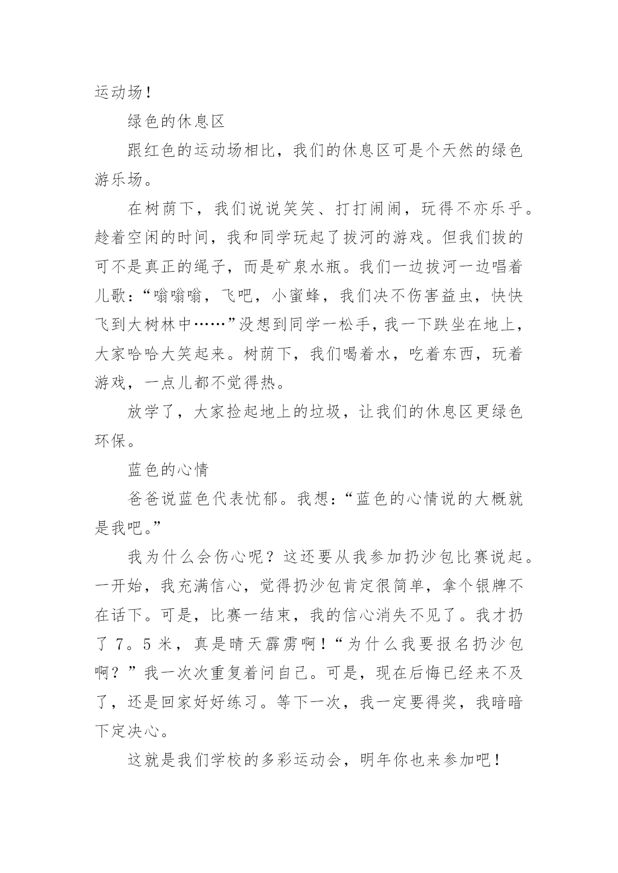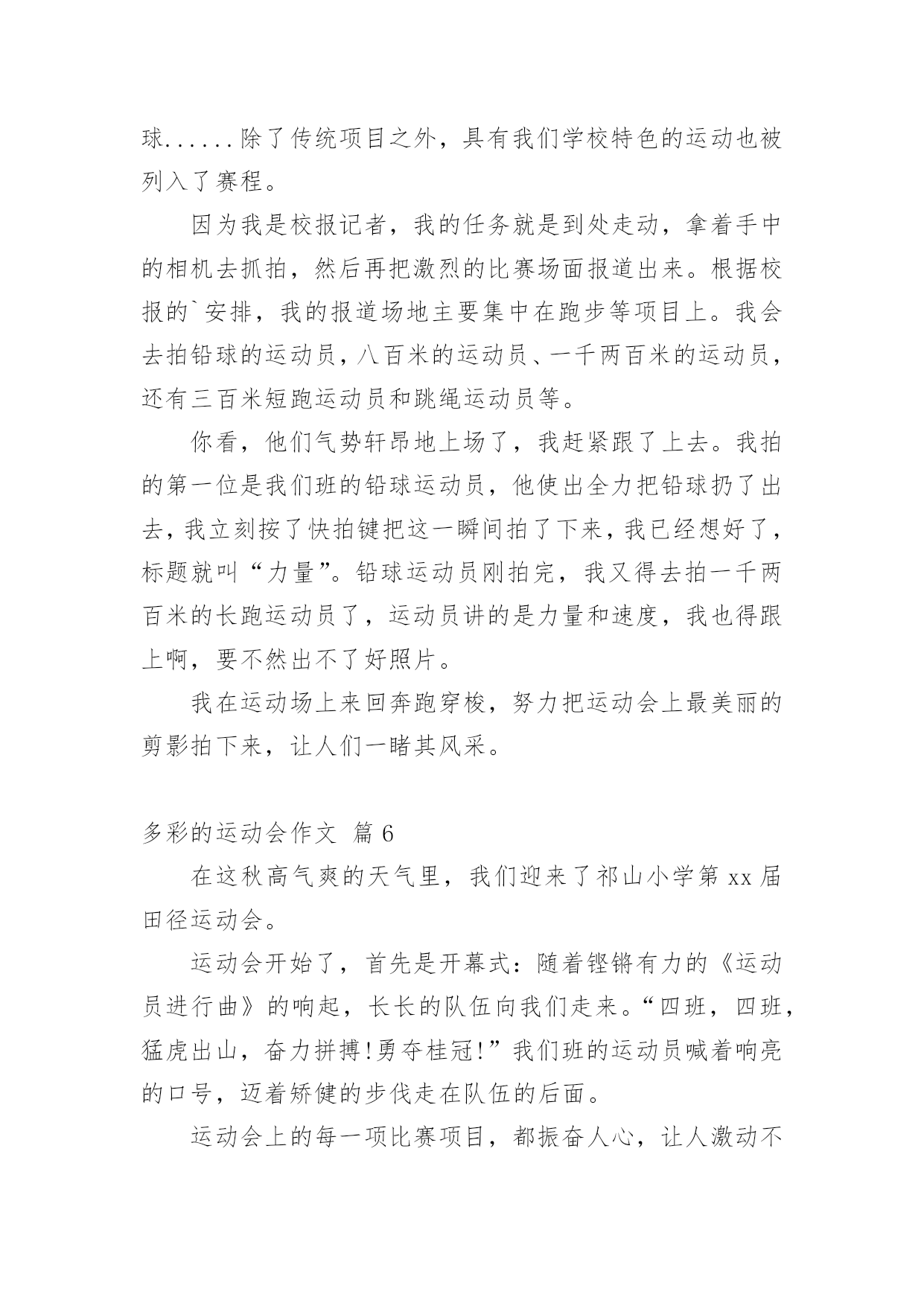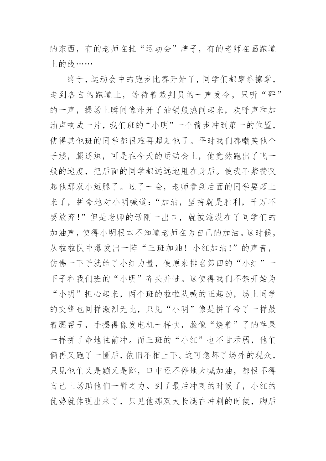 多彩的运动会作文多彩的运动会作文锦集8篇无论是在学校还是在社会中,大家都尝试过写作文吧,作文根据写作时限的不同可以分为限时作文和非限时作文。你写作文时总是无从下笔?下面是小编为大家收集的多彩的运动会作文9篇,供大家参考借鉴,希望可以帮助到有需要的朋友。多彩的运动会作文篇1春天是个五彩缤纷的季节,我们学校的运动会也跟春天一样五颜六色。红色的运动场红色代表什么?热火朝天!要说最热火朝天的地方,当然要数运动场了。看!在运动场的北面,运动员们在比赛扔沙包。只见他们一手拿着沙包,一手高高抬起,用力往正前方扔去。听!小朋友们的呐喊声此起彼伏,在操场上空回荡,他们正在给运动员加油呢!“砰”的一声枪响,激烈的跑步比赛开始了。在我们的欢呼下,我们的选手像火箭一样飞快地冲了出去。只见小杰的双手快速地前后摆动着,身体往前倾,腿迅速地向前跨。哇,最终他得了亚军!火红的太阳,红色的跑道,开心的我们,汇成了热闹的运动场!绿色的休息区跟红色的运动场相比,我们的休息区可是个天然的绿色游乐场。在树荫下,我们说说笑笑、打打闹闹,玩得不亦乐乎。趁着空闲的时间,我和同学玩起了拔河的游戏。但我们拔的可不是真正的绳子,而是矿泉水瓶。我们一边拔河一边唱着儿歌:“嗡嗡嗡,飞吧,小蜜蜂,我们决不伤害益虫,快快飞到大树林中……”没想到同学一松手,我一下跌坐在地上,大家哈哈大笑起来。树荫下,我们喝着水,吃着东西,玩着游戏,一点儿都不觉得热。放学了,大家捡起地上的垃圾,让我们的休息区更绿色环保。蓝色的心情爸爸说蓝色代表忧郁。我想:“蓝色的心情说的大概就是我吧。”我为什么会伤心呢?这还要从我参加扔沙包比赛说起。一开始,我充满信心,觉得扔沙包肯定很简单,拿个银牌不在话下。可是,比赛一结束,我的信心消失不见了。我才扔了7。5米,真是晴天霹雳啊!“为什么我要报名扔沙包啊?”我一次次重复着问自己。可是,现在后悔已经来不及了,还是回家好好练习。等下一次,我一定要得奖,我暗暗下定决心。这就是我们学校的多彩运动会,明年你也来参加吧!多彩的运动会作文篇2瓦蓝瓦蓝的天空中点缀着白云,太阳慢慢地从云彩中露出涨得通红的脸。风姑娘可没太阳害羞,自由自在的跑来跑去,就像一个不懂礼貌的小孩。迷人的阳光把我从梦中叫醒,我才想起今天学校要举行运动会,我迅速整理完东西后就向学校去。来到学校,同学们已经积极的练习,认真地排练。我一看,也加入了他们当中排练广播体操。比赛开始了,我们是最后一个班,所以会晚点上去,看看一个又一个班上去又下来。我不由得紧张起来,手心也出了汗,真想快点轮到我班上。马上到我们班了,我看着前面两班的情况。呵呵,真是好笑。站队时,有些同学就向没头苍蝇似的到处乱扭,做操时更是笑料百出。该跳,他要蹲,该站,他要跳,我一边凑“热闹”一边想:我们班会不会出现这种情况?带着忐忑不安,我们班级到了评委台前,摇头晃脑地做了起来。慢慢地,随着轻快的音乐,老师的鼓励…..我们越做越好,越做越轻松。评委向我们投来赞许的目光,我们做的更带劲了,该跳就跳,整齐的就像一个人似的。短短的几十分钟过去了,看,别班同学对我们刮目相看:看,看评委向我们点了点头:看,老师朝我们竖起了大拇指。评委对我们说了一句使我们大吃一惊的话:“你们是最棒的!”接下来是考验平衡力和“毽子接力赛”了。那些经过一番准备。要参加比赛的同学们一脸严肃,望望老师又望望同学,是在积攒勇气,还是紧张怯阵!“毽子接力赛”开始了,只见那五彩缤纷的鸡毛毽子绕着条一个同学的脚轻要做好地上下飞舞,仿佛一朵多姿多彩的彩色秋菊欲飞欲腾,又似一只彩色松鼠调皮的一蹦一跳,炫耀着他的长尾巴。那个同学踢了十下之后,讯速朝第二个选手跑去,那个选手立刻笑逐颜开,手忙脚乱地踢起来………..校园运动会结束了,我回忆看运动会时的点点滴滴,感到团结的作用可真大呀!多彩的运动会作文篇3“加油,加油……”操场上传来了一阵阵加油声。咦,为什么会有加油声?怕,原来现在操场上正在进行着一年一度的夏季运动会呀!现在正在举行的比赛是四百米的跑步比赛,只见几位选手,做着跑前的热身操,在阳光的照耀下,精神抖擞地走向了赛道。就在这时,我发现了我们班的一个同学——小沈同学。她在跑道上做了几个高抬腿,把腿一会儿往左边压压,一会儿往右边压压,她屏息凝神,就连大气也不敢出。她突然想起了以前的中级,以往跑四百米时,次次都是跑得最快,次次都是班级的第一名,次次都是用时最短,次次都会受到大伙儿的表扬与鼓励。这时,她向我们投来了一个坚定的眼神,看来她已经有了拿冠军的信心了,全班高呼了起来。就在这时,裁判换好了发令枪中的子弹,举着枪,一声令下:“各就各位……预备……”只听见“砰”的一声,选手们如同一支利箭一样,向前奋力冲去。小沈同学也不例外,她咬紧牙关,冲在最前面,把头高高地昂着,迈最快最大的步伐。我们班的同学高声呼喊道:“小沈,你
