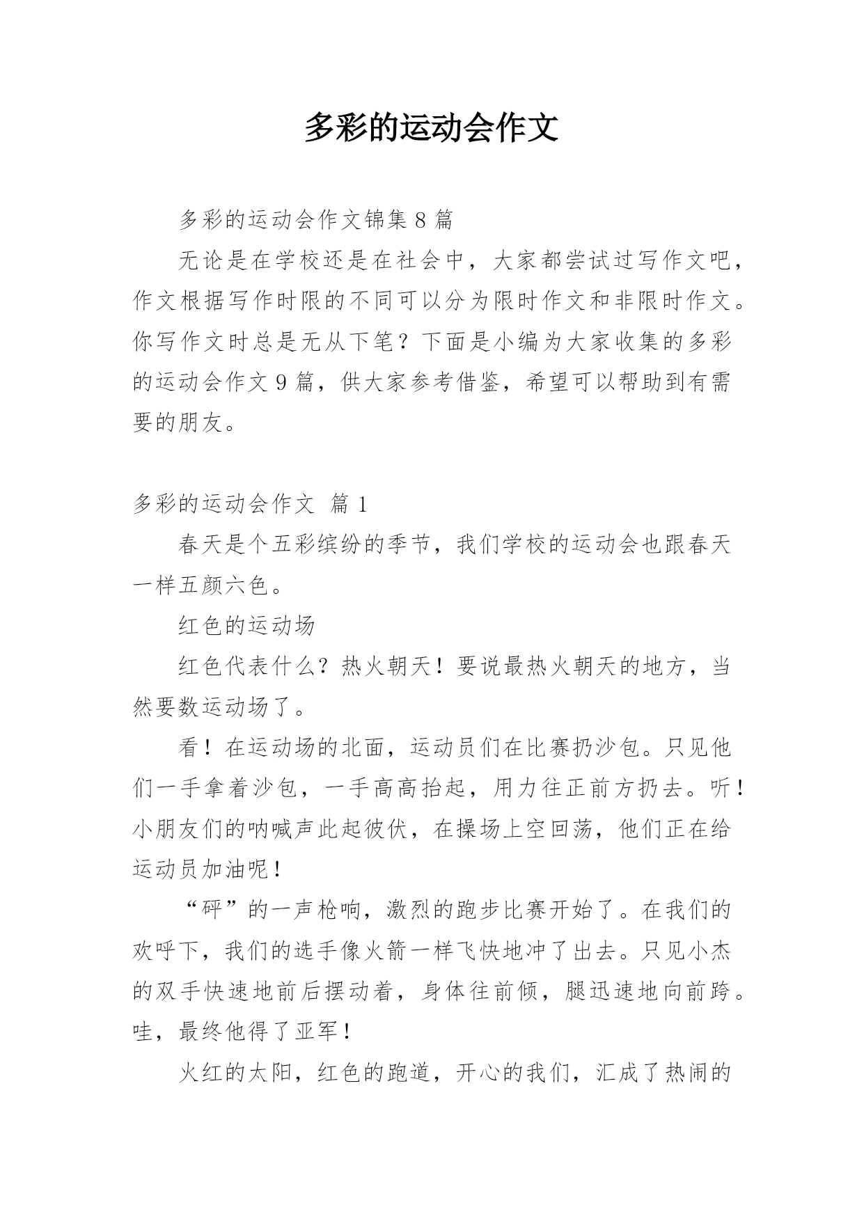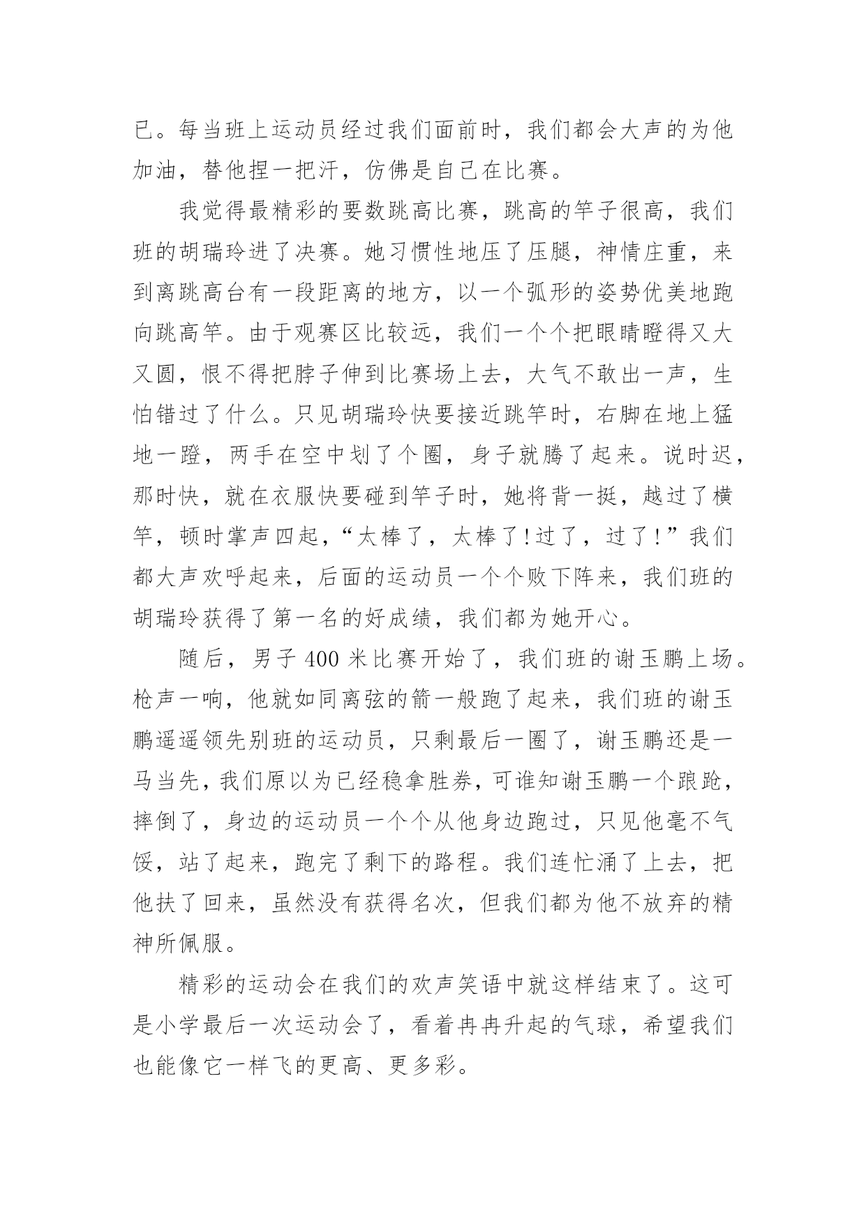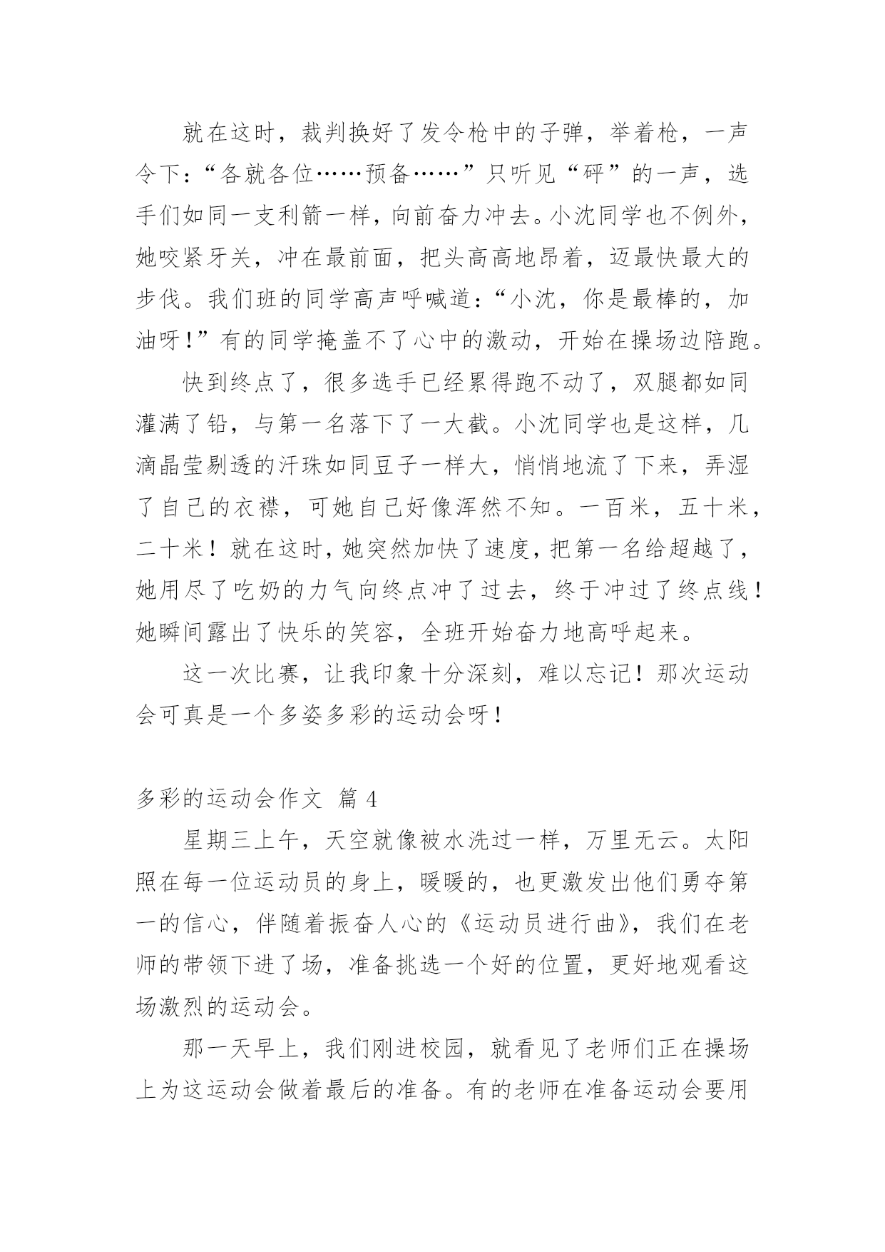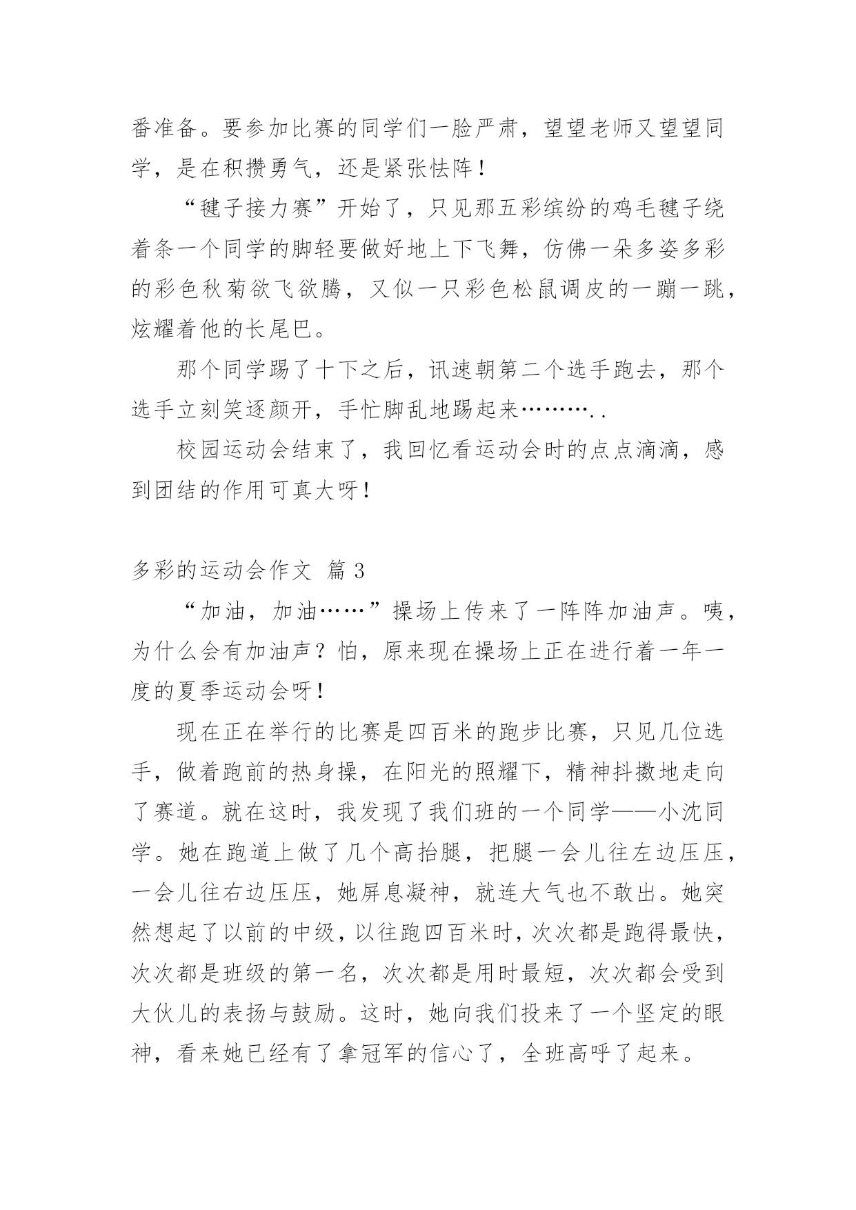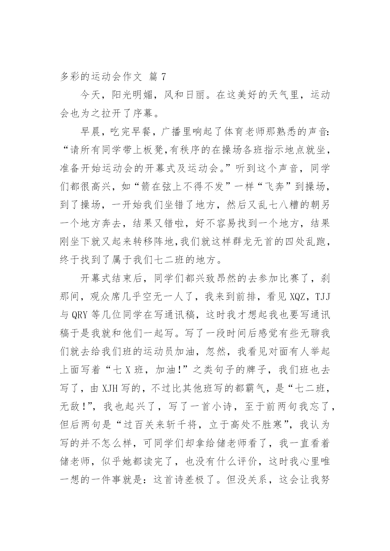 多彩的运动会作文多彩的运动会作文锦集8篇无论是在学校还是在社会中,大家都尝试过写作文吧,作文根据写作时限的不同可以分为限时作文和非限时作文。你写作文时总是无从下笔?下面是小编为大家收集的多彩的运动会作文9篇,供大家参考借鉴,希望可以帮助到有需要的朋友。多彩的运动会作文篇1春天是个五彩缤纷的季节,我们学校的运动会也跟春天一样五颜六色。红色的运动场红色代表什么?热火朝天!要说最热火朝天的地方,当然要数运动场了。看!在运动场的北面,运动员们在比赛扔沙包。只见他们一手拿着沙包,一手高高抬起,用力往正前方扔去。听!小朋友们的呐喊声此起彼伏,在操场上空回荡,他们正在给运动员加油呢!“砰”的一声枪响,激烈的跑步比赛开始了。在我们的欢呼下,我们的选手像火箭一样飞快地冲了出去。只见小杰的双手快速地前后摆动着,身体往前倾,腿迅速地向前跨。哇,最终他得了亚军!火红的太阳,红色的跑道,开心的我们,汇成了热闹的运动场!绿色的休息区跟红色的运动场相比,我们的休息区可是个天然的绿色游乐场。在树荫下,我们说说笑笑、打打闹闹,玩得不亦乐乎。趁着空闲的时间,我和同学玩起了拔河的游戏。但我们拔的可不是真正的绳子,而是矿泉水瓶。我们一边拔河一边唱着儿歌:“嗡嗡嗡,飞吧,小蜜蜂,我们决不伤害益虫,快快飞到大树林中……”没想到同学一松手,我一下跌坐在地上,大家哈哈大笑起来。树荫下,我们喝着水,吃着东西,玩着游戏,一点儿都不觉得热。放学了,大家捡起地上的垃圾,让我们的休息区更绿色环保。蓝色的心情爸爸说蓝色代表忧郁。我想:“蓝色的心情说的大概就是我吧。”我为什么会伤心呢?这还要从我参加扔沙包比赛说起。一开始,我充满信心,觉得扔沙包肯定很简单,拿个银牌不在话下。可是,比赛一结束,我的信心消失不见了。我才扔了7。5米,真是晴天霹雳啊!“为什么我要报名扔沙包啊?”我一次次重复着问自己。可是,现在后悔已经来不及了,还是回家好好练习。等下一次,我一定要得奖,我暗暗下定决心。这就是我们学校的多彩运动会,明年你也来参加吧!多彩的运动会作文篇2瓦蓝瓦蓝的天空中点缀着白云,太阳慢慢地从云彩中露出涨得通红的脸。风姑娘可没太阳害羞,自由自在的跑来跑去,就像一个不懂礼貌的小孩。迷人的阳光把我从梦中叫醒,我才想起今天学校要举行运动会,我迅速整理完东西后就向学校去。来到学校,同学们已经积极的练习,认真地排练。我一看,也加入了他们当中排练广播体操。比赛开始了,我们是最后一个班,所以会晚点上去,看看一个又一个班上去又下来。我不由得紧张起来,手心也出了汗,真想快点轮到我班上。马上到我们班了,我看着前面两班的情况。呵呵,真是好笑。站队时,有些同学就向没头苍蝇似的到处乱扭,做操时更是笑料百出。该跳,他要蹲,该站,他要跳,我一边凑“热闹”一边想:我们班会不会出现这种情况?带着忐忑不安,我们班级到了评委台前,摇头晃脑地做了起来。慢慢地,随着轻快的音乐,老师的鼓励…..我们越做越好,越做越轻松。评委向我们投来赞许的目光,我们做的更带劲了,该跳就跳,整齐的就像一个人似的。短短的几十分钟过去了,看,别班同学对我们刮目相看:看,看评委向我们点了点头:看,老师朝我们竖起了大拇指。评委对我们说了一句使我们大吃一惊的话:“你们是最棒的!”接下来是考验平衡力和“毽子接力赛”了。那些经过一番准备。要参加比赛的同学们一脸严肃,望望老师又望望同学,是在积攒勇气,还是紧张怯阵!“毽子接力赛”开始了,只见那五彩缤纷的鸡毛毽子绕着条一个同学的脚轻要做好地上下飞舞,仿佛一朵多姿多彩的彩色秋菊欲飞欲腾,又似一只彩色松鼠调皮的一蹦一跳,炫耀着他的长尾巴。那个同学踢了十下之后,讯速朝第二个选手跑去,那个选手立刻笑逐颜开,手忙脚乱地踢起来………..校园运动会结束了,我回忆看运动会时的点点滴滴,感到团结的作用可真大呀!多彩的运动会作文篇3“加油,加油……”操场上传来了一阵阵加油声。咦,为什么会有加油声?怕,原来现在操场上正在进行着一年一度的夏季运动会呀!现在正在举行的比赛是四百米的跑步比赛,只见几位选手,做着跑前的热身操,在阳光的照耀下,精神抖擞地走向了赛道。就在这时,我发现了我们班的一个同学——小沈同学。她在跑道上做了几个高抬腿,把腿一会儿往左边压压,一会儿往右边压压,她屏息凝神,就连大气也不敢出。她突然想起了以前的中级,以往跑四百米时,次次都是跑得最快,次次都是班级的第一名,次次都是用时最短,次次都会受到大伙儿的表扬与鼓励。这时,她向我们投来了一个坚定的眼神,看来她已经有了拿冠军的信心了,全班高呼了起来。就在这时,裁判换好了发令枪中的子弹,举着枪,一声令下:“各就各位……预备……”只听见“砰”的一声,选手们如同一支利箭一样,向前奋力冲去。小沈同学也不例外,她咬紧牙关,冲在最前面,把头高高地昂着,迈最快最大的步伐。我们班的同学高声呼喊道:“小沈,你