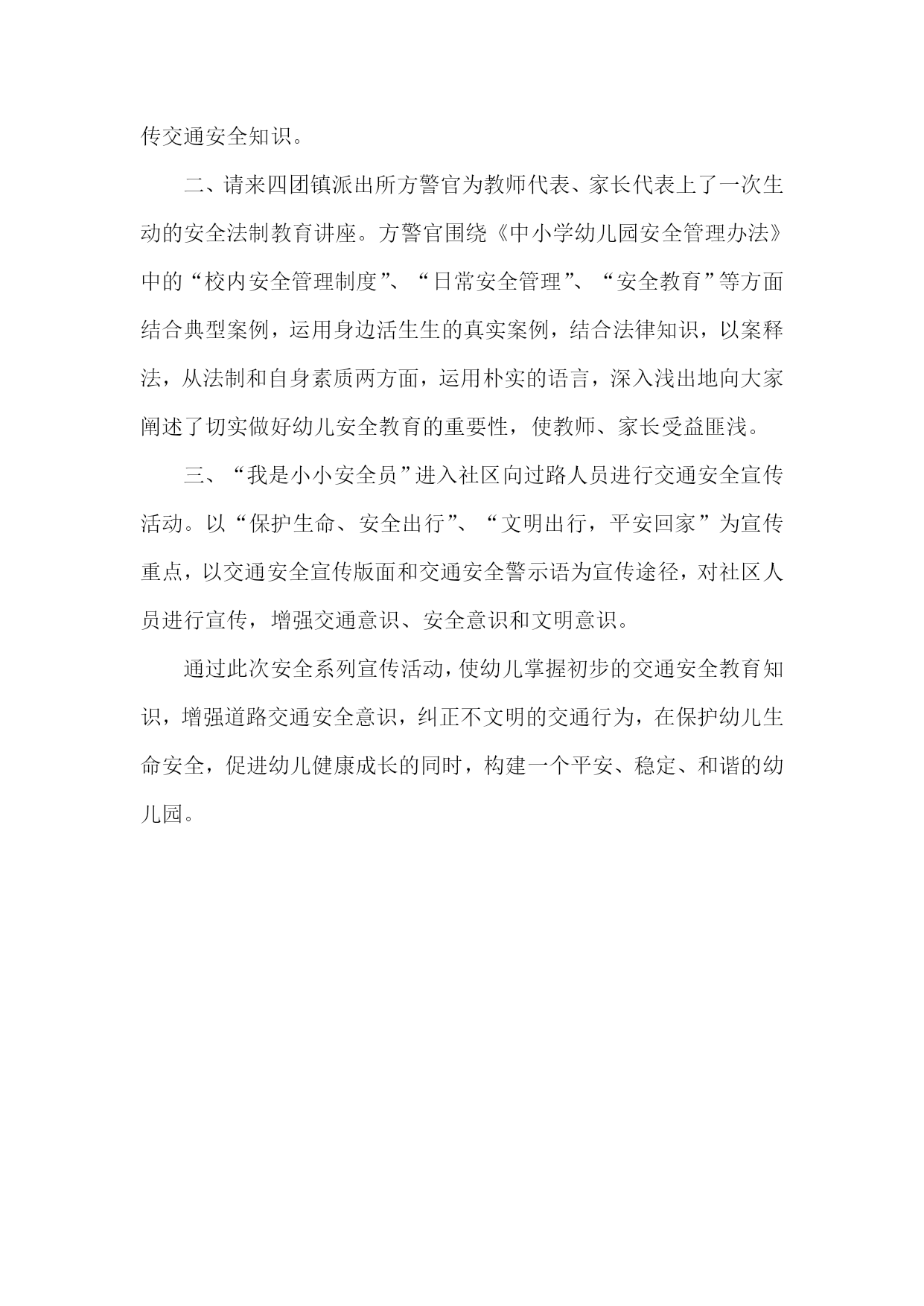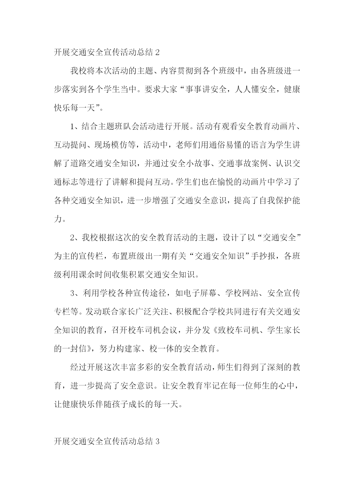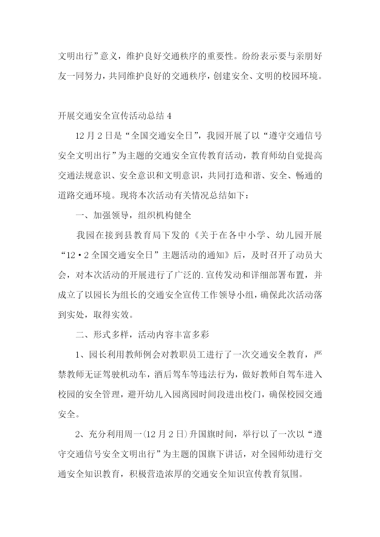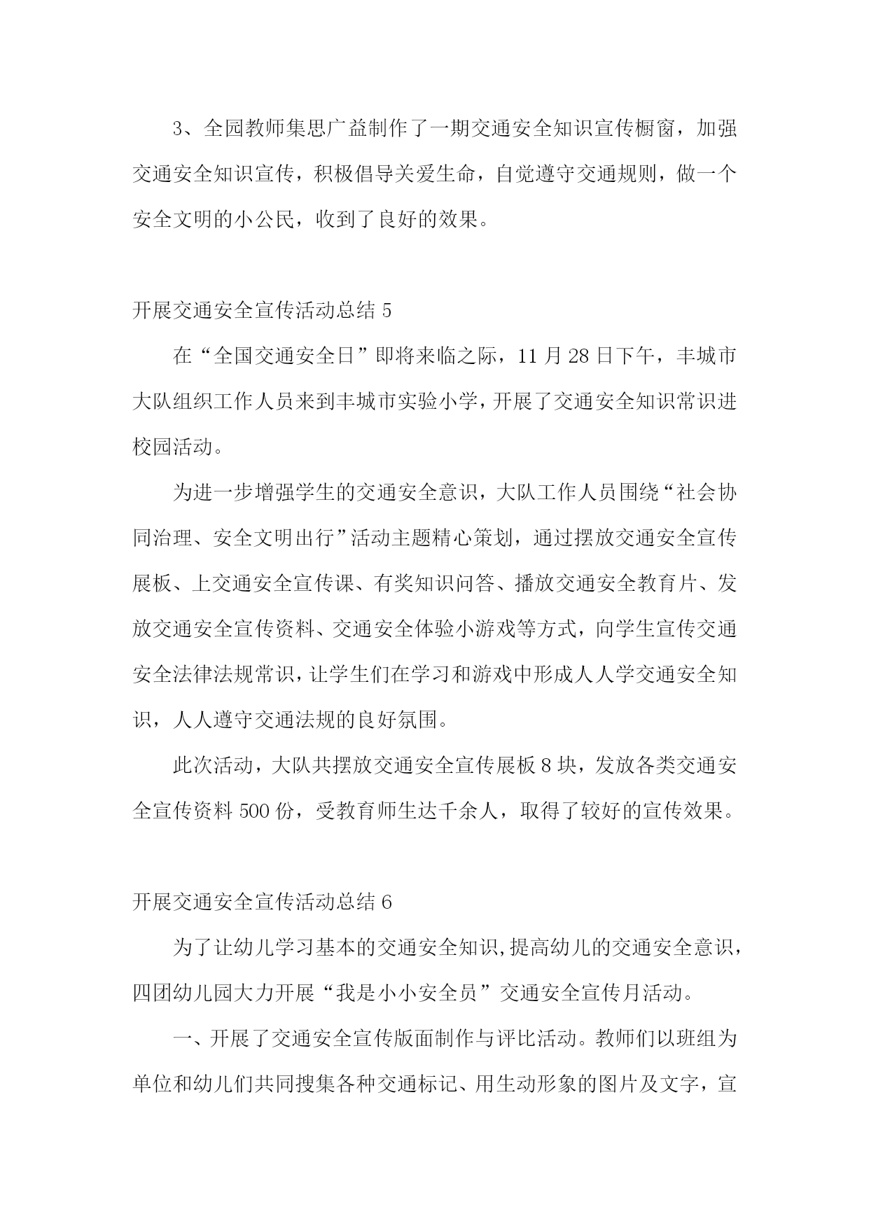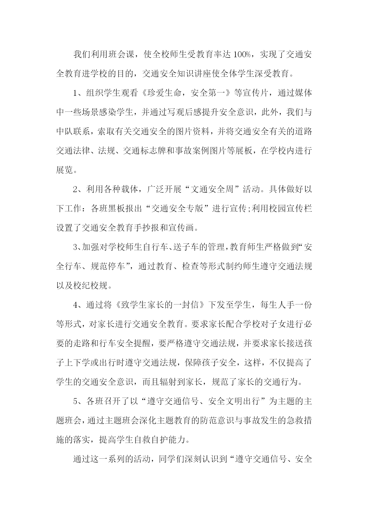 开展交通安全宣传活动总结开展交通安全宣传活动总结1为了增强学生的交通安全观念,提高学生的交通安全意识,培养学生良好文明的交通行为习惯,根据我校的实际情况,学校决定从交通安全常识方面对同学们进行较为系统的安全教育,让全体同学都树立起安全防范意识。小学特组织各班开展了交通安全教育主题班会活动。班会从学生行走安全、骑车安全、乘车安全等方面对学生进行交通安全教育。老师先组织学生共同观看了中小学生交通安全知识教育宣传片,以直观的手段,让学生懂得了过马路时一定要走人行横道线、要遵守交通信号灯、行人靠右走、千万不能在马路上玩耍……大家都看得非常认真,听得非常仔细。接下来让同学们上台讲述自己搜集到的关于安全事故的一些资料,通过这一件件血的教训,给大家再次敲醒了生命安全的警钟。最后是进行关于交通安全的抢答题比赛,在抢答比赛中,通过同学们的积极思考,强化了同学们的安全意识。主题班会课上,一个个活生生的例子、一桩桩的真实事例和大批图片的展示,使每个学生都感受到交通安全的重要性。这次班会课主题突出,思想教育深入,环节安排丰富且有针对性,学生积极参与、踊跃表现,加深了学生的安全意识,教育效果良好。学生不仅领悟到了道路交通安全教育的重要意义,也懂得了如何预防交通事故的发生,远离危险,健康成长。开展交通安全宣传活动总结2我校将本次活动的主题、内容贯彻到各个班级中,由各班级进一步落实到各个学生当中。要求大家“事事讲安全,人人懂安全,健康快乐每一天”。1、结合主题班队会活动进行开展。活动有观看安全教育动画片、互动提问、现场模仿等,活动中,老师们用通俗易懂的语言为学生讲解了道路交通安全知识,并通过安全小故事、交通事故案例、认识交通标志等进行了讲解和提问互动。学生们也在愉悦的动画片中学习了各种交通安全知识,进一步增强了交通安全意识,提高了自我保护能力。2、我校根据这次的安全教育活动的主题,设计了以“交通安全”为主的宣传栏,布置班级出一期有关“交通安全知识”手抄报,各班级利用课余时间收集积累交通安全知识。3、利用学校各种宣传途径,如电子屏幕、学校网站、安全宣传专栏等。发动联合家长广泛关注、积极配合学校共同进行有关交通安全知识的教育,召开校车司机会议,并分发《致校车司机、学生家长的一封信》,努力构建家、校一体的安全教育。经过开展这次丰富多彩的安全教育活动,师生们得到了深刻的教育,进一步提高了安全意识。让安全教育牢记在每一位师生的心中,让健康快乐伴随孩子成长的每一天。开展交通安全宣传活动总结3我们利用班会课,使全校师生受教育率达100%,实现了交通安全教育进学校的目的,交通安全知识讲座使全体学生深受教育。1、组织学生观看《珍爱生命,安全第一》等宣传片,通过媒体中一些场景感染学生,并通过写观后感提升安全意识,此外,我们与中队联系,索取有关交通安全的图片资料,并将交通安全有关的道路交通法律、法规、交通标志牌和事故案例图片等展板,在学校内进行展览。2、利用各种载体,广泛开展“文通安全周”活动。具体做好以下工作:各班黑板报出“交通安全专版”进行宣传;利用校园宣传栏设置了交通安全教育手抄报和宣传画。3、加强对学校师生自行车、送子车的管理,教育师生严格做到“安全行车、规范停车”,通过教育、检查等形式制约师生遵守交通法规以及校纪校规。4、通过将《致学生家长的一封信》下发至学生,每生人手一份等形式,对家长进行交通安全教育。要求家长配合学校对子女进行必要的走路和行车安全提醒,要严格遵守交通法规,并要求家长接送孩子上下学或出行时遵守交通法规,保障孩子安全,这样,不仅提高了学生的交通安全意识,而且辐射到家长,规范了家长的交通行为。5、各班召开了以“遵守交通信号、安全文明出行”为主题的主题班会,通过主题班会深化主题教育的防范意识与事故发生的急救措施的落实,提高学生自救自护能力。通过这一系列的活动,同学们深刻认识到“遵守交通信号、安全文明出行”意义,维护良好交通秩序的重要性。纷纷表示要与亲朋好友一同努力,共同维护良好的交通秩序,创建安全、文明的校园环境。开展交通安全宣传活动总结412月2日是“全国交通安全日”,我园开展了以“遵守交通信号安全文明出行”为主题的交通安全宣传教育活动,教育师幼自觉提高交通法规意识、安全意识和文明意识,共同打造和谐、安全、畅通的道路交通环境。现将本次活动有关情况总结如下:一、加强领导,组织机构健全我园在接到县教育局下发的《关于在各中小学、幼儿园开展“12·2全国交通安全日”主题活动的通知》后,及时召开了动员大会,对本次活动的开展进行了广泛的.宣传发动和详细部署布置,并成立了以园长为组长的交通安全宣传工作领导小组,确保此次活动落到实处,取得实效。二、形式多样,活动内容丰富多彩1、园长利用教师例会对教职员工进行了一次交通