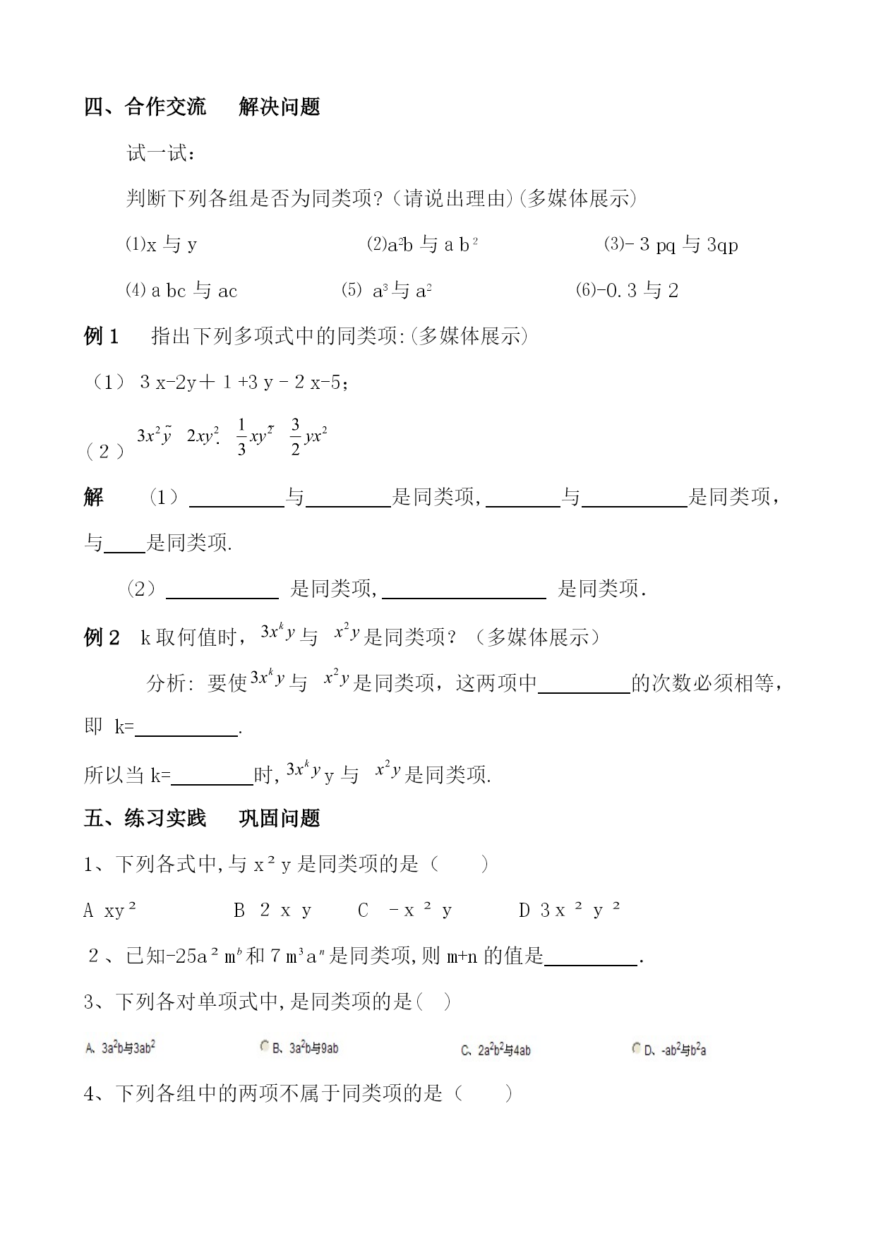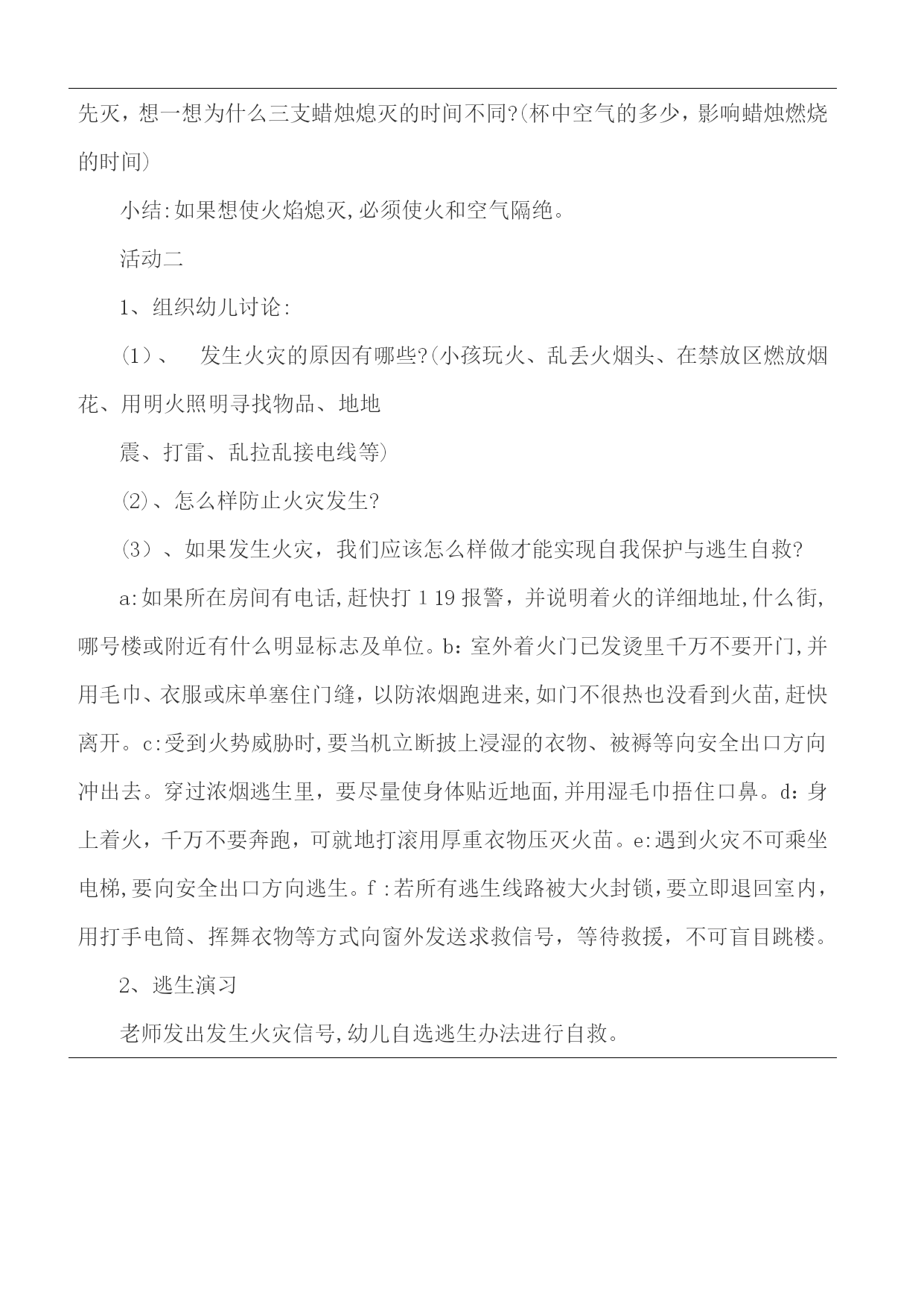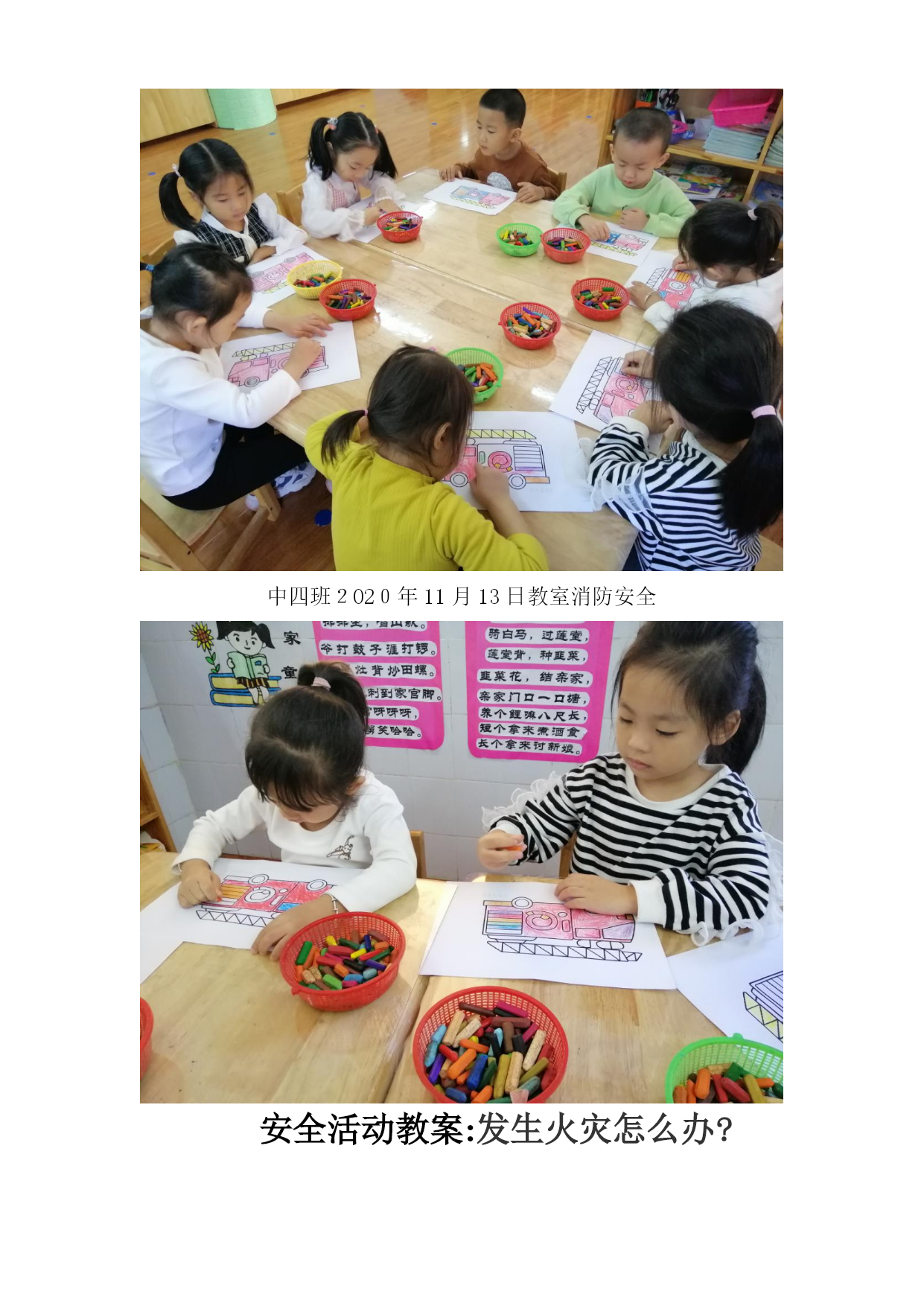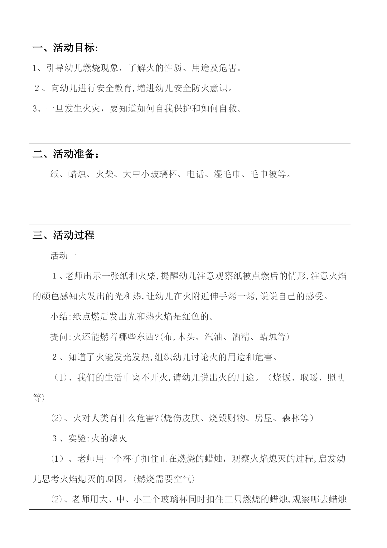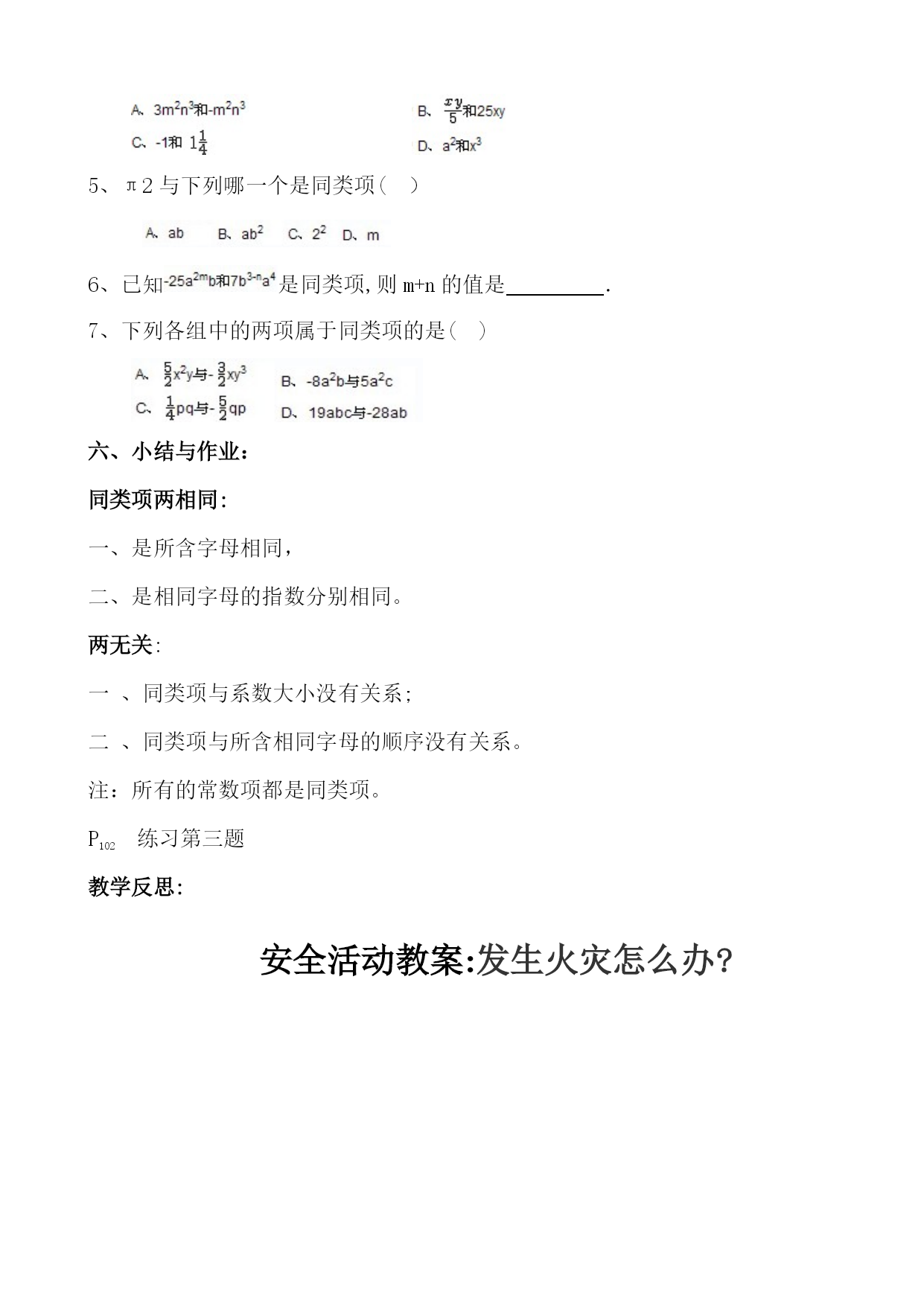 《同类项》教学设计导学目标知识目标1.掌握同类项的概念并理解。2.会判断同类项,并掌握其特点。能力目标熟练掌握同类项的概念并会做有关习题重点、难点重点:同类项的特点难点:同类项中字母指数的求解教学过程一、组织教学,出示目标(多媒体出示)二、导入新课,展示问题问:同学们知道:“物以类聚”这个成语的意思吗?(物以类聚指同类的东西聚在一起。)(多媒体展示)请同学们看以下图片,图片上有哪些物品可以归为一类?生活中,我们常常把具有相同特征的事物归为一类,在多项式中,也可以把具有相同特征的项归为一类。如:多项式有项,它们分别是。你认为上述多项式中哪些项可以归为一类?三、自主探究基础知,提出问题问:它们有什么相同的特征呢?比较、概括:(1)与可以归为一类,与可以归为一类,还有-3与5也可以归为一类.(2)与所含的(都是x、y,),并且x的指数都是,y的指数都是;同样地,与所含的字母也相同,并且x的指数都是1,y的指数都是2.3、像这样,所含,并且的项叫做同类项.4、所有的常数项都是同类项.比如,前面提到的多项式中,-3与5也是同类项.四、合作交流解决问题试一试:判断下列各组是否为同类项?(请说出理由)(多媒体展示)⑴x与y⑵a2b与ab2⑶-3pq与3qp⑷abc与ac⑸a3与a2⑹-0.3与2例1指出下列多项式中的同类项:(多媒体展示)(1)3x-2y+1+3y-2x-5;(2)解(1)与是同类项,与是同类项,与是同类项.(2)是同类项,是同类项.例2k取何值时,与是同类项?(多媒体展示)分析:要使与是同类项,这两项中的次数必须相等,即k=.所以当k=时,y与是同类项.五、练习实践巩固问题1、下列各式中,与xy是同类项的是()AxyB2xyC-xyD3xy2、已知-25am和7ma是同类项,则m+n的值是.3、下列各对单项式中,是同类项的是()4、下列各组中的两项不属于同类项的是()5、π2与下列哪一个是同类项()6、已知是同类项,则m+n的值是.7、下列各组中的两项属于同类项的是()六、小结与作业:同类项两相同:一、是所含字母相同,二、是相同字母的指数分别相同。两无关:一、同类项与系数大小没有关系;二、同类项与所含相同字母的顺序没有关系。注:所有的常数项都是同类项。P102练习第三题教学反思:安全活动教案:发生火灾怎么办?活动目标:1、引导幼儿燃烧现象,了解火的性质、用途及危害。2、向幼儿进行安全教育,增进幼儿安全防火意识。3、一旦发生火灾,要知道如何自我保护和如何自救。二、活动准备:纸、蜡烛、火柴、大中小玻璃杯、电话、湿毛巾、毛巾被等。三、活动过程活动一1、老师出示一张纸和火柴,提醒幼儿注意观察纸被点燃后的情形,注意火焰的颜色感知火发出的光和热,让幼儿在火附近伸手烤一烤,说说自己的感受。小结:纸点燃后发出光和热火焰是红色的。提问:火还能燃着哪些东西?(布,木头、汽油、酒精、蜡烛等)2、知道了火能发光发热,组织幼儿讨论火的用途和危害。(1)、我们的生活中离不开火,请幼儿说出火的用途。(烧饭、取暖、照明等)(2)、火对人类有什么危害?(烧伤皮肤、烧毁财物、房屋、森林等)3、实验:火的熄灭(1)、老师用一个杯子扣住正在燃烧的蜡烛,观察火焰熄灭的过程,启发幼儿思考火焰熄灭的原因。(燃烧需要空气)(2)、老师用大、中、小三个玻璃杯同时扣住三只燃烧的蜡烛,观察哪去蜡烛先灭,想一想为什么三支蜡烛熄灭的时间不同?(杯中空气的多少,影响蜡烛燃烧的时间)小结:如果想使火焰熄灭,必须使火和空气隔绝。活动二1、组织幼儿讨论:(1)、发生火灾的原因有哪些?(小孩玩火、乱丢火烟头、在禁放区燃放烟花、用明火照明寻找物品、地地震、打雷、乱拉乱接电线等)(2)、怎么样防止火灾发生?(3)、如果发生火灾,我们应该怎么样做才能实现自我保护与逃生自救?a:如果所在房间有电话,赶快打119报警,并说明着火的详细地址,什么街,哪号楼或附近有什么明显标志及单位。b:室外着火门已发烫里千万不要开门,并用毛巾、衣服或床单塞住门缝,以防浓烟跑进来,如门不很热也没看到火苗,赶快离开。c:受到火势威胁时,要当机立断披上浸湿的衣物、被褥等向安全出口方向冲出去。穿过浓烟逃生里,要尽量使身体贴近地面,并用湿毛巾捂住口鼻。d:身上着火,千万不要奔跑,可就地打滚用厚重衣物压灭火苗。e:遇到火灾不可乘坐电梯,要向安全出口方向逃生。f:若所有逃生线路被大火封锁,要立即退回室内,用打手电筒、挥舞衣物等方式向窗外发送求救信号,等待救援,不可盲目跳楼。2、逃生演习老师发出发生火灾信号,幼儿自选逃生办法进行自救。