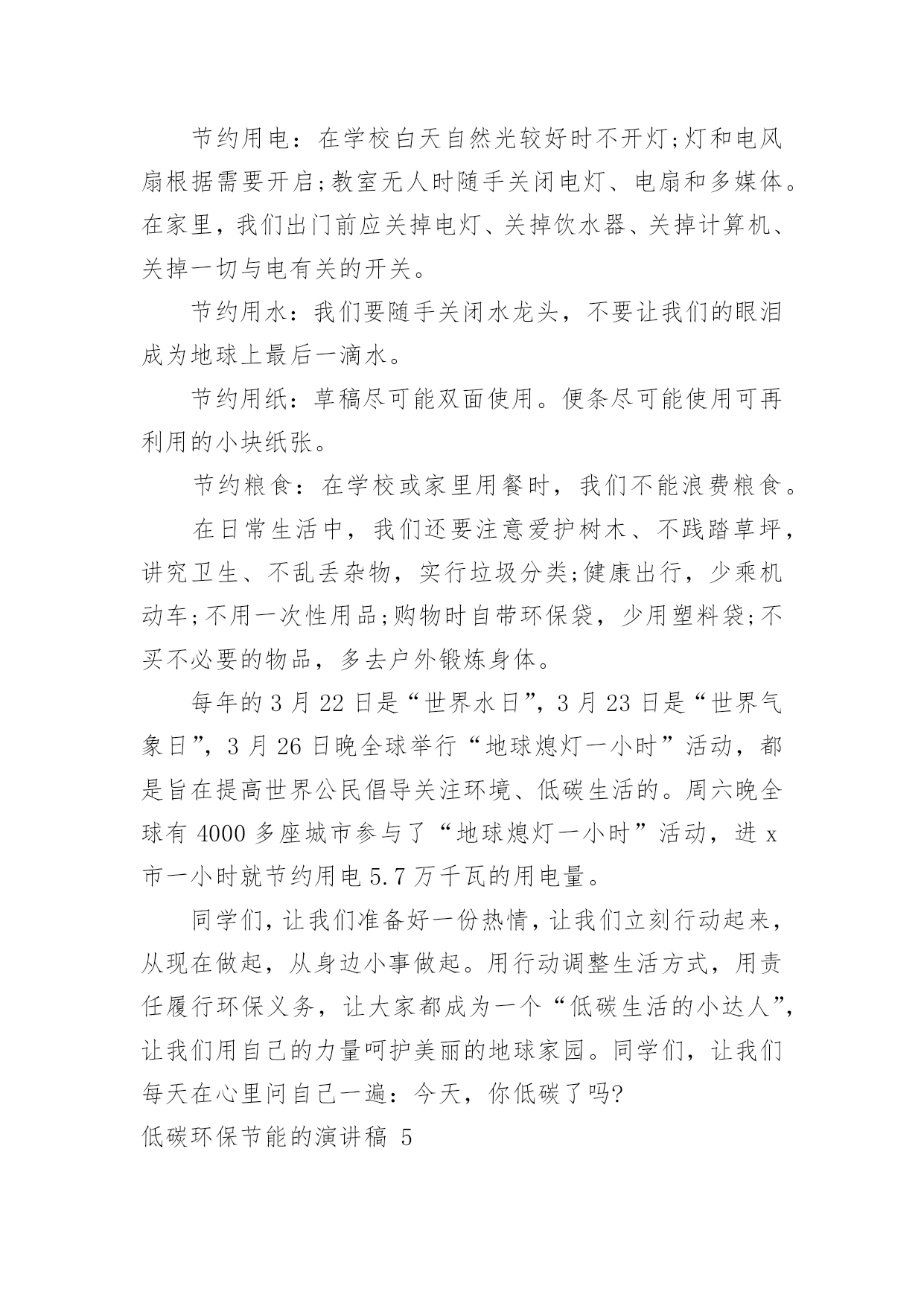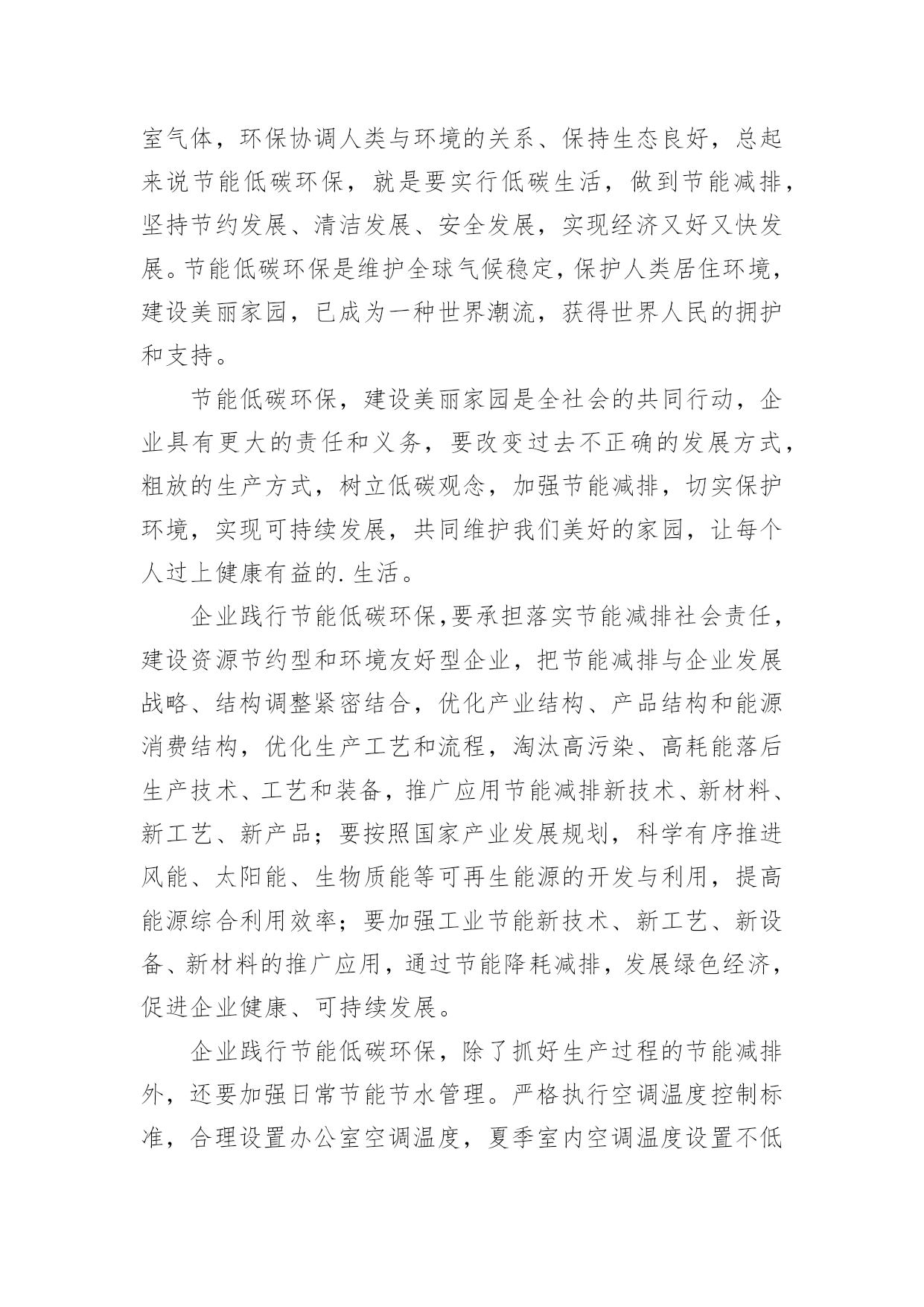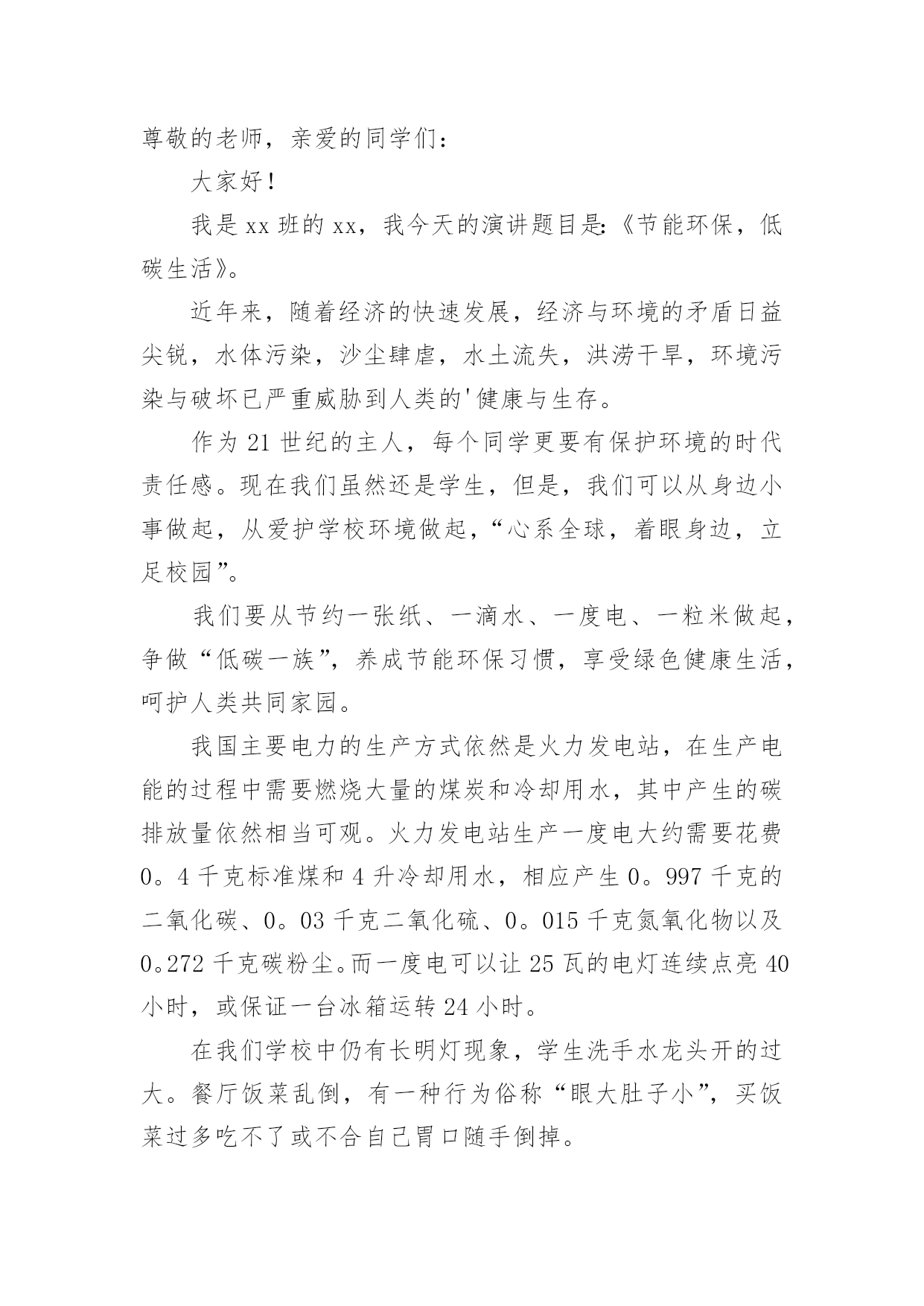低碳环保节能的演讲稿低碳环保节能的演讲稿演讲稿的内容要根据具体情境、具体场合来确定,要求情感真实,尊重观众。现如今,很多地方都会使用到演讲稿,你知道演讲稿怎样才能写的好吗?下面是小编为大家整理的低碳环保节能的演讲稿,仅供参考,大家一起来看看吧。低碳环保节能的演讲稿1尊敬的各位xx领导,同事们:大家早上好!这天我演讲的题目是《节约事小意识为先》。不知从何时起,“中国地大物博,物产取之不尽,用之不竭”的语句不再出此刻初中的地理、历史课本上;不知从何时起“节约光荣,浪费可耻”又成为青年一代的口头禅。自开局之年起国家已将节能降耗工作放在了一个前所未有的高度,在全国经济工作会议上提出的八大任务中,节能降耗甚至被排在了第四位,国家发改委也三番五次申明单位gdp能耗指标是具有法律效力的约束性指标。这一系列的变化证明,在当今这个经济飞速发展的大社会,节能降耗已成为全社会上下强烈的共同意愿。肯尼迪总统的一句话说得好:“不好问国家能为咱们做些什么,先要问自我能为国家做些什么”。这句话很好的阐述了公民对国家,对社会的职责。对于节能咱们通常有的一种行为是告诉别人就应这样做或就应那样做,例如“打印双面用纸;淘米水浇花;随手关灯”等等措施耳熟能详,伏案沉思时也能举出友邦节能的实例,感佩日本的家庭主妇在丢弃空牛奶盒之前先要冲洗干净;知晓德国人乐于理解比能源发电价格更贵的风力发电等等。但是对于自我,时常沉浸在“泱泱大国”的华彩之下,认为花得是我自我的钱,与人何干?节约是老年人的事,年青人谈节约是抠门,是小气,会为人所不齿。因而,水龙头在滴水,视若无睹;为了图方便使用一次性筷子,购物时大包小包的塑料袋;白纸用完了一捏随手就扔,废电池不管他什么重金属随手扔了完事!正是你我许许多多这样不经意的行为酿下了祸端:水危机步步紧逼;沙尘暴频发;白色垃圾肆意横行;水土污染严重……孔子云:“勿以善小而不为,勿以恶小而为之”,虽然这随手之间的行为并非有意为之,却足以引起咱们的深思。思想是行动的先导,只有从思想上真正树立起节约的意识,才能使节约能成为咱们日常生活中主动、自觉的行为。如果将这社会喻为一座山,xxx只是垒山的一抔土,而xx的每一位员工可视为这抔土中的一粒沙,每粒沙的作为决定了这抔土的成就。据不完全统计,xxx自1998年成立以来,每年仅在水、电、办公用品、清洁耗材等方面的支出就高达xxx余万元,平均到xx每位干部职工身上就是xxx元,而据估计,这些支出能够真正用于产生效益的只占到xxx左右,也就是说在这几项支出中有近xxx可能是被无端地浪费掉了。想想咱们身边的事,想想咱们身边的人,也以前出现过电脑昼夜无眠的现象,也有过人走灯不灭的状况,也有文件一出一大摞的“辉煌”……也许这些事就发生在昨日,也许这些事就曾发生在自我身上……正是这样的'不经意,使你我的辛苦付出所创造的收入悄悄地流走,变成了一些苍白的账面支出数字,你难道不心疼吗?近几年来,大家欣喜地看到,咱们xx经营收入连年增长,连续三年实现了两位数的高位增长目标,那里有xx领导的支持,是xx班子精细化管理的成果,有xx全体员工的辛劳,也是咱们长期提倡节能产生了实效。向节能要效益正在逐步深入xx人心:君可见—服务部的姑娘们在开水房张贴了供水时刻;技术部在各用电终端加装了电表;管理人员下班后甚至拨掉了电源插头;双面打印排版越来越漂亮了;采购员越来越会算计了……这些事说起来不是什么大事,也无法精确计算每个人的这一举动能为xx省下一分还是一毛,但是有人这样做了,这是一份对自我的职责,是一份对xx的职责,更是一份对社会的职责。咱们赞赏这种行为,钦佩这种意识,更应向这样的干部职工领悟。节约事小,意识为先,如果咱们xx人人都能树立这种意识,长期坚持这种不经意的行为,xx必能取得更大的业绩。套用濮存晰在一段公益广告中的一句话作为我这天演讲的结束语:咱们每个人的一小步,将是xx向前迈进的一大步!多谢大家!低碳环保节能的演讲稿2节能是尽可能地减少能源消耗量,低碳是排放较低的温室气体,环保协调人类与环境的关系、保持生态良好,总起来说节能低碳环保,就是要实行低碳生活,做到节能减排,坚持节约发展、清洁发展、安全发展,实现经济又好又快发展。节能低碳环保是维护全球气候稳定,保护人类居住环境,建设美丽家园,已成为一种世界潮流,获得世界人民的拥护和支持。节能低碳环保,建设美丽家园是全社会的共同行动,企业具有更大的责任和义务,要改变过去不正确的发展方式,粗放的生产方式,树立低碳观念,加强节能减排,切实保护环境,实现可持续发展,共同维护我们美好的家园,让每个人过上健康有益的.生活。企业践行节能低碳环保,要承担落实节能减排社会责任,建设资源节约型和环境友好型企业,把节能减排与企业发展战略、结构调整紧密结合,优化产业结构、产品结构和能源消费结构,优化生产工