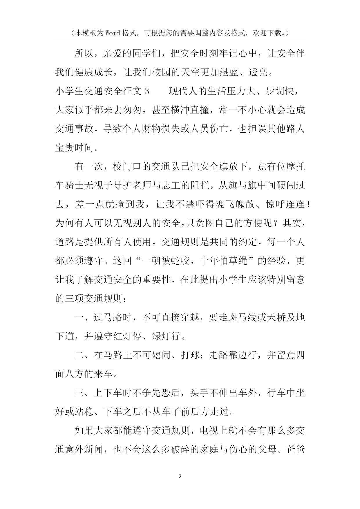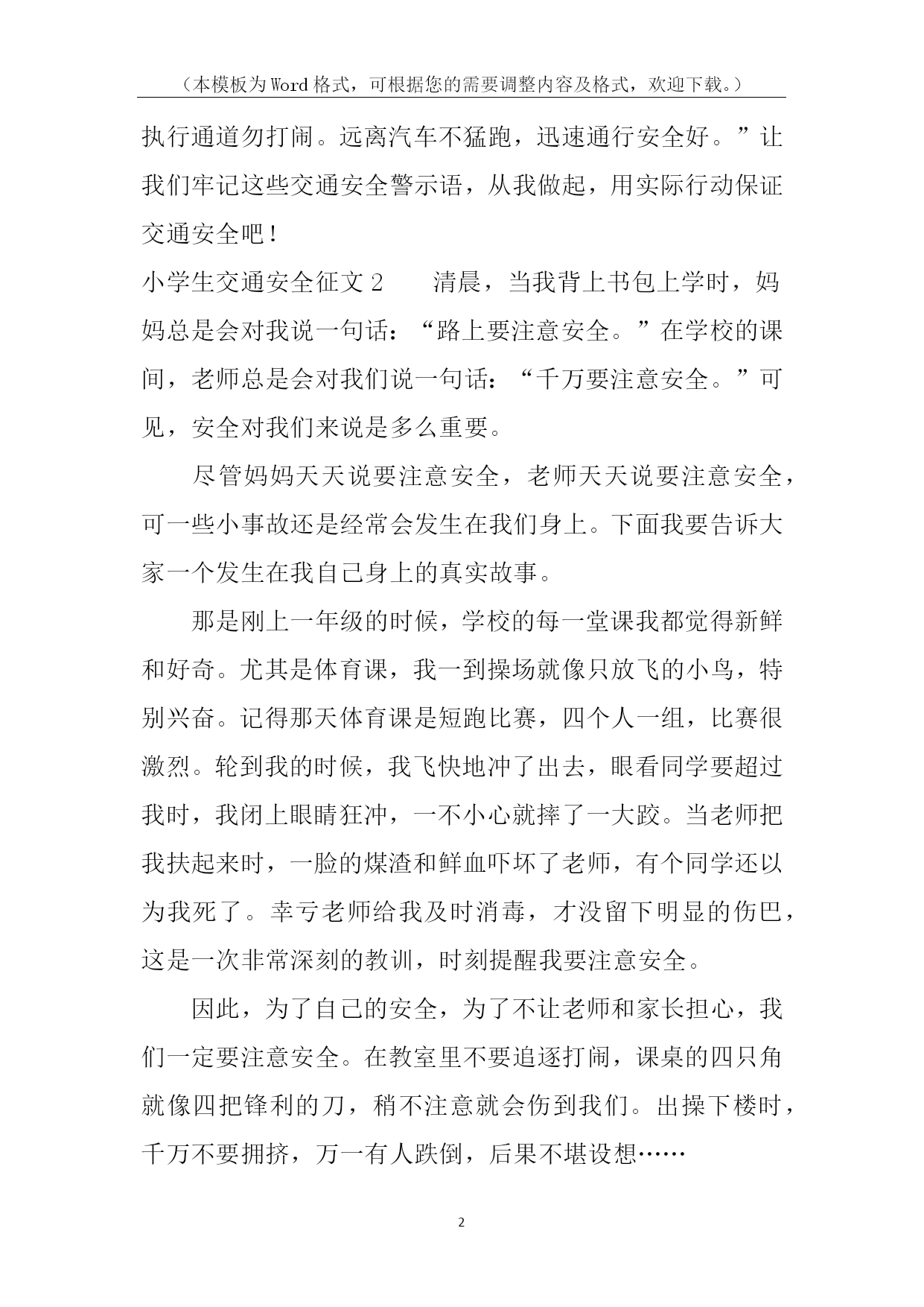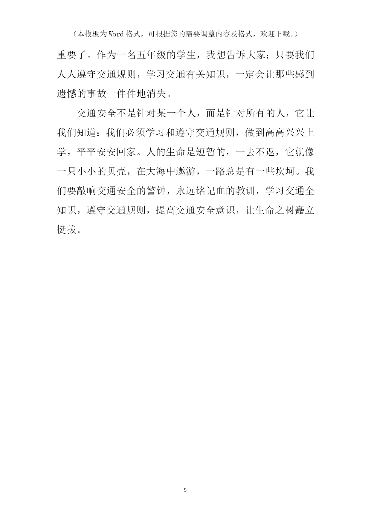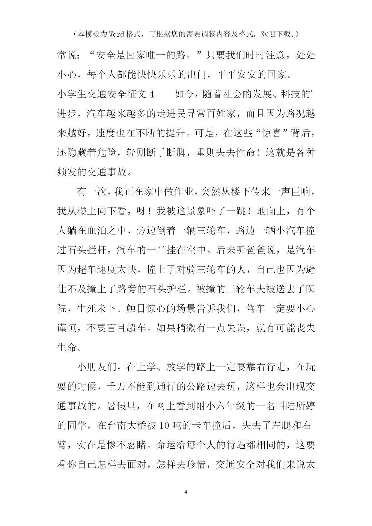 (本模板为Word格式,可根据您的需要调整内容及格式,欢迎下载。)PAGE\*MERGEFORMAT5小学生交通安全征文小学生交通安全征文1什么是交通安全呢?马路就像一幅画,上面画了一条条整齐的指示线,十字路口安插了红绿灯,警察叔叔站在马路中间,挥舞着胳膊指挥着交通,他们英姿飒爽,动作整齐规范,就像不知疲倦的机器人。路上,还有许多警察到处巡逻,如果出现事故或拥堵,他们就可以尽快处理。记得刚上一年级的时候,老师就教我们背“红灯停,绿灯行,黄灯停下等一等”这首歌。然而,红绿灯前,我们大家是否都遵守呢?上学的路上,我经常看到行人不遵守交通规则,红灯亮了,他们“勇往直前”,在车辆中穿梭前行;我还看见,有的人从马路中间的护栏上穿过;我也看见,有的司机经过路口,遇到行人不减速,惊得行人一身汗,这些做法是多么的危险啊!坐爸爸的车,我经常问爸爸一些交通安全的问题,也逐渐懂得了一些安全常识。“爸爸,你超速了!”,“爸爸,慢点开,别撞了那只狗!”,“爸爸,你怎么闯黄灯呀?”我经常这样提醒爸爸,爸爸身上好像装了一只电子眼。“过马路,左右瞧,大家要走人行道。公路若无斑马线,执行通道勿打闹。远离汽车不猛跑,迅速通行安全好。”让我们牢记这些交通安全警示语,从我做起,用实际行动保证交通安全吧!小学生交通安全征文2清晨,当我背上书包上学时,妈妈总是会对我说一句话:“路上要注意安全。”在学校的课间,老师总是会对我们说一句话:“千万要注意安全。”可见,安全对我们来说是多么重要。尽管妈妈天天说要注意安全,老师天天说要注意安全,可一些小事故还是经常会发生在我们身上。下面我要告诉大家一个发生在我自己身上的真实故事。那是刚上一年级的时候,学校的每一堂课我都觉得新鲜和好奇。尤其是体育课,我一到操场就像只放飞的小鸟,特别兴奋。记得那天体育课是短跑比赛,四个人一组,比赛很激烈。轮到我的时候,我飞快地冲了出去,眼看同学要超过我时,我闭上眼睛狂冲,一不小心就摔了一大跤。当老师把我扶起来时,一脸的煤渣和鲜血吓坏了老师,有个同学还以为我死了。幸亏老师给我及时消毒,才没留下明显的伤巴,这是一次非常深刻的教训,时刻提醒我要注意安全。因此,为了自己的安全,为了不让老师和家长担心,我们一定要注意安全。在教室里不要追逐打闹,课桌的四只角就像四把锋利的刀,稍不注意就会伤到我们。出操下楼时,千万不要拥挤,万一有人跌倒,后果不堪设想……所以,亲爱的同学们,把安全时刻牢记心中,让安全伴我们健康成长,让我们校园的天空更加湛蓝、透亮。小学生交通安全征文3现代人的生活压力大、步调快,大家似乎都来去匆匆,甚至横冲直撞,常一不小心就会造成交通事故,导致个人财物损失或人员伤亡,也担误其他路人宝贵时间。有一次,校门口的交通队已把安全旗放下,竟有位摩托车骑士无视于导护老师与志工的阻拦,从旗与旗中间硬闯过去,差一点就撞到我,让我不禁吓得魂飞魄散、惊呼连连!为何有人可以无视别人的安全,只贪图自己的方便呢?其实,道路是提供所有人使用,交通规则是共同的约定,每一个人都必须遵守。这回“一朝被蛇咬,十年怕草绳”的经验,更让我了解交通安全的重要性,在此提出小学生应该特别留意的三项交通规则:一、过马路时,不可直接穿越,要走斑马线或天桥及地下道,并遵守红灯停、绿灯行。二、在马路上不可嬉闹、打球;走路靠边行,并留意四面八方的来车。三、上下车时不争先恐后,头手不伸出车外,行车中坐好或站稳、下车之后不从车子前后方走过。如果大家都能遵守交通规则,电视上就不会有那么多交通意外新闻,也不会这么多破碎的家庭与伤心的父母。爸爸常说:“安全是回家唯一的路。”只要我们时时注意,处处小心,每个人都能快快乐乐的出门,平平安安的回家。小学生交通安全征文4如今,随着社会的发展、科技的'进步,汽车越来越多的走进民寻常百姓家,而且因为路况越来越好,速度也在不断的提升。可是,在这些“惊喜”背后,还隐藏着危险,轻则断手断脚,重则失去性命!这就是各种频发的交通事故。有一次,我正在家中做作业,突然从楼下传来一声巨响,我从楼上向下看,呀!我被这景象吓了一跳!地面上,有个人躺在血泊之中,旁边倒着一辆三轮车,路边一辆小汽车撞过石头拦杆,汽车的一半挂在空中。后来听爸爸说,是汽车因为超车速度太快,撞上了对骑三轮车的人,自己也因为避让不及撞上了路旁的石头护栏。被撞的三轮车夫被送去了医院,生死未卜。触目惊心的场景告诉我们,驾车一定要小心谨慎,不要盲目超车。如果稍微有一点失误,就有可能丧失生命。小朋友们,在上学、放学的路上一定要靠右行走,在玩耍的时候,千万不能到通行的公路边去玩,这样也会出现交通事故的。暑假里,在网上看到附小六年级的一名叫陆所婷的同学,在台南大桥被10吨的卡车撞后,失去了左腿和右臂,实在是惨不忍睹。命运给每个人的待遇都相同的,这要看你自己怎样去面对,怎样去