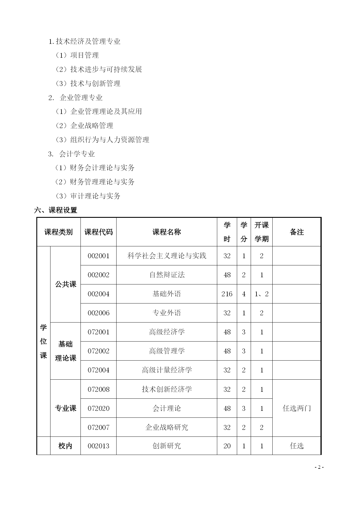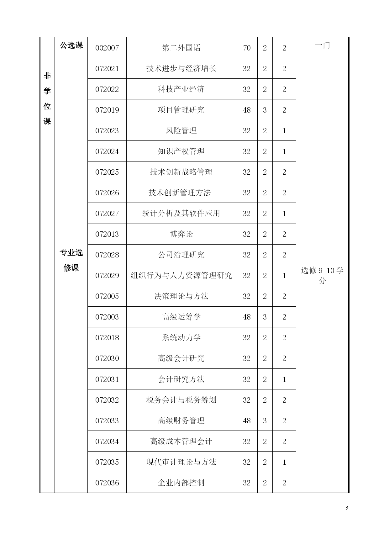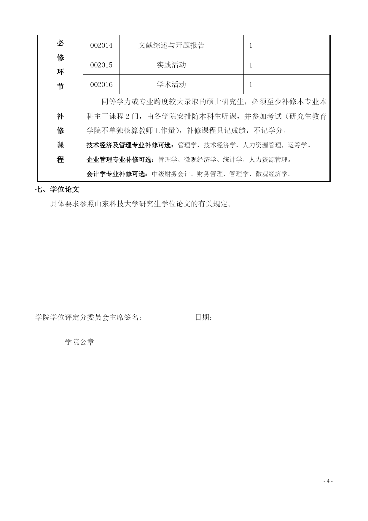 PAGE\*MERGEFORMAT-4-PAGE\*MERGEFORMAT-1-工商管理一级学科硕士研究生培养方案学科代码:1202学科门类:管理学(12)学科级别:一级一、学科简介山东科技大学工商管理一级学科包括技术经济及管理、会计学和企业管理三个硕士学位授予权专业。技术经济及管理2003年获硕士学位授予权,2005年获山东省教育厅人文社会科学重点建设学科,本专业研究范围涉及技术经济学、项目管理和技术与创新管理等;会计学和企业管理专业2006年获得硕士学位授予权,并开始招收会计学和企业管理专业硕士研究生。会计学专业主要涉及到财务会计理论与实务、财务管理理论与实务和审计理论与实务等研究领域;企业管理专业主要涉及到企业管理理论及其应用、企业战略管理和组织行为与人力资源管理等研究领域。在发展过程中,本学科各专业已形成以教授及博士为带头人的一支年龄结构合理、知识结构完备、学术水平高的学术队伍,导师中90%以上具有博士学位,科研成果丰硕。教学和科研总体水平上均居山东省前列,拥有山东省人文社科建设基地和山东省技术经济及管理重点实验室,企业经营决策模拟实验室、沙盘模拟实验室和手工与电算化会计实验室等,为本学科的硕士研究生培养奠定了坚实基础。二、适用学科1.技术经济及管理2.企业管理3.会计学三、培养目标本学科培养具备扎实的理论基础和系统的专业知识,了解本学科国内外发展动态和趋势,掌握本学科相关专业的理论与方法,熟练掌握一门外语,能灵活运用本学科的理论知识和方法,分析、解决相关专业的管理实际问题,具有较强的开拓精神和创新意识,能适应社会发展需要的工商管理高级专门人才。研究生毕业后能在各种类型的企事业单位、政府部门从事本学科相关专业的企业管理、技术管理、人力资源管理以及会计、财务、审计等管理实务工作,也可在高等院校、科研机构等从事教学与科学研究工作。四、学制及学分本学科硕士研究生培养年限一般为3年,其中课程学习时间为1年。硕士生课程学习实行学分制,在学期间应修33~35学分,其中必修环节3学分。五、研究方向:1.技术经济及管理专业(1)项目管理(2)技术进步与可持续发展(3)技术与创新管理2.企业管理专业(1)企业管理理论及其应用(2)企业战略管理(3)组织行为与人力资源管理3.会计学专业(1)财务会计理论与实务(2)财务管理理论与实务(3)审计理论与实务六、课程设置课程类别课程代码课程名称学时学分开课学期备注学位课公共课002001科学社会主义理论与实践3212002002自然辩证法4821002004基础外语21641、2002006专业外语3212基础理论课072001高级经济学4831072002高级管理学4831072004高级计量经济学3221专业课072008技术创新经济学3221任选两门072020会计理论4831072007企业战略研究3222非学位课校内公选课002013创新研究2011任选一门002007第二外国语7022专业选修课072021技术进步与经济增长3222选修9-10学分072022科技产业经济3222072019项目管理研究4832072023风险管理3221072024知识产权管理3221072025技术创新战略管理3222072026技术创新管理方法3222072027统计分析及其软件应用3221072013博弈论3222072028公司治理研究3222072029组织行为与人力资源管理研究3221072005决策理论与方法3222072003高级运筹学4832072018系统动力学3222072030高级会计研究3222072031会计研究方法3221072032税务会计与税务筹划3222072033高级财务管理4832072034高级成本管理会计3222072035现代审计理论与方法3221072036企业内部控制3222必修环节002014文献综述与开题报告1002015实践活动1002016学术活动1补修课程同等学力或专业跨度较大录取的硕士研究生,必须至少补修本专业本科主干课程2门,由各学院安排随本科生听课,并参加考试(研究生教育学院不单独核算教师工作量),补修课程只记成绩,不记学分。技术经济及管理专业补修可选:管理学、技术经济学、人力资源管理,运筹学。企业管理专业补修可选:管理学、微观经济学、统计学、人力资源管理。会计学专业补修可选:中级财务会计、财务管理、管理学、微观经济学。七、学位论文具体要求参照山东科技大学研究生学位论文的有关规定。学院学位评定分委员会主席签名:日期:学院公章