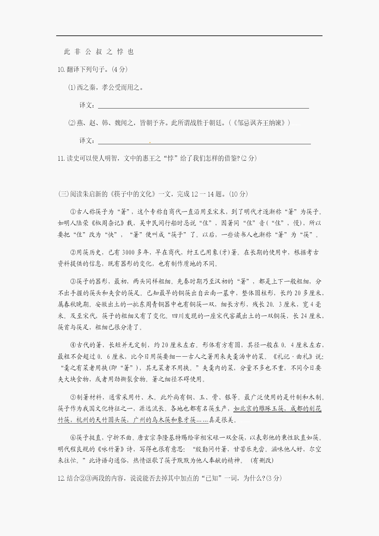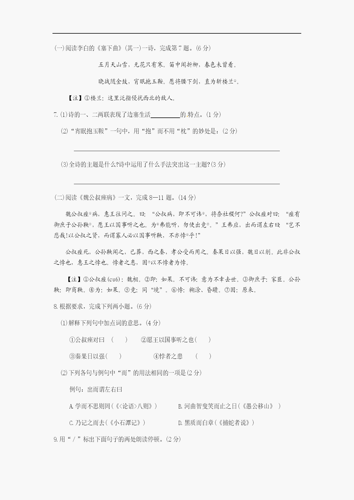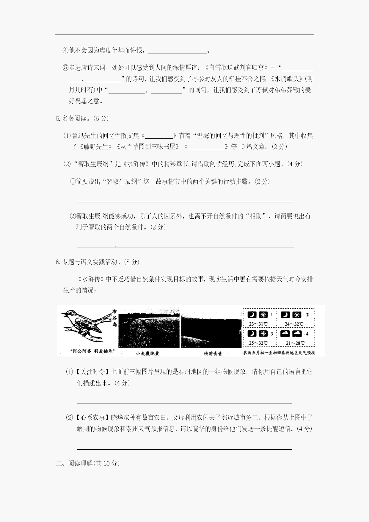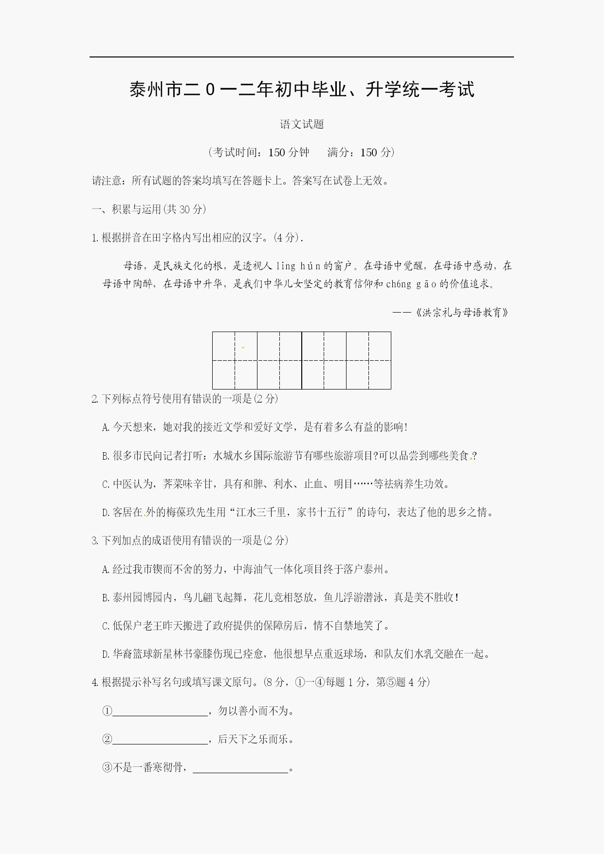泰州市二O一二年初中毕业、升学统一考试语文试题(考试时间:150分钟满分:150分)请注意:所有试题的答案均填写在答题卡上。答案写在试卷上无效。一、积累与运用(共30分)1.根据拼音在田字格内写出相应的汉字。(4分).母语,是民族文化的根,是透视人linghún的窗户。在母语中觉醒,在母语中感动,在母语中陶醉,在母语中升华,是我们中华儿女坚定的教育信仰和ch6nggāo的价值追求。——《洪宗礼与母语教育》2.下列标点符号使用有错误的一项是(2分)A.今天想来,她对我的接近文学和爱好文学,是有着多么有益的影响!B.很多市民向记者打听:水城水乡国际旅游节有哪些旅游项目?可以品尝到哪些美食?C.中医认为,荠菜味辛甘,具有和脾、利水、止血、明目……等祛病养生功效。D.客居在外的梅葆玖先生用“江水三千里,家书十五行”的诗句,表达了他的思乡之情。3.下列加点的成语使用有错误的一项是(2分)A.经过我市锲而不舍的努力,中海油气一体化项目终于落户泰州。B.泰州园博园内,鸟儿翩飞起舞,花儿竞相怒放,鱼儿浮游潜泳,真是美不胜收!C.低保户老王昨天搬进了政府提供的保障房后,情不自禁地笑了。D.华裔篮球新星林书豪膝伤现已痊愈,他很想早点重返球场,和队友们水乳交融在一起。4.根据提示补写名句或填写课文原句。(8分,①一④每题1分,第⑤题4分)①,勿以善小而不为。②,后天下之乐而乐。③不是一番寒彻骨,。④他不会因为虚度年华而悔恨,。⑤走进唐诗宋词,处处可以感受到人间的深情厚谊:《白雪歌送武判官归京》中“,”的诗句,让我们感受到了岑参对友人的牵挂不舍之情;《水调歌头》(明月几时有)中“,”的词句,让我们感受到了苏轼对弟弟苏辙的美好祝愿之意。5.名著阅读。(6分)(1)鲁迅先生的回忆性散文集《》有着“温馨的回忆与理性的批判”风格,其中收集了《藤野先生》《从百草园到三味书屋》《》等10篇文章。(2分)(2)“智取生辰纲”是《水浒传》中的精彩章节,请借助阅读经历,完成下面两小题。(4分)①简要说出“智取生辰纲”这一故事情节中的两个关键的行动步骤。(2分)②智取生辰纲能够成功,除了人的因素外,也离不开自然条件的“相助”,请简要说出有利于智取的两个自然条件。(2分)6.专题与语文实践活动。(8分)《水浒传》中不乏巧借自然条件实现目标的故事,现实生活中更有需要依据天气时令安排生产的情况:(1)【关注时令】上面前三幅图片呈现的是泰州地区的一组物候现象,请你用自己的语言把它们描述出来。(4分)(2)【心系农事】晓华家种有数亩农田,父母利用农闲去了邻近城市务工,根据你从上图中了解到的物候现象和泰州天气预报信息,请以晓华的身份给他们发送一条提醒短信。(4分)二、阅读理解(共60分)(一)阅读李白的《塞下曲》(其一)一诗,完成第7题。(6分)五月天山雪,无花只有寒。笛中闻折柳,春色未曾看。晓战随金鼓,宵眠抱玉鞍。愿将腰下剑,直为斩楼兰①。【注】①楼兰:这里泛指侵扰西北的敌人。7.(1)诗的一、二两联表现了边塞生活的特点。(1分)(2)“宵眠抱玉鞍”一句中,用“抱”而不用“枕”的妙处是:(2分)(3)全诗的主题是什么?诗中运用了什么手法突出这一主题?(3分)(二)阅读《魏公叔痤病》一文,完成8—11题。(14分)魏公叔痤①病,惠王往问之。曰:“公叔病,即不可讳②,将奈社稷何?”公叔痤对曰:“痤有御庶子公孙鞅③,愿王以国事听之也。为④弗能听,勿使出竞⑤。”王弗应,出而谓左右曰:“岂不悲哉!以公叔之贤,而谓寡人必以国事听鞅,不亦悖⑥乎!”公叔痤死,公孙鞅闻之,已葬,西之秦,孝公受而用之。秦果日以强,魏日以削。此非公叔之悖也,惠王之悖也。悖者之患,固⑦以不悖者为悖。【注】①公叔痤(cu6):魏相。②即:如果。不可讳:意为不幸去世。③御庶子:家臣。公孙鞅:即商鞅。④为:如果。⑤竞:同“境”。⑥悖:糊涂、昏聩。⑦固:原来。8.根据要求,完成下列两小题。(6分)(1)解释下列句中加点词的意思。(4分)①公叔痤对曰()②愿王以国事听之也()③秦果日以强()④悖者之患()(2)下列各句与例句中“而”的用法相同的一项是(2分)例句:出而谓左右曰A.学而不思则罔(《<论语>八则》)B.河曲智叟笑而止之日(《愚公移山》)C.乃记之而去(《小石潭记》)D.黑质而白章(《捕蛇者说》)9.用“/”标出下面句子的两处朗读停顿。(2分)此非公叔之悖也10.翻译下列句子。(4分)(1)西之秦,孝公受而用之。译文:(2)燕、赵、韩、魏闻之,皆朝予齐。此所谓战胜于朝廷。(《邹忌讽齐王纳谏》)[来源:学科网ZXXK]译文:11.读史可以使人明智,文中的惠王之“