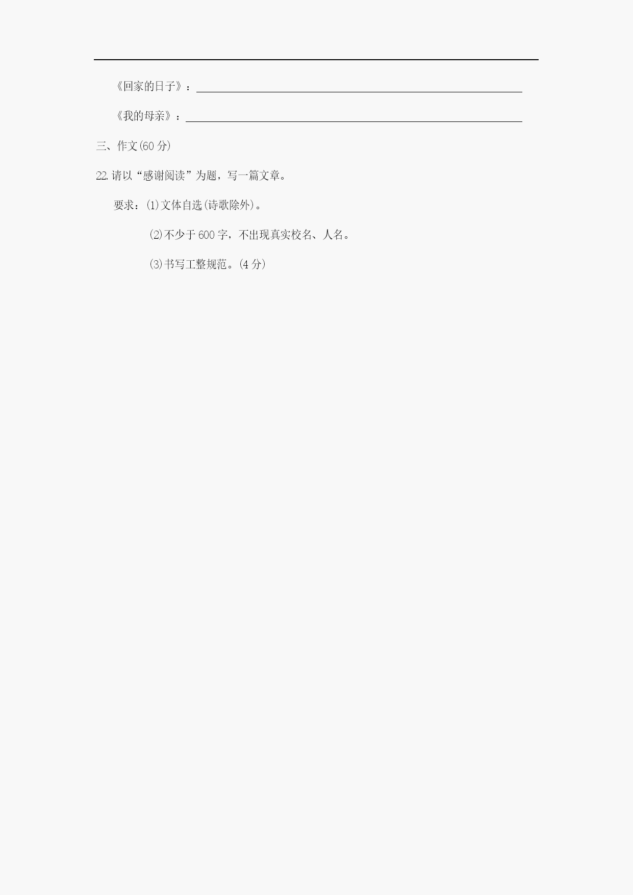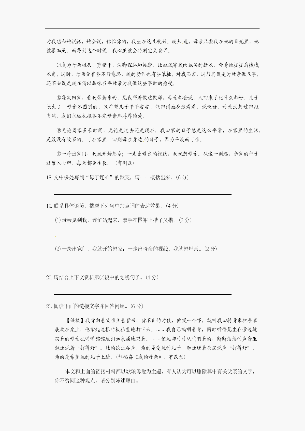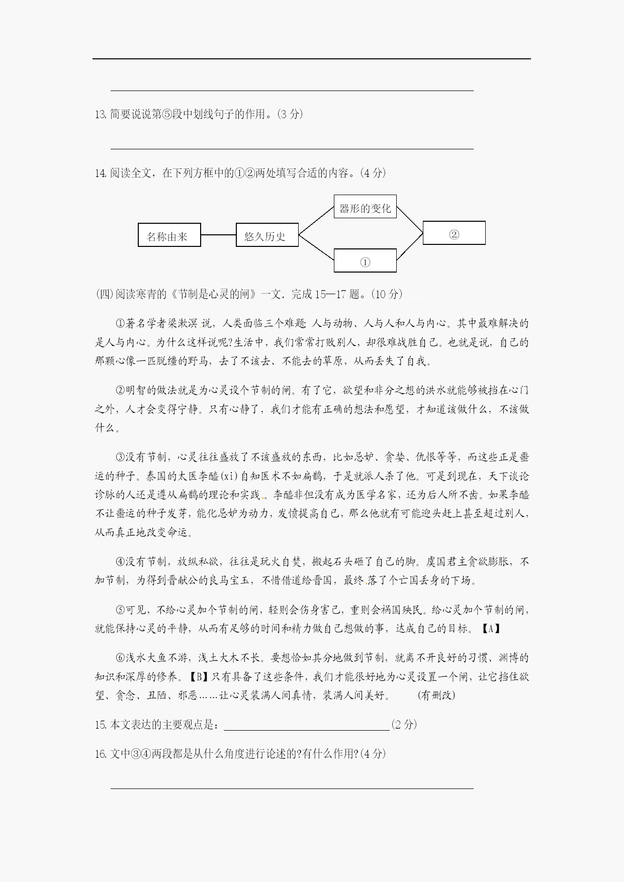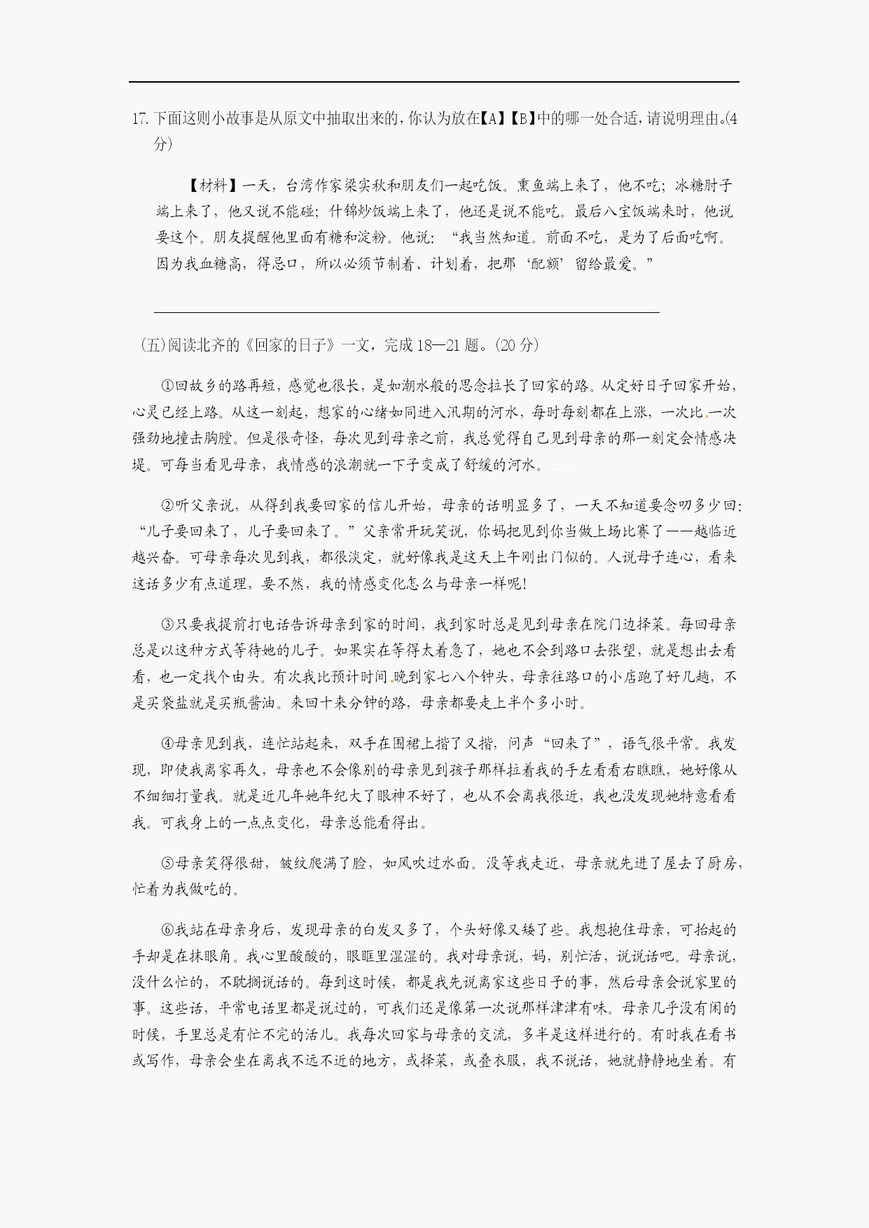 泰州市二O一二年初中毕业、升学统一考试语文试题(考试时间:150分钟满分:150分)请注意:所有试题的答案均填写在答题卡上。答案写在试卷上无效。一、积累与运用(共30分)1.根据拼音在田字格内写出相应的汉字。(4分).母语,是民族文化的根,是透视人linghún的窗户。在母语中觉醒,在母语中感动,在母语中陶醉,在母语中升华,是我们中华儿女坚定的教育信仰和ch6nggāo的价值追求。——《洪宗礼与母语教育》2.下列标点符号使用有错误的一项是(2分)A.今天想来,她对我的接近文学和爱好文学,是有着多么有益的影响!B.很多市民向记者打听:水城水乡国际旅游节有哪些旅游项目?可以品尝到哪些美食?C.中医认为,荠菜味辛甘,具有和脾、利水、止血、明目……等祛病养生功效。D.客居在外的梅葆玖先生用“江水三千里,家书十五行”的诗句,表达了他的思乡之情。3.下列加点的成语使用有错误的一项是(2分)A.经过我市锲而不舍的努力,中海油气一体化项目终于落户泰州。B.泰州园博园内,鸟儿翩飞起舞,花儿竞相怒放,鱼儿浮游潜泳,真是美不胜收!C.低保户老王昨天搬进了政府提供的保障房后,情不自禁地笑了。D.华裔篮球新星林书豪膝伤现已痊愈,他很想早点重返球场,和队友们水乳交融在一起。4.根据提示补写名句或填写课文原句。(8分,①一④每题1分,第⑤题4分)①,勿以善小而不为。②,后天下之乐而乐。③不是一番寒彻骨,。④他不会因为虚度年华而悔恨,。⑤走进唐诗宋词,处处可以感受到人间的深情厚谊:《白雪歌送武判官归京》中“,”的诗句,让我们感受到了岑参对友人的牵挂不舍之情;《水调歌头》(明月几时有)中“,”的词句,让我们感受到了苏轼对弟弟苏辙的美好祝愿之意。5.名著阅读。(6分)(1)鲁迅先生的回忆性散文集《》有着“温馨的回忆与理性的批判”风格,其中收集了《藤野先生》《从百草园到三味书屋》《》等10篇文章。(2分)(2)“智取生辰纲”是《水浒传》中的精彩章节,请借助阅读经历,完成下面两小题。(4分)①简要说出“智取生辰纲”这一故事情节中的两个关键的行动步骤。(2分)②智取生辰纲能够成功,除了人的因素外,也离不开自然条件的“相助”,请简要说出有利于智取的两个自然条件。(2分)6.专题与语文实践活动。(8分)《水浒传》中不乏巧借自然条件实现目标的故事,现实生活中更有需要依据天气时令安排生产的情况:(1)【关注时令】上面前三幅图片呈现的是泰州地区的一组物候现象,请你用自己的语言把它们描述出来。(4分)(2)【心系农事】晓华家种有数亩农田,父母利用农闲去了邻近城市务工,根据你从上图中了解到的物候现象和泰州天气预报信息,请以晓华的身份给他们发送一条提醒短信。(4分)二、阅读理解(共60分)(一)阅读李白的《塞下曲》(其一)一诗,完成第7题。(6分)五月天山雪,无花只有寒。笛中闻折柳,春色未曾看。晓战随金鼓,宵眠抱玉鞍。愿将腰下剑,直为斩楼兰①。【注】①楼兰:这里泛指侵扰西北的敌人。7.(1)诗的一、二两联表现了边塞生活的特点。(1分)(2)“宵眠抱玉鞍”一句中,用“抱”而不用“枕”的妙处是:(2分)(3)全诗的主题是什么?诗中运用了什么手法突出这一主题?(3分)(二)阅读《魏公叔痤病》一文,完成8—11题。(14分)魏公叔痤①病,惠王往问之。曰:“公叔病,即不可讳②,将奈社稷何?”公叔痤对曰:“痤有御庶子公孙鞅③,愿王以国事听之也。为④弗能听,勿使出竞⑤。”王弗应,出而谓左右曰:“岂不悲哉!以公叔之贤,而谓寡人必以国事听鞅,不亦悖⑥乎!”公叔痤死,公孙鞅闻之,已葬,西之秦,孝公受而用之。秦果日以强,魏日以削。此非公叔之悖也,惠王之悖也。悖者之患,固⑦以不悖者为悖。【注】①公叔痤(cu6):魏相。②即:如果。不可讳:意为不幸去世。③御庶子:家臣。公孙鞅:即商鞅。④为:如果。⑤竞:同“境”。⑥悖:糊涂、昏聩。⑦固:原来。8.根据要求,完成下列两小题。(6分)(1)解释下列句中加点词的意思。(4分)①公叔痤对曰()②愿王以国事听之也()③秦果日以强()④悖者之患()(2)下列各句与例句中“而”的用法相同的一项是(2分)例句:出而谓左右曰A.学而不思则罔(《<论语>八则》)B.河曲智叟笑而止之日(《愚公移山》)C.乃记之而去(《小石潭记》)D.黑质而白章(《捕蛇者说》)9.用“/”标出下面句子的两处朗读停顿。(2分)此非公叔之悖也10.翻译下列句子。(4分)(1)西之秦,孝公受而用之。译文:(2)燕、赵、韩、魏闻之,皆朝予齐。此所谓战胜于朝廷。(《邹忌讽齐王纳谏》)[来源:学科网ZXXK]译文:11.读史可以使人明智,文中的惠王之“