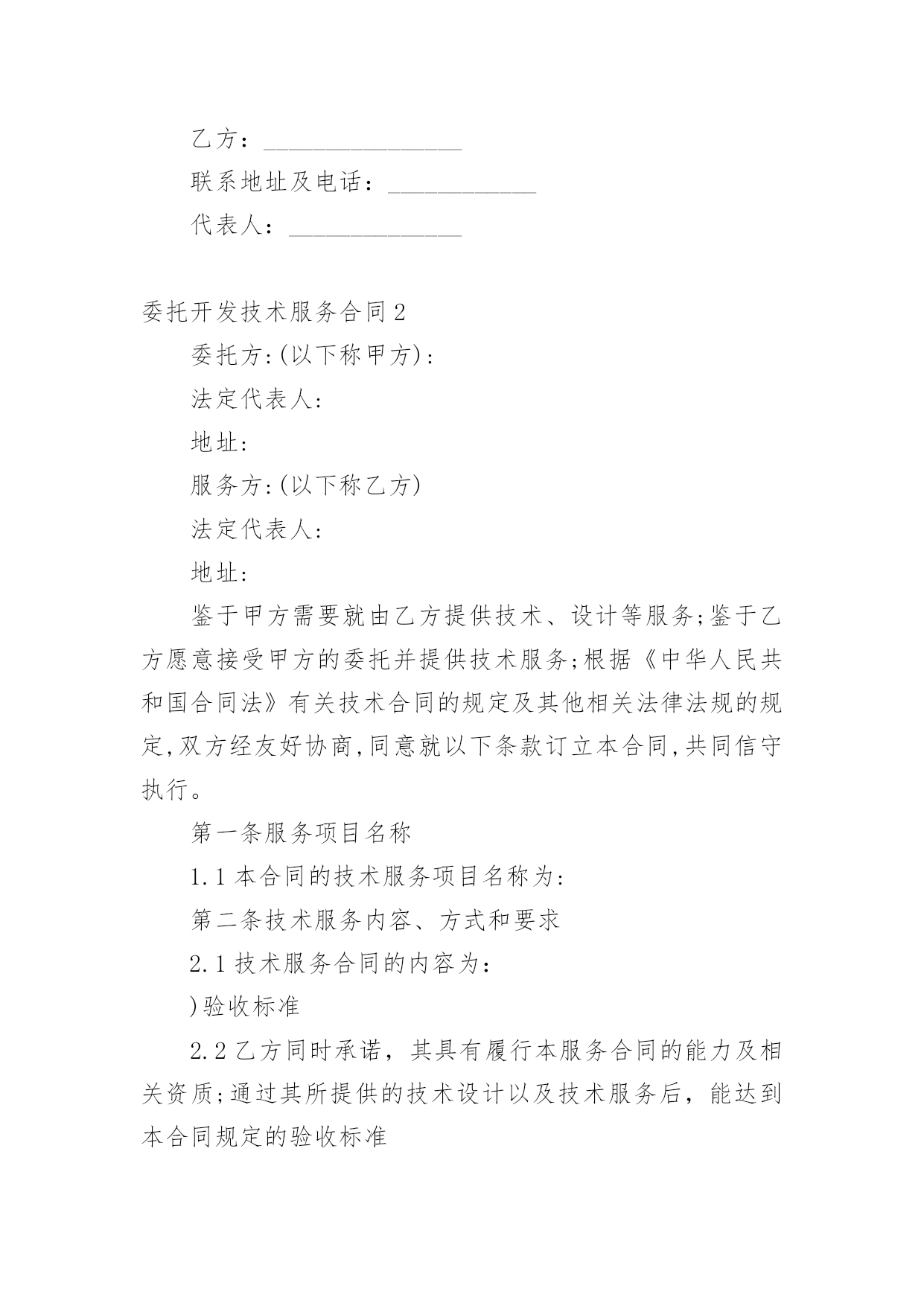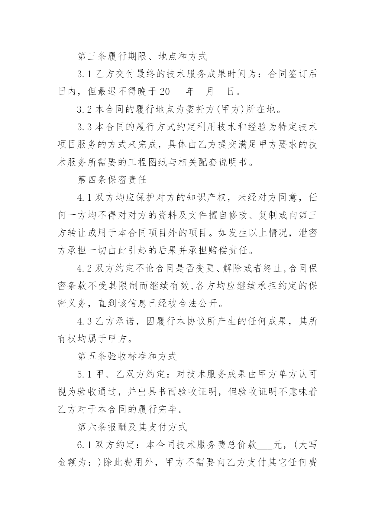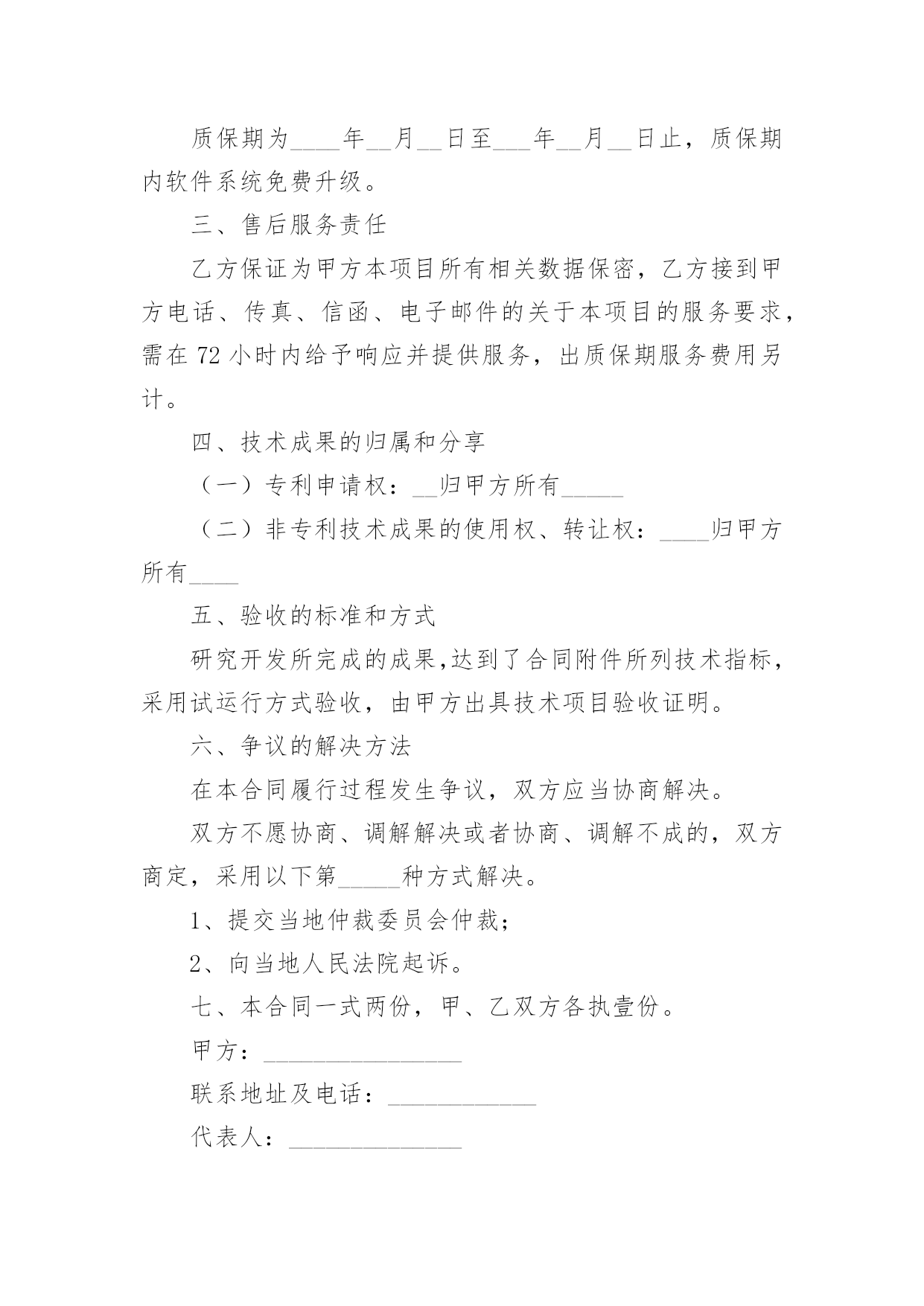 委托开发技术服务合同在不断进步的社会中,合同的法律效力与日俱增,它也是减少和防止发生争议的重要措施。那么正式、规范的合同是什么样的呢?下面是小编为大家整理的委托开发技术服务合同,欢迎阅读与收藏。委托开发技术服务合同1委托方(甲方):____________研究开发方(乙方):____________签订地点:____________签订日期:____________依据《中华人民共和国合同法》的规定,合同双方就项目的技术开发、服务,经协商一致,签订本合同。一、委托技术的内容、形式和要求及交付方式甲方委托乙方开发________系统,详细参数要求按技术协议执行,开发平台通过测试后,源程序代码一次性交付。本项目研究开发经费及服务费:____元经费和服务费支付方式及时限(采用以下种方式):①一次总付:____________元,时间:________________②分期支付:_______元,时间:________________二、合同履行的期限及质保期本合同自____年__月__日至___年__月__日在_____(地点)履行。质保期为____年__月__日至___年__月__日止,质保期内软件系统免费升级。三、售后服务责任乙方保证为甲方本项目所有相关数据保密,乙方接到甲方电话、传真、信函、电子邮件的关于本项目的服务要求,需在72小时内给予响应并提供服务,出质保期服务费用另计。四、技术成果的归属和分享(一)专利申请权:__归甲方所有_____(二)非专利技术成果的使用权、转让权:____归甲方所有____五、验收的标准和方式研究开发所完成的成果,达到了合同附件所列技术指标,采用试运行方式验收,由甲方出具技术项目验收证明。六、争议的解决方法在本合同履行过程发生争议,双方应当协商解决。双方不愿协商、调解解决或者协商、调解不成的,双方商定,采用以下第_____种方式解决。1、提交当地仲裁委员会仲裁;2、向当地人民法院起诉。七、本合同一式两份,甲、乙双方各执壹份。甲方:________________联系地址及电话:____________代表人:______________乙方:________________联系地址及电话:____________代表人:______________委托开发技术服务合同2委托方:(以下称甲方):法定代表人:地址:服务方:(以下称乙方)法定代表人:地址:鉴于甲方需要就由乙方提供技术、设计等服务;鉴于乙方愿意接受甲方的委托并提供技术服务;根据《中华人民共和国合同法》有关技术合同的规定及其他相关法律法规的规定,双方经友好协商,同意就以下条款订立本合同,共同信守执行。第一条服务项目名称1.1本合同的技术服务项目名称为:第二条技术服务内容、方式和要求2.1技术服务合同的内容为:)验收标准2.2乙方同时承诺,其具有履行本服务合同的能力及相关资质;通过其所提供的技术设计以及技术服务后,能达到本合同规定的验收标准第三条履行期限、地点和方式3.1乙方交付最终的技术服务成果时间为:合同签订后日内,但最迟不得晚于20___年__月__日。3.2本合同的履行地点为委托方(甲方)所在地。3.3本合同的履行方式约定利用技术和经验为特定技术项目服务的方式来完成,具体由乙方提交满足甲方要求的技术服务所需要的工程图纸与相关配套说明书。第四条保密责任4.1双方均应保护对方的知识产权,未经对方同意,任何一方均不得对对方的资料及文件擅自修改、复制或向第三方转让或用于本合同项目外的项目。如发生以上情况,泄密方承担一切由此引起的后果并承担赔偿责任。4.2双方约定不论合同是否变更、解除或者终止,合同保密条款不受其限制而继续有效,各方均应继续承担约定的保密义务,直到该信息已经被合法公开。4.3乙方承诺,因履行本协议所产生的任何成果,其所有权均属于甲方。第五条验收标准和方式5.1甲、乙双方约定:对技术服务成果由甲方单方认可视为验收通过,并出具书面验收证明,但验收证明不意味着乙方对于本合同的履行完毕。第六条报酬及其支付方式6.1双方约定:本合同技术服务费总价款___元,(大写金额为:)除此费用外,甲方不需要向乙方支付其它任何费用。上述技术服务费用按照以下进度支付:(1)本合同签订后15日内,甲方向乙方支付本合同总价款的20%作为预付款,但乙方须同时提供银行出具的预付款保函。(2)在乙方向甲方提交技术服务所需要的全部技术成果,并经乙方验收出具验收证明后15日内,甲方向乙方支付本合同总价款的40%作为进度款,但乙方须同时开出17%增值税专用发票(税票金额为本合同总价款)。(3)在本技术服务所涉及土建工程建设完毕并经甲方书面验收合格后,支付合同总金额的30%作为进度款。(4)余款10%作为质保金,在本合同履行结束后且一年质保期届满后,由甲方将该质保金