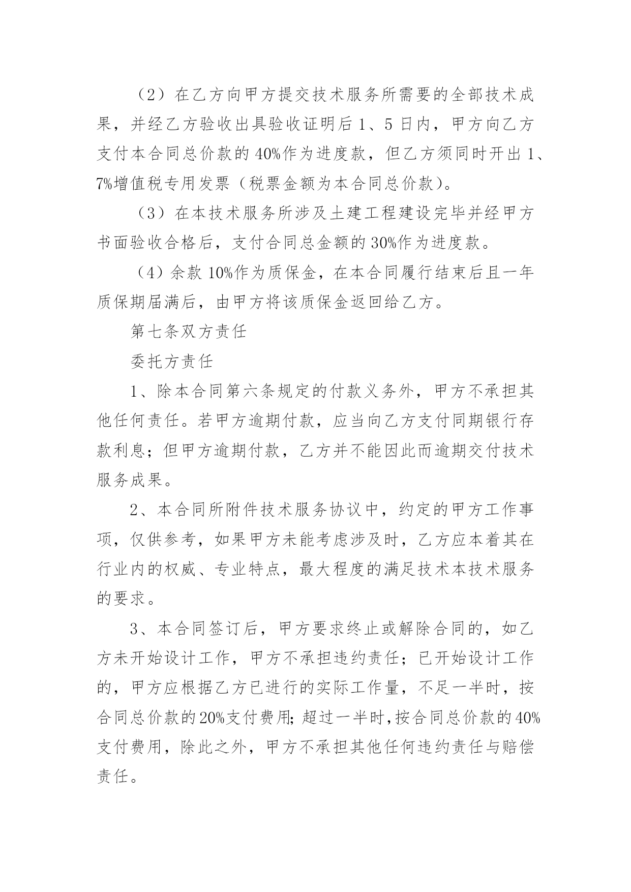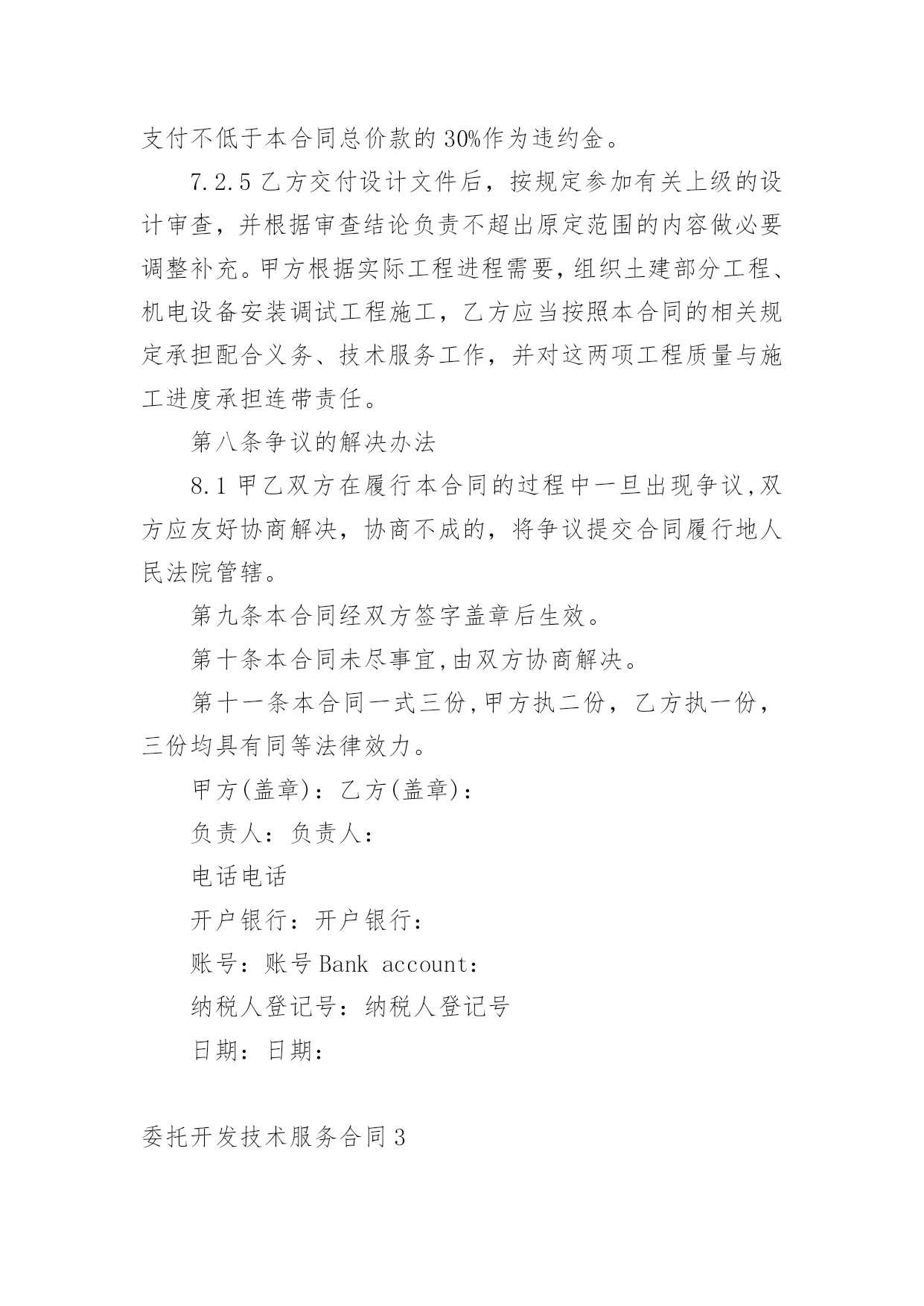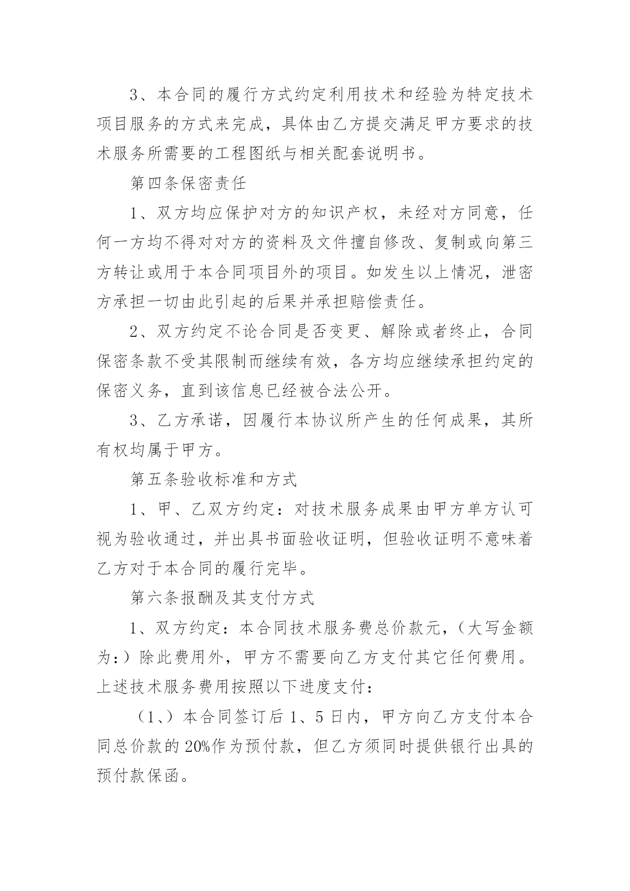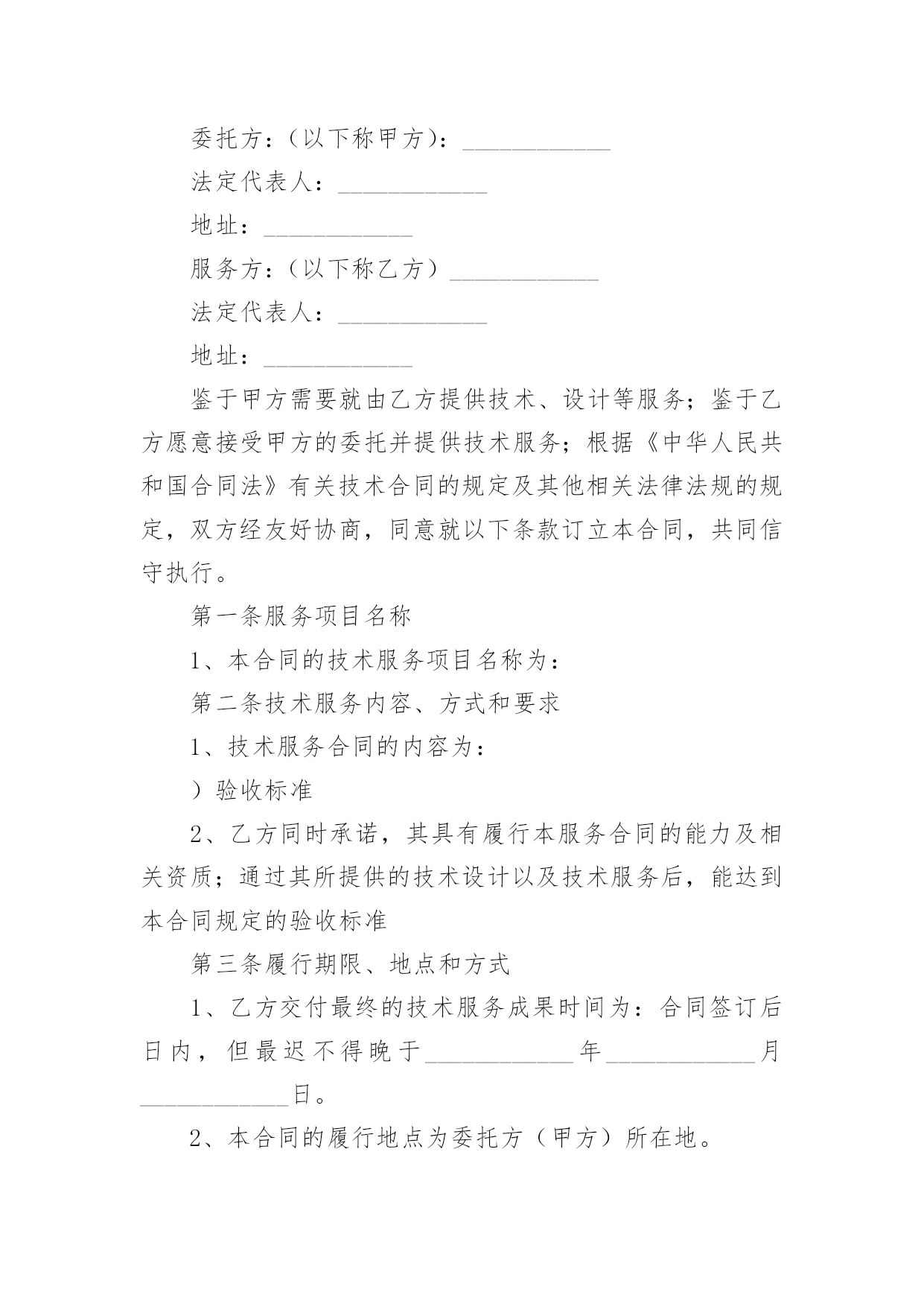 委托开发技术服务合同在不断进步的社会中,合同的法律效力与日俱增,它也是减少和防止发生争议的重要措施。那么正式、规范的合同是什么样的呢?下面是小编为大家整理的委托开发技术服务合同,欢迎阅读与收藏。委托开发技术服务合同1委托方(甲方):____________研究开发方(乙方):____________签订地点:____________签订日期:____________依据《中华人民共和国合同法》的规定,合同双方就项目的技术开发、服务,经协商一致,签订本合同。一、委托技术的内容、形式和要求及交付方式甲方委托乙方开发________系统,详细参数要求按技术协议执行,开发平台通过测试后,源程序代码一次性交付。本项目研究开发经费及服务费:____元经费和服务费支付方式及时限(采用以下种方式):①一次总付:____________元,时间:________________②分期支付:_______元,时间:________________二、合同履行的期限及质保期本合同自____年__月__日至___年__月__日在_____(地点)履行。质保期为____年__月__日至___年__月__日止,质保期内软件系统免费升级。三、售后服务责任乙方保证为甲方本项目所有相关数据保密,乙方接到甲方电话、传真、信函、电子邮件的关于本项目的服务要求,需在72小时内给予响应并提供服务,出质保期服务费用另计。四、技术成果的归属和分享(一)专利申请权:__归甲方所有_____(二)非专利技术成果的使用权、转让权:____归甲方所有____五、验收的标准和方式研究开发所完成的成果,达到了合同附件所列技术指标,采用试运行方式验收,由甲方出具技术项目验收证明。六、争议的解决方法在本合同履行过程发生争议,双方应当协商解决。双方不愿协商、调解解决或者协商、调解不成的,双方商定,采用以下第_____种方式解决。1、提交当地仲裁委员会仲裁;2、向当地人民法院起诉。七、本合同一式两份,甲、乙双方各执壹份。甲方:________________联系地址及电话:____________代表人:______________乙方:________________联系地址及电话:____________代表人:______________委托开发技术服务合同2委托方:(以下称甲方):法定代表人:地址:服务方:(以下称乙方)法定代表人:地址:鉴于甲方需要就由乙方提供技术、设计等服务;鉴于乙方愿意接受甲方的委托并提供技术服务;根据《中华人民共和国合同法》有关技术合同的规定及其他相关法律法规的规定,双方经友好协商,同意就以下条款订立本合同,共同信守执行。第一条服务项目名称1.1本合同的技术服务项目名称为:第二条技术服务内容、方式和要求2.1技术服务合同的内容为:)验收标准2.2乙方同时承诺,其具有履行本服务合同的能力及相关资质;通过其所提供的技术设计以及技术服务后,能达到本合同规定的验收标准第三条履行期限、地点和方式3.1乙方交付最终的技术服务成果时间为:合同签订后日内,但最迟不得晚于20___年__月__日。3.2本合同的履行地点为委托方(甲方)所在地。3.3本合同的履行方式约定利用技术和经验为特定技术项目服务的方式来完成,具体由乙方提交满足甲方要求的技术服务所需要的工程图纸与相关配套说明书。第四条保密责任4.1双方均应保护对方的知识产权,未经对方同意,任何一方均不得对对方的资料及文件擅自修改、复制或向第三方转让或用于本合同项目外的项目。如发生以上情况,泄密方承担一切由此引起的后果并承担赔偿责任。4.2双方约定不论合同是否变更、解除或者终止,合同保密条款不受其限制而继续有效,各方均应继续承担约定的保密义务,直到该信息已经被合法公开。4.3乙方承诺,因履行本协议所产生的任何成果,其所有权均属于甲方。第五条验收标准和方式5.1甲、乙双方约定:对技术服务成果由甲方单方认可视为验收通过,并出具书面验收证明,但验收证明不意味着乙方对于本合同的履行完毕。第六条报酬及其支付方式6.1双方约定:本合同技术服务费总价款___元,(大写金额为:)除此费用外,甲方不需要向乙方支付其它任何费用。上述技术服务费用按照以下进度支付:(1)本合同签订后15日内,甲方向乙方支付本合同总价款的20%作为预付款,但乙方须同时提供银行出具的预付款保函。(2)在乙方向甲方提交技术服务所需要的全部技术成果,并经乙方验收出具验收证明后15日内,甲方向乙方支付本合同总价款的40%作为进度款,但乙方须同时开出17%增值税专用发票(税票金额为本合同总价款)。(3)在本技术服务所涉及土建工程建设完毕并经甲方书面验收合格后,支付合同总金额的30%作为进度款。(4)余款10%作为质保金,在本合同履行结束后且一年质保期届满后,由甲方将该质保金