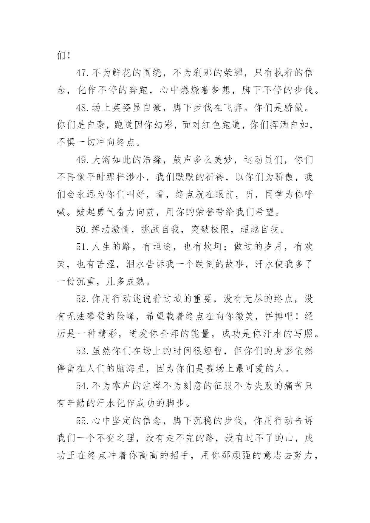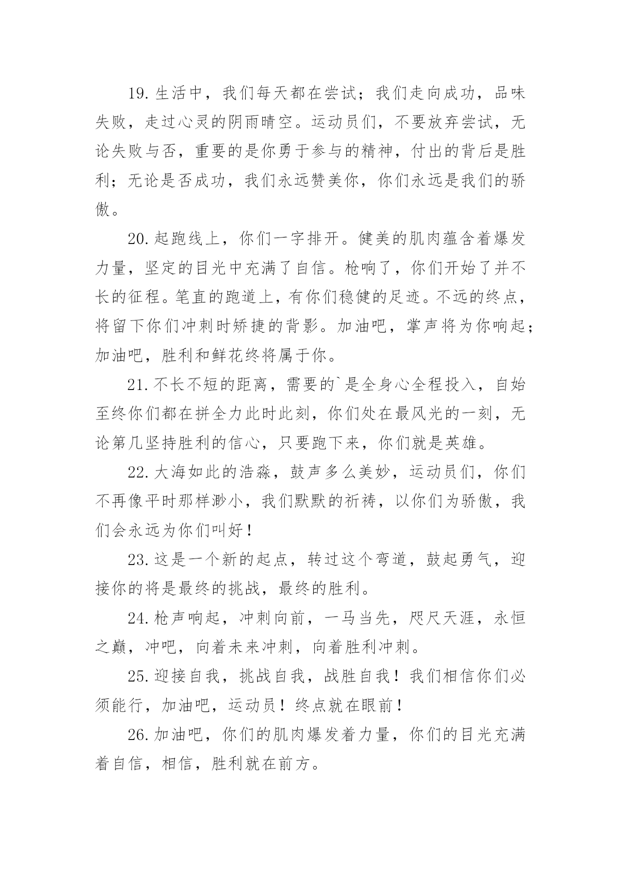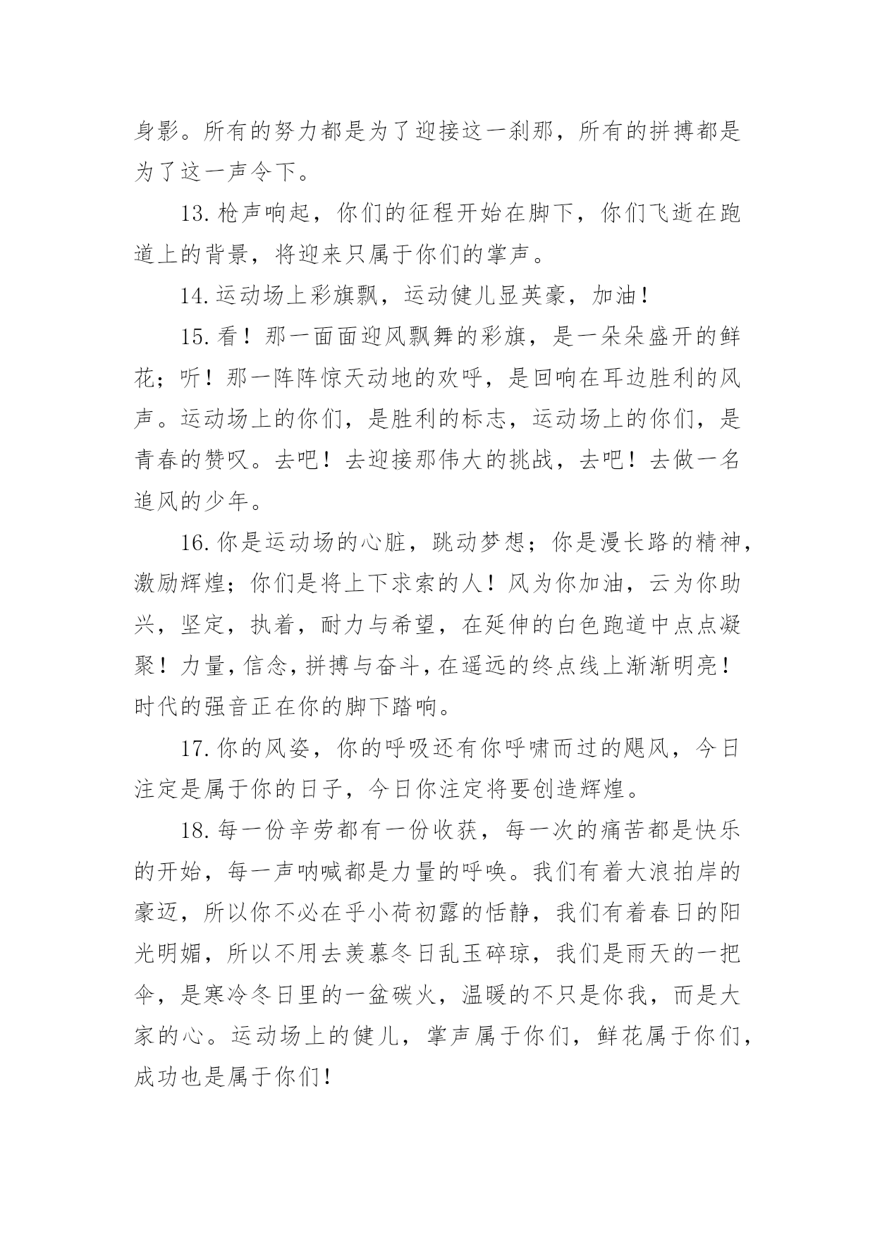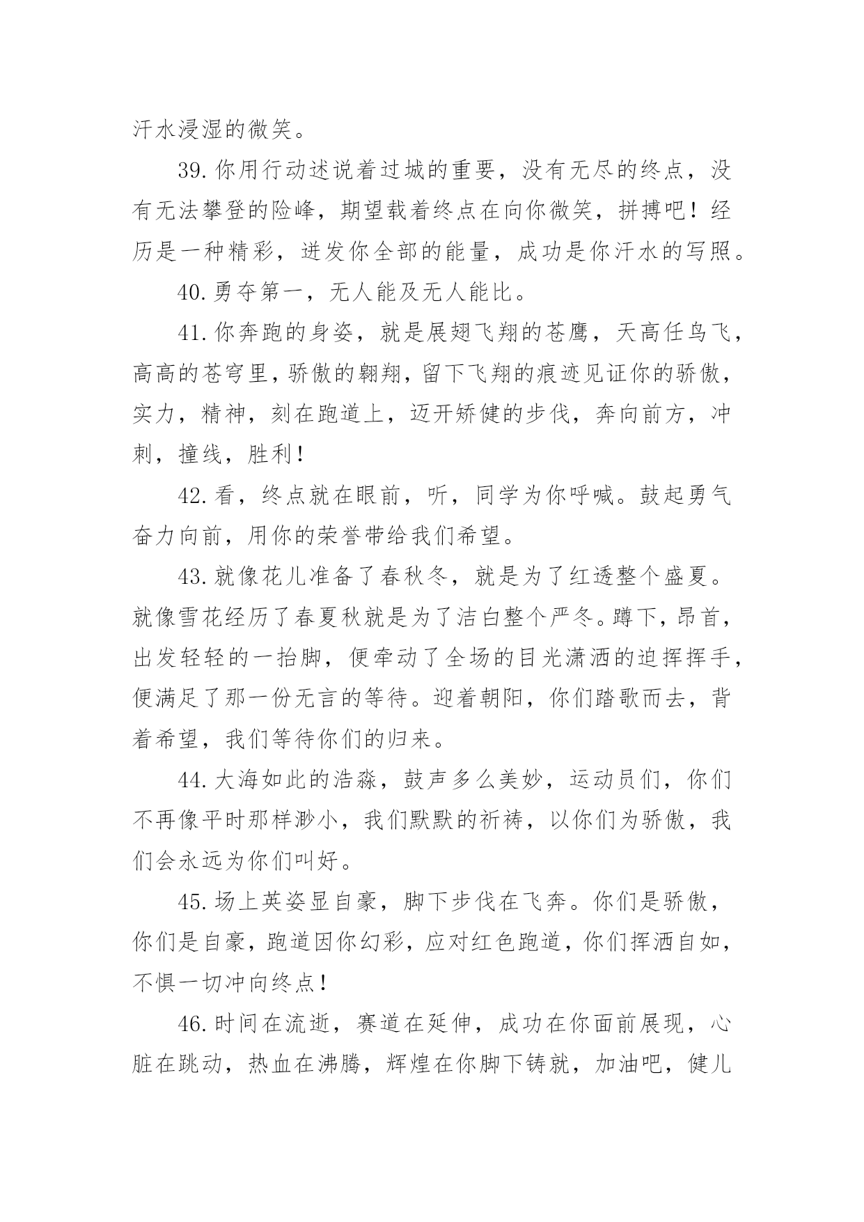 运动会加油稿运动会加油稿[共15篇]随着社会不断地进步,需要使用加油稿的场合越来越多,借助加油稿可以表达对对方的鼓励和支持。怎么写加油稿才能避免踩雷呢?以下是小编为大家收集的运动会加油稿,仅供参考,希望能够帮助到大家。运动会加油稿11.有些运动员,就只是来充充数的,就像我,在这些比赛当中,一般不太会进入决赛;而有些运动员,则是那些有实力的运动员,总是可以得名次。2.总而言之,我们应该养成平时爱锻炼身体的好习惯:早上锻炼身体是为了健身,中午锻炼身体是为了消化,晚上锻炼身体是为了放松心情。让我们都变成爱运动、健康的好孩子吧!3.心中坚定的信念,脚下沉稳的步伐,你用行动告诉我们一个不变之理,没有走不完的路,没有过不了的山,成功正在终点冲着你高高的招手,用你那顽强的意志去努力,去迎接终点的鲜花与掌声,相信成功一定是属于你。4.致运动员。你是跑道上划过的流星,燃烧自己,洒下光辉,也许你并没有看到成功像你挥手,但你已奋斗拼搏过,相信自己,力量就在心中。5.你胜利了。望着远方红色的终点线,那是汗水铺成的路,泪水堆成的.山,平时的努力与奋战,不就为这一瞬间,于是你们用尽全身力气,冲向那决定命运的红线,你胜利了,耳旁飘来了同学们的欢呼与赞叹。运动会加油稿21.理想毕竟不同于现实,失败是生活的一部分,谁也无法选择,无法拒绝。人生要自己去拼搏,去奋斗,在风雨中百折不挠勇往前进,在集资的每个驿站上都留下一段不悔的回忆。流泪不是失落,徘徊不是迷惑,成功属于那些战胜失败,坚持不懈、勇于追求梦想的人。加油吧,运动健儿们!2.真心祝愿机会是什么?是不可错过的刹那间。呐喊是什么?是为那刹那间的真心祝愿。加油加油你肯定听到了那一声声呐喊你肯定看到了那双双期待的眼睛你肯定感受到了那发自内心的祝愿。3.不为掌声的诠释,不为刻意的征服,只有辛勤的汗水化作追求的脚步,心中坚定的信念,脚下你的汗水洒在跑道,浇灌着成功的花朵开放。你的欢笑飞扬在赛场,为班争光数你最棒。跑吧,追吧在这广阔的赛场上,你似骏马似离铉的箭。跑吧,追吧你比虎猛比豹强。4.你们挥舞着充满力量的双臂看着实心球化成美丽的弧线我着实在心里佩服你们你们抛出了自己的水平。5.一根小小的木棒,连接的是团结和友爱一根小小的木棒,传递的是勇气和力量一根小小的木棒,演绎的是奋斗和拼搏加油吧!让这激动人心的时刻,一直回荡在我们心中!6.只是一道过场,几秒钟转瞬即逝,可是这背后承载的是多少成败,加油吧,少年。7.我运动,我健康,此时我欢乐。8.一根小小的木棒,连接的是团结和友爱一根小小的木棒,传递的是勇气和力量,一根小小的木棒,演绎的是奋斗和拼搏,加油吧!让这激动人心的时刻,一直回荡在我们心中!9.有多少次挥汗如雨,伤痛曾添满记忆,只因为始终相信,去拼搏才能胜利。总在鼓舞自己,要成功就得努力。热血在赛场沸腾,巨人在赛场升起。相信自己,你将赢得胜利,创造奇迹;相信自己,梦想在你手中,这是你的天地。当一切过去,你们将是第一。相信自己,你们将超越极限,超越自己!相信自己,加油吧,健儿们,相信你自己。10.年轻的我们自信飞扬,青春的气息如同出生的朝阳,蓬勃的力量如同阳光的挥洒。此时此刻,跑道便是我们精彩的舞台,声声加油便是我们的奖项!论何成功,谈何荣辱,心中的信念只有一个:拼搏!萧瑟的秋风,挡不住你们破竹的锐气。11.广阔的绿茵场,是为你们搭建的舞台。张扬吧,年轻的心,我们将为你永远喝彩!12.泰戈尔在诗中说,天空没有翅膀的影子,但我已飞过;艾青对朋友说,也许有人到达不了彼岸,但我们共同拥有大海。也许你们没有显赫的成绩,但运动场上留下了你们的足迹。也许你们没有奖品,但我们心中留下了你们拼搏的身影。所有的努力都是为了迎接这一刹那,所有的拼搏都是为了这一声令下。13.枪声响起,你们的征程开始在脚下,你们飞逝在跑道上的背景,将迎来只属于你们的掌声。14.运动场上彩旗飘,运动健儿显英豪,加油!15.看!那一面面迎风飘舞的彩旗,是一朵朵盛开的鲜花;听!那一阵阵惊天动地的欢呼,是回响在耳边胜利的风声。运动场上的你们,是胜利的标志,运动场上的你们,是青春的赞叹。去吧!去迎接那伟大的挑战,去吧!去做一名追风的少年。16.你是运动场的心脏,跳动梦想;你是漫长路的精神,激励辉煌;你们是将上下求索的人!风为你加油,云为你助兴,坚定,执着,耐力与希望,在延伸的白色跑道中点点凝聚!力量,信念,拼搏与奋斗,在遥远的终点线上渐渐明亮!时代的强音正在你的脚下踏响。17.你的风姿,你的呼吸还有你呼啸而过的飓风,今日注定是属于你的日子,今日你注定将要创造辉煌。18.每一份辛劳都有一份收获,每一次的痛苦都是快乐的开始,每一声呐喊都是力量的呼唤。我们有着大浪拍岸的豪迈,所以你不必在乎小荷初露的恬静,我们有着春日的阳光明媚,所以不用去羡慕冬日乱玉碎琼,我们是雨天的一把伞