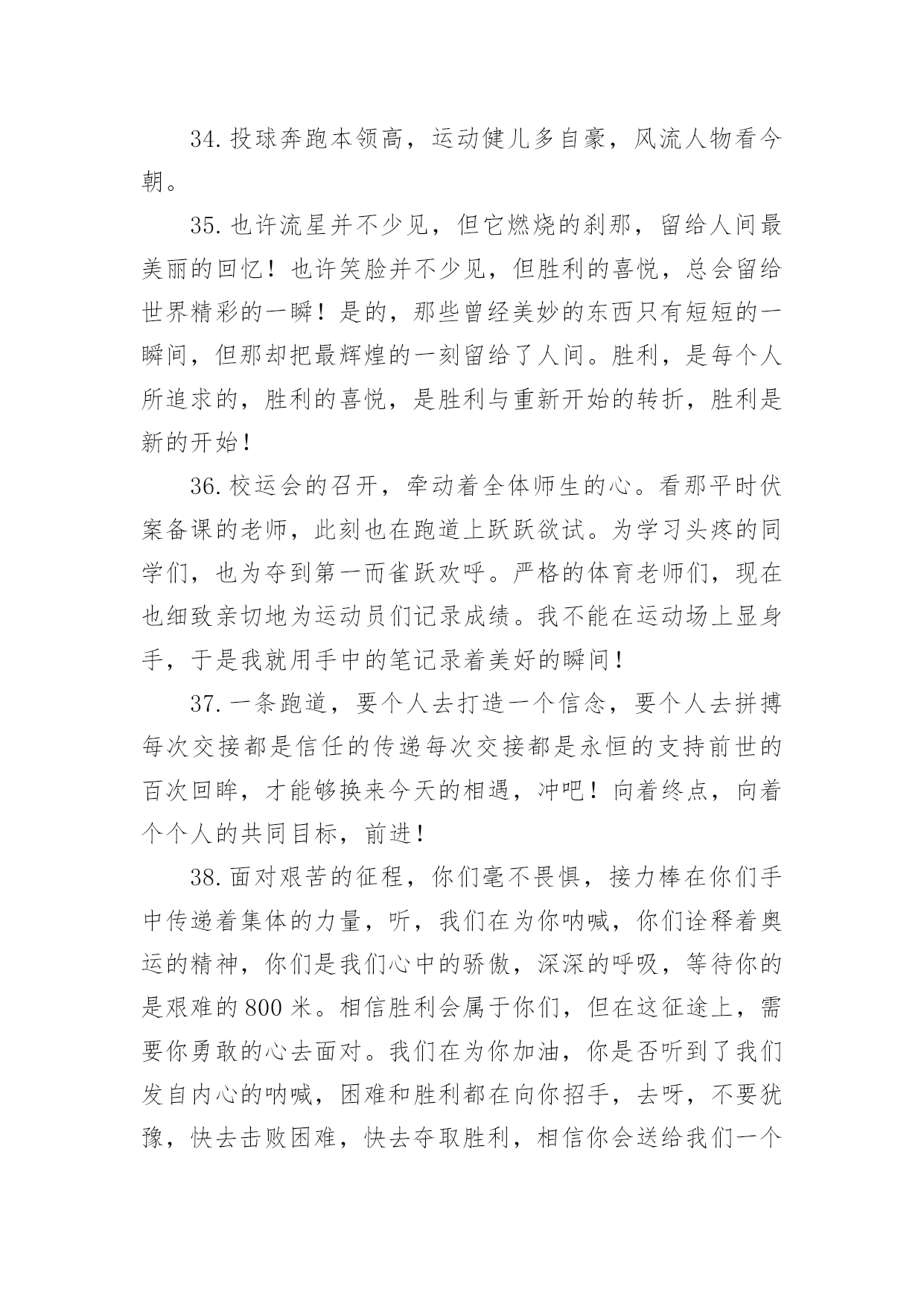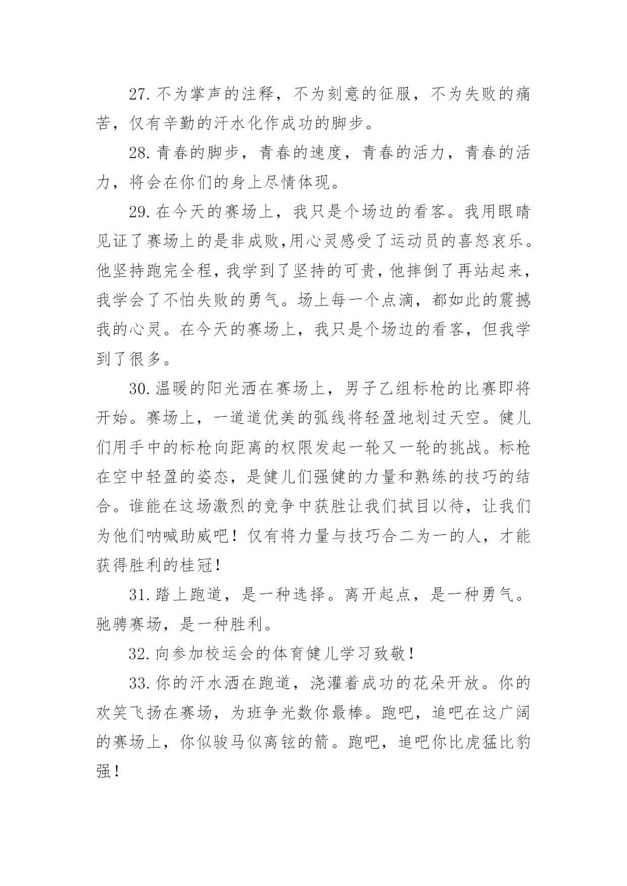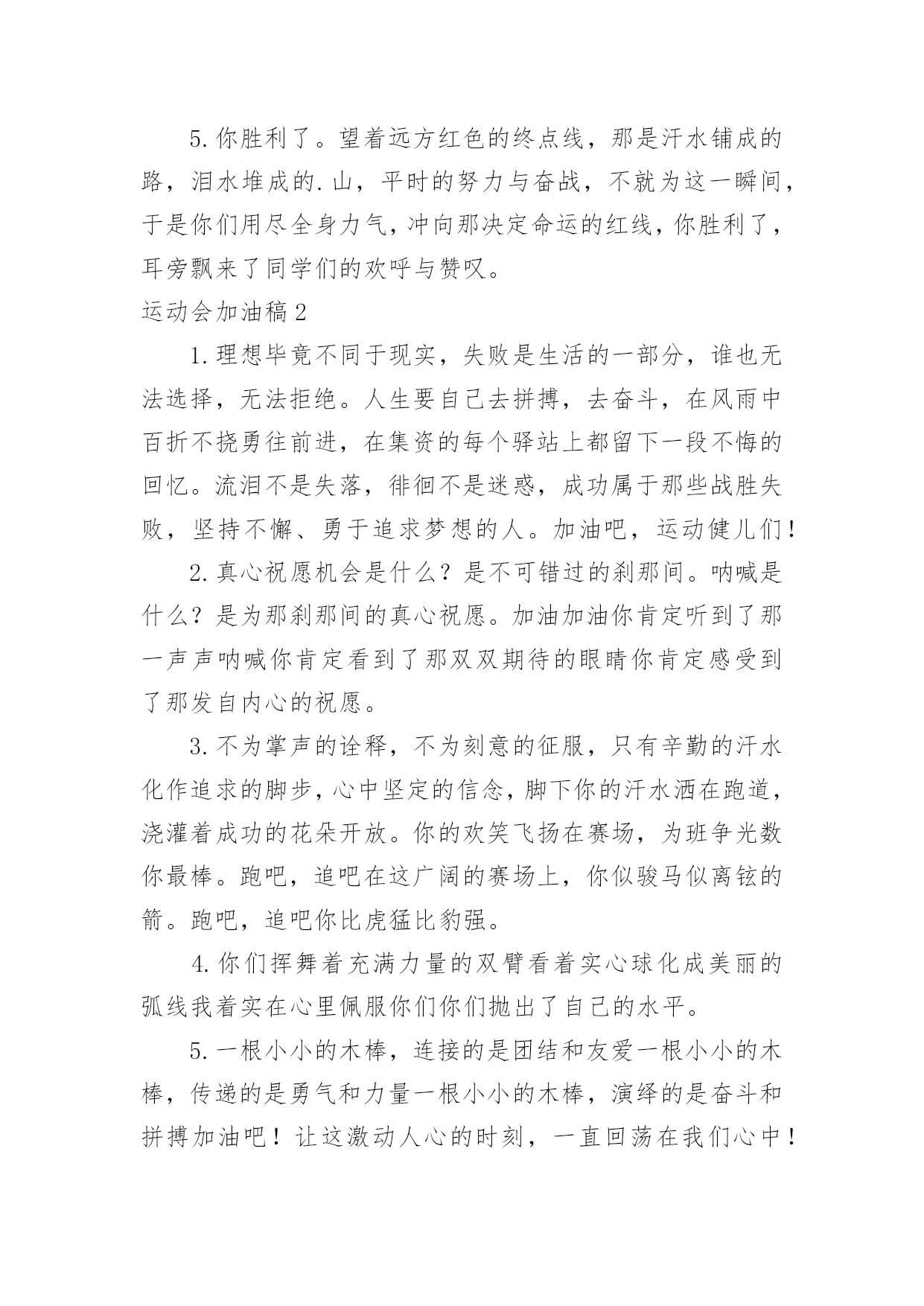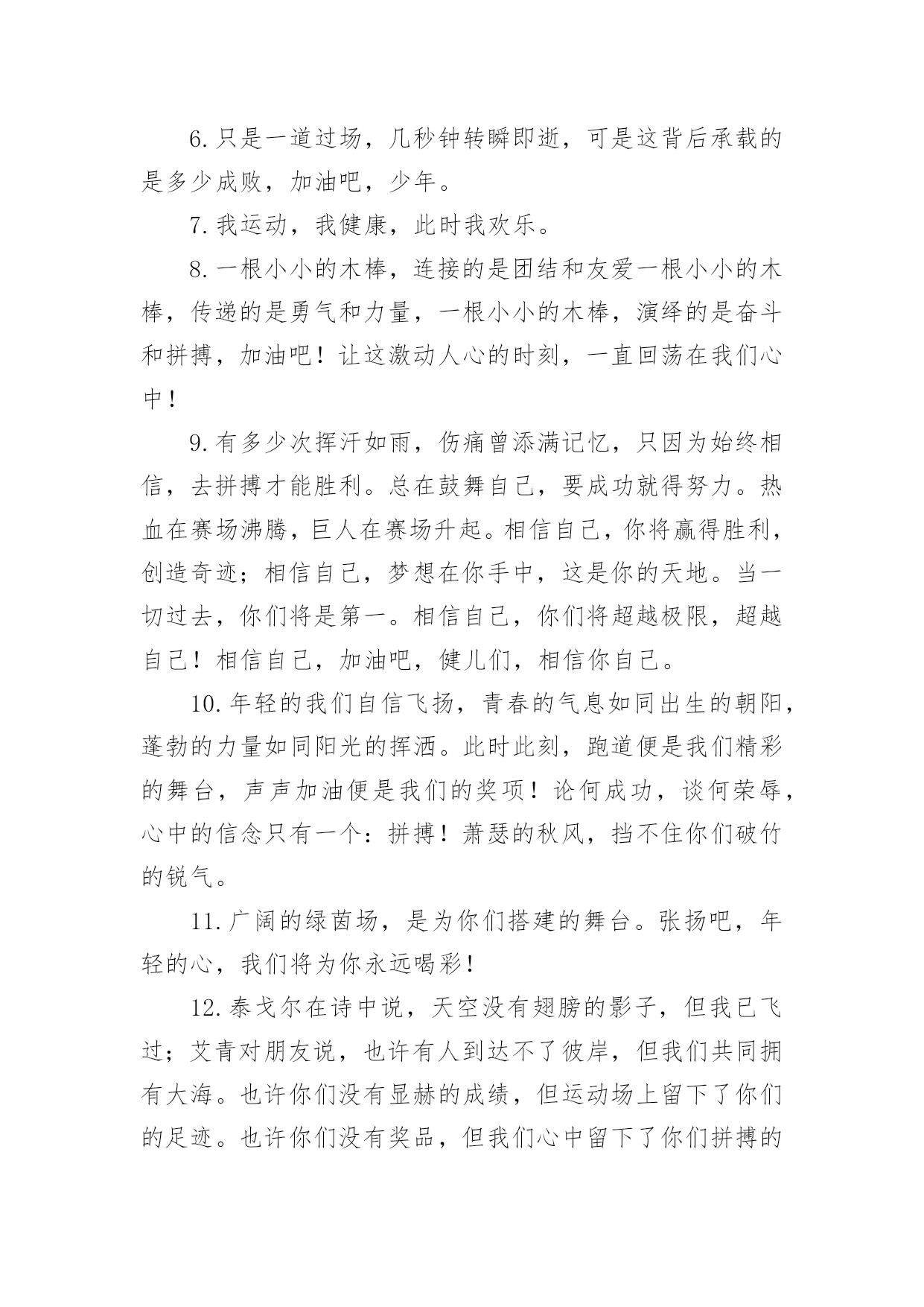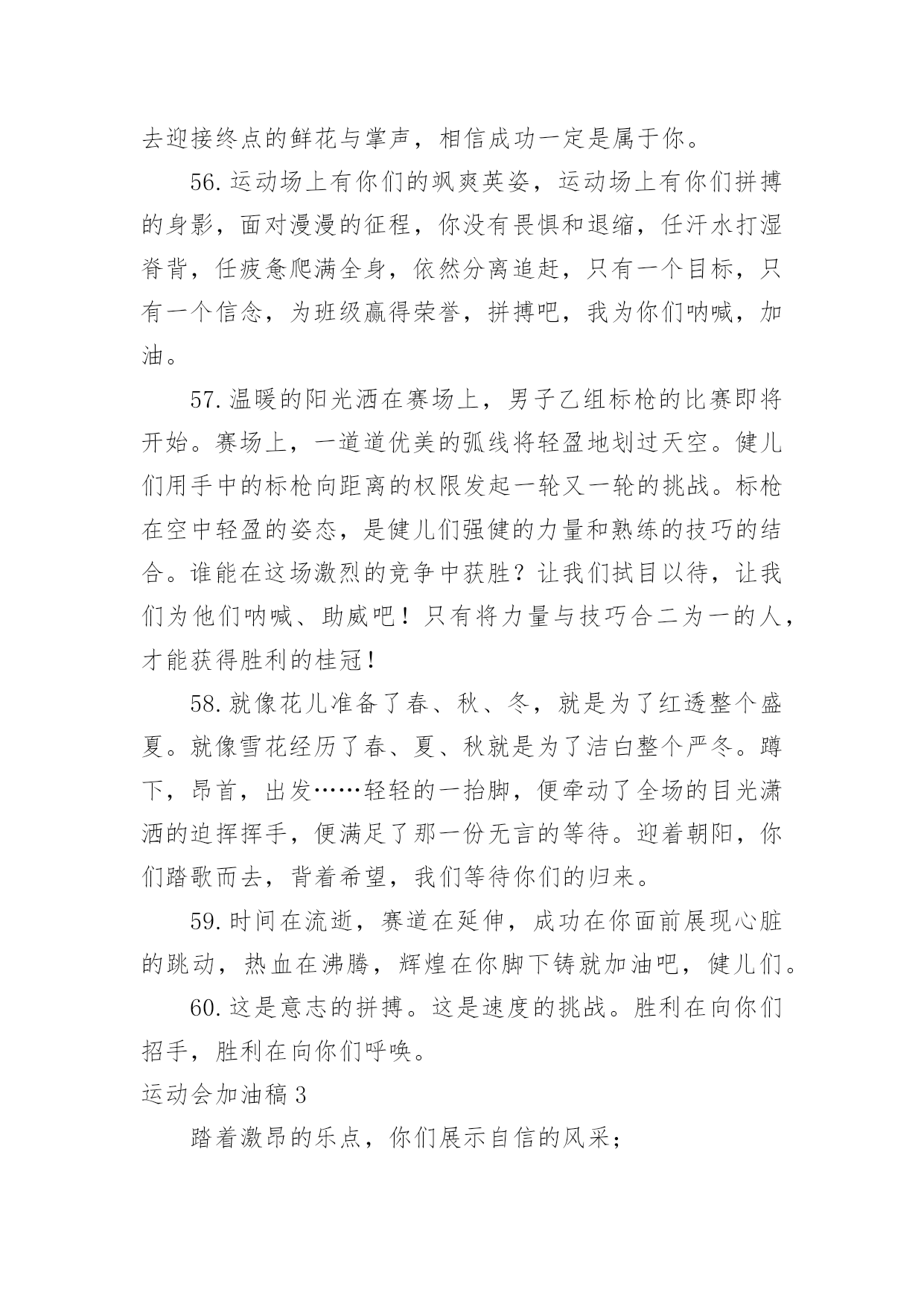 运动会加油稿运动会加油稿[共15篇]随着社会不断地进步,需要使用加油稿的场合越来越多,借助加油稿可以表达对对方的鼓励和支持。怎么写加油稿才能避免踩雷呢?以下是小编为大家收集的运动会加油稿,仅供参考,希望能够帮助到大家。运动会加油稿11.有些运动员,就只是来充充数的,就像我,在这些比赛当中,一般不太会进入决赛;而有些运动员,则是那些有实力的运动员,总是可以得名次。2.总而言之,我们应该养成平时爱锻炼身体的好习惯:早上锻炼身体是为了健身,中午锻炼身体是为了消化,晚上锻炼身体是为了放松心情。让我们都变成爱运动、健康的好孩子吧!3.心中坚定的信念,脚下沉稳的步伐,你用行动告诉我们一个不变之理,没有走不完的路,没有过不了的山,成功正在终点冲着你高高的招手,用你那顽强的意志去努力,去迎接终点的鲜花与掌声,相信成功一定是属于你。4.致运动员。你是跑道上划过的流星,燃烧自己,洒下光辉,也许你并没有看到成功像你挥手,但你已奋斗拼搏过,相信自己,力量就在心中。5.你胜利了。望着远方红色的终点线,那是汗水铺成的路,泪水堆成的.山,平时的努力与奋战,不就为这一瞬间,于是你们用尽全身力气,冲向那决定命运的红线,你胜利了,耳旁飘来了同学们的欢呼与赞叹。运动会加油稿21.理想毕竟不同于现实,失败是生活的一部分,谁也无法选择,无法拒绝。人生要自己去拼搏,去奋斗,在风雨中百折不挠勇往前进,在集资的每个驿站上都留下一段不悔的回忆。流泪不是失落,徘徊不是迷惑,成功属于那些战胜失败,坚持不懈、勇于追求梦想的人。加油吧,运动健儿们!2.真心祝愿机会是什么?是不可错过的刹那间。呐喊是什么?是为那刹那间的真心祝愿。加油加油你肯定听到了那一声声呐喊你肯定看到了那双双期待的眼睛你肯定感受到了那发自内心的祝愿。3.不为掌声的诠释,不为刻意的征服,只有辛勤的汗水化作追求的脚步,心中坚定的信念,脚下你的汗水洒在跑道,浇灌着成功的花朵开放。你的欢笑飞扬在赛场,为班争光数你最棒。跑吧,追吧在这广阔的赛场上,你似骏马似离铉的箭。跑吧,追吧你比虎猛比豹强。4.你们挥舞着充满力量的双臂看着实心球化成美丽的弧线我着实在心里佩服你们你们抛出了自己的水平。5.一根小小的木棒,连接的是团结和友爱一根小小的木棒,传递的是勇气和力量一根小小的木棒,演绎的是奋斗和拼搏加油吧!让这激动人心的时刻,一直回荡在我们心中!6.只是一道过场,几秒钟转瞬即逝,可是这背后承载的是多少成败,加油吧,少年。7.我运动,我健康,此时我欢乐。8.一根小小的木棒,连接的是团结和友爱一根小小的木棒,传递的是勇气和力量,一根小小的木棒,演绎的是奋斗和拼搏,加油吧!让这激动人心的时刻,一直回荡在我们心中!9.有多少次挥汗如雨,伤痛曾添满记忆,只因为始终相信,去拼搏才能胜利。总在鼓舞自己,要成功就得努力。热血在赛场沸腾,巨人在赛场升起。相信自己,你将赢得胜利,创造奇迹;相信自己,梦想在你手中,这是你的天地。当一切过去,你们将是第一。相信自己,你们将超越极限,超越自己!相信自己,加油吧,健儿们,相信你自己。10.年轻的我们自信飞扬,青春的气息如同出生的朝阳,蓬勃的力量如同阳光的挥洒。此时此刻,跑道便是我们精彩的舞台,声声加油便是我们的奖项!论何成功,谈何荣辱,心中的信念只有一个:拼搏!萧瑟的秋风,挡不住你们破竹的锐气。11.广阔的绿茵场,是为你们搭建的舞台。张扬吧,年轻的心,我们将为你永远喝彩!12.泰戈尔在诗中说,天空没有翅膀的影子,但我已飞过;艾青对朋友说,也许有人到达不了彼岸,但我们共同拥有大海。也许你们没有显赫的成绩,但运动场上留下了你们的足迹。也许你们没有奖品,但我们心中留下了你们拼搏的身影。所有的努力都是为了迎接这一刹那,所有的拼搏都是为了这一声令下。13.枪声响起,你们的征程开始在脚下,你们飞逝在跑道上的背景,将迎来只属于你们的掌声。14.运动场上彩旗飘,运动健儿显英豪,加油!15.看!那一面面迎风飘舞的彩旗,是一朵朵盛开的鲜花;听!那一阵阵惊天动地的欢呼,是回响在耳边胜利的风声。运动场上的你们,是胜利的标志,运动场上的你们,是青春的赞叹。去吧!去迎接那伟大的挑战,去吧!去做一名追风的少年。16.你是运动场的心脏,跳动梦想;你是漫长路的精神,激励辉煌;你们是将上下求索的人!风为你加油,云为你助兴,坚定,执着,耐力与希望,在延伸的白色跑道中点点凝聚!力量,信念,拼搏与奋斗,在遥远的终点线上渐渐明亮!时代的强音正在你的脚下踏响。17.你的风姿,你的呼吸还有你呼啸而过的飓风,今日注定是属于你的日子,今日你注定将要创造辉煌。18.每一份辛劳都有一份收获,每一次的痛苦都是快乐的开始,每一声呐喊都是力量的呼唤。我们有着大浪拍岸的豪迈,所以你不必在乎小荷初露的恬静,我们有着春日的阳光明媚,所以不用去羡慕冬日乱玉碎琼,我们是雨天的一把伞