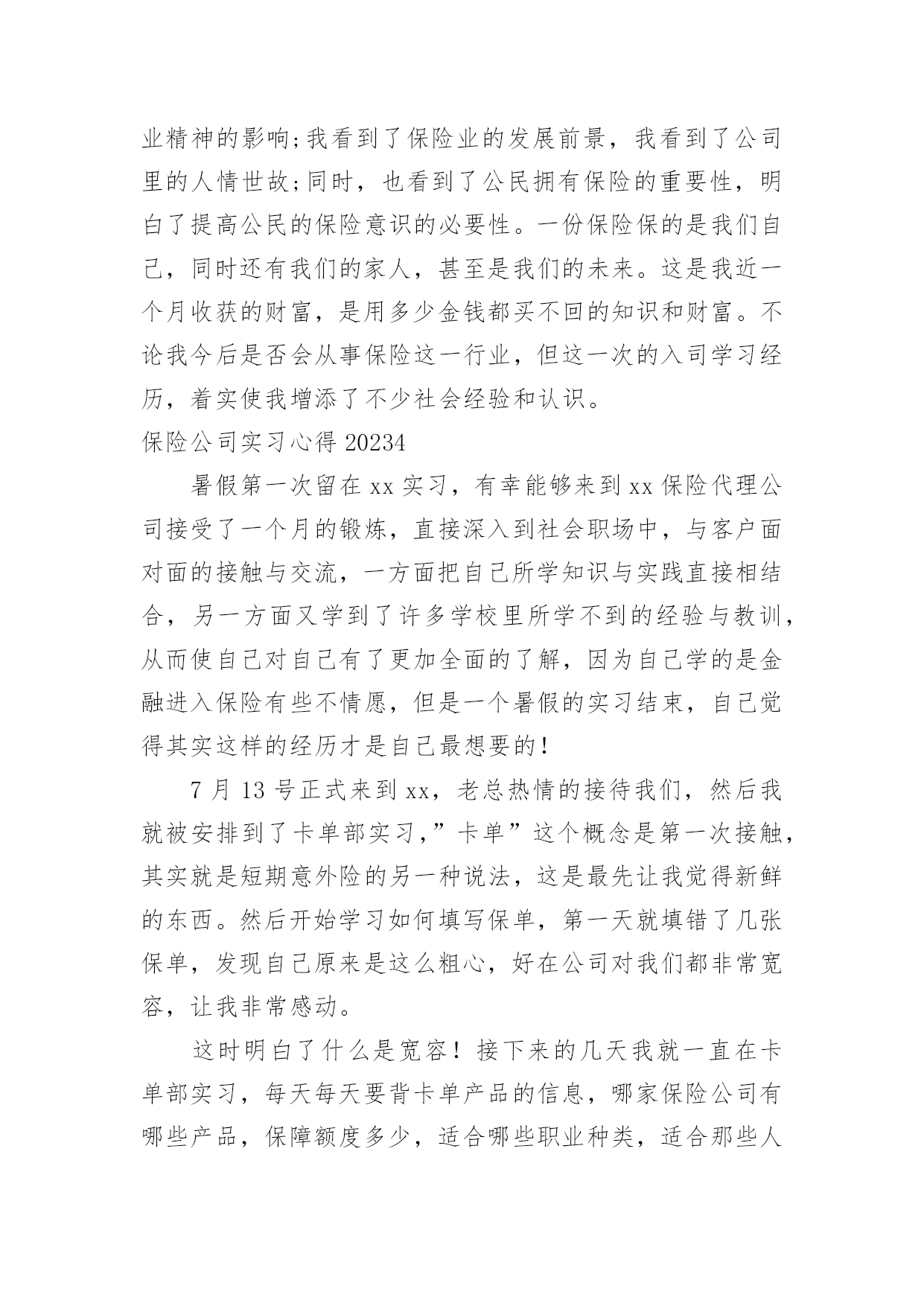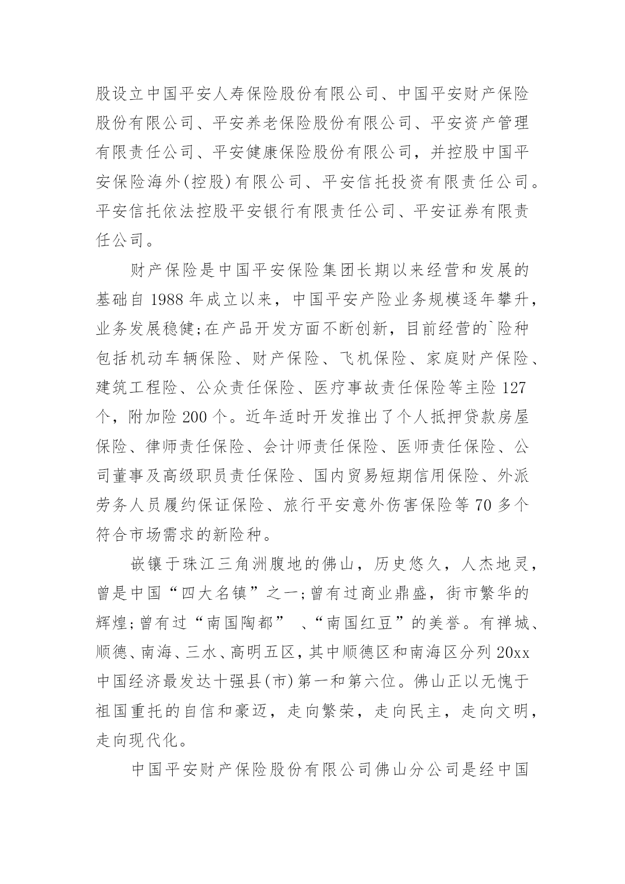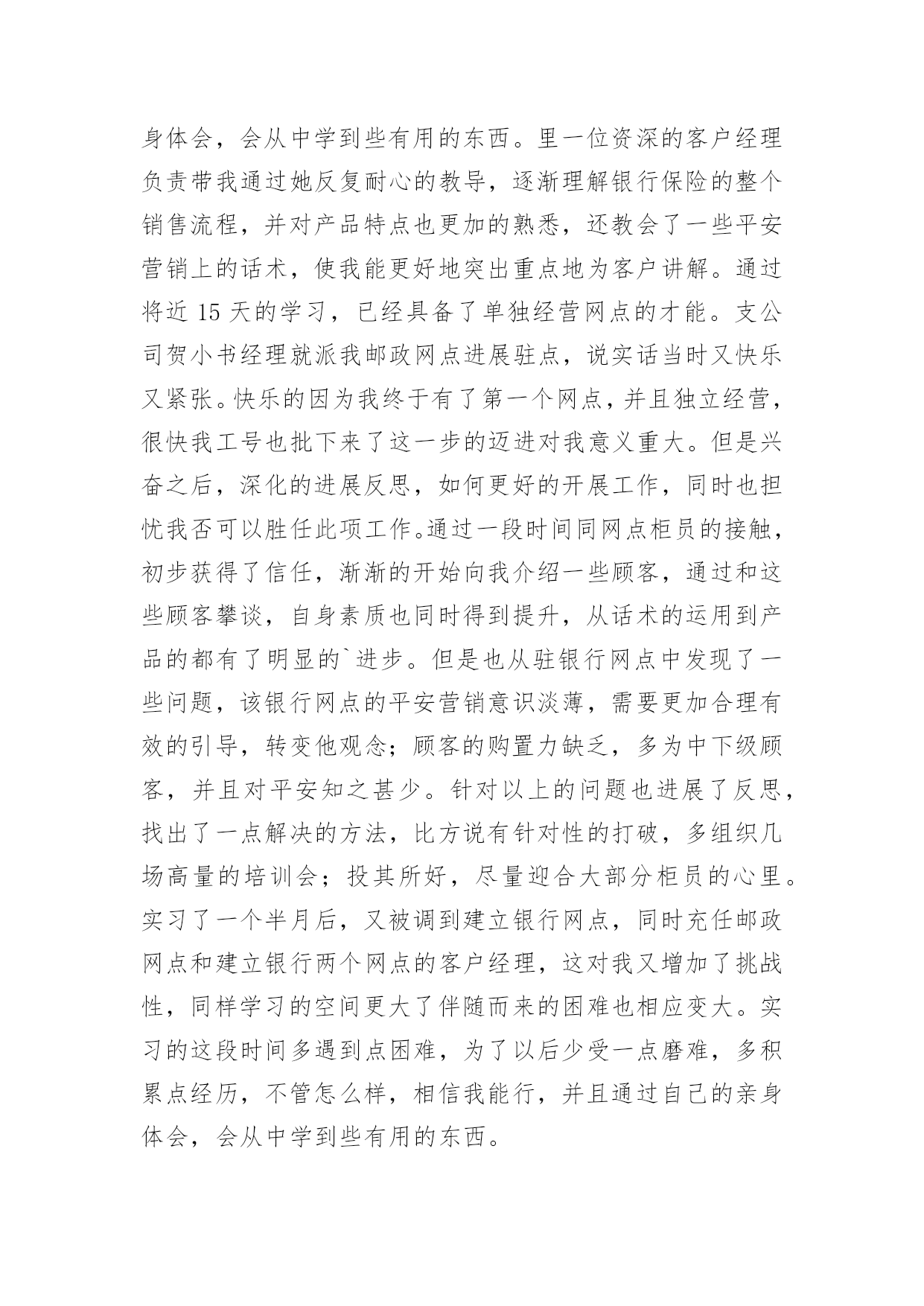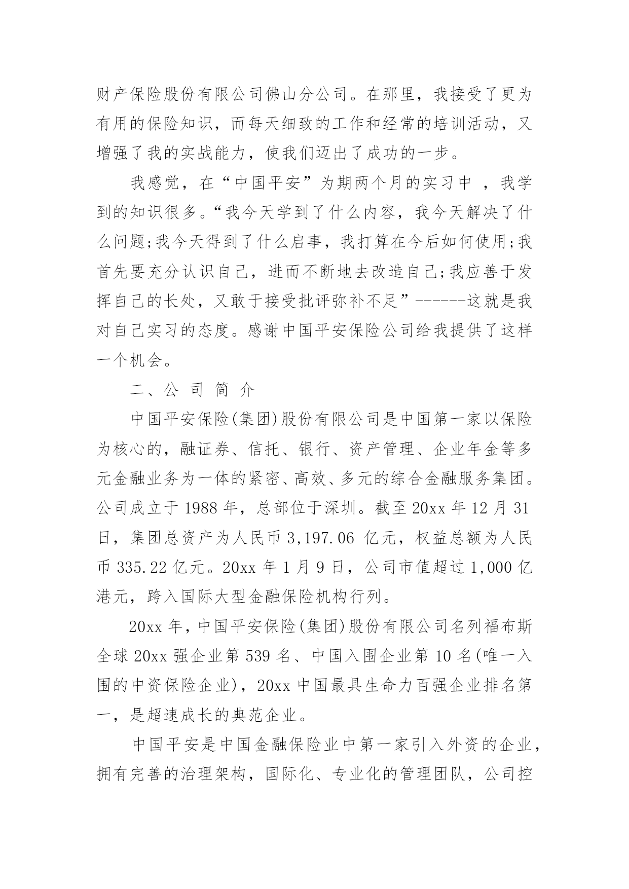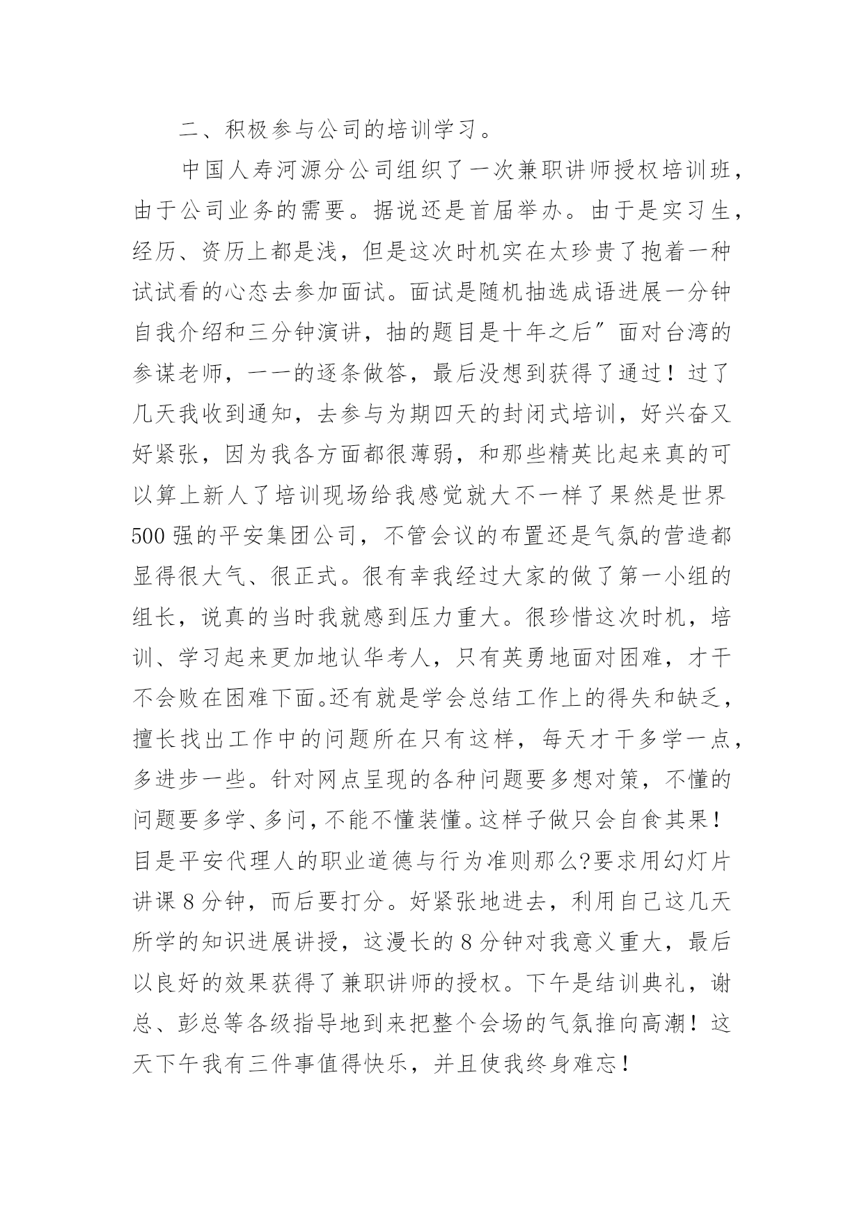 保险公司实习心得保险公司实习心得2023当我们备受启迪时,马上将其记录下来,这样可以不断更新自己的想法。那么好的心得体会都具备一些什么特点呢?下面是小编收集整理的保险公司实习心得2023,希望对大家有所帮助。保险公司实习心得20231一、前言实践是检验真理的惟一标准。在课堂上,我们学习了很多理论知识,但是如果我们在实际当中不能灵活运用,那就等于没有学。实习就是将我们在课堂上学的理论知识运用到实战中,它可以为我们提供了一个了解和熟悉工作实际的机会。只有在实际工作中,我们才可以知道工作到底是怎么一回事、自己更适合做什么、哪些知识是有用的、对自己的知识结构做哪些补充和调整、如何处理工作中的人际关系等等,这将有助于他们更全面地认识自己和了解职业,并据此科学地设计自己的职业生涯。我们怎样才能把课本上的知识灵活恰当的运用到生活、工作当中去,成为对别人对社会有用的人才?我们怎样才能适应当今飞速发展的社会,怎样才能确定自己的人生坐标,实现自己的人生价值呢?抱着这种想法,我走进了中国平安财产保险股份有限公司佛山分公司。在那里,我接受了更为有用的保险知识,而每天细致的工作和经常的培训活动,又增强了我的实战能力,使我们迈出了成功的一步。我感觉,在“中国平安”为期两个月的实习中,我学到的知识很多。“我今天学到了什么内容,我今天解决了什么问题;我今天得到了什么启事,我打算在今后如何使用;我首先要充分认识自己,进而不断地去改造自己;我应善于发挥自己的长处,又敢于接受批评弥补不足”------这就是我对自己实习的态度。感谢中国平安保险公司给我提供了这样一个机会。二、公司简介中国平安保险(集团)股份有限公司是中国第一家以保险为核心的,融证券、信托、银行、资产管理、企业年金等多元金融业务为一体的紧密、高效、多元的综合金融服务集团。公司成立于1988年,总部位于深圳。截至20xx年12月31日,集团总资产为人民币3,197.06亿元,权益总额为人民币335.22亿元。20xx年1月9日,公司市值超过1,000亿港元,跨入国际大型金融保险机构行列。20xx年,中国平安保险(集团)股份有限公司名列福布斯全球20xx强企业第539名、中国入围企业第10名(唯一入围的中资保险企业),20xx中国最具生命力百强企业排名第一,是超速成长的典范企业。中国平安是中国金融保险业中第一家引入外资的企业,拥有完善的治理架构,国际化、专业化的管理团队,公司控股设立中国平安人寿保险股份有限公司、中国平安财产保险股份有限公司、平安养老保险股份有限公司、平安资产管理有限责任公司、平安健康保险股份有限公司,并控股中国平安保险海外(控股)有限公司、平安信托投资有限责任公司。平安信托依法控股平安银行有限责任公司、平安证券有限责任公司。财产保险是中国平安保险集团长期以来经营和发展的基础自1988年成立以来,中国平安产险业务规模逐年攀升,业务发展稳健;在产品开发方面不断创新,目前经营的`险种包括机动车辆保险、财产保险、飞机保险、家庭财产保险、建筑工程险、公众责任保险、医疗事故责任保险等主险127个,附加险200个。近年适时开发推出了个人抵押贷款房屋保险、律师责任保险、会计师责任保险、医师责任保险、公司董事及高级职员责任保险、国内贸易短期信用保险、外派劳务人员履约保证保险、旅行平安意外伤害保险等70多个符合市场需求的新险种。嵌镶于珠江三角洲腹地的佛山,历史悠久,人杰地灵,曾是中国“四大名镇”之一;曾有过商业鼎盛,街市繁华的辉煌;曾有过“南国陶都”、“南国红豆”的美誉。有禅城、顺德、南海、三水、高明五区,其中顺德区和南海区分列20xx中国经济最发达十强县(市)第一和第六位。佛山正以无愧于祖国重托的自信和豪迈,走向繁荣,走向民主,走向文明,走向现代化。中国平安财产保险股份有限公司佛山分公司是经中国保险监督管理委员会批准,由中国平安财产保险股份有限公司作为唯一发起人设立的。20xx年公司三大业务齐头并进,总保费收入达到26000万元,并以18%的市场占有率在佛山产险市场上位列第二。公司业务规模、经营管理、品质、成本等各项指标得到持续改善,在平安系统内均稳居前列。保险公司实习心得20232实习工作就开始了很荣幸能被世界500强的企业—中国人寿平安股份公司河源分公司录取。先做一个自我介绍,当跨出学校的那一刻起。叫杨帆,来自06国际平安班,原国际平安系学生会主席兼学生党支部副书记,家乡是十三朝古都河南洛阳,学校我就是一名追求上进的学生,所以来到中国人寿河源分公司要更加努力,如今岗位是中国人寿河源分公司紫金县支公司银行平安部的一名客户经理。首先要感谢平安学院—母校,给了一个锻炼自我施展才气的舞台,其次要感谢中国人寿河源分公司各级指导对我栽培,现希望能得到批评指正。就把在这里两个多月的工作、生活、思想等方面向学院指