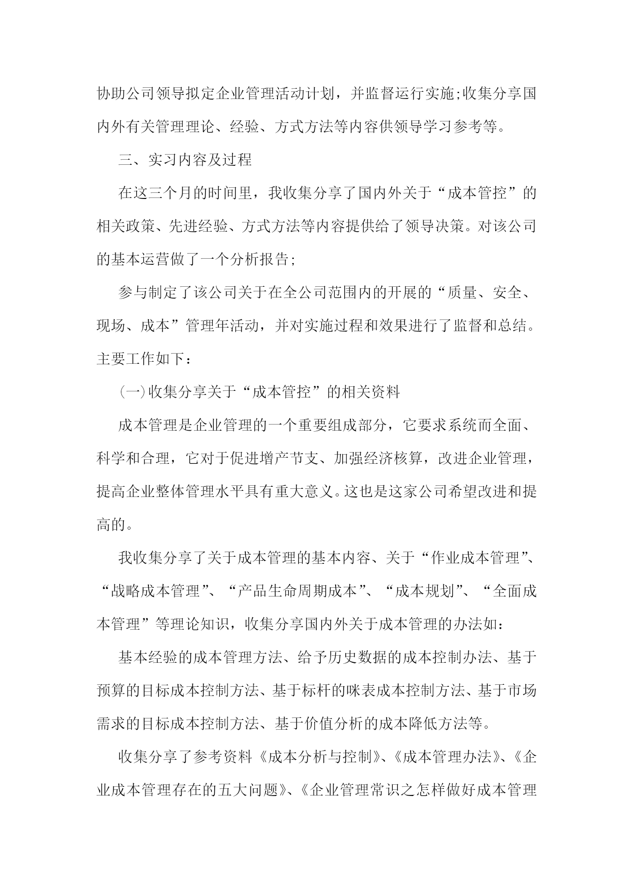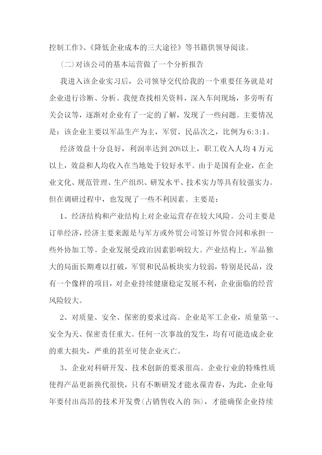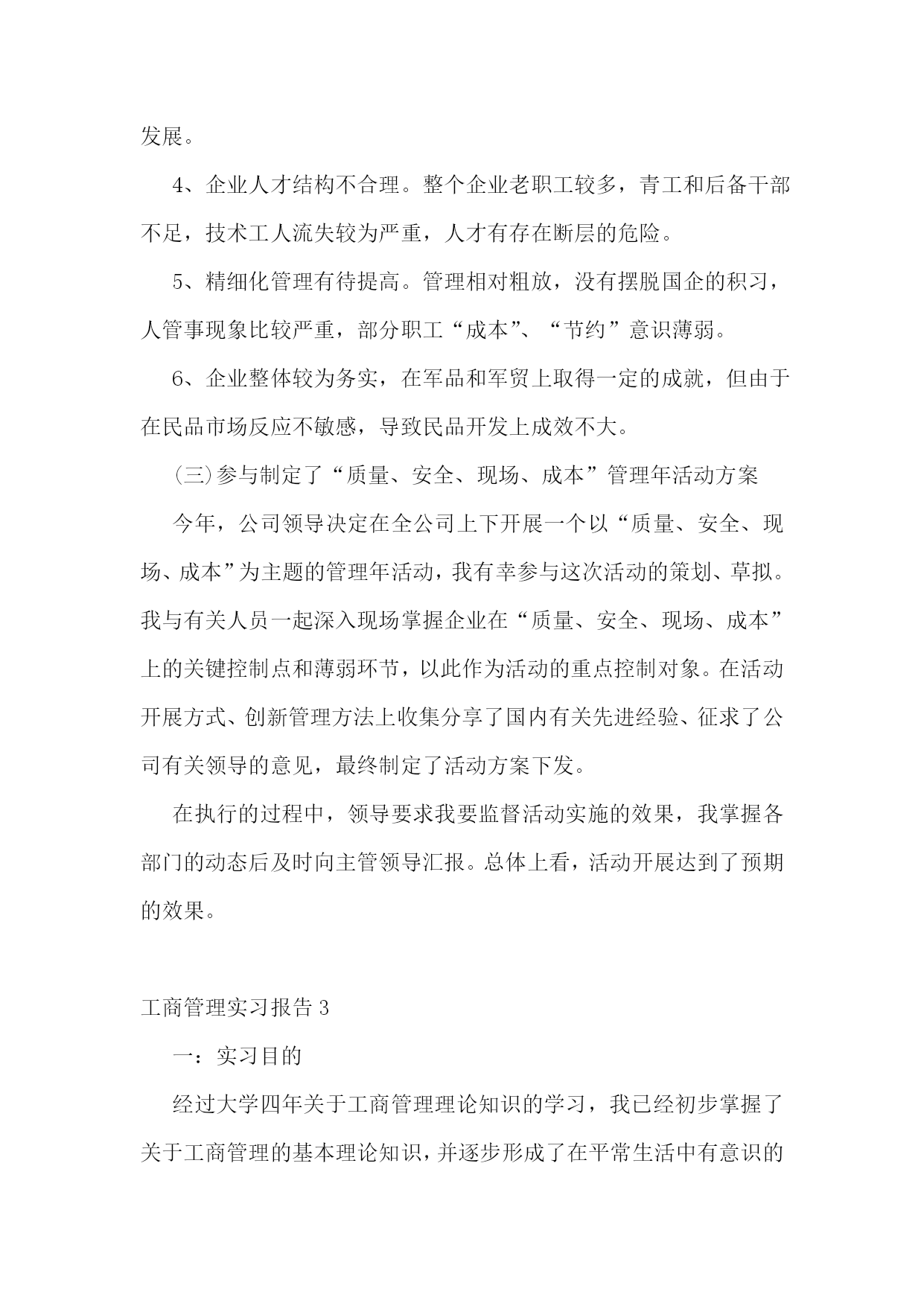工商管理实习报告通用15篇工商管理实习报告2一、实习目的:充实现实生活,丰富社会阅历;锻炼工作能力,掌握社交技能;获取工作经验,感受企业文化;品味人际交往,提高自身修养。二、实习单位及岗位介绍我实习的单位是福建兵工装备有限公司。该公司是国家国防壳工局在福建唯一定点的地方军工企业,隶属于福建省机电(控股)有限责任公司。该企业占地122万平方米,在职职工873人,各类专业技术人员158人。总资产6.4亿元,净资产4.7亿元。拥有一批高、精和大型机械加工及检测设备等共1860台(套),其中数控设备占机加设备总数在20%以上,具备了金切、锻压、冲压、焊接、热处理、表面处理、木材加工和火工产品装配等生产线,生产手段齐全配套,有较强的综合生产能力。目前公司在研和预研项目多达16项,产品的生产和科研涉及炮兵、空军、陆航、防化、工程兵、警用装备等领域,为国防的建设和军队现代化做出一定贡献。经过多年发展,公司基本构建成了以军品为主导,高新技术为支撑,军民结合、内外贸结合、沿海与内地发展结合的新型军工企业。我实习的岗位是公司办公室企业管理助理这个岗位。主要工作是对企业运营的各个环节进行诊断,做好分析报告提供给公司领导决策,协助公司领导拟定企业管理活动计划,并监督运行实施;收集分享国内外有关管理理论、经验、方式方法等内容供领导学习参考等。三、实习内容及过程在这三个月的时间里,我收集分享了国内外关于“成本管控”的相关政策、先进经验、方式方法等内容提供给了领导决策。对该公司的基本运营做了一个分析报告;参与制定了该公司关于在全公司范围内的开展的“质量、安全、现场、成本”管理年活动,并对实施过程和效果进行了监督和总结。主要工作如下:(一)收集分享关于“成本管控”的相关资料成本管理是企业管理的一个重要组成部分,它要求系统而全面、科学和合理,它对于促进增产节支、加强经济核算,改进企业管理,提高企业整体管理水平具有重大意义。这也是这家公司希望改进和提高的。我收集分享了关于成本管理的基本内容、关于“作业成本管理”、“战略成本管理”、“产品生命周期成本”、“成本规划”、“全面成本管理”等理论知识,收集分享国内外关于成本管理的办法如:基本经验的成本管理方法、给予历史数据的成本控制办法、基于预算的目标成本控制方法、基于标杆的咪表成本控制方法、基于市场需求的目标成本控制方法、基于价值分析的成本降低方法等。收集分享了参考资料《成本分析与控制》、《成本管理办法》、《企业成本管理存在的五大问题》、《企业管理常识之怎样做好成本管理控制工作》、《降低企业成本的三大途径》等书籍供领导阅读。(二)对该公司的基本运营做了一个分析报告我进入该企业实习后,公司领导交代给我的一个重要任务就是对企业进行诊断、分析。我便查找相关资料,深入车间现场,多旁听有关会议等,逐渐对企业有了一定的了解,发现了一些问题。主要情况是:该企业主要以军品生产为主,军贸、民品次之,比例为6:3:1。经济效益十分良好,利润率达到20%以上,职工收入人均4万元以上,效益和人均收入在当地处于较好水平。由于是国有企业,在企业文化、规范管理、生产组织、研发水平、技术实力等具有较强实力。但在调研过程中,也发现了一些不利因素。主要是:1、经济结构和产业结构上对企业运营存在较大风险。公司主要是订单经济,经济主要来源是与军方或外贸公司签订外贸合同和承担一些外协加工等。企业发展受政治因素影响较大。产业结构上,军品独大的局面长期难以打破,军贸和民品板块实力较弱,特别是民品,没有一个像样的项目,对企业持续健康稳定发展不利,企业面临的经营风险较大。2、对质量、安全、保密的要求过高。企业是军工企业,质量第一、安全为天、保密责任重大。任何一次事故的发生,均有可能造成企业的重大损失,严重的甚至可使企业灭亡。3、企业对科研开发、技术创新的要求很高。企业行业的特殊性质使得产品更新换代很快,只有不断研发才能永葆青春,为此,企业每年要付出高昂的技术开发费(占销售收入的5%),才能确保企业持续发展。4、企业人才结构不合理。整个企业老职工较多,青工和后备干部不足,技术工人流失较为严重,人才有存在断层的危险。5、精细化管理有待提高。管理相对粗放,没有摆脱国企的积习,人管事现象比较严重,部分职工“成本”、“节约”意识薄弱。6、企业整体较为务实,在军品和军贸上取得一定的成就,但由于在民品市场反应不敏感,导致民品开发上成效不大。(三)参与制定了“质量、安全、现场、成本”管理年活动方案今年,公司领导决定在全公司上下开展一个以“质量、安全、现场、成本”为主题的管理年活动,我有幸参与这次活动的策划、草拟。我与有关人员一起深入现场掌握企业在“质量、安全、现场、成本”上的关键控制点和薄弱环节,以此作为活动的重点控制对象。在活动