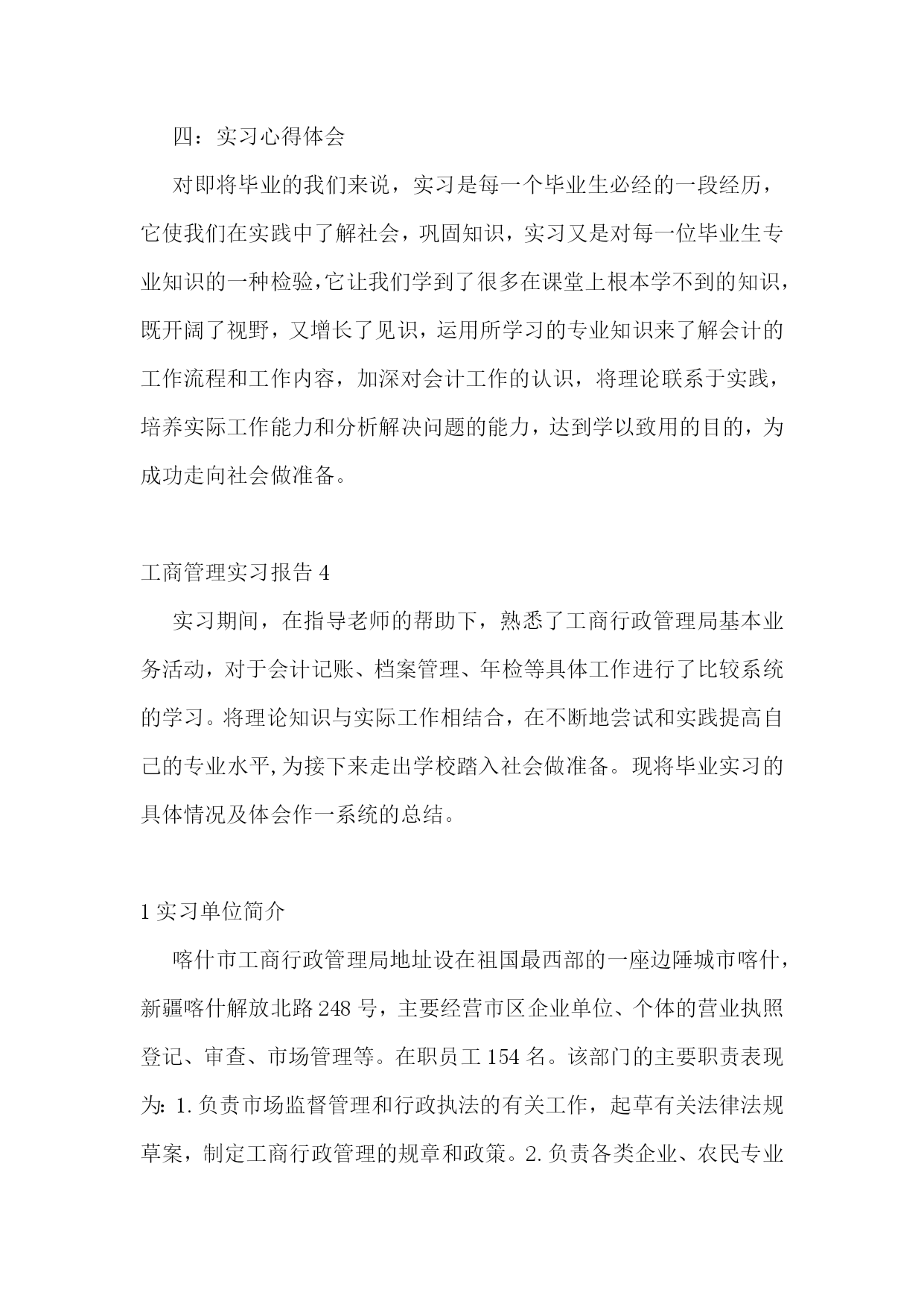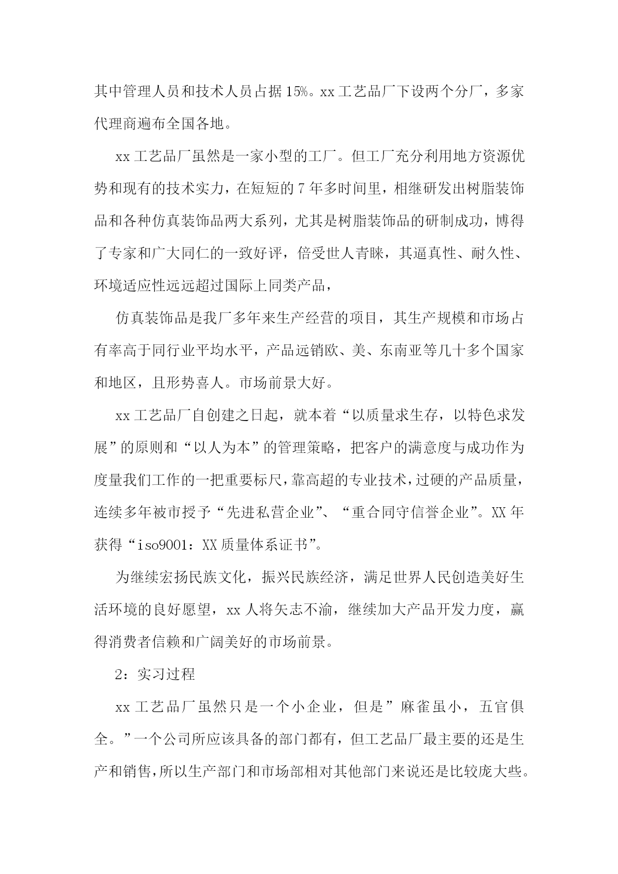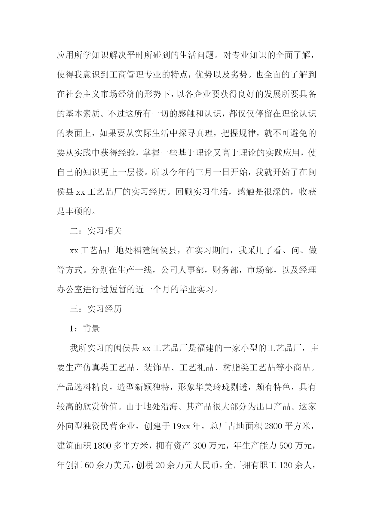 工商管理实习报告通用15篇工商管理实习报告2一、实习目的:充实现实生活,丰富社会阅历;锻炼工作能力,掌握社交技能;获取工作经验,感受企业文化;品味人际交往,提高自身修养。二、实习单位及岗位介绍我实习的单位是福建兵工装备有限公司。该公司是国家国防壳工局在福建唯一定点的地方军工企业,隶属于福建省机电(控股)有限责任公司。该企业占地122万平方米,在职职工873人,各类专业技术人员158人。总资产6.4亿元,净资产4.7亿元。拥有一批高、精和大型机械加工及检测设备等共1860台(套),其中数控设备占机加设备总数在20%以上,具备了金切、锻压、冲压、焊接、热处理、表面处理、木材加工和火工产品装配等生产线,生产手段齐全配套,有较强的综合生产能力。目前公司在研和预研项目多达16项,产品的生产和科研涉及炮兵、空军、陆航、防化、工程兵、警用装备等领域,为国防的建设和军队现代化做出一定贡献。经过多年发展,公司基本构建成了以军品为主导,高新技术为支撑,军民结合、内外贸结合、沿海与内地发展结合的新型军工企业。我实习的岗位是公司办公室企业管理助理这个岗位。主要工作是对企业运营的各个环节进行诊断,做好分析报告提供给公司领导决策,协助公司领导拟定企业管理活动计划,并监督运行实施;收集分享国内外有关管理理论、经验、方式方法等内容供领导学习参考等。三、实习内容及过程在这三个月的时间里,我收集分享了国内外关于“成本管控”的相关政策、先进经验、方式方法等内容提供给了领导决策。对该公司的基本运营做了一个分析报告;参与制定了该公司关于在全公司范围内的开展的“质量、安全、现场、成本”管理年活动,并对实施过程和效果进行了监督和总结。主要工作如下:(一)收集分享关于“成本管控”的相关资料成本管理是企业管理的一个重要组成部分,它要求系统而全面、科学和合理,它对于促进增产节支、加强经济核算,改进企业管理,提高企业整体管理水平具有重大意义。这也是这家公司希望改进和提高的。我收集分享了关于成本管理的基本内容、关于“作业成本管理”、“战略成本管理”、“产品生命周期成本”、“成本规划”、“全面成本管理”等理论知识,收集分享国内外关于成本管理的办法如:基本经验的成本管理方法、给予历史数据的成本控制办法、基于预算的目标成本控制方法、基于标杆的咪表成本控制方法、基于市场需求的目标成本控制方法、基于价值分析的成本降低方法等。收集分享了参考资料《成本分析与控制》、《成本管理办法》、《企业成本管理存在的五大问题》、《企业管理常识之怎样做好成本管理控制工作》、《降低企业成本的三大途径》等书籍供领导阅读。(二)对该公司的基本运营做了一个分析报告我进入该企业实习后,公司领导交代给我的一个重要任务就是对企业进行诊断、分析。我便查找相关资料,深入车间现场,多旁听有关会议等,逐渐对企业有了一定的了解,发现了一些问题。主要情况是:该企业主要以军品生产为主,军贸、民品次之,比例为6:3:1。经济效益十分良好,利润率达到20%以上,职工收入人均4万元以上,效益和人均收入在当地处于较好水平。由于是国有企业,在企业文化、规范管理、生产组织、研发水平、技术实力等具有较强实力。但在调研过程中,也发现了一些不利因素。主要是:1、经济结构和产业结构上对企业运营存在较大风险。公司主要是订单经济,经济主要来源是与军方或外贸公司签订外贸合同和承担一些外协加工等。企业发展受政治因素影响较大。产业结构上,军品独大的局面长期难以打破,军贸和民品板块实力较弱,特别是民品,没有一个像样的项目,对企业持续健康稳定发展不利,企业面临的经营风险较大。2、对质量、安全、保密的要求过高。企业是军工企业,质量第一、安全为天、保密责任重大。任何一次事故的发生,均有可能造成企业的重大损失,严重的甚至可使企业灭亡。3、企业对科研开发、技术创新的要求很高。企业行业的特殊性质使得产品更新换代很快,只有不断研发才能永葆青春,为此,企业每年要付出高昂的技术开发费(占销售收入的5%),才能确保企业持续发展。4、企业人才结构不合理。整个企业老职工较多,青工和后备干部不足,技术工人流失较为严重,人才有存在断层的危险。5、精细化管理有待提高。管理相对粗放,没有摆脱国企的积习,人管事现象比较严重,部分职工“成本”、“节约”意识薄弱。6、企业整体较为务实,在军品和军贸上取得一定的成就,但由于在民品市场反应不敏感,导致民品开发上成效不大。(三)参与制定了“质量、安全、现场、成本”管理年活动方案今年,公司领导决定在全公司上下开展一个以“质量、安全、现场、成本”为主题的管理年活动,我有幸参与这次活动的策划、草拟。我与有关人员一起深入现场掌握企业在“质量、安全、现场、成本”上的关键控制点和薄弱环节,以此作为活动的重点控制对象。在活动