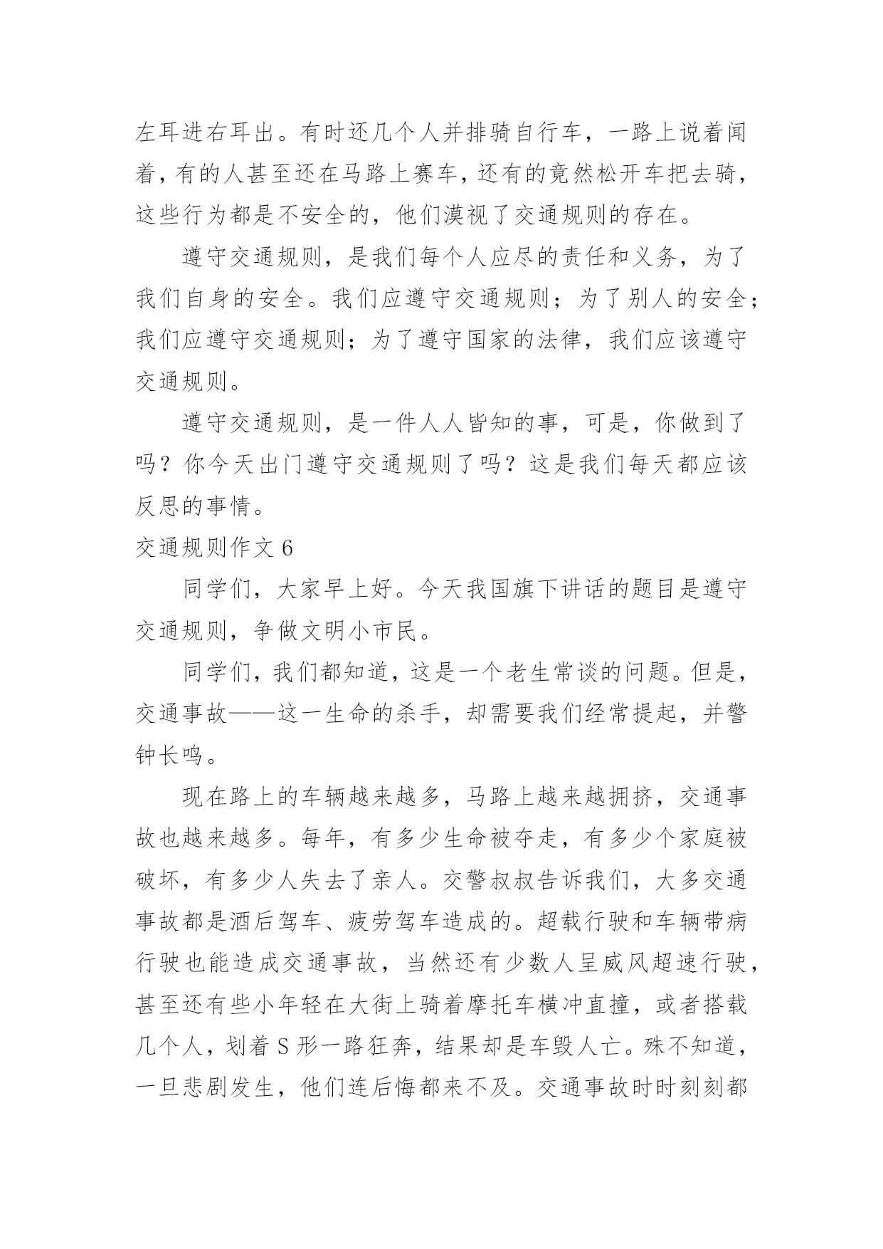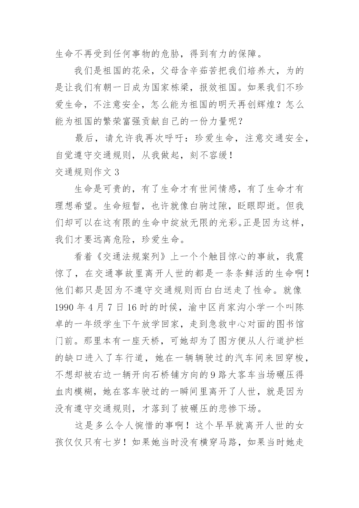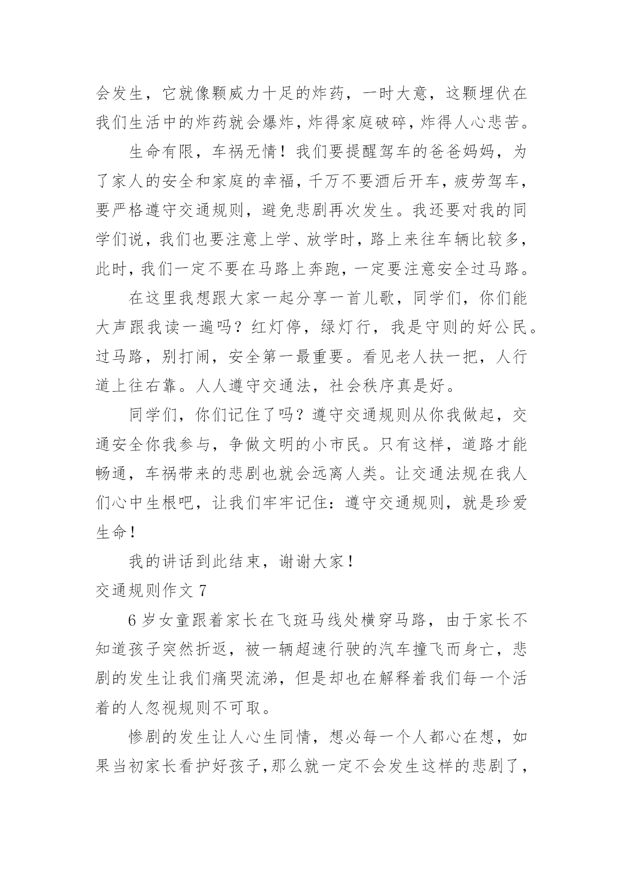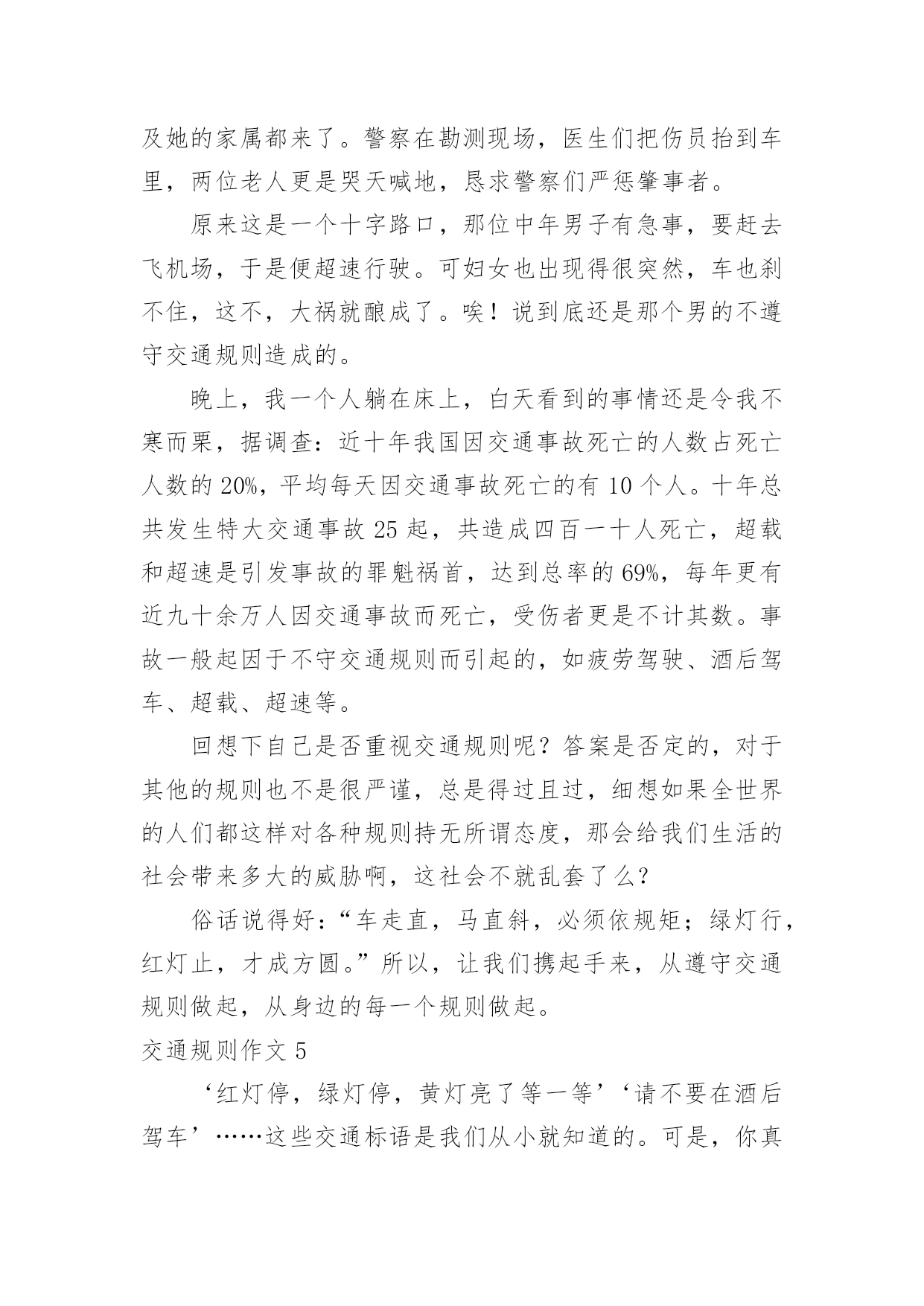 交通规则作文交通规则作文在学习、工作或生活中,大家总少不了接触作文吧,作文是一种言语活动,具有高度的综合性和创造性。你写作文时总是无从下笔?下面是小编为大家整理的交通规则作文,希望能够帮助到大家。交通规则作文1造物主是公平公正的,它给与了每一个人生命;与此同时造物主也是抠门的,生命只只有一次。所以说,大家每一个人都应当好好珍惜,因为它十分的珍贵。一个人的生命,有时会很顽强,宛如石头缝间的小花;有时也是十分的敏感,宛如肥皂泡一样,马上没了。在繁忙的大街上,在欢歌笑语中,在人潮人海中,掩藏着一个恐怖的凶手———交通出行安全隐患。交通出行安全隐患有很多,在其中最强悍的应该是驾驶人员了吧。无照驾驶、超重、车辆超速、危险驾驶、强制高速行驶……一系列绝情的个人行为,对自身的不负责任,对亲人的不负责任,也是对全球的不负责任,这类不负责任的个人行为夺走了一个个新鲜的生命,将一个个期盼存活的生命送到了生命归结为的地区。“路面紧握着我他,安全性系着千家万户”他们说得一点也没有错,不必由于一时的粗心大意、骄纵、莽撞就赌上了她们的生命。交通出行的安全隐患也不仅存有于驾驶人员,路人也存有着不能推脱的义务。中国式家庭横穿马路,这就是不重视生命的主要表现。红灯停、绿灯行,黄灯请等候它是大家都知道的大道理,但是我国又有几个能够保证呢?反躬自省,好像自身都没有搞好。绿灯虽短暂性,人生道路却悠长;信号灯还会继续亮,生命不重新来过。大家应当遵守交通法规,不应该让生命就在此刻停住步伐。我们的梦想还未完成,一秒钟的车祸事故,一辈子的痛楚和缺憾。与其说等候缺憾,还比不上掌握生命。诺贝尔奖以前说过“生命,那就是当然给人们雕刻的晶石。”可证实由于人们的心存侥幸,让一颗颗晶石从此粉碎和殒落。依据数据统计分析,在我国每一年丧生于道路交通事故的总数达到十万人,这是一个多么的恐怖的数据啊!令人看过都不寒而栗。恐怖的马路杀手,什么时候才可以被捕捉?使我们从本身开始做起,一种对自身负责的行为。不坐超载车,搭车时不将手、手臂外伸窗前;横穿马路走人行横道、靠右边行车这些。开车多一份细心,安全性就加十分;十字路口听指挥,安全性就加十分;遵守交通法规,安全性就加一百分。每一个人的生命如同一层很薄的纱,经不住过多的雨打风吹。造物主造就了人,讲一个个独一无二的生命送到了这世界,大家难道说不应该好好珍惜吗?交通规则作文2生命对于我们来说只有一次,一旦失去了,就不会再拥有。我们刚出生时,是一株幼小的站立不稳的芽儿。需要周围的人来保护,随着时间老人的脚步,一点一点地成长,到上学校时。幼稚的心不断成长,内心幼小的世界扩大了。餐风饮露,造就了茁壮结实的臂膀。再也不是温室里的花朵,而是暴风雨中的雄鹰。这时的我们不再需要别人来保护,我们应该学会自我保护。在车水马龙,人潮如流的大街上,发生交通事故就像家常便饭,无视安全存在的人数不胜数。有一天,我走在上学的路上,一上骑自行车的青年引起了我的注意:他双手离开车把,脚下生风地骑车。这时一辆摩托车风驰电掣地奔过来。那个青年惊慌失措。说时迟,那时快。悲惨的事情发生了,双方都撞得鲜血淋漓,惨不忍睹。追究责任,双方都难辞其咎。如果那个青年不逞能。不放开双手,脚下生风地骑车;如果骑摩托车的人,会顾及到他人的安危,为别人和为自己多想一点。也许,这场浩劫就不会发生。无论是谁,都不希望自己发生任何意外。我们应当用这起交通事故来敲响我们安全意识的警钟。在任何情况下,安全永远都排在首位。生命是脆弱的,它不是任由别人主宰,而是把握在自己手里。安全是生命的咽喉,危险则像架在脖子上的一把刀,时时威胁着我们脆弱的生命。因此,我们要有很强的安全意识,要学会自我保护,要自觉遵守交通规则,远离危险,使生命不再受到任何事物的危胁,得到有力的保障。我们是祖国的花朵,父母含辛茹苦把我们培养大,为的是让我们有朝一日成为国家栋梁,报效祖国。如果我们不珍爱生命,不注意安全,怎么能为祖国的明天再创辉煌?怎么能为祖国的繁荣富强贡献自己的一份力量呢?最后,请允许我再次呼吁:珍爱生命,注意交通安全,自觉遵守交通规则,从我做起,刻不容缓!交通规则作文3生命是可贵的,有了生命才有世间情感,有了生命才有理想希望。生命短暂,也许就像白驹过隙,眨眼即逝。但我们却可以在这有限的生命中绽放无限的光彩。正是因为这样,我们才要远离危险,珍爱生命。看着《交通法规案列》上一个个触目惊心的事故,我震惊了,在交通事故里离开人世的都是一条条鲜活的生命啊!他们都只是因为不遵守交通规则而白白送走了性命。就像1990年4月7日16时的时候,渝中区肖家沟小学一个叫陈卓的一年级学生下午放学回家,走到急救中心对面的图书馆门前。那里本有一座天桥,可她却为了图方便从人行道护栏的缺口进入了车行道,她在一辆辆驶过的汽车间来回穿梭,不想却被右边一辆开向石桥铺方向的9