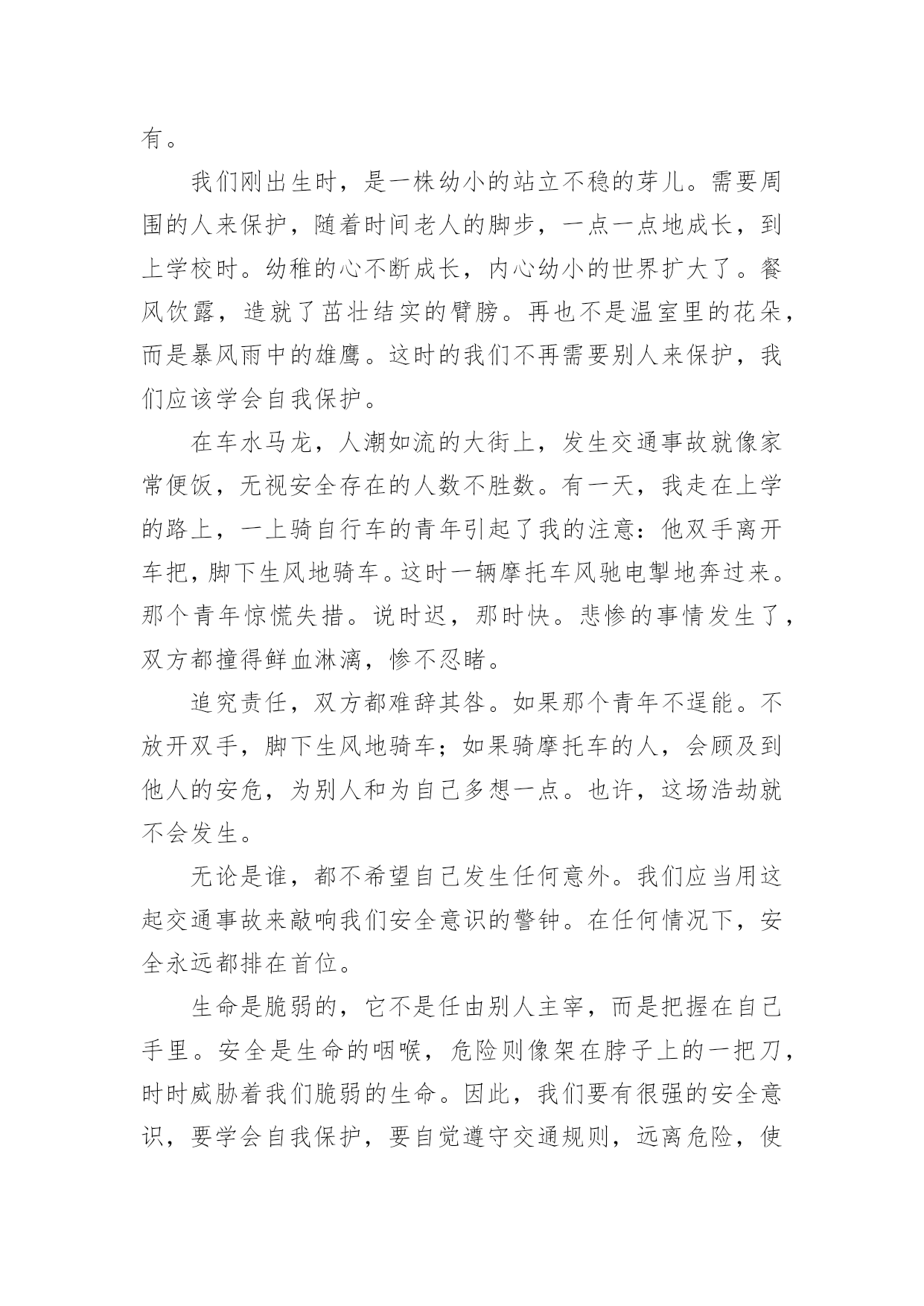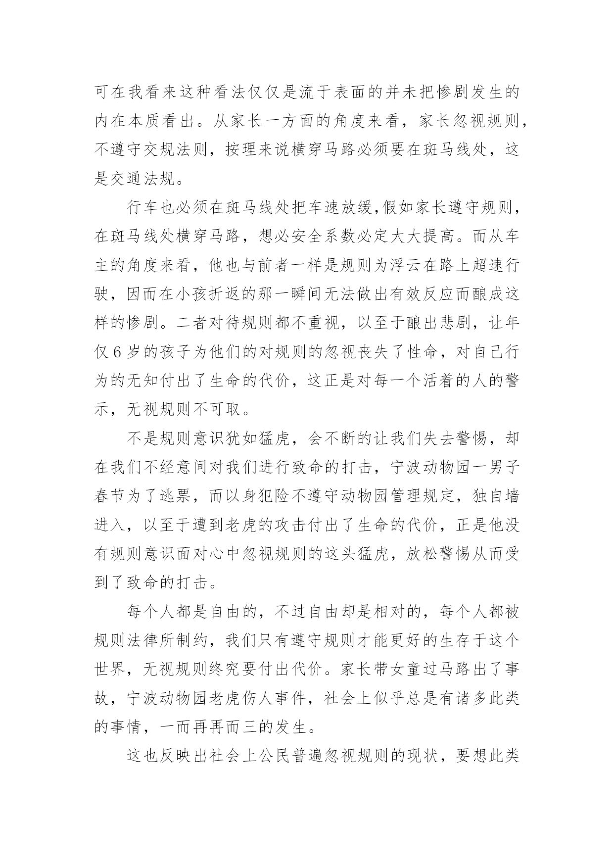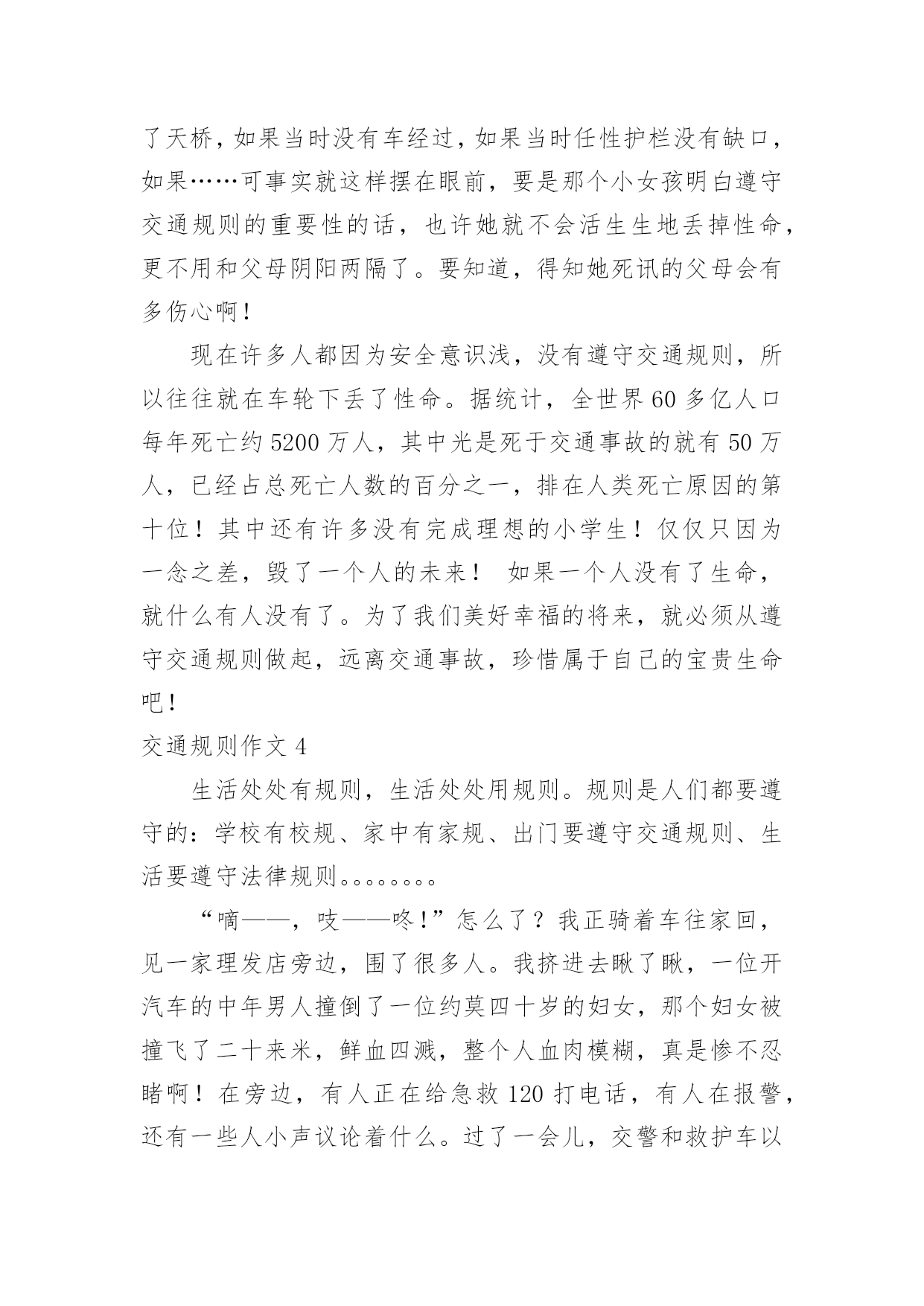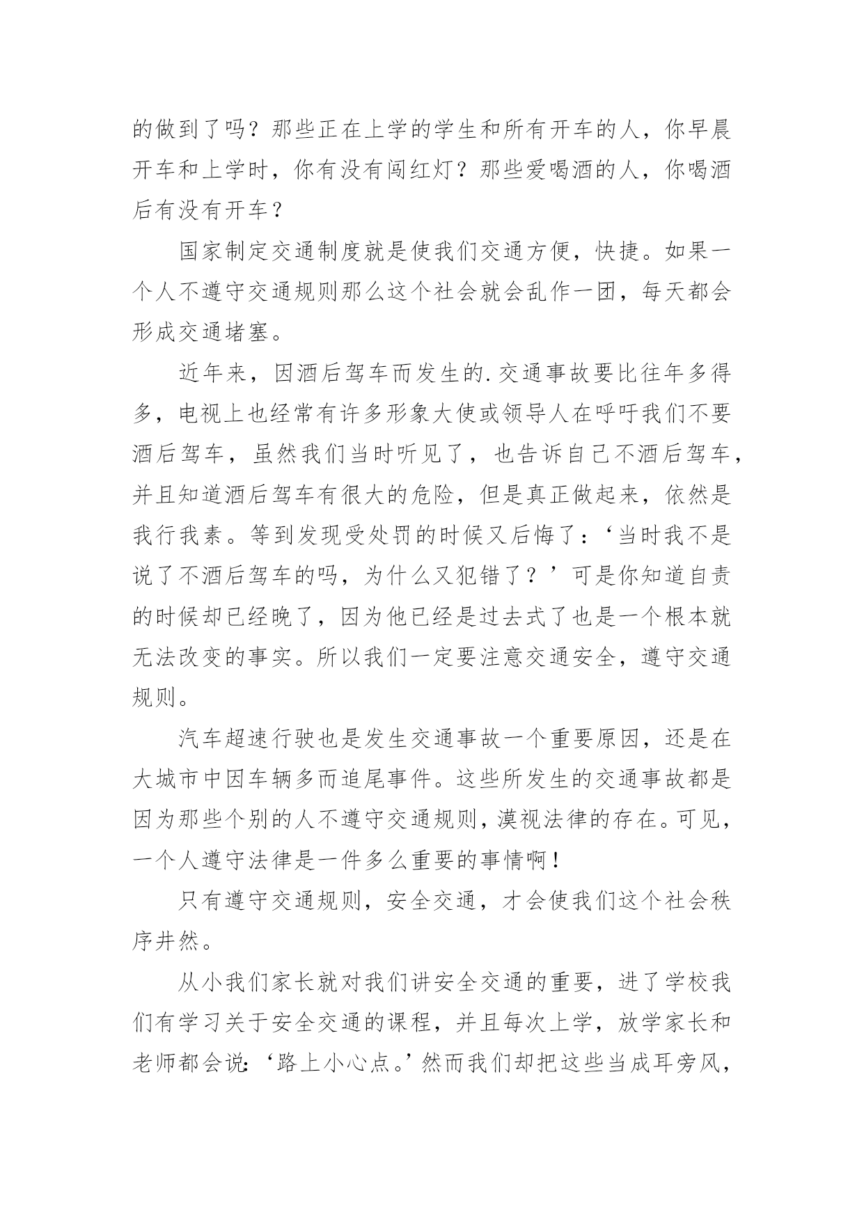 交通规则作文交通规则作文在学习、工作或生活中,大家总少不了接触作文吧,作文是一种言语活动,具有高度的综合性和创造性。你写作文时总是无从下笔?下面是小编为大家整理的交通规则作文,希望能够帮助到大家。交通规则作文1造物主是公平公正的,它给与了每一个人生命;与此同时造物主也是抠门的,生命只只有一次。所以说,大家每一个人都应当好好珍惜,因为它十分的珍贵。一个人的生命,有时会很顽强,宛如石头缝间的小花;有时也是十分的敏感,宛如肥皂泡一样,马上没了。在繁忙的大街上,在欢歌笑语中,在人潮人海中,掩藏着一个恐怖的凶手———交通出行安全隐患。交通出行安全隐患有很多,在其中最强悍的应该是驾驶人员了吧。无照驾驶、超重、车辆超速、危险驾驶、强制高速行驶……一系列绝情的个人行为,对自身的不负责任,对亲人的不负责任,也是对全球的不负责任,这类不负责任的个人行为夺走了一个个新鲜的生命,将一个个期盼存活的生命送到了生命归结为的地区。“路面紧握着我他,安全性系着千家万户”他们说得一点也没有错,不必由于一时的粗心大意、骄纵、莽撞就赌上了她们的生命。交通出行的安全隐患也不仅存有于驾驶人员,路人也存有着不能推脱的义务。中国式家庭横穿马路,这就是不重视生命的主要表现。红灯停、绿灯行,黄灯请等候它是大家都知道的大道理,但是我国又有几个能够保证呢?反躬自省,好像自身都没有搞好。绿灯虽短暂性,人生道路却悠长;信号灯还会继续亮,生命不重新来过。大家应当遵守交通法规,不应该让生命就在此刻停住步伐。我们的梦想还未完成,一秒钟的车祸事故,一辈子的痛楚和缺憾。与其说等候缺憾,还比不上掌握生命。诺贝尔奖以前说过“生命,那就是当然给人们雕刻的晶石。”可证实由于人们的心存侥幸,让一颗颗晶石从此粉碎和殒落。依据数据统计分析,在我国每一年丧生于道路交通事故的总数达到十万人,这是一个多么的恐怖的数据啊!令人看过都不寒而栗。恐怖的马路杀手,什么时候才可以被捕捉?使我们从本身开始做起,一种对自身负责的行为。不坐超载车,搭车时不将手、手臂外伸窗前;横穿马路走人行横道、靠右边行车这些。开车多一份细心,安全性就加十分;十字路口听指挥,安全性就加十分;遵守交通法规,安全性就加一百分。每一个人的生命如同一层很薄的纱,经不住过多的雨打风吹。造物主造就了人,讲一个个独一无二的生命送到了这世界,大家难道说不应该好好珍惜吗?交通规则作文2生命对于我们来说只有一次,一旦失去了,就不会再拥有。我们刚出生时,是一株幼小的站立不稳的芽儿。需要周围的人来保护,随着时间老人的脚步,一点一点地成长,到上学校时。幼稚的心不断成长,内心幼小的世界扩大了。餐风饮露,造就了茁壮结实的臂膀。再也不是温室里的花朵,而是暴风雨中的雄鹰。这时的我们不再需要别人来保护,我们应该学会自我保护。在车水马龙,人潮如流的大街上,发生交通事故就像家常便饭,无视安全存在的人数不胜数。有一天,我走在上学的路上,一上骑自行车的青年引起了我的注意:他双手离开车把,脚下生风地骑车。这时一辆摩托车风驰电掣地奔过来。那个青年惊慌失措。说时迟,那时快。悲惨的事情发生了,双方都撞得鲜血淋漓,惨不忍睹。追究责任,双方都难辞其咎。如果那个青年不逞能。不放开双手,脚下生风地骑车;如果骑摩托车的人,会顾及到他人的安危,为别人和为自己多想一点。也许,这场浩劫就不会发生。无论是谁,都不希望自己发生任何意外。我们应当用这起交通事故来敲响我们安全意识的警钟。在任何情况下,安全永远都排在首位。生命是脆弱的,它不是任由别人主宰,而是把握在自己手里。安全是生命的咽喉,危险则像架在脖子上的一把刀,时时威胁着我们脆弱的生命。因此,我们要有很强的安全意识,要学会自我保护,要自觉遵守交通规则,远离危险,使生命不再受到任何事物的危胁,得到有力的保障。我们是祖国的花朵,父母含辛茹苦把我们培养大,为的是让我们有朝一日成为国家栋梁,报效祖国。如果我们不珍爱生命,不注意安全,怎么能为祖国的明天再创辉煌?怎么能为祖国的繁荣富强贡献自己的一份力量呢?最后,请允许我再次呼吁:珍爱生命,注意交通安全,自觉遵守交通规则,从我做起,刻不容缓!交通规则作文3生命是可贵的,有了生命才有世间情感,有了生命才有理想希望。生命短暂,也许就像白驹过隙,眨眼即逝。但我们却可以在这有限的生命中绽放无限的光彩。正是因为这样,我们才要远离危险,珍爱生命。看着《交通法规案列》上一个个触目惊心的事故,我震惊了,在交通事故里离开人世的都是一条条鲜活的生命啊!他们都只是因为不遵守交通规则而白白送走了性命。就像1990年4月7日16时的时候,渝中区肖家沟小学一个叫陈卓的一年级学生下午放学回家,走到急救中心对面的图书馆门前。那里本有一座天桥,可她却为了图方便从人行道护栏的缺口进入了车行道,她在一辆辆驶过的汽车间来回穿梭,不想却被右边一辆开向石桥铺方向的9