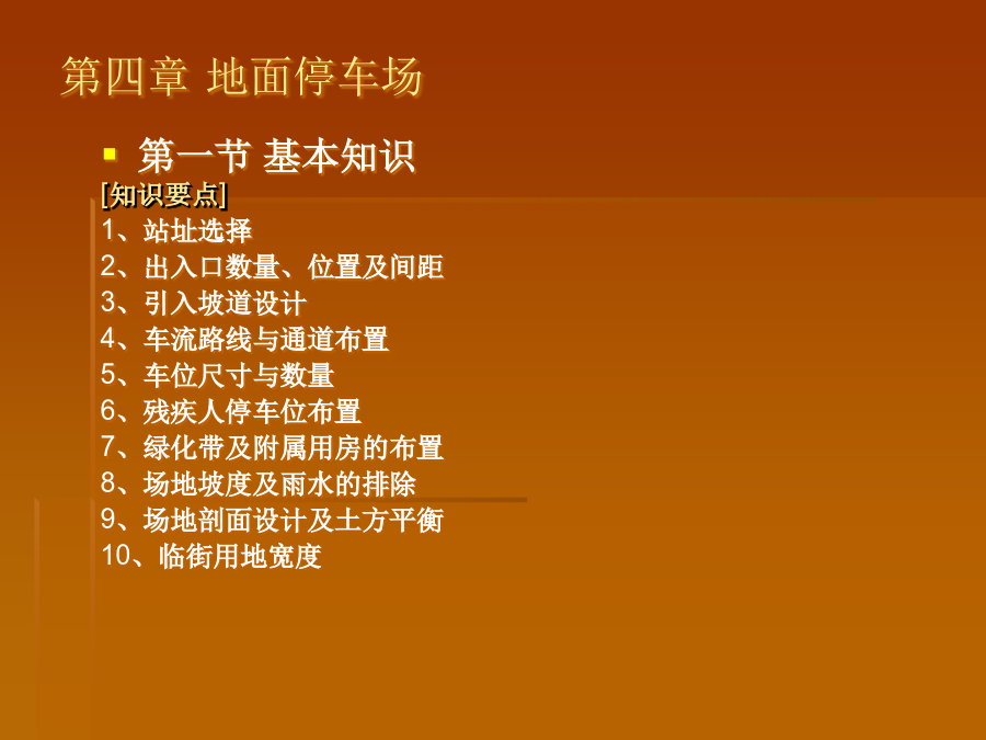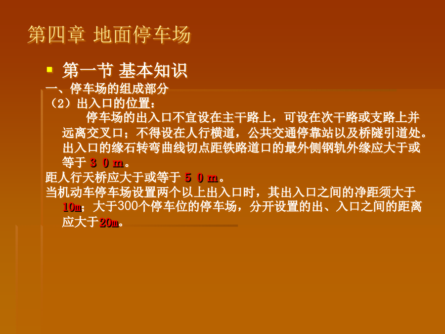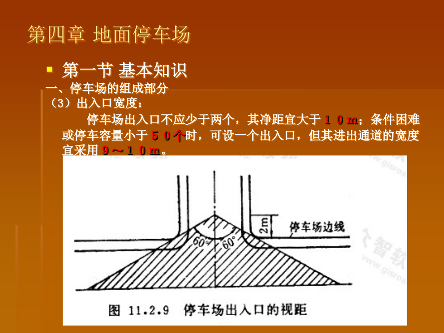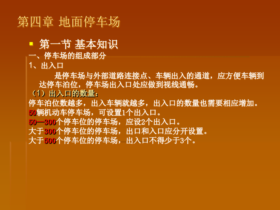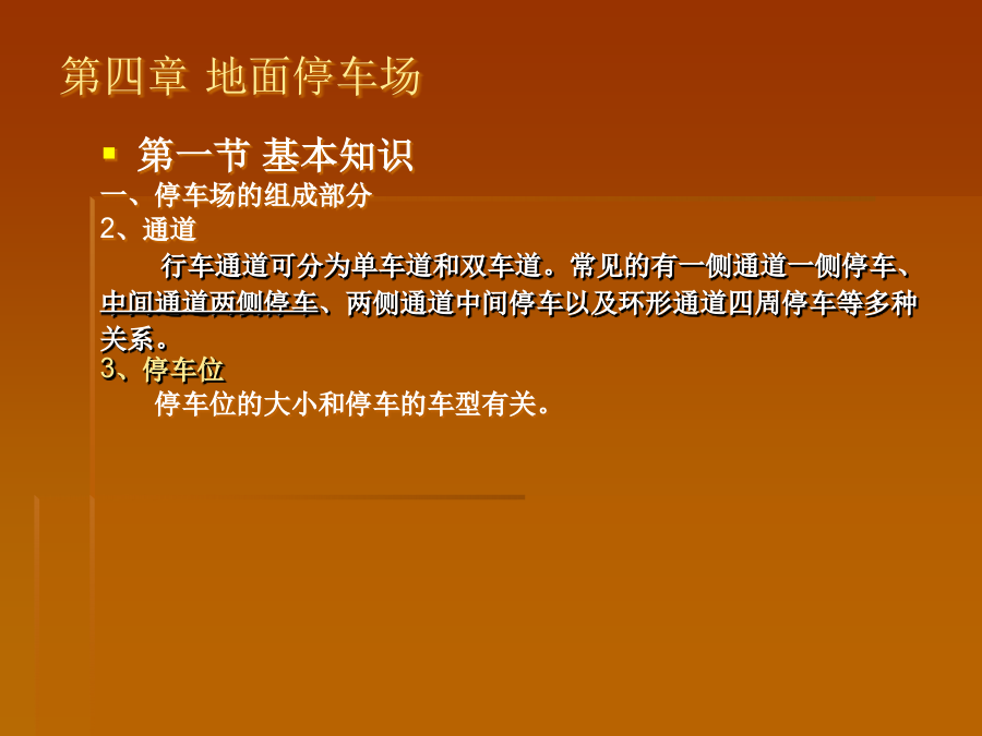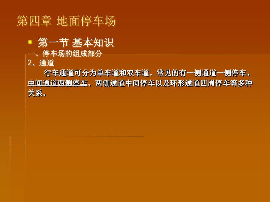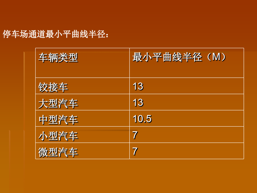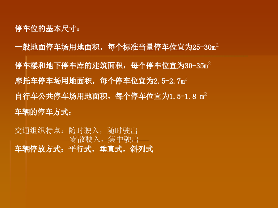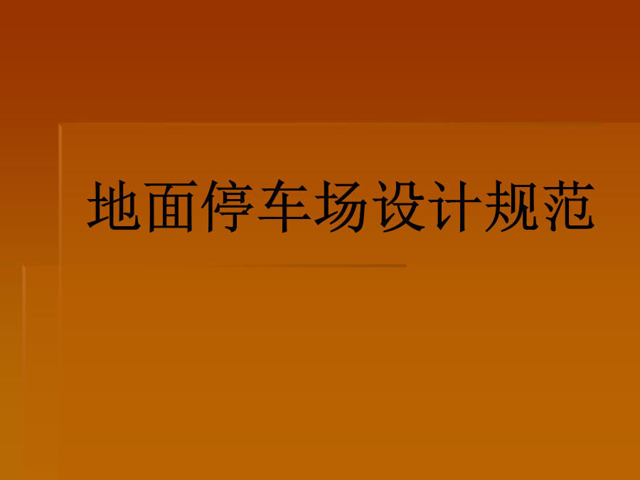 地面停车场设计规范第四章地面停车场第四章地面停车场第四章地面停车场第四章地面停车场第四章地面停车场车辆类型第四章地面停车场车辆类型及基本尺寸:停车位的基本尺寸:一般地面停车场用地面积,每个标准当量停车位宜为25-30m2.停车楼和地下停车库的建筑面积,每个停车位宜为30-35m2摩托车停车场用地面积,每个停车位宜为2.5-2.7m2自行车公共停车场用地面积,每个停车位宜为1.5-1.8m2车辆停驶方式:第四章地面停车场第四章地面停车场第四章地面停车场第四章地面停车场