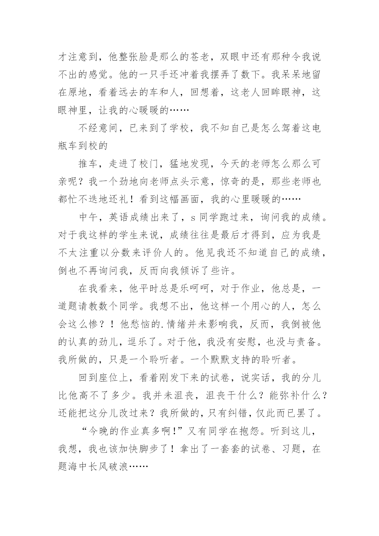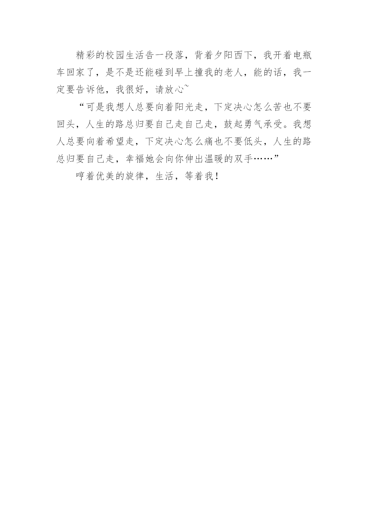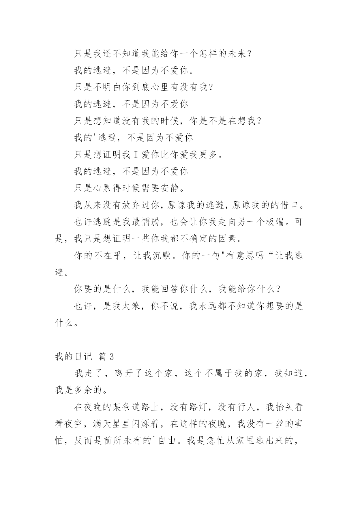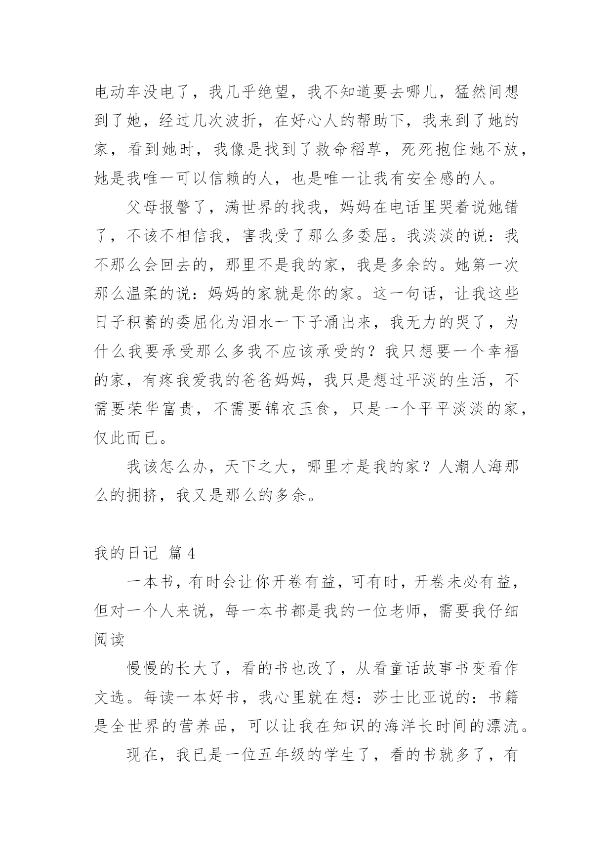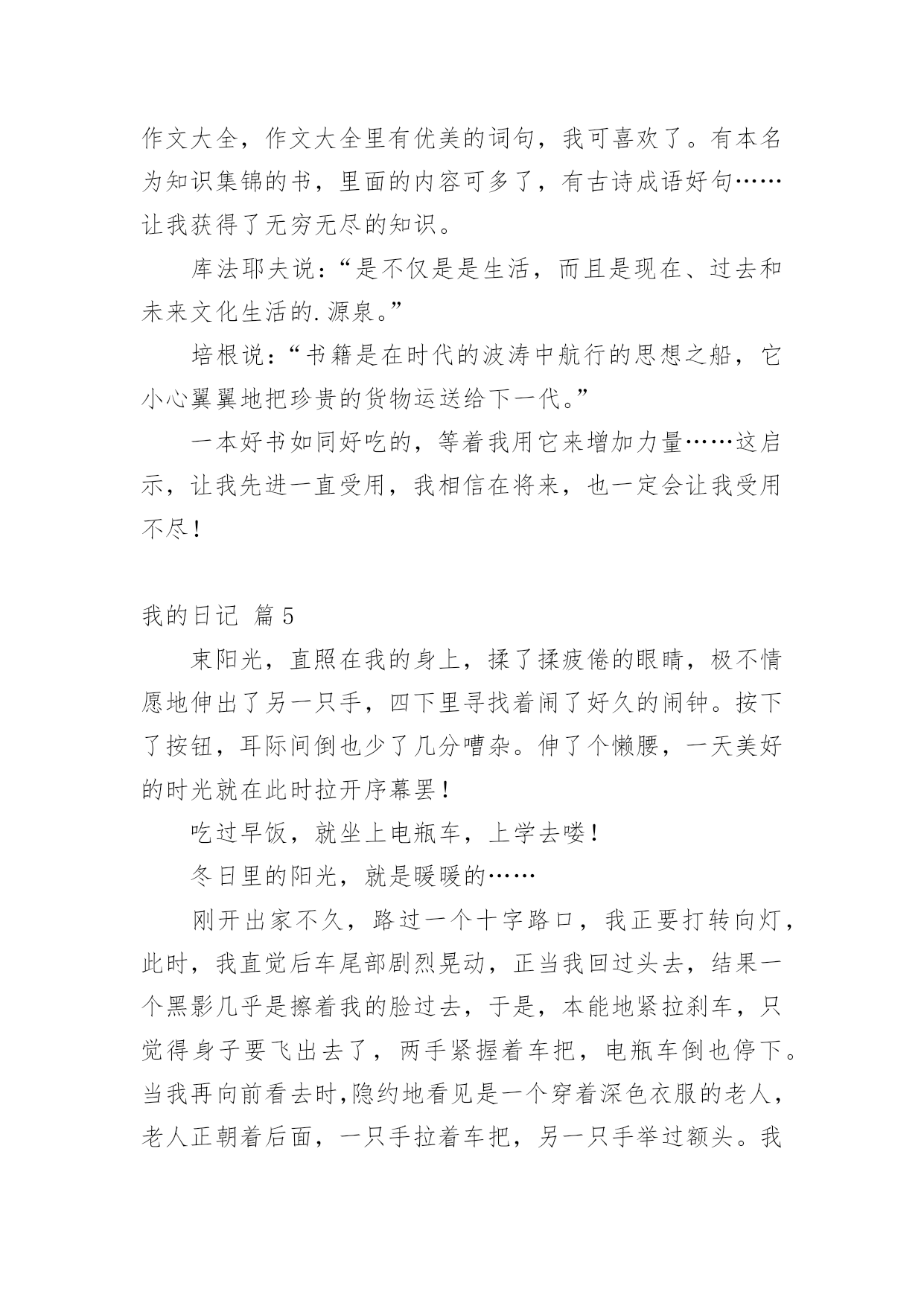 我的日记忙碌而又充实的一天又过去了,我们对人和事情也有了新的看法,不如趁现在好好写一篇日记。那么你真的懂得怎么写日记吗?以下是小编为大家收集的我的日记5篇,仅供参考,希望能够帮助到大家。我的日记篇120xx年12月2日星期天晴今天一大早,爸爸和妈妈就来我房间说:“生日快乐!”我说:“谢谢!”爸爸一会儿就走了,因为他要上班。一会儿我姥姥和姥爷就来了,还给我带来了好多好吃的,我非常高兴。然后是爷爷奶奶、爸爸和姑姑还有我的'弟弟,都来我家,给我过生日,别提我有多开心了!吃饭的时候我给大家分蛋糕,我吃的很开心,吃完饭后他们就都走了,我只好和妈妈在家一起睡觉,睡觉醒来,和妈妈在被窝里高兴的玩了起来,今天好开心啊,也祝我自己生日快乐!我的日记篇2我的逃避,不是因为不爱你。只是我还不清楚我们要的是什么?我的逃避,不是因为不爱你。只是我想知道我在你心里扮演着什么样的角色?我的逃避,不是因为不爱你。只是我还不知道我能给你一个怎样的未来?我的逃避,不是因为不爱你。只是不明白你到底心里有没有我?我的逃避,不是因为不爱你只是想知道没有我的时候,你是不是在想我?我的'逃避,不是因为不爱你只是想证明我I爱你比你爱我更多。我的逃避,不是因为不爱你只是心累得时候需要安静。我从来没有放弃过你,原谅我的逃避,原谅我的的借口。也许逃避是我最懦弱,也会让你我走向另一个极端。可是,我只是想证明一些你我都不确定的因素。你的不在乎,让我沉默。你的一句"有意思吗“让我逃避。你要的是什么,我能回答你什么,我能给你什么?也许,是我太笨,你不说,我永远都不知道你想要的是什么。我的日记篇3我走了,离开了这个家,这个不属于我的家,我知道,我是多余的。在夜晚的某条道路上,没有路灯,没有行人,我抬头看看夜空,满天星星闪烁着,在这样的夜晚,我没有一丝的害怕,反而是前所未有的`自由。我是急忙从家里逃出来的,电动车没电了,我几乎绝望,我不知道要去哪儿,猛然间想到了她,经过几次波折,在好心人的帮助下,我来到了她的家,看到她时,我像是找到了救命稻草,死死抱住她不放,她是我唯一可以信赖的人,也是唯一让我有安全感的人。父母报警了,满世界的找我,妈妈在电话里哭着说她错了,不该不相信我,害我受了那么多委屈。我淡淡的说:我不那么会回去的,那里不是我的家,我是多余的。她第一次那么温柔的说:妈妈的家就是你的家。这一句话,让我这些日子积蓄的委屈化为泪水一下子涌出来,我无力的哭了,为什么我要承受那么多我不应该承受的?我只想要一个幸福的家,有疼我爱我的爸爸妈妈,我只是想过平淡的生活,不需要荣华富贵,不需要锦衣玉食,只是一个平平淡淡的家,仅此而已。我该怎么办,天下之大,哪里才是我的家?人潮人海那么的拥挤,我又是那么的多余。我的日记篇4一本书,有时会让你开卷有益,可有时,开卷未必有益,但对一个人来说,每一本书都是我的一位老师,需要我仔细阅读慢慢的长大了,看的书也改了,从看童话故事书变看作文选。每读一本好书,我心里就在想:莎士比亚说的:书籍是全世界的营养品,可以让我在知识的海洋长时间的漂流。现在,我已是一位五年级的学生了,看的书就多了,有作文大全,作文大全里有优美的词句,我可喜欢了。有本名为知识集锦的书,里面的内容可多了,有古诗成语好句……让我获得了无穷无尽的知识。库法耶夫说:“是不仅是是生活,而且是现在、过去和未来文化生活的.源泉。”培根说:“书籍是在时代的波涛中航行的思想之船,它小心翼翼地把珍贵的货物运送给下一代。”一本好书如同好吃的,等着我用它来增加力量……这启示,让我先进一直受用,我相信在将来,也一定会让我受用不尽!我的日记篇5束阳光,直照在我的身上,揉了揉疲倦的眼睛,极不情愿地伸出了另一只手,四下里寻找着闹了好久的闹钟。按下了按钮,耳际间倒也少了几分嘈杂。伸了个懒腰,一天美好的时光就在此时拉开序幕罢!吃过早饭,就坐上电瓶车,上学去喽!冬日里的阳光,就是暖暖的……刚开出家不久,路过一个十字路口,我正要打转向灯,此时,我直觉后车尾部剧烈晃动,正当我回过头去,结果一个黑影几乎是擦着我的脸过去,于是,本能地紧拉刹车,只觉得身子要飞出去了,两手紧握着车把,电瓶车倒也停下。当我再向前看去时,隐约地看见是一个穿着深色衣服的老人,老人正朝着后面,一只手拉着车把,另一只手举过额头。我才注意到,他整张脸是那么的苍老,双眼中还有那种令我说不出的感觉。他的一只手还冲着我摆弄了数下。我呆呆地留在原地,看着远去的车和人,回想着,这老人回眸眼神,这眼神里,让我的心暖暖的……不经意间,已来到了学校,我不知自己是怎么驾着这电瓶车到校的推车,走进了校门,猛地发现,今天的老师怎么那么可亲呢?我一个劲地向老师点头示意,惊奇的是,那些老师也都忙不迭地还礼!看到这幅画面,我的心里暖暖的……中午,英语成绩出来了,s同学跑过来,询问我的成绩。对于我这样的学
