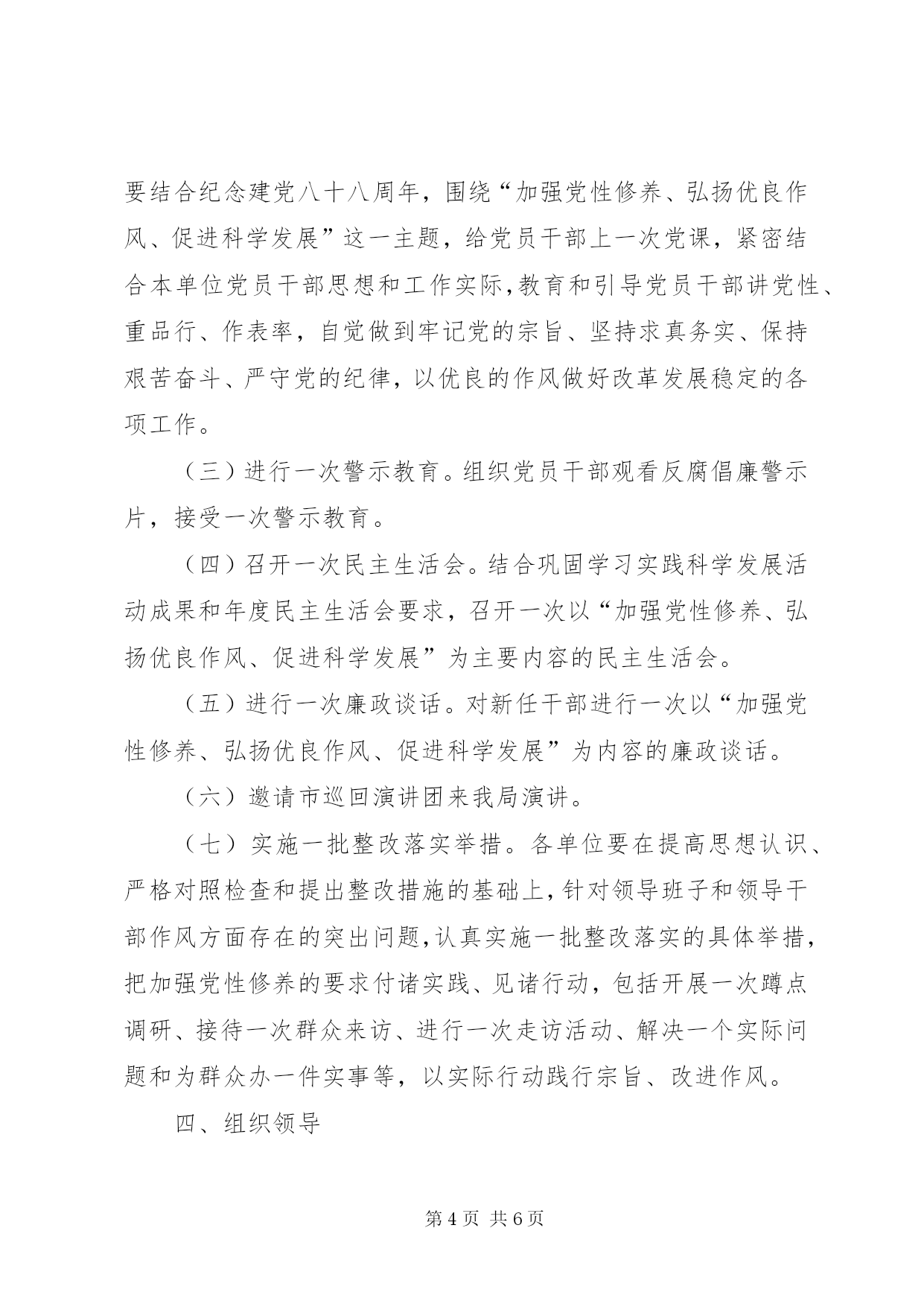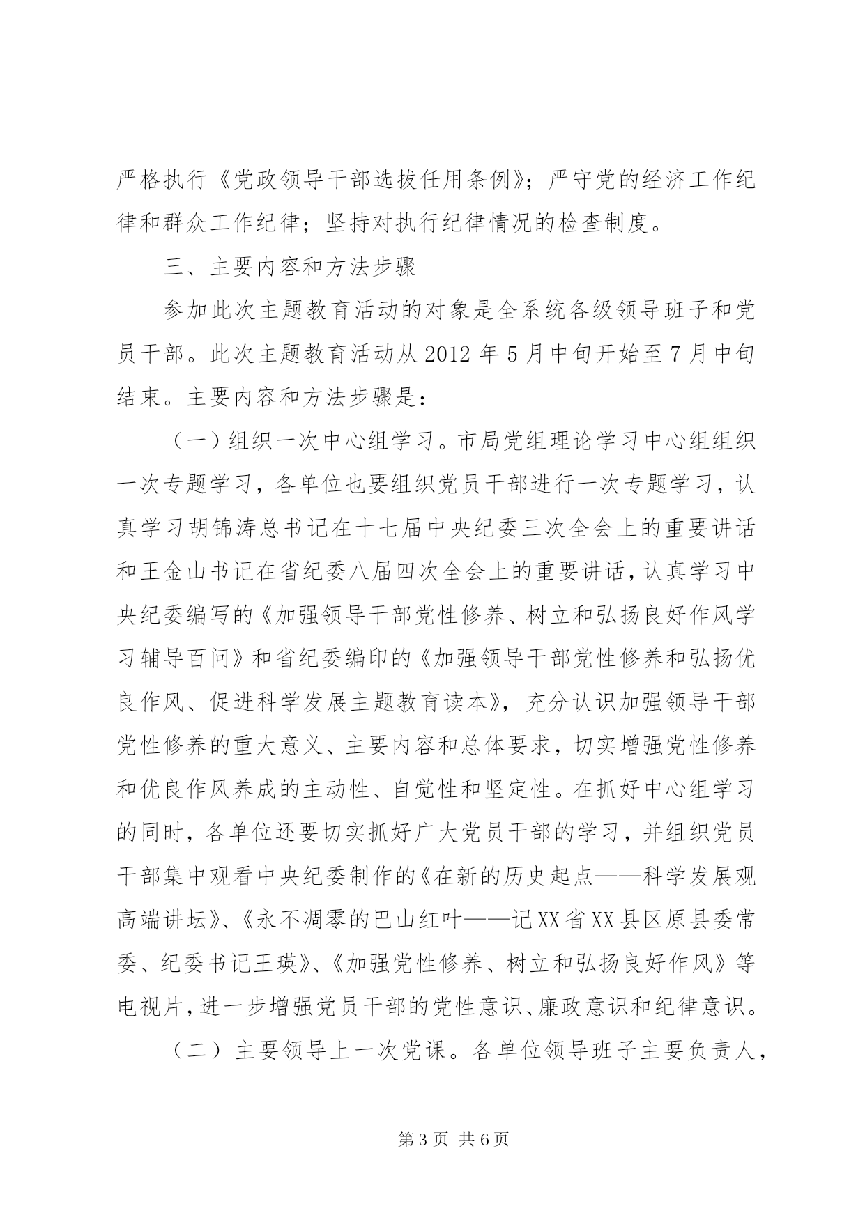 第PAGE\*Arabic\*MERGEFORMAT6页共NUMPAGES\*MERGEFORMAT6页工商系统党性修养实施方案为深入学习贯彻胡锦涛总书记在十七届中央纪委三次全会上的重要讲话精神,进一步加强领导干部党性修养,大力弘扬党的优良作风,树立正确的事业观、工作观和政绩观,以优良的作风带领广大党员和人民群众迎难而上、锐意改革、共克时艰,按照市委要求和市纪委八届四次全会部署,市局决定,在全系统各级领导班子和党员干部中集中开展“加强党性修养、弘扬优良作风、促进科学发展”主题教育活动(以下简称主题教育活动)。现就开展此次主题教育活动,制定如下实施方案:一、指导思想以邓小平理论和“三个代表”重要思想为指导,深入贯彻落实科学发展观,自觉遵行社会主义核心价值体系,坚持理论和实践相统一,坚持继承光荣传统和弘扬时代精神相统一,坚持改造客观世界和改造主观世界相统一,坚持加强个人修养和接受教育监督相统一,使各级领导干部真正做到政治坚定、作风优良、纪律严明、勤政为民、恪尽职守、清正廉洁,充分发挥模范带头作用,以坚强的党性、优良的作风和良好的政治生态,保证和促进科学发展,为充分发挥工商职能作用,推进全市经济社会又好又快发展,作出新的更大贡献。二、主要目标(一)增强宗旨观念,切实做到立党为公、执政为民。坚持把实现好、维护好、发展好最广大人民的根本利益作为一切工作的出发点和落脚点,牢固树立全心全意为人民服务的宗旨观念,切实解决影响科学发展的思想障碍问题。(二)提高实践能力,用党的创新理论指导工作。坚持把发展中的马克思主义同本单位的实际相结合,发扬理论联系实际的学风,加强调查研究,提高理论指导实践的能力,不断增强应对复杂局面能力。(三)强化责任意识,切实履行党和人民赋予的职责。建立健全领导干部岗位目标管理制度、行政效能建设制度和“办实事”制度等,确保每年为民办实事项目的完成。(四)树立正确的政绩观,切实做到科学谋划和推进发展。坚持一切从实际出发,尊重客观规律;建立重大决策调查研究、专家咨询、社会听证、决策评估以及决策反馈纠偏机制和重大决策失误责任追究制度;建立完善体现科学发展观和正确政绩观要求的干部考核评价指标体系和具体办法。(五)树立正确的利益观,切实把人民利益放在首位。坚持个人利益服从国家、集体和人民利益,时刻把群众的安危冷暖挂在心上;严格执行领导干部廉洁从政各项规定;增强节俭意识,大兴艰苦奋斗之风。(六)增强纪律观念,切实维护党的团结统一。严守党的政治纪律,确保政令畅通;严守党的组织纪律,坚持民主集中制,严格执行《党政领导干部选拔任用条例》;严守党的经济工作纪律和群众工作纪律;坚持对执行纪律情况的检查制度。三、主要内容和方法步骤参加此次主题教育活动的对象是全系统各级领导班子和党员干部。此次主题教育活动从2012年5月中旬开始至7月中旬结束。主要内容和方法步骤是:(一)组织一次中心组学习。市局党组理论学习中心组组织一次专题学习,各单位也要组织党员干部进行一次专题学习,认真学习胡锦涛总书记在十七届中央纪委三次全会上的重要讲话和王金山书记在省纪委八届四次全会上的重要讲话,认真学习中央纪委编写的《加强领导干部党性修养、树立和弘扬良好作风学习辅导百问》和省纪委编印的《加强领导干部党性修养和弘扬优良作风、促进科学发展主题教育读本》,充分认识加强领导干部党性修养的重大意义、主要内容和总体要求,切实增强党性修养和优良作风养成的主动性、自觉性和坚定性。在抓好中心组学习的同时,各单位还要切实抓好广大党员干部的学习,并组织党员干部集中观看中央纪委制作的《在新的历史起点——科学发展观高端讲坛》、《永不凋零的巴山红叶——记XX省XX县区原县委常委、纪委书记王瑛》、《加强党性修养、树立和弘扬良好作风》等电视片,进一步增强党员干部的党性意识、廉政意识和纪律意识。(二)主要领导上一次党课。各单位领导班子主要负责人,要结合纪念建党八十八周年,围绕“加强党性修养、弘扬优良作风、促进科学发展”这一主题,给党员干部上一次党课,紧密结合本单位党员干部思想和工作实际,教育和引导党员干部讲党性、重品行、作表率,自觉做到牢记党的宗旨、坚持求真务实、保持艰苦奋斗、严守党的纪律,以优良的作风做好改革发展稳定的各项工作。(三)进行一次警示教育。组织党员干部观看反腐倡廉警示片,接受一次警示教育。(四)召开一次民主生活会。结合巩固学习实践科学发展活动成果和年度民主生活会要求,召开一次以“加强党性修养、弘扬优良作风、促进科学发展”为主要内容的民主生活会。(五)进行一次廉政谈话。对新任干部进行一次以“加强党性修养、弘扬优良作风、促进科学发展”为内容的廉政谈话。(六)邀请市巡回演讲团来我局演讲。(七)实施一批整改落实举措。各单位要在提高思想认识、严格对照检查和提出整改措施的基础上,