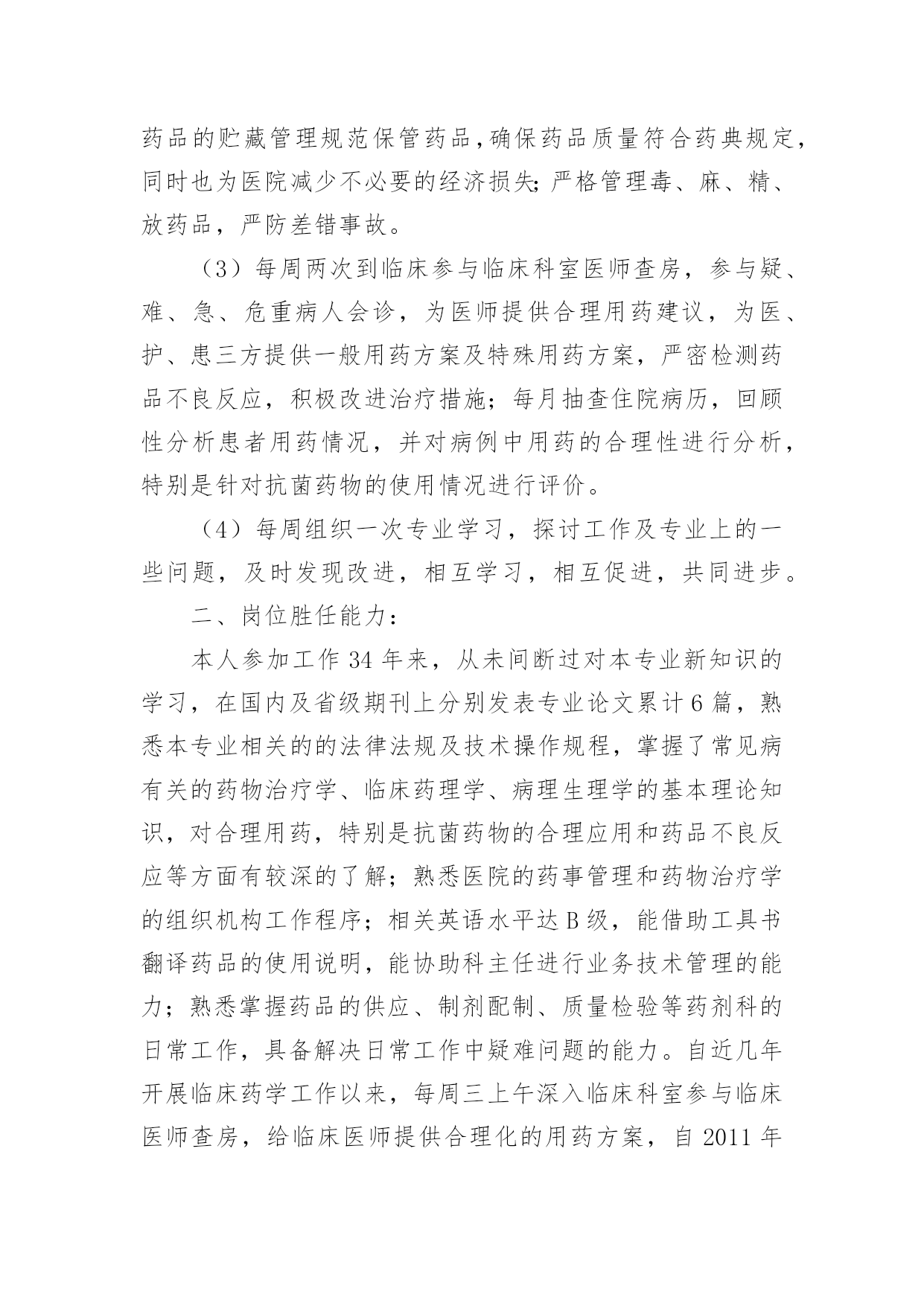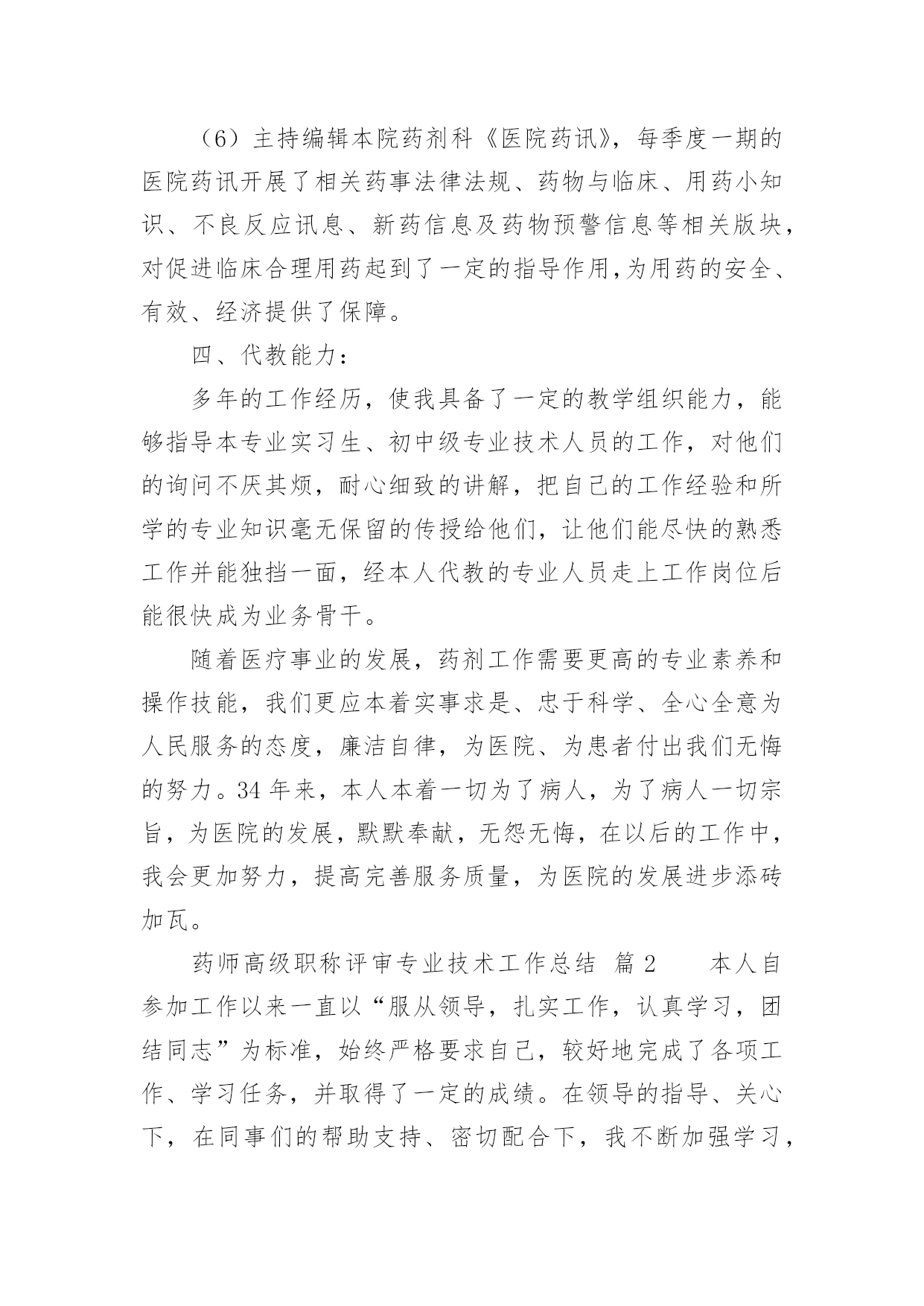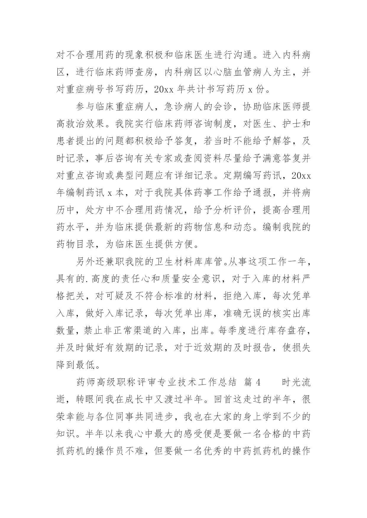 药师高级职称评审专业技术工作总结药师高级职称评审专业技术工作总结(精选12篇)忙碌而又充实的工作已经告一段落了,经过过去这段时间的积累和沉淀,我们已然有了很大的提升和改变,好好写写工作总结,吸取经验教训,指导将来的工作吧。怎样写工作总结才更能吸引眼球呢?以下是小编收集整理的药师高级职称评审专业技术工作总结,欢迎阅读,希望大家能够喜欢。药师高级职称评审专业技术工作总结篇1自1980年3月开始在x医院从事药剂专业工作34年来,本人在院科领导的指导关怀下,在同事的帮助支持、密切配合下,认真学习,努力工作,不断提高自己的业务素质和专业服务能力并于1996年通过自修考试取得了湖北中医学院药学专业专科文凭。三十多年来,本人一直从事药学工作,在平凡的工作岗位中,力争做到让患者满意、同事满意、领导满意。回首过去的工作内容,现总结如下:一、日常工作内容(1)药品调配发放:收方后,认真审核处方,按照四查十对的原则,审核无误后,方进行调配。(2)药品的清领和管理:每天按时查看药房药品的使用情况,列出计划领进药品的品种和数量;对药品的有效期限每月检查统计,按照先进先出的原则发放药品;严格按照药品的贮藏管理规范保管药品,确保药品质量符合药典规定,同时也为医院减少不必要的经济损失;严格管理毒、麻、精、放药品,严防差错事故。(3)每周两次到临床参与临床科室医师查房,参与疑、难、急、危重病人会诊,为医师提供合理用药建议,为医、护、患三方提供一般用药方案及特殊用药方案,严密检测药品不良反应,积极改进治疗措施;每月抽查住院病历,回顾性分析患者用药情况,并对病例中用药的合理性进行分析,特别是针对抗菌药物的使用情况进行评价。(4)每周组织一次专业学习,探讨工作及专业上的一些问题,及时发现改进,相互学习,相互促进,共同进步。二、岗位胜任能力:本人参加工作34年来,从未间断过对本专业新知识的学习,在国内及省级期刊上分别发表专业论文累计6篇,熟悉本专业相关的的法律法规及技术操作规程,掌握了常见病有关的药物治疗学、临床药理学、病理生理学的基本理论知识,对合理用药,特别是抗菌药物的合理应用和药品不良反应等方面有较深的了解;熟悉医院的药事管理和药物治疗学的组织机构工作程序;相关英语水平达B级,能借助工具书翻译药品的使用说明,能协助科主任进行业务技术管理的能力;熟悉掌握药品的供应、制剂配制、质量检验等药剂科的日常工作,具备解决日常工作中疑难问题的能力。自近几年开展临床药学工作以来,每周三上午深入临床科室参与临床医师查房,给临床医师提供合理化的用药方案,自2011年全国抗菌药物专项整治活动以来,我院加深了抗菌药物的临床应用管理,优化了抗菌药物的应用结构,提高了抗菌药物的合理用药水平,有效遏制了细菌耐药的'现象。针对抗菌药物临床应用中存在的突出问题,采取标本兼治的措施加以解决;有效落实了抗菌药物分级管理制度,进一步加深了抗菌药物的临床合理应用。三、承担技术工作:(1)担任药品调配工作,如存在不合理用药情况拒绝调配;(2)毒、麻、精、放及贵重药品的管理严格按照相关的法律法规来执行,做到账物相符。(3)指导下级专业技术人员的日常工作及业务学习,在每周的业务学习例会上,普及国内外相关新知识新技术,提升科室人员整体业务水平。(4)积极开展并参与本院临床药学工作,每月对门、急诊处方及住院病历进行抽查、分析和评价。每季度对本院病原菌送检率及药敏试验情况进行统计监测并及时向上级领导汇报和向临床科室通报,建立我院抗菌药物使用预警机制,指导临床合理用药,防止抗菌药物的滥用给社会和人民群众的身体健康带来的危害。(5)开展药品不良反应的监测工作,在日常工作中,主动到临床收集药品使用的信息反馈,积极主动上报药品不良反应,协助临床做好不良反应的处理工作并查找分析原因,确保临床的用药安全。(6)主持编辑本院药剂科《医院药讯》,每季度一期的医院药讯开展了相关药事法律法规、药物与临床、用药小知识、不良反应讯息、新药信息及药物预警信息等相关版块,对促进临床合理用药起到了一定的指导作用,为用药的安全、有效、经济提供了保障。四、代教能力:多年的工作经历,使我具备了一定的教学组织能力,能够指导本专业实习生、初中级专业技术人员的工作,对他们的询问不厌其烦,耐心细致的讲解,把自己的工作经验和所学的专业知识毫无保留的传授给他们,让他们能尽快的熟悉工作并能独挡一面,经本人代教的专业人员走上工作岗位后能很快成为业务骨干。随着医疗事业的发展,药剂工作需要更高的专业素养和操作技能,我们更应本着实事求是、忠于科学、全心全意为人民服务的态度,廉洁自律,为医院、为患者付出我们无悔的努力。34年来,本人本着一切为了病人,为了病人一切宗旨,为医院的发展,默默奉献,无怨无悔,在以后的工作中,我会更加努力,提高完善服务质量,为医院的发展进步添砖加