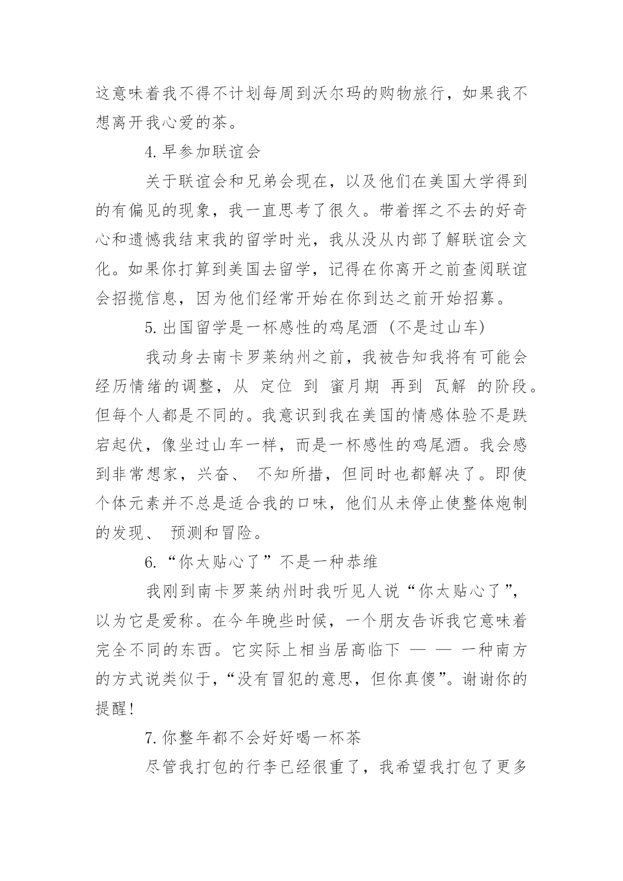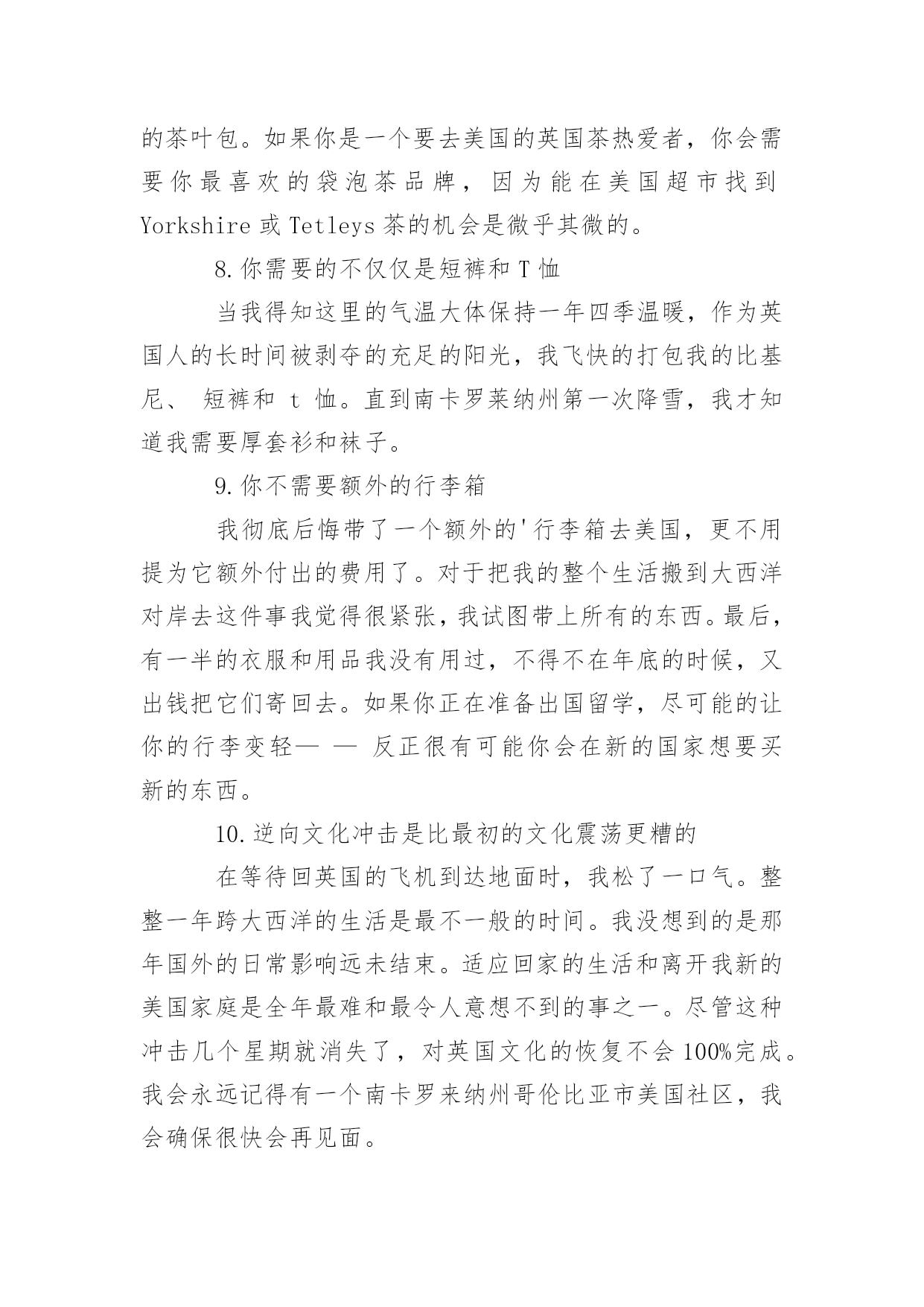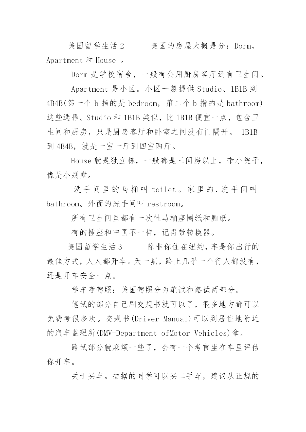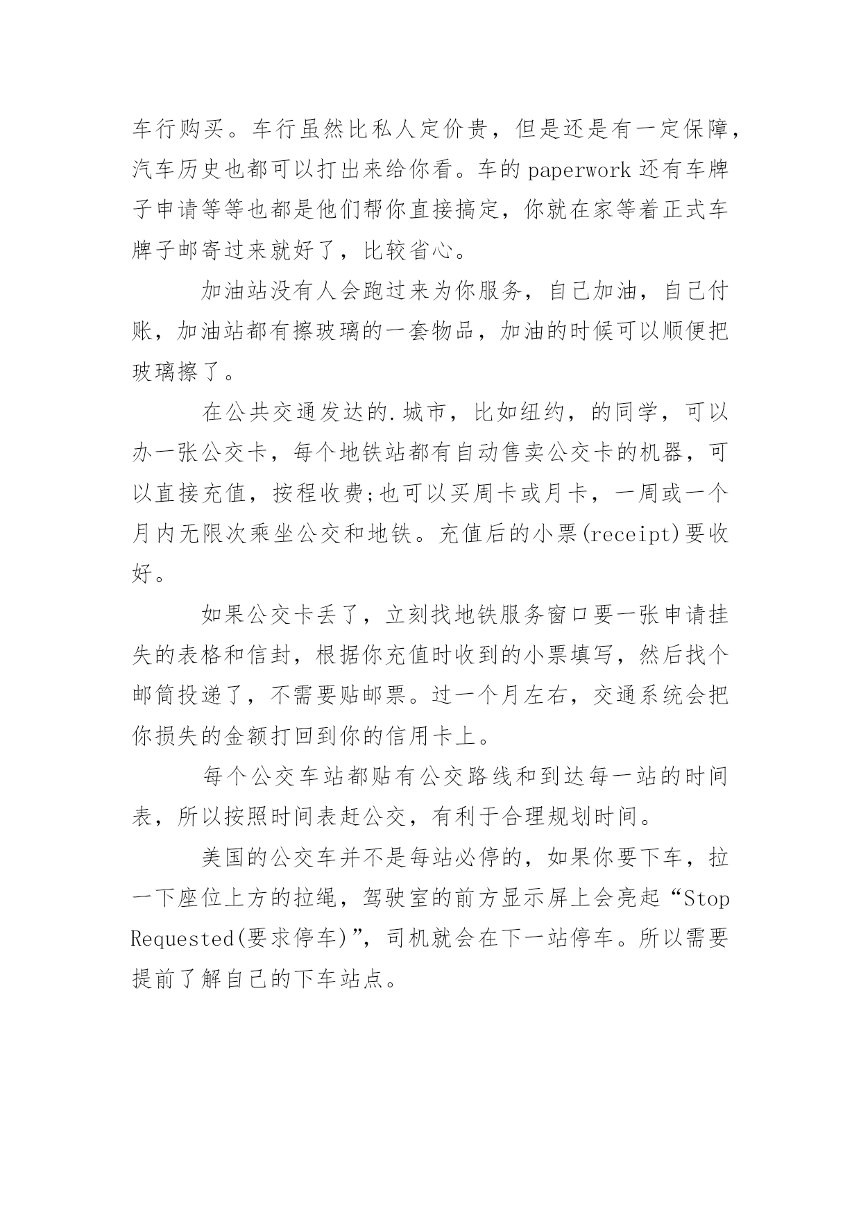 美国留学生活近年来到美国留学的人数增加,对于到美国留学的小伙伴们来说,需要注意的事情是很多的,美国和中国的文化差的比较多,下面是百分网小编给大家带来的有关于美国留学的生活贴士,希望能够帮助到大家。美国留学生活11.美国人比你想象的更爱驾驶我完全不知道美国驾驶文化会影响我多少,直到我抵达哥伦比亚。尽管是南卡罗莱纳州的首都城市,至少可以说哥伦比亚不是行人友好的城市。我很快意识到在美国21岁没有驾照是一件很奇怪的事。很多次当我出发到附近的小镇,会发现脚下的人行道就终止了。保佑我的心。2.做最好的准备,最坏的打算准备去国外留学时,最好采取可能最坏情况就会发生的心态。这方式听起来很负面,但当你离开你的国家开始独立生活,你会有一个“B计划”的安全网。把你所有的签证信息都准备两份复印件。带上你笔记本电脑的收据,以防你需要保险索赔。最重要的是,买包含最广类型的保险,因为当你生活在一个陌生环境里,安全总比后悔好。3.没有街角的商店,只有巨大的超市在英国的时候,我一直喜欢去一个附近角落里的街角商店(或美国人说的便利店)。我从未意识到我认为它们是理所当然的,直到我搬到了美国,在最近的商店可以买的方便的东西就是薯片和糖果:没有牛奶,没有鸡蛋,没有面包。这意味着我不得不计划每周到沃尔玛的购物旅行,如果我不想离开我心爱的茶。4.早参加联谊会关于联谊会和兄弟会现在,以及他们在美国大学得到的有偏见的现象,我一直思考了很久。带着挥之不去的好奇心和遗憾我结束我的留学时光,我从没从内部了解联谊会文化。如果你打算到美国去留学,记得在你离开之前查阅联谊会招揽信息,因为他们经常开始在你到达之前开始招募。5.出国留学是一杯感性的鸡尾酒(不是过山车)我动身去南卡罗莱纳州之前,我被告知我将有可能会经历情绪的调整,从定位到蜜月期再到瓦解的阶段。但每个人都是不同的。我意识到我在美国的情感体验不是跌宕起伏,像坐过山车一样,而是一杯感性的鸡尾酒。我会感到非常想家,兴奋、不知所措,但同时也都解决了。即使个体元素并不总是适合我的口味,他们从未停止使整体炮制的发现、预测和冒险。6.“你太贴心了”不是一种恭维我刚到南卡罗莱纳州时我听见人说“你太贴心了”,以为它是爱称。在今年晚些时候,一个朋友告诉我它意味着完全不同的东西。它实际上相当居高临下——一种南方的方式说类似于,“没有冒犯的意思,但你真傻”。谢谢你的提醒!7.你整年都不会好好喝一杯茶尽管我打包的行李已经很重了,我希望我打包了更多的茶叶包。如果你是一个要去美国的英国茶热爱者,你会需要你最喜欢的袋泡茶品牌,因为能在美国超市找到Yorkshire或Tetleys茶的机会是微乎其微的。8.你需要的不仅仅是短裤和T恤当我得知这里的气温大体保持一年四季温暖,作为英国人的长时间被剥夺的充足的阳光,我飞快的打包我的比基尼、短裤和t恤。直到南卡罗莱纳州第一次降雪,我才知道我需要厚套衫和袜子。9.你不需要额外的行李箱我彻底后悔带了一个额外的'行李箱去美国,更不用提为它额外付出的费用了。对于把我的整个生活搬到大西洋对岸去这件事我觉得很紧张,我试图带上所有的东西。最后,有一半的衣服和用品我没有用过,不得不在年底的时候,又出钱把它们寄回去。如果你正在准备出国留学,尽可能的让你的行李变轻——反正很有可能你会在新的国家想要买新的东西。10.逆向文化冲击是比最初的文化震荡更糟的在等待回英国的飞机到达地面时,我松了一口气。整整一年跨大西洋的生活是最不一般的时间。我没想到的是那年国外的日常影响远未结束。适应回家的生活和离开我新的美国家庭是全年最难和最令人意想不到的事之一。尽管这种冲击几个星期就消失了,对英国文化的恢复不会100%完成。我会永远记得有一个南卡罗来纳州哥伦比亚市美国社区,我会确保很快会再见面。美国留学生活2美国的房屋大概是分:Dorm,Apartment和House。Dorm是学校宿舍,一般有公用厨房客厅还有卫生间。Apartment是小区。小区一般提供Studio、1B1B到4B4B(第一个b指的是bedroom,第二个b指的是bathroom)这些选择。Studio和1B1B类似,比1B1B便宜一点,包含卫生间和厨房,只是厨房客厅和卧室之间没有门隔开。1B1B到4B4B,就是一室一厅到四室两厅。House就是独立栋,一般都是三间房以上,带小院子,像是小别墅。洗手间里的马桶叫toilet。家里的.洗手间叫bathroom。外面的洗手间叫restroom。所有卫生间里都有一次性马桶座圈纸和厕纸。有的插座和中国不一样,记得带转换器。美国留学生活3除非你住在纽约,车是你出行的最佳方式,人人都开车。天一黑,路上几乎一个行人都没有,还是开车安全一点。学车考驾照:美国驾照分为笔试和路试两部分。笔试的部分自己刷交规书就可以了,很多地方都可以免费考很多次。交规书(Dri