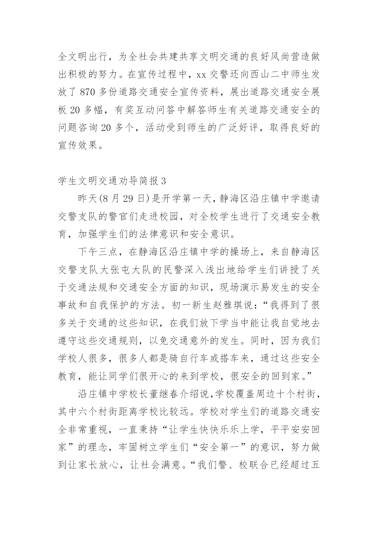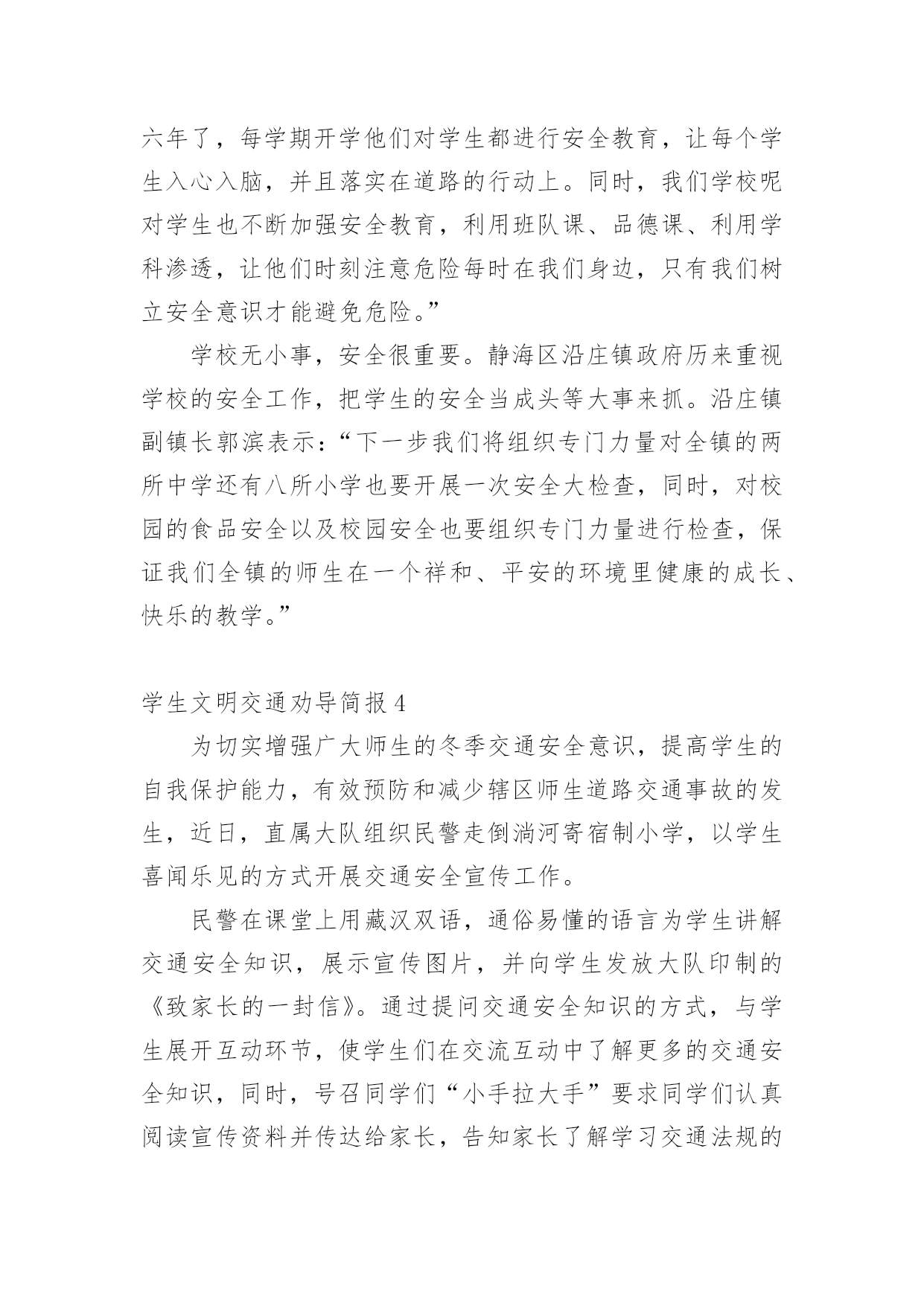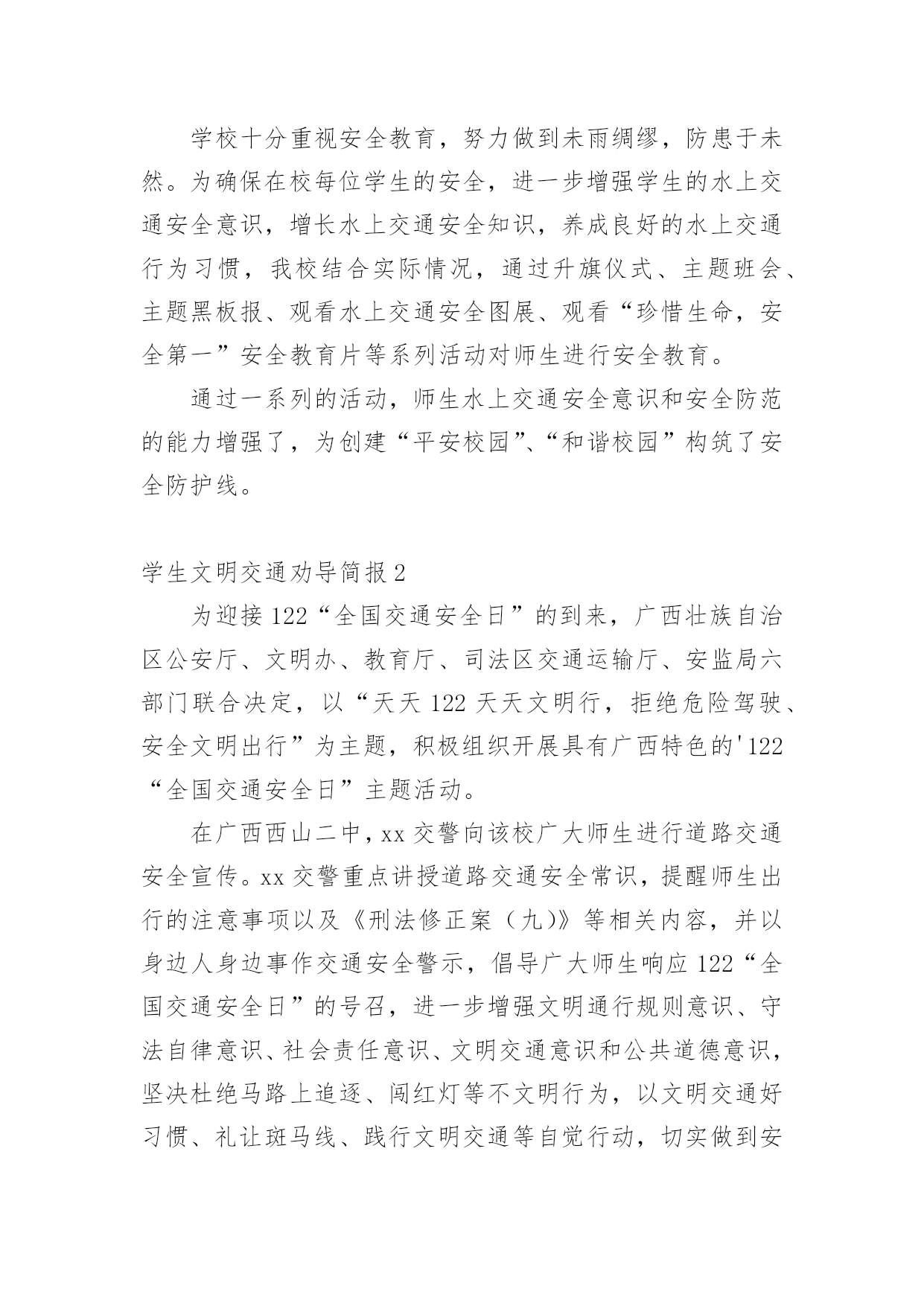学生文明交通劝导简报在现实社会中,大家总少不了接触一些耳熟能详的简报吧,简报的种类尽管很多,但其结构却不无共同之处,一般都包括报头、标题、正文和报尾四个部分。究竟什么样的简报才是好的简报呢?以下是小编整理的学生文明交通劝导简报(精选5篇),欢迎阅读,希望大家能够喜欢。学生文明交通劝导简报1为了普及学生水上交通法律法规知识,加强学生水上交通安全教育,增强学生水上安全意识。近日,广利砚洲安监会在砚洲小学开展了水上交通安全知识进校园活动,为该校师生宣讲了水上交通安全常识。鼎湖区广利小学砚洲分教点座落在风景秀丽的砚洲岛,四面环水。在日常生活中,学生需要购物和走亲访友时,要乘船过渡。为保证学生过渡的安全,砚洲安监会的工作人员认真向学生们讲解了安全乘船和意外落水的应急措施、船舶知识、防溺水知识、逃生技巧等安全知识,现场演示了成人及儿童救生衣的规范穿着,救生圈正确使用方法。师生水上交通法规和水上交通安全常识受教育率达到100%,通过生动形象的讲解和演示,学校师生进一步了解了水上交通安全知识,增强了师生们守法保安全的意识,学生的水上交通安全意识和遵章守法和自觉性得到大幅度的提高,营造了良好的水上交通的安全法制氛围。学校十分重视安全教育,努力做到未雨绸缪,防患于未然。为确保在校每位学生的安全,进一步增强学生的水上交通安全意识,增长水上交通安全知识,养成良好的水上交通行为习惯,我校结合实际情况,通过升旗仪式、主题班会、主题黑板报、观看水上交通安全图展、观看“珍惜生命,安全第一”安全教育片等系列活动对师生进行安全教育。通过一系列的活动,师生水上交通安全意识和安全防范的能力增强了,为创建“平安校园”、“和谐校园”构筑了安全防护线。学生文明交通劝导简报2为迎接122“全国交通安全日”的到来,广西壮族自治区公安厅、文明办、教育厅、司法区交通运输厅、安监局六部门联合决定,以“天天122天天文明行,拒绝危险驾驶、安全文明出行”为主题,积极组织开展具有广西特色的'122“全国交通安全日”主题活动。在广西西山二中,xx交警向该校广大师生进行道路交通安全宣传。xx交警重点讲授道路交通安全常识,提醒师生出行的注意事项以及《刑法修正案(九)》等相关内容,并以身边人身边事作交通安全警示,倡导广大师生响应122“全国交通安全日”的号召,进一步增强文明通行规则意识、守法自律意识、社会责任意识、文明交通意识和公共道德意识,坚决杜绝马路上追逐、闯红灯等不文明行为,以文明交通好习惯、礼让斑马线、践行文明交通等自觉行动,切实做到安全文明出行,为全社会共建共享文明交通的良好风尚营造做出积极的努力。在宣传过程中,xx交警还向西山二中师生发放了870多份道路交通安全宣传资料,展出道路交通安全展板20多幅,有奖互动问答中解答师生有关道路交通安全的问题咨询20多个,活动受到师生的广泛好评,取得良好的宣传效果。学生文明交通劝导简报3昨天(8月29日)是开学第一天,静海区沿庄镇中学邀请交警支队的警官们走进校园,对全校学生进行了交通安全教育,加强学生们的法律意识和安全意识。下午三点,在静海区沿庄镇中学的操场上,来自静海区交警支队大张屯大队的民警深入浅出地给学生们讲授了关于交通法规和交通安全方面的知识,现场演示易发生的安全事故和自我保护的方法。初一新生赵雅琪说:“我得到了很多关于交通的这些知识,在我们放下学当中能让我自觉地去遵守这些交通规则,以免交通意外的发生。同时,因为我们学校人很多,很多人都是骑自行车或搭车来,通过这些安全教育,能让同学们很开心的来到学校,很安全的回到家。”沿庄镇中学校长董继春介绍说,学校覆盖周边十个村街,其中六个村街距离学校比较远。学校对学生们的道路交通安全非常重视,一直秉持“让学生快快乐乐上学,平平安安回家”的理念,牢固树立学生们“安全第一”的意识,努力做到让家长放心,让社会满意。“我们警、校联合已经超过五六年了,每学期开学他们对学生都进行安全教育,让每个学生入心入脑,并且落实在道路的行动上。同时,我们学校呢对学生也不断加强安全教育,利用班队课、品德课、利用学科渗透,让他们时刻注意危险每时在我们身边,只有我们树立安全意识才能避免危险。”学校无小事,安全很重要。静海区沿庄镇政府历来重视学校的安全工作,把学生的安全当成头等大事来抓。沿庄镇副镇长郭滨表示:“下一步我们将组织专门力量对全镇的两所中学还有八所小学也要开展一次安全大检查,同时,对校园的食品安全以及校园安全也要组织专门力量进行检查,保证我们全镇的师生在一个祥和、平安的环境里健康的成长、快乐的教学。”学生文明交通劝导简报4为切实增强广大师生的冬季交通安全意识,提高学生的自我保护能力,有效预防和减少辖区师生道路交通事故的发生,近日,直属大队组织民警走倒淌河寄宿制小学,以学生喜闻乐见的方式开展交通安全宣传工作。民警在课堂上用