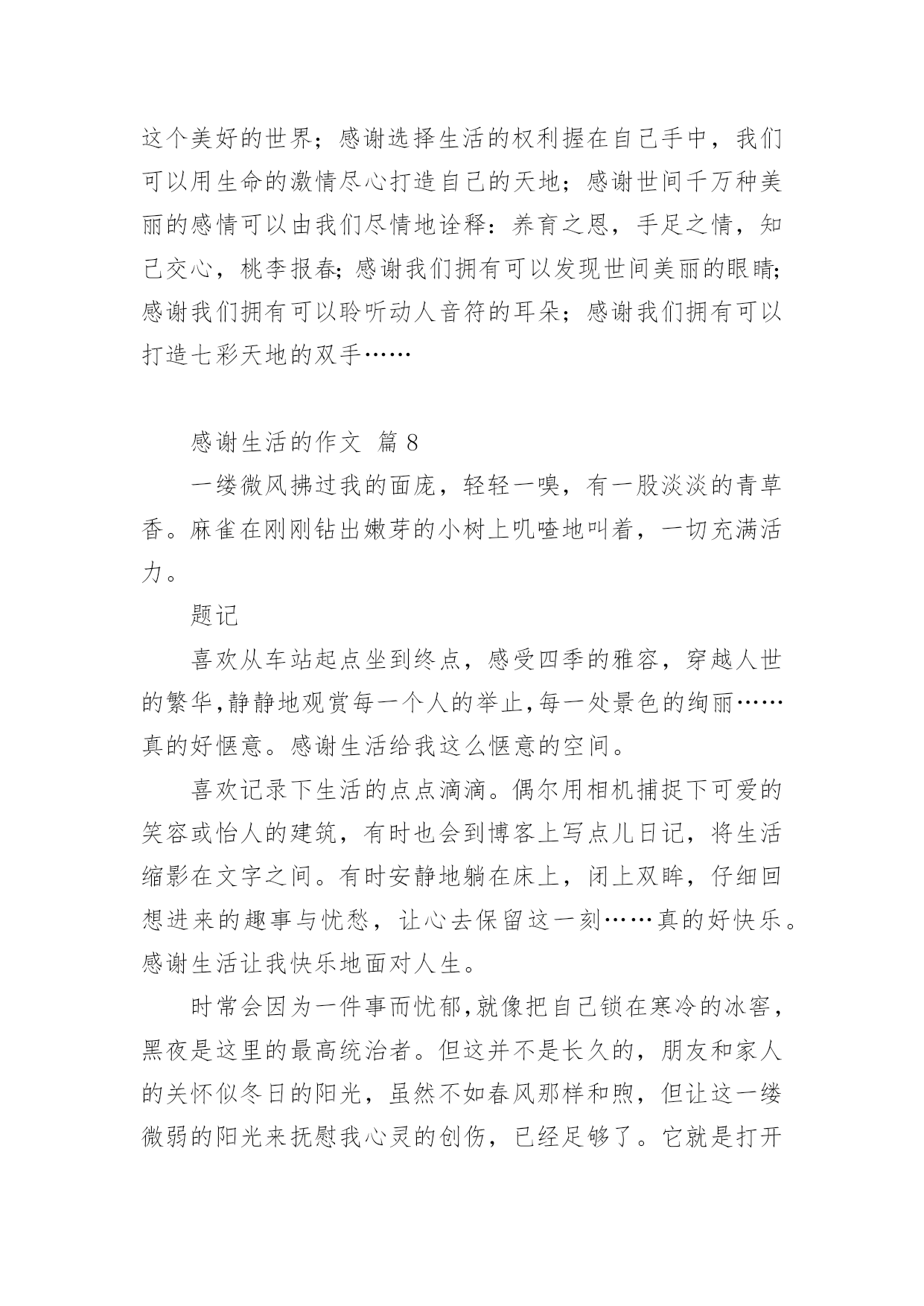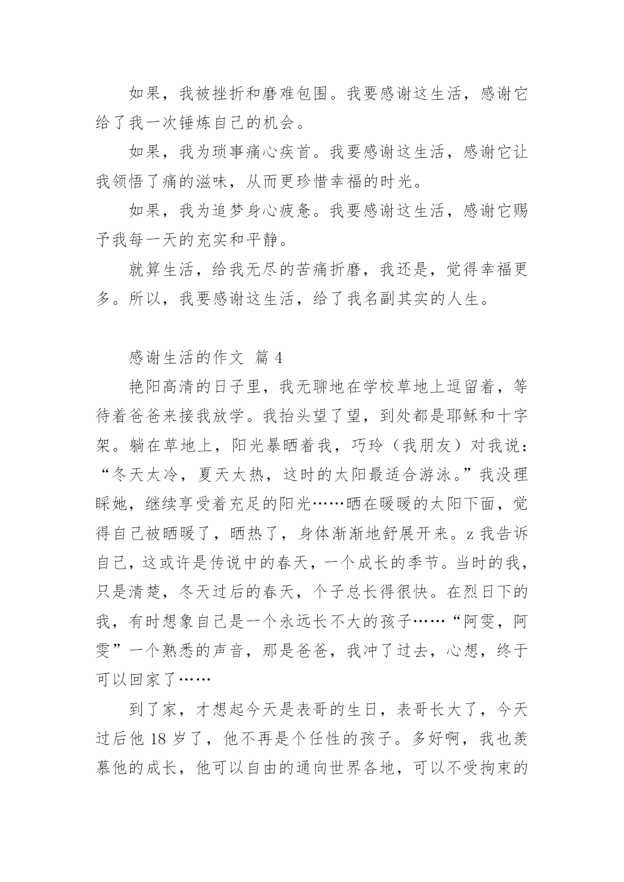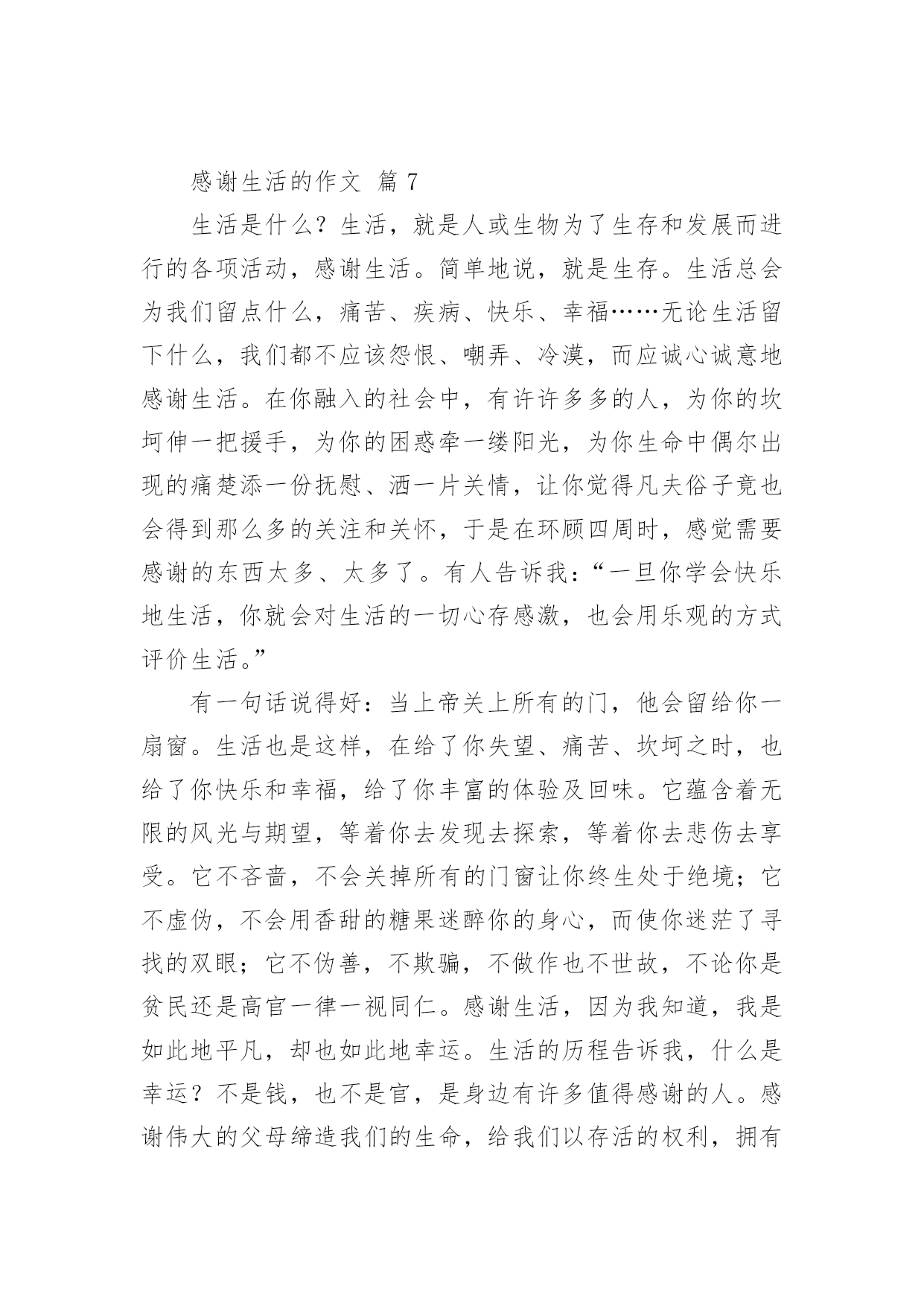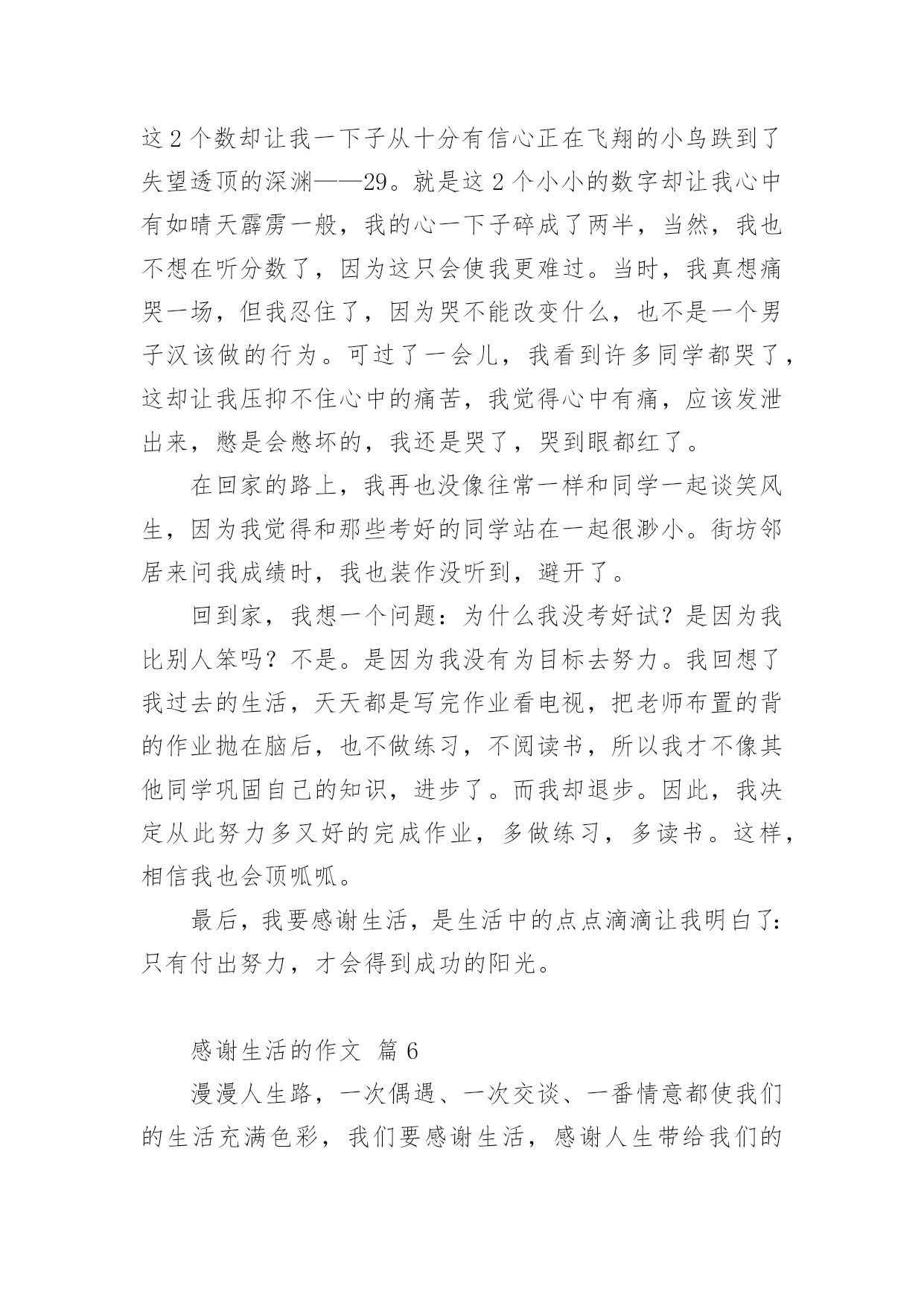 感谢生活的作文感谢生活的作文500字(精选38篇)引导语:心中常怀感恩,感谢生活的给予,你的生活会因此而亮丽起来。下面是小编整理的感谢生活的作文500字(精选38篇),欢迎大家阅读!感谢生活的作文篇1“生活本身就是一个最美的童话”。安徒生的这句名言告诉了我一个生活的真谛:因为生活,你才有了酸甜苦辣[注:指各种味道。比喻幸福、痛苦等各种遭遇。;因为生活,你才有了喜怒哀乐[注:喜欢、恼怒、悲哀、快乐。泛指人的各种不同的感情。;因为生活,你才有了友谊与情感。你的一切一切,几乎都是生活所给你的,你要感谢它。生活中充满了挫折。有一天,我正在做数学题,有一道思考题如“拦路虎”一般挡住了我通往成功的道路,我左思右想[注:多方面想了又想。,查阅资料,终于把这道题解答了出来。我不禁感慨:原来生活总是艰难的,风雨冲刷过的蓝天,阳光依旧耀眼明媚!生活中充满了幸福。现在已经是冬天了,天气十分寒冷。在一次放学回家的路上,雪花飞舞,北风怒号,街上的行人都将自己裹严,所有的人都是赶着往家走。我也回到了家,刚进家门,爸爸就向我嘘寒问暖嘘寒:呵出热气使寒冷的人感到温暖;问暖:指问寒问暖。形容对人的生活十分关切。,生怕我怎么了。顿时,我好像被一股暖意包围住了,之前的寒冷一扫而光,我是多么幸福啊!生活中充满了机遇。有一个星期天,我正在上网查阅作文,一个偶然的机会,我发现了一个网上投稿的地址,我急忙输入地址,进入了那个网站,顺利的发送了许多作文,还被誉为“作文星”。我们要抓住机会,才能成功。灰姑娘把握住了舞会的机遇,从灰姑娘摇身变成王子的新娘,美人鱼虽付出了美妙声音,却抓住了见到王子的机会。大家要把握好机会,才能让生活更为美妙!“生活本身就是一个最美的童话”。我们不要犹豫,这次生活并不容易,如果你轻易浪费了,你会后悔的。生活给了我们太多太多,我们唯有不浪费这一切,才能感谢生活!感谢生活的作文篇2生活,是一杯醇香飘溢的浓茶,深深地呷上一口,含在嘴里,需要你细细地品味。其实生活就是垂柳下,一个人牵着一头牛,彼此静静地闲憩,感受着温和的清风,让思绪在清风中曼舞……爱好兵戎相接的生活,当然属于那些气势凛然的沙场健将。云长的“单刀赴会”,拿破仑的“滑铁卢”,还有卫青的“西征”,虽然历史的书页有些泛黄,甚至过于零乱,但无数英雄的事迹却仍然响彻在我们的耳旁。试问:如果没有枪炮利器,如果没有血溅沙场;没有了大义凛然的将军和视死如归的士兵。那么,历代的英雄从哪里萌生?是什么铸就了我们心目中那些被历史的车轮辗轧不住的英雄?是一场场惊心动魄的战争,更是一页页难以被遗忘的历史!平凡的生活曾经改变了无数不平凡的人。但我们在咀嚼生活平凡的同时,更要融入许多自身元素。比如:勤奋。当然,这只是属于我们的惯例,天道酬勤,不容置疑,上帝不会漠视这样激进的群体。匡衡凿壁借光已成美谈。苦寂,贫穷,生活对于他来说是不公平的。但是,他用他的意志,用他的不懈的精神力量打破了这种原始的僵局,摆脱了那种单调,苦涩的矜持。后来,他才进入了历史文豪的行列。罗斯福的残缺,上帝原本可以让他赋闲家中,可是他倔强地在别人的血液里长大,有了惟妙惟肖的口才,具备了不可思议的天赋;美国人就这样从容地接受了他。生活,就是一只变幻莫测的万花筒,被固定在黑暗的框架里,这永远只是一个被遗弃的废物。如果生活改变了这种现状,让它贪婪地吸收了一缕阳光,它的生命又将折射得缤纷溢彩。我信奉“任你红尘滚滚,我自清风朗月”的格言,喜欢飘逸恬静的深山老林,憧憬典雅恬淡的江南园林,向往气势磅薄的黄河长江。在极富情趣的奇思妙想背后,偶尔我会回过头去看看自己曾经走过的路,重温生命中的每一份温馨,每一份悸动,然后抬起头,仰视那广袤的苍穹,轻轻地说:感谢你,属于我的生活!感谢生活的作文篇3当我在键盘上敲下“生活”这两个字的时候,我并非能够一针见血地去诠释它的意义。或许,那是一种不可触摸的高度,是我们这个年纪无法读懂的内涵。但是,我始终带着一颗感恩的心,为这生活,铺开感恩的路程。我要感谢这生活,在疲惫过后的深夜,插上耳机静静听着我喜欢的音乐的时候;我要感谢这生活,在我忙碌不堪的日子里,抽出一点时间上上网,看看小说的时候;我要感谢这生活,在我那么认真的去爱,去痛,去心碎的时候;我要感谢这生活,在每一个重临的清晨,阳光刺痛我眼睛的时候。所有的一切,从来都没有改变,他还是那么孤独忧伤,饭卡先生还是笑得那么温暖,我还是深深爱着在青春末尾遇见的他。哭也好,笑也好,一切从来未曾改变,生活更是不曾苍白它的意义。阿尔卑斯的味道,甜到忧伤。可我还是戒不掉,那里装载着我和狐狸十八岁的时光,就如同它般甜到忧伤的时光。虽然永远失去了那段时光,永远失去了那段时光中的狐狸。但是,我要感谢这生活,感谢它让我相信了这个世界上还有另一种感情叫友情,更感谢它给我带来的喜怒哀乐。桂花的香气,沁人心脾,