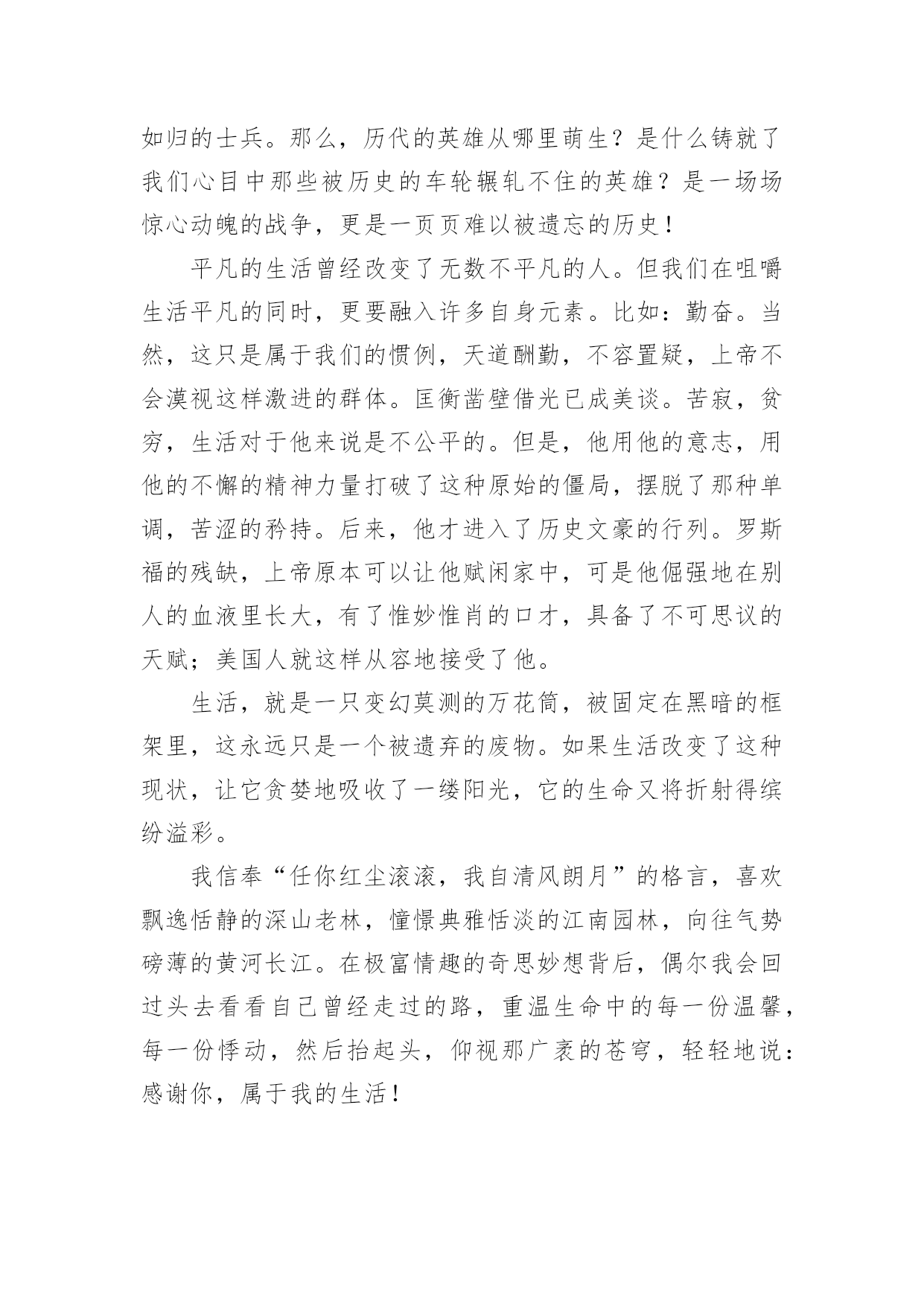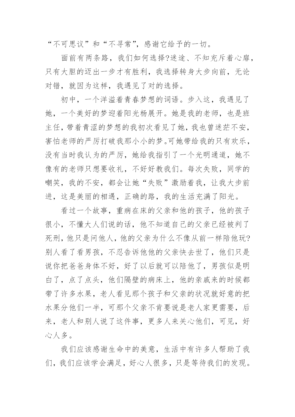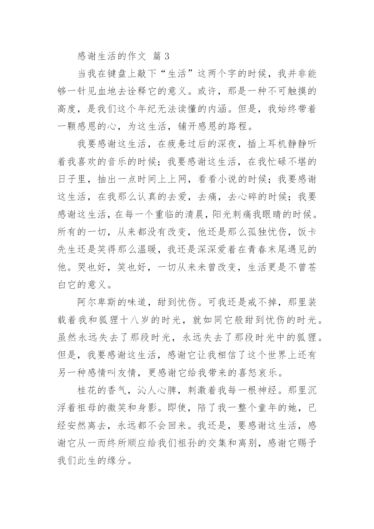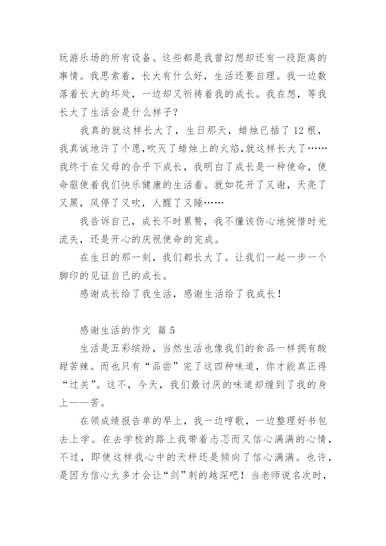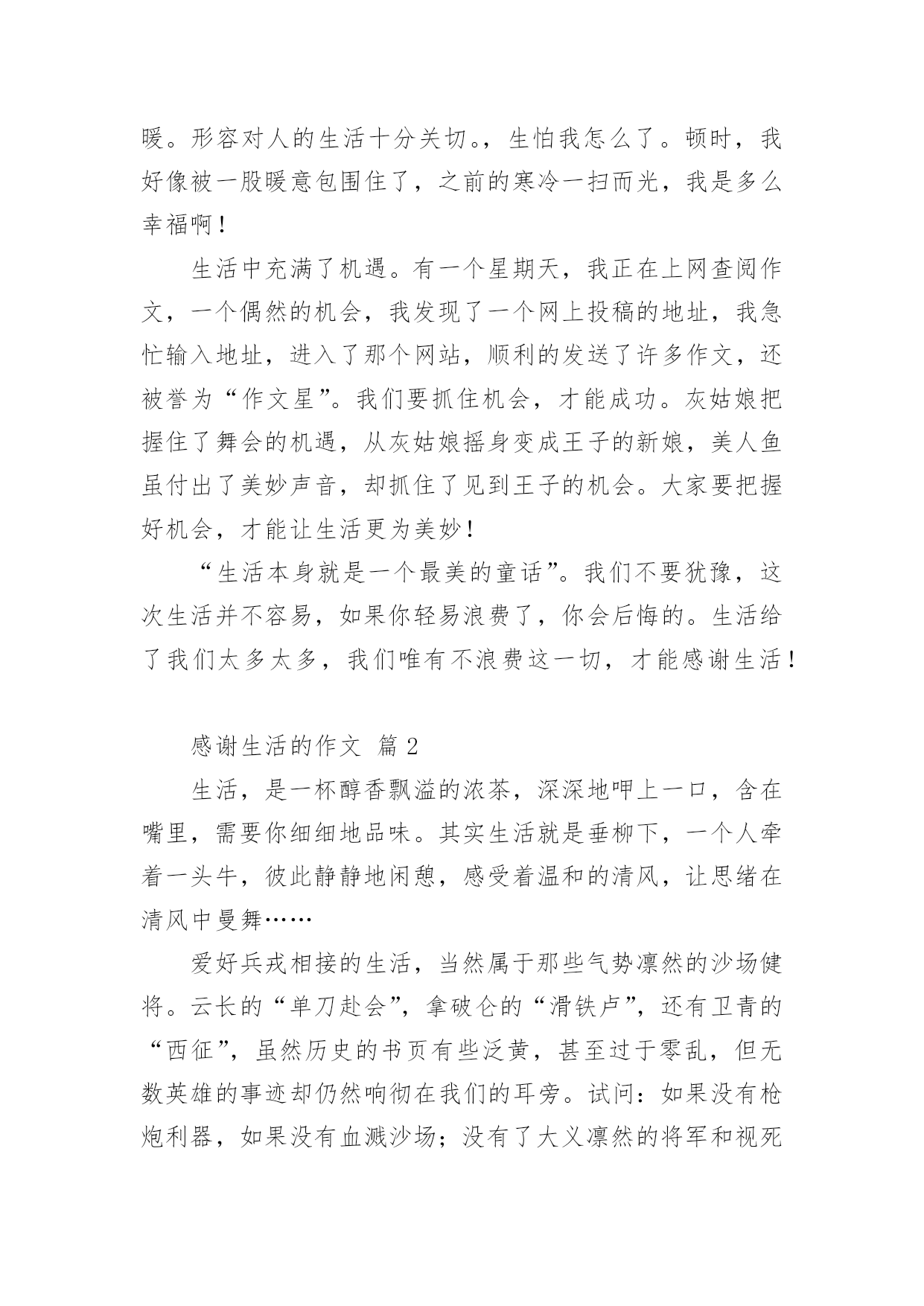 感谢生活的作文感谢生活的作文500字(精选38篇)引导语:心中常怀感恩,感谢生活的给予,你的生活会因此而亮丽起来。下面是小编整理的感谢生活的作文500字(精选38篇),欢迎大家阅读!感谢生活的作文篇1“生活本身就是一个最美的童话”。安徒生的这句名言告诉了我一个生活的真谛:因为生活,你才有了酸甜苦辣[注:指各种味道。比喻幸福、痛苦等各种遭遇。;因为生活,你才有了喜怒哀乐[注:喜欢、恼怒、悲哀、快乐。泛指人的各种不同的感情。;因为生活,你才有了友谊与情感。你的一切一切,几乎都是生活所给你的,你要感谢它。生活中充满了挫折。有一天,我正在做数学题,有一道思考题如“拦路虎”一般挡住了我通往成功的道路,我左思右想[注:多方面想了又想。,查阅资料,终于把这道题解答了出来。我不禁感慨:原来生活总是艰难的,风雨冲刷过的蓝天,阳光依旧耀眼明媚!生活中充满了幸福。现在已经是冬天了,天气十分寒冷。在一次放学回家的路上,雪花飞舞,北风怒号,街上的行人都将自己裹严,所有的人都是赶着往家走。我也回到了家,刚进家门,爸爸就向我嘘寒问暖嘘寒:呵出热气使寒冷的人感到温暖;问暖:指问寒问暖。形容对人的生活十分关切。,生怕我怎么了。顿时,我好像被一股暖意包围住了,之前的寒冷一扫而光,我是多么幸福啊!生活中充满了机遇。有一个星期天,我正在上网查阅作文,一个偶然的机会,我发现了一个网上投稿的地址,我急忙输入地址,进入了那个网站,顺利的发送了许多作文,还被誉为“作文星”。我们要抓住机会,才能成功。灰姑娘把握住了舞会的机遇,从灰姑娘摇身变成王子的新娘,美人鱼虽付出了美妙声音,却抓住了见到王子的机会。大家要把握好机会,才能让生活更为美妙!“生活本身就是一个最美的童话”。我们不要犹豫,这次生活并不容易,如果你轻易浪费了,你会后悔的。生活给了我们太多太多,我们唯有不浪费这一切,才能感谢生活!感谢生活的作文篇2生活,是一杯醇香飘溢的浓茶,深深地呷上一口,含在嘴里,需要你细细地品味。其实生活就是垂柳下,一个人牵着一头牛,彼此静静地闲憩,感受着温和的清风,让思绪在清风中曼舞……爱好兵戎相接的生活,当然属于那些气势凛然的沙场健将。云长的“单刀赴会”,拿破仑的“滑铁卢”,还有卫青的“西征”,虽然历史的书页有些泛黄,甚至过于零乱,但无数英雄的事迹却仍然响彻在我们的耳旁。试问:如果没有枪炮利器,如果没有血溅沙场;没有了大义凛然的将军和视死如归的士兵。那么,历代的英雄从哪里萌生?是什么铸就了我们心目中那些被历史的车轮辗轧不住的英雄?是一场场惊心动魄的战争,更是一页页难以被遗忘的历史!平凡的生活曾经改变了无数不平凡的人。但我们在咀嚼生活平凡的同时,更要融入许多自身元素。比如:勤奋。当然,这只是属于我们的惯例,天道酬勤,不容置疑,上帝不会漠视这样激进的群体。匡衡凿壁借光已成美谈。苦寂,贫穷,生活对于他来说是不公平的。但是,他用他的意志,用他的不懈的精神力量打破了这种原始的僵局,摆脱了那种单调,苦涩的矜持。后来,他才进入了历史文豪的行列。罗斯福的残缺,上帝原本可以让他赋闲家中,可是他倔强地在别人的血液里长大,有了惟妙惟肖的口才,具备了不可思议的天赋;美国人就这样从容地接受了他。生活,就是一只变幻莫测的万花筒,被固定在黑暗的框架里,这永远只是一个被遗弃的废物。如果生活改变了这种现状,让它贪婪地吸收了一缕阳光,它的生命又将折射得缤纷溢彩。我信奉“任你红尘滚滚,我自清风朗月”的格言,喜欢飘逸恬静的深山老林,憧憬典雅恬淡的江南园林,向往气势磅薄的黄河长江。在极富情趣的奇思妙想背后,偶尔我会回过头去看看自己曾经走过的路,重温生命中的每一份温馨,每一份悸动,然后抬起头,仰视那广袤的苍穹,轻轻地说:感谢你,属于我的生活!感谢生活的作文篇3当我在键盘上敲下“生活”这两个字的时候,我并非能够一针见血地去诠释它的意义。或许,那是一种不可触摸的高度,是我们这个年纪无法读懂的内涵。但是,我始终带着一颗感恩的心,为这生活,铺开感恩的路程。我要感谢这生活,在疲惫过后的深夜,插上耳机静静听着我喜欢的音乐的时候;我要感谢这生活,在我忙碌不堪的日子里,抽出一点时间上上网,看看小说的时候;我要感谢这生活,在我那么认真的去爱,去痛,去心碎的时候;我要感谢这生活,在每一个重临的清晨,阳光刺痛我眼睛的时候。所有的一切,从来都没有改变,他还是那么孤独忧伤,饭卡先生还是笑得那么温暖,我还是深深爱着在青春末尾遇见的他。哭也好,笑也好,一切从来未曾改变,生活更是不曾苍白它的意义。阿尔卑斯的味道,甜到忧伤。可我还是戒不掉,那里装载着我和狐狸十八岁的时光,就如同它般甜到忧伤的时光。虽然永远失去了那段时光,永远失去了那段时光中的狐狸。但是,我要感谢这生活,感谢它让我相信了这个世界上还有另一种感情叫友情,更感谢它给我带来的喜怒哀乐。桂花的香气,沁人心脾,
