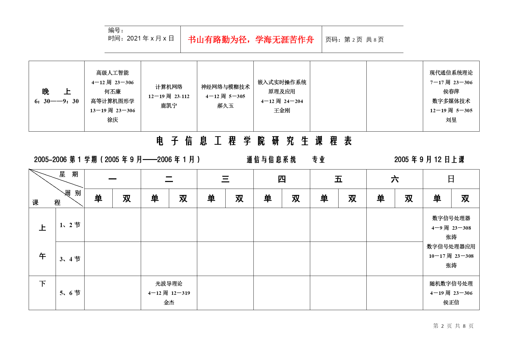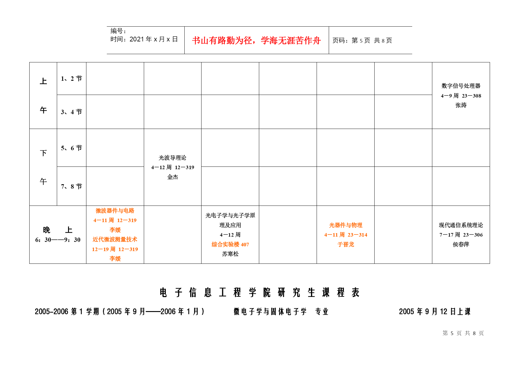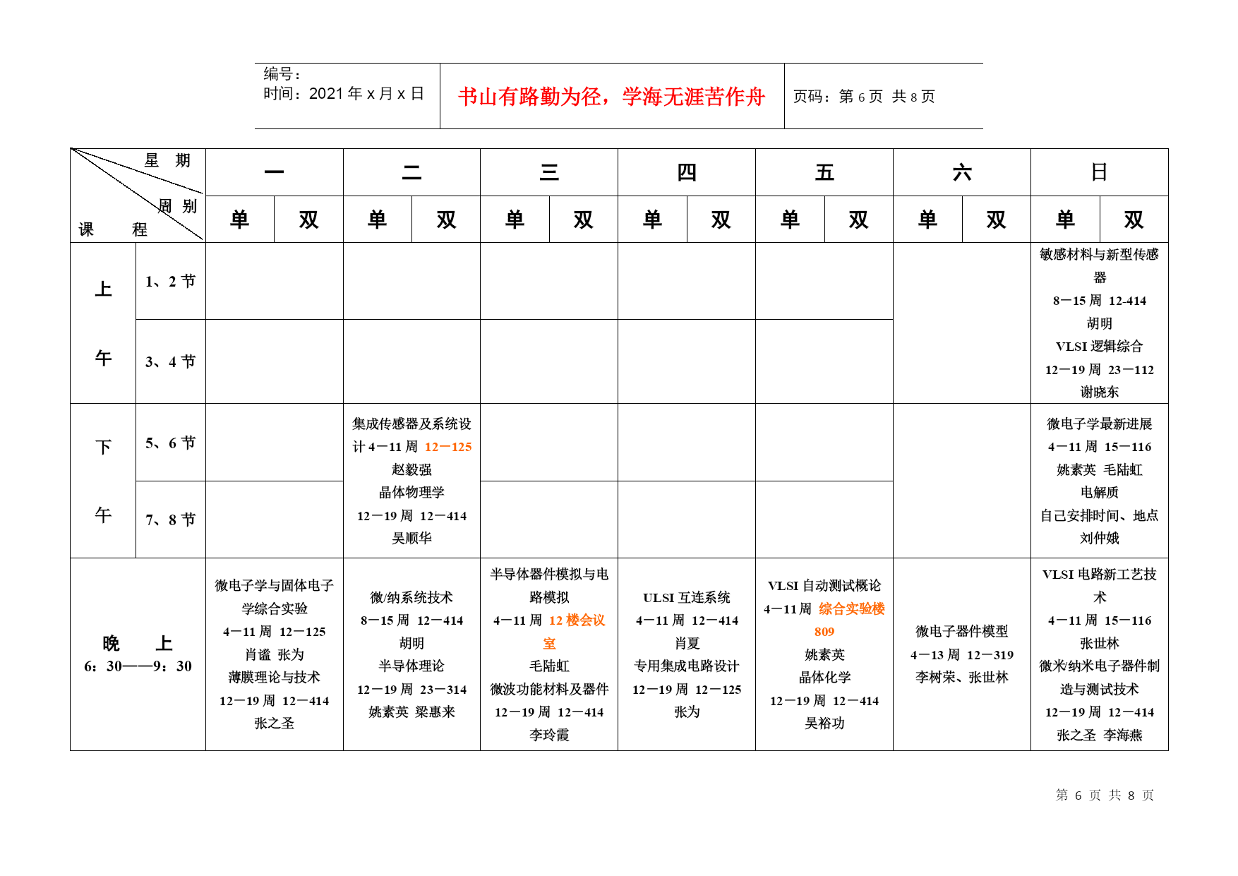 编号:时间:2021年x月x日书山有路勤为径,学海无涯苦作舟页码:第PAGE8页共NUMPAGES8页第PAGE\*MERGEFORMAT8页共NUMPAGES\*MERGEFORMAT8页电子信息工程学院研究生课程表2005-2006第1学期(2005年9月——2006年1月)信号与信息处理专业2005年9月12日上课星期周别课程一二三四五六日单双单双单双单双单双单双单双上午1、2节数字信号处理器4-9周23-308张涛数字信号处理器应用10-17周23-308张涛3、4节下午5、6节数字图像处理4-19周23-314张静随机数字信号处理4-19周23-306侯正信7、8节数字图像编码4-19周23-314苏育挺晚上6:30——9:30高级人工智能4-12周23-306何丕廉高等计算机图形学13-19周23-306徐庆计算机网络12-19周23-112鹿凯宁神经网络与模糊技术4-12周5-305郝久玉嵌入式实时操作系统原理及应用4-12周24-204王金刚现代通信系统理论7-17周23-306侯春萍数字多媒体技术12-19周5-305刘昱电子信息工程学院研究生课程表2005-2006第1学期(2005年9月——2006年1月)通信与信息系统专业2005年9月12日上课星期周别课程一二三四五六日单双单双单双单双单双单双单双上午1、2节数字信号处理器4-9周23-308张涛数字信号处理器应用10-17周23-308张涛3、4节下午5、6节光波导理论4-12周12-319金杰随机数字信号处理4-19周23-306侯正信7、8节晚上6:30——9:30通信网理论基础8-11周5-305戴居丰计算机网络12-19周23-112鹿凯宁神经网络与模糊技术4-12周5-305郝久玉宽带接入技术12-19周23-112杨晋生现代交换技术4-11周23-112沈保锁网络新技术12-19周23-112赵宇光器件与物理4-11周23-314于晋龙光纤通信新技术12-19周23-112王林斗现代通信系统理论7-17周23-306侯春萍电子信息工程学院研究生课程表2005-2006第1学期(2005年9月——2006年1月)电路与系统专业2005年9月12日上课星期周别课程一二三四五六日单双单双单双单双单双单双单双上午1、2节数字信号处理器4-9周23-308张涛3、4节下午5、6节数字图像处理4-19周23-314张静Verilog高级数字设计4-14周12-319张雅绮关欣7、8节晚上6:30——9:30现代电子电路4-12周12-319刘常澍半导体器件模拟与电路模拟4-11周12楼会议室毛陆虹嵌入式实时操作系统原理及应用4-12周24-204王金刚数字多媒体技术12-19周5-305刘昱电子信息工程学院研究生课程表2005-2006第1学期(2005年9月——2006年1月)电磁场与微波技术专业2005年9月12日上课星期周别课程一二三四五六日单双单双单双单双单双单双单双上午1、2节数字信号处理器4-9周23-308张涛3、4节下午5、6节光波导理论4-12周12-319金杰7、8节晚上6:30——9:30微波器件与电路4-11周12-319李媛近代微波测量技术12-19周12-319李媛光电子学与光子学原理及应用4-12周综合实验楼407苏寒松光器件与物理4-11周23-314于晋龙现代通信系统理论7-17周23-306侯春萍电子信息工程学院研究生课程表2005-2006第1学期(2005年9月——2006年1月)微电子学与固体电子学专业2005年9月12日上课星期周别课程一二三四五六日单双单双单双单双单双单双单双上午1、2节敏感材料与新型传感器8-15周12-414胡明VLSI逻辑综合12-19周23-112谢晓东3、4节下午5、6节集成传感器及系统设计4-11周12-125赵毅强晶体物理学12-19周12-414吴顺华微电子学最新进展4-11周15-116姚素英毛陆虹电解质自己安排时间、地点刘仲娥7、8节晚上6:30——9:30微电子学与固体电子学综合实验4-11周12-125肖谧张为薄膜理论与技术12-19周12-414张之圣微/纳系统技术8-15周12-414胡明半导体理论12-19周23-314姚素英梁惠来半导体器件模拟与电路模拟4-11周12楼会议室毛陆虹微波功能材