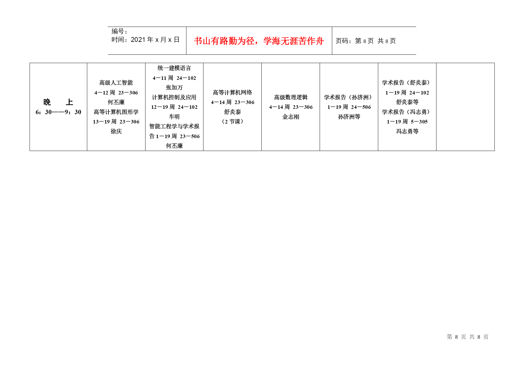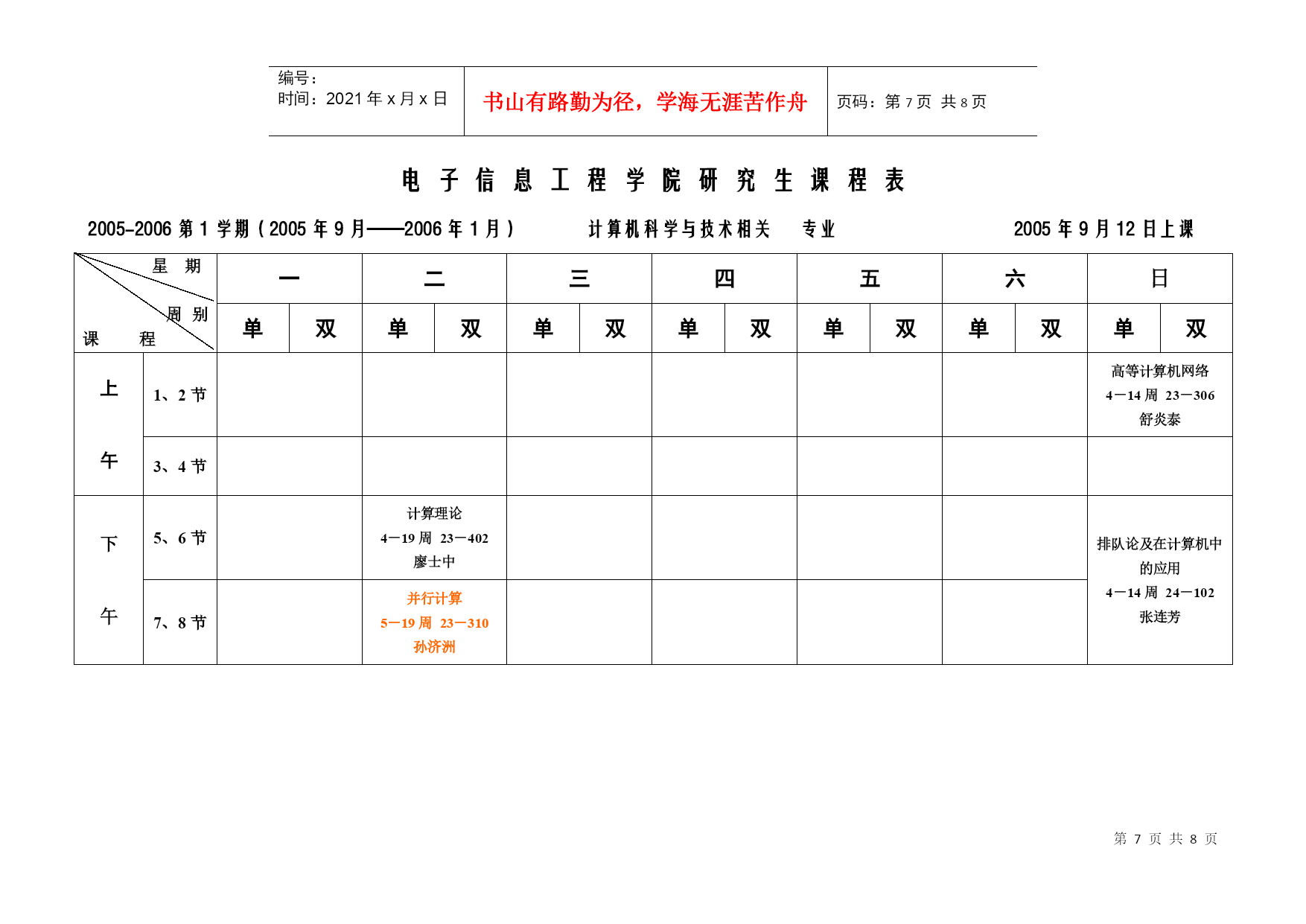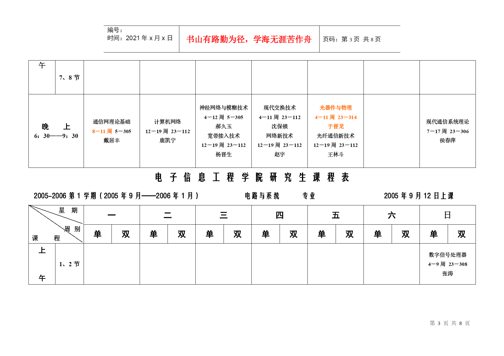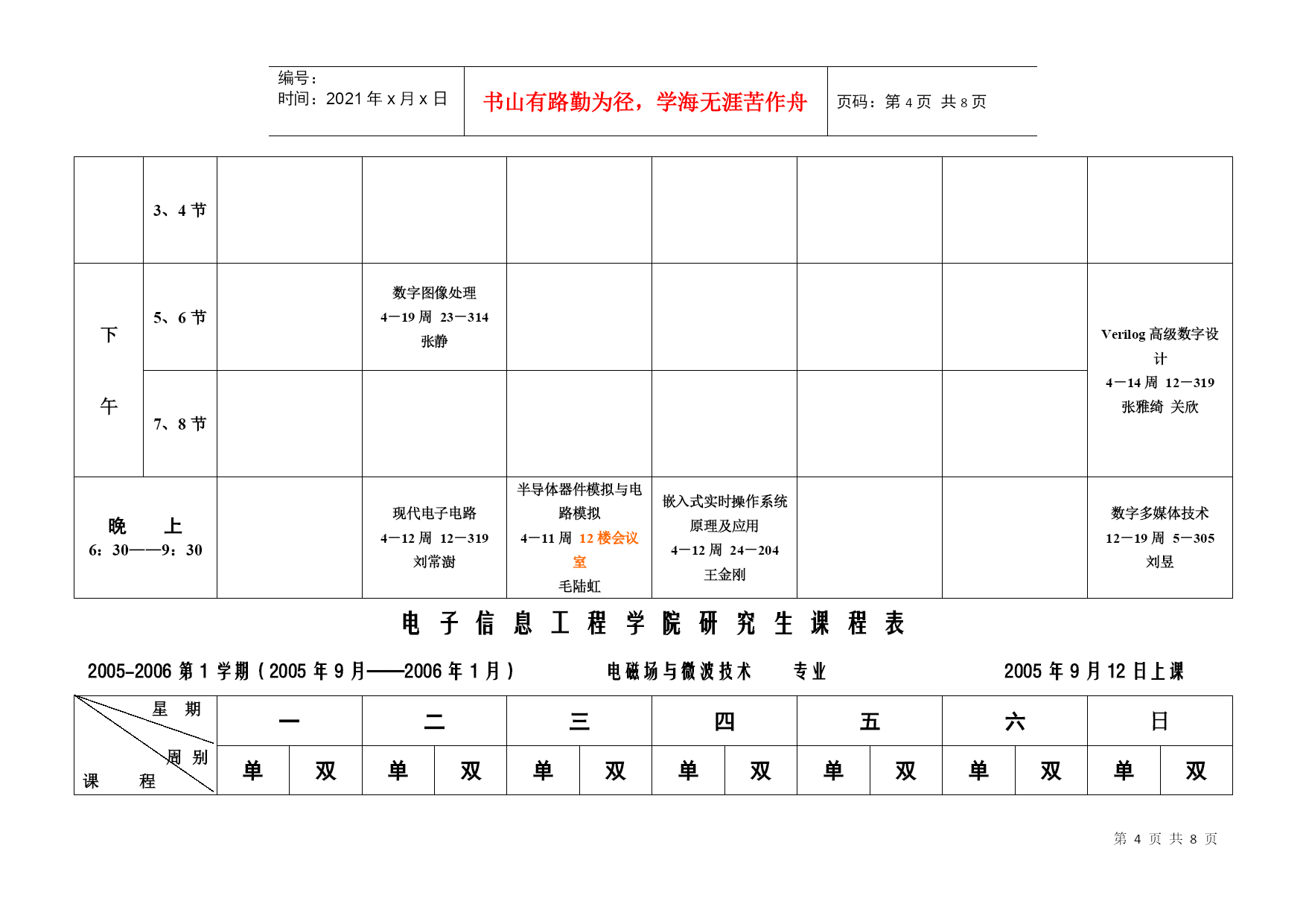 编号:时间:2021年x月x日书山有路勤为径,学海无涯苦作舟页码:第PAGE8页共NUMPAGES8页第PAGE\*MERGEFORMAT8页共NUMPAGES\*MERGEFORMAT8页电子信息工程学院研究生课程表2005-2006第1学期(2005年9月——2006年1月)信号与信息处理专业2005年9月12日上课星期周别课程一二三四五六日单双单双单双单双单双单双单双上午1、2节数字信号处理器4-9周23-308张涛数字信号处理器应用10-17周23-308张涛3、4节下午5、6节数字图像处理4-19周23-314张静随机数字信号处理4-19周23-306侯正信7、8节数字图像编码4-19周23-314苏育挺晚上6:30——9:30高级人工智能4-12周23-306何丕廉高等计算机图形学13-19周23-306徐庆计算机网络12-19周23-112鹿凯宁神经网络与模糊技术4-12周5-305郝久玉嵌入式实时操作系统原理及应用4-12周24-204王金刚现代通信系统理论7-17周23-306侯春萍数字多媒体技术12-19周5-305刘昱电子信息工程学院研究生课程表2005-2006第1学期(2005年9月——2006年1月)通信与信息系统专业2005年9月12日上课星期周别课程一二三四五六日单双单双单双单双单双单双单双上午1、2节数字信号处理器4-9周23-308张涛数字信号处理器应用10-17周23-308张涛3、4节下午5、6节光波导理论4-12周12-319金杰随机数字信号处理4-19周23-306侯正信7、8节晚上6:30——9:30通信网理论基础8-11周5-305戴居丰计算机网络12-19周23-112鹿凯宁神经网络与模糊技术4-12周5-305郝久玉宽带接入技术12-19周23-112杨晋生现代交换技术4-11周23-112沈保锁网络新技术12-19周23-112赵宇光器件与物理4-11周23-314于晋龙光纤通信新技术12-19周23-112王林斗现代通信系统理论7-17周23-306侯春萍电子信息工程学院研究生课程表2005-2006第1学期(2005年9月——2006年1月)电路与系统专业2005年9月12日上课星期周别课程一二三四五六日单双单双单双单双单双单双单双上午1、2节数字信号处理器4-9周23-308张涛3、4节下午5、6节数字图像处理4-19周23-314张静Verilog高级数字设计4-14周12-319张雅绮关欣7、8节晚上6:30——9:30现代电子电路4-12周12-319刘常澍半导体器件模拟与电路模拟4-11周12楼会议室毛陆虹嵌入式实时操作系统原理及应用4-12周24-204王金刚数字多媒体技术12-19周5-305刘昱电子信息工程学院研究生课程表2005-2006第1学期(2005年9月——2006年1月)电磁场与微波技术专业2005年9月12日上课星期周别课程一二三四五六日单双单双单双单双单双单双单双上午1、2节数字信号处理器4-9周23-308张涛3、4节下午5、6节光波导理论4-12周12-319金杰7、8节晚上6:30——9:30微波器件与电路4-11周12-319李媛近代微波测量技术12-19周12-319李媛光电子学与光子学原理及应用4-12周综合实验楼407苏寒松光器件与物理4-11周23-314于晋龙现代通信系统理论7-17周23-306侯春萍电子信息工程学院研究生课程表2005-2006第1学期(2005年9月——2006年1月)微电子学与固体电子学专业2005年9月12日上课星期周别课程一二三四五六日单双单双单双单双单双单双单双上午1、2节敏感材料与新型传感器8-15周12-414胡明VLSI逻辑综合12-19周23-112谢晓东3、4节下午5、6节集成传感器及系统设计4-11周12-125赵毅强晶体物理学12-19周12-414吴顺华微电子学最新进展4-11周15-116姚素英毛陆虹电解质自己安排时间、地点刘仲娥7、8节晚上6:30——9:30微电子学与固体电子学综合实验4-11周12-125肖谧张为薄膜理论与技术12-19周12-414张之圣微/纳系统技术8-15周12-414胡明半导体理论12-19周23-314姚素英梁惠来半导体器件模拟与电路模拟4-11周12楼会议室毛陆虹微波功能材
