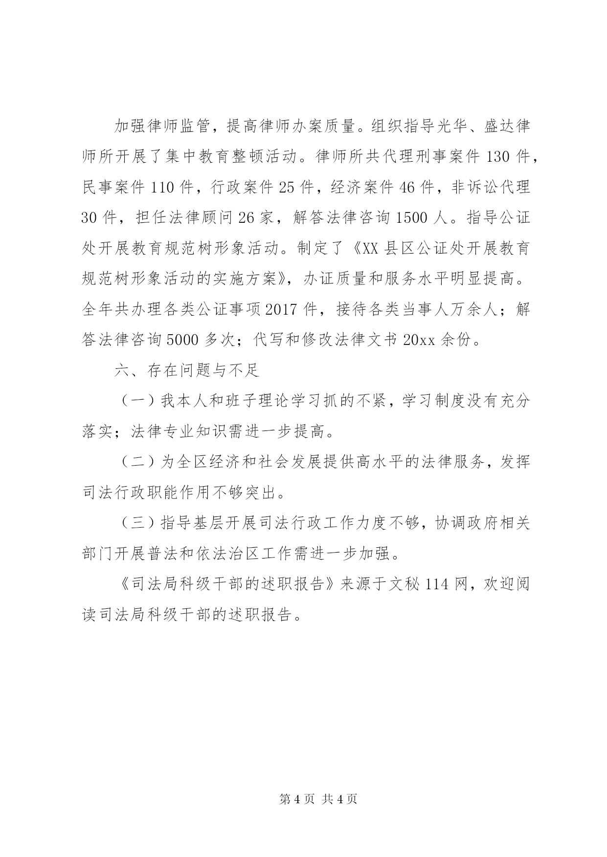 第PAGE\*Arabic\*MERGEFORMAT4页共NUMPAGES\*MERGEFORMAT4页司法局科级干部的述职报告文章标题:司法局科级干部的述职报告___年在区委、区政府的领导和班子全体成员的支持努力下,我坚持工作高起点、高标准,较好地完成了司法行政各项工作任务。___年,司法局被市评为先进单位,各项业务指标综合考核,名列全市第一。普法、法律援助、人民调解、安置帮教等业务工作分别被部、省、市评为先进。现将___年抓班子建设和工作实绩述职如下:一、努力进取,抓好领导班子全面建设在加强领导班子建设上我注重抓了以下工作:(一)搞好团结,增强班子凝聚力。我从讲政治、讲正气、维护党性原则出发,切实搞好一班人的团结。贯彻民主集中制的各项制度,保证各项决策的民主化、科学化。从我做起,要求班子成员树立一盘棋思想,做到思想上合、职能上分,目标上合、工作上分,重大决策上合、落实责任上分,相互支持、相互配合,分工不分家,确保了班子整体优势得到充分发挥。(二)统揽全局,增强班子战斗力。1、抓大事。司法行政工作千头万绪,我注重找准影响大局、有决定意义的关键问题,集中精力去抓好、抓出成效;2、抓重点。工作上注重围绕区里的中心工作开展司法行政工作,特别是围绕稳定指导基层开展好人民调解和法律援助工作。3、抓协调。我以积极的态度、多样的方式去沟通、协调班子成员之间、上上下下、方方面面的关系,处理好各类问题,使分力变成合力、阻力变动力、被动变主动,确保班子内部和外部保持良好运行机制。(三)率先垂范,增强班子号召力。1、带头学习。注重学习“三个代表”重要思想,用科学发展观研究司法行政工作在改革发展中的新情况、新问题,找出工作的新思路,增强“执政为民”的责任感、使命感。学习法律、法规,增强了业务工作的指导性;2、带头廉洁自律。树立正确的人生观、价值观,艰苦奋斗,廉洁从政;抓好纠风各项工作的落实。3、带头工作。把心思放在工作上,精力倾注在工作上,力气花在工作上,督战又参战,起到表率作用;4、带头树立良好局风。为树立和谐、效率、文明的机关风尚,坚持以身作则,严于律己,谦和为人,体恤下属,树立正气。二、强化指导,抓好普法和依法治理工作开展形式多样的法律宣传活动,组织协调各街道、社区开展法律宣传活动60场次,出动宣传车10台次,文艺演出30场次,发放宣传品3万余份,制作宣传(栏)板120块,宣传横幅50条,受教育面达10万人以上。做好“法律进社区”工作。主持召开法律进社区研讨会,及时总结推广了“法律进社区”先进经验。搞好青少年普法教育。安排部署机关同志为中小学校讲法制课60余课时,受教育学生达6000余人次。三、采取措施,做好人民调解和安置帮教工作有组织的开展矛盾纠纷大排查56次,专项治理2次,调解各类矛盾纠纷534件,防止群体性上访22件。做好安置帮教工作,预防重新犯罪。05年全区共接收两劳释解人员46名,过渡安置率100;加强对刑释解教人员的衔接管理工作,列帮率达到100。指导基层开展法律服务工作。协调各基层法律服务所为各级政府、企事业单位和个体工商户担当法律顾问52家;代理诉讼54件;代写法律文书62件;协办公证44件;开展见证126件;解答法律咨询823人次。四、加大力度,搞好法律援助和“148”法律咨询服务降低门槛,拓宽工作领域,以优质服务为弱势群体进行法律援助。全年共办理法律援助案件45件。“148”法律服务中心共受理来电咨询5326人次,接待来访600余人次。参加区长信访接待日,安排律师定期到信访办值班,解答上访群众法律咨询1000余人次,处理涉法信访案件100余件。争创市级“优秀青少年维权岗”。开展送法入校活动21场次,解答青少年法律咨询200余人次,办理未成年人援助案件15件,有效维护了未成年人合法权益。五、监督管理,抓好律师代理和公证服务加强律师监管,提高律师办案质量。组织指导光华、盛达律师所开展了集中教育整顿活动。律师所共代理刑事案件130件,民事案件110件,行政案件25件,经济案件46件,非诉讼代理30件,担任法律顾问26家,解答法律咨询1500人。指导公证处开展教育规范树形象活动。制定了《XX县区公证处开展教育规范树形象活动的实施方案》,办证质量和服务水平明显提高。全年共办理各类公证事项2017件,接待各类当事人万余人;解答法律咨询5000多次;代写和修改法律文书20xx余份。六、存在问题与不足(一)我本人和班子理论学习抓的不紧,学习制度没有充分落实;法律专业知识需进一步提高。(二)为全区经济和社会发展提供高水平的法律服务,发挥司法行政职能作用不够突出。(三)指导基层开展司法行政工作力度不够,协调政府相关部门开展普法和依法治区工作需进一步加强。《司法局科级干部的述职报告》来源于文秘114网,欢迎阅读司法局科