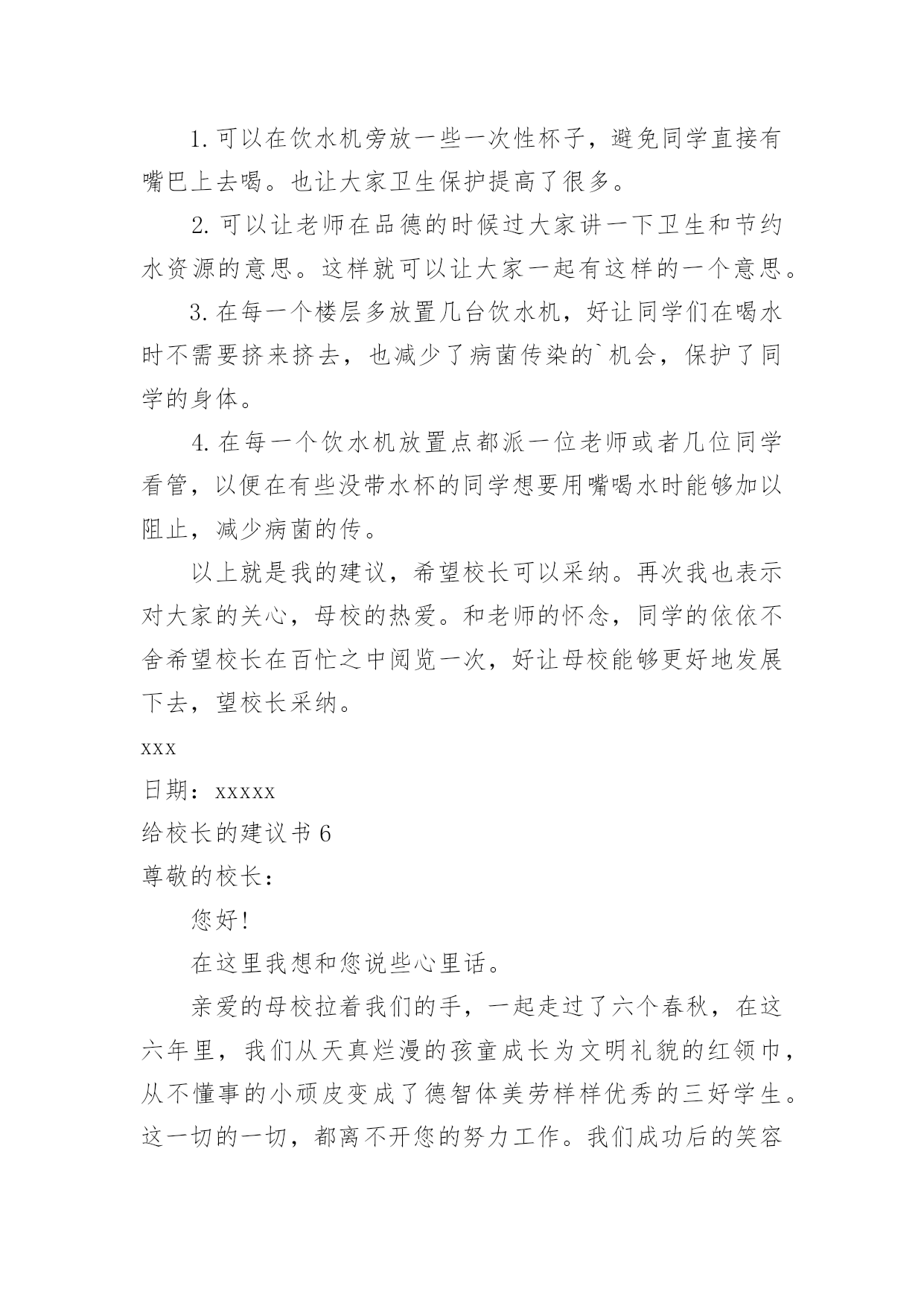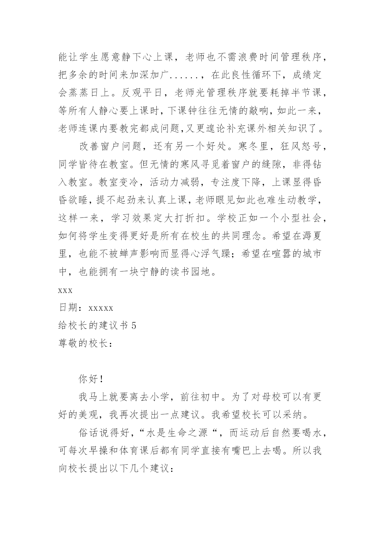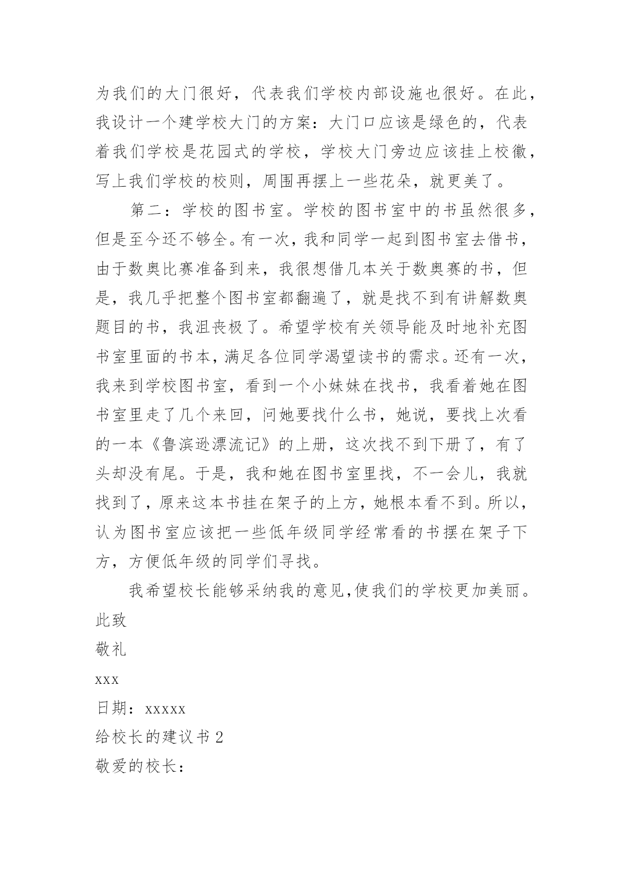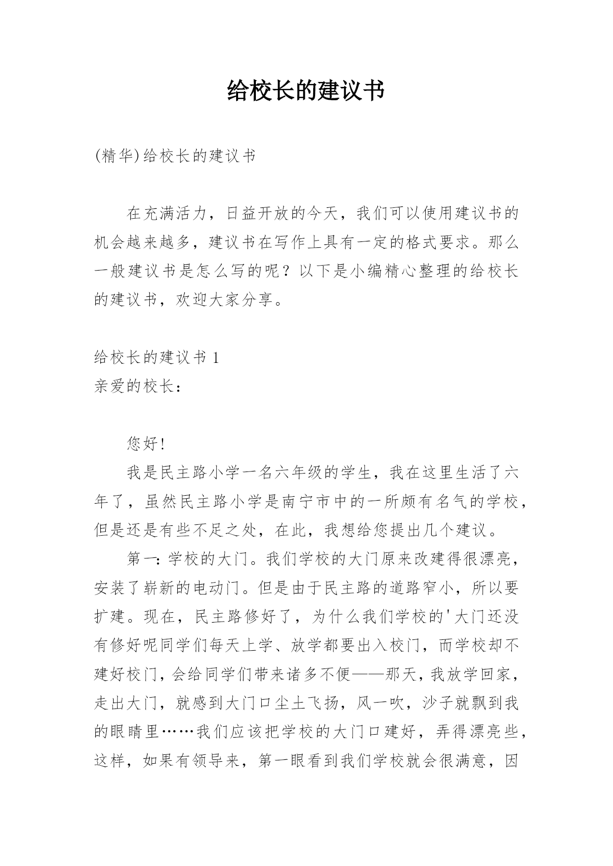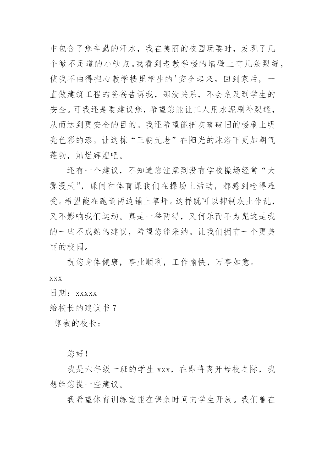 给校长的建议书(精华)给校长的建议书在充满活力,日益开放的今天,我们可以使用建议书的机会越来越多,建议书在写作上具有一定的格式要求。那么一般建议书是怎么写的呢?以下是小编精心整理的给校长的建议书,欢迎大家分享。给校长的建议书1亲爱的校长:您好!我是民主路小学一名六年级的学生,我在这里生活了六年了,虽然民主路小学是南宁市中的一所颇有名气的学校,但是还是有些不足之处,在此,我想给您提出几个建议。第一:学校的大门。我们学校的大门原来改建得很漂亮,安装了崭新的电动门。但是由于民主路的道路窄小,所以要扩建。现在,民主路修好了,为什么我们学校的'大门还没有修好呢同学们每天上学、放学都要出入校门,而学校却不建好校门,会给同学们带来诸多不便——那天,我放学回家,走出大门,就感到大门口尘土飞扬,风一吹,沙子就飘到我的眼睛里……我们应该把学校的大门口建好,弄得漂亮些,这样,如果有领导来,第一眼看到我们学校就会很满意,因为我们的大门很好,代表我们学校内部设施也很好。在此,我设计一个建学校大门的方案:大门口应该是绿色的,代表着我们学校是花园式的学校,学校大门旁边应该挂上校徽,写上我们学校的校则,周围再摆上一些花朵,就更美了。第二:学校的图书室。学校的图书室中的书虽然很多,但是至今还不够全。有一次,我和同学一起到图书室去借书,由于数奥比赛准备到来,我很想借几本关于数奥赛的书,但是,我几乎把整个图书室都翻遍了,就是找不到有讲解数奥题目的书,我沮丧极了。希望学校有关领导能及时地补充图书室里面的书本,满足各位同学渴望读书的需求。还有一次,我来到学校图书室,看到一个小妹妹在找书,我看着她在图书室里走了几个来回,问她要找什么书,她说,要找上次看的一本《鲁滨逊漂流记》的上册,这次找不到下册了,有了头却没有尾。于是,我和她在图书室里找,不一会儿,我就找到了,原来这本书挂在架子的上方,她根本看不到。所以,认为图书室应该把一些低年级同学经常看的书摆在架子下方,方便低年级的同学们寻找。我希望校长能够采纳我的意见,使我们的学校更加美丽。此致敬礼xxx日期:xxxxx给校长的建议书2敬爱的校长:您好!在即将离开母校之际想对你些建议,请您采纳。校园里不仅仅有污染环境的现象,还有许多浪费资源的现象,课间,有许多同学把老师放在讲台上的粉笔偷偷地拿来,有的把它撇成几段,当成砸人的武器,还有的把它刻成小船当成玩具,更让人厌烦的是有人将粉笔压成粉末,夹在纸里,趁你不注意突然拍一下,那粉末就喷出来,散布在空气中,让人喘不过气来前段时间,学校突然流行玩气球,贪玩的同学将气球里装满水,到处喷洒,不仅如此,而且还有同学灌足水后懒得关上水笼头,“哗哗哗,哗哗哗”大量的水从水龙头里白白地流失。“哎,学校的环保意识这么差,那国家又能好到那去呢?如果人人都善待自然资源,一起共营生命绿色,那是多么美好的景象啊”保护家园,就是保护自己;热爱家园,就是热爱生命。我们要用爱心去关注环境的`变化,用热情支持传播环保的观念,用行动肩负起环保的重任。近年来,我院精心绿化、美化、净化校园环境,营造人文、和谐的育人氛围、拓展各种渠道,普及绿色理念、倡导绿色文明。1、不随便乱扔废纸、饮料瓶。在班里分别设置装废纸和饮料瓶的箱子,把废纸、饮料瓶等可回收的废品积攒起来集中卖掉。这样,既能保护环境,又能用所得的钱为同学们做些有益的事情。2、不随便购买校门口小摊点上的零食。因为这些食品大多对我们的身体有害,还会影响我们的智力。至于一些包装袋,大家更不要随意丢弃。3、吐痰既污染环境又传播病菌,是非常不文明的表现,所以我们不要随地吐痰。如果见到有同学随地吐痰,我们要加以阻止和劝告。4、爱护学校的花草树木,不乱摘花朵,不乱踩草坪,让花草树木自由自在地生长。在保护的同时,大家还要积极种一些花草树木,这样可以美化环境,还能净化空气。此致敬礼!xxxxx年xx月xx日给校长的建议书3尊敬的校长:您好!当我提起手中的笔给您写这封信时,我这握笔的手微微颤动,惜别的泪水模糊了我的双眼,依依不舍之情油然而生。我——一名即将毕业的小学生,就要离开这朝夕相处六年的母校了。母校六年的学习生活,洒下了我们多少快乐的笑声,留下了我们多少快乐的身影。操场上的嬉戏打闹,教室里琅琅的读书声……校园里组组美好的镜头,叫我怎能忘怀马上就要离开亲爱的母校了,尊敬的校长,我有些话想对您说,您能坐下来听听我这位毕业生的心声吗校长,我建议,学校的图书馆向大家敞开大门,让大家尽情地遨游书的王国。我明白,我们是毕业生,此时的'学习是十分紧张的。可是,我们不想整天学习,成为一个没有快乐的“学习机器”。书是一切智慧的源泉,有了书,我们就能得到更多的精神财富,更好地投入到学习中。校长,您说对吗校长,我还有一个请求——毕业生能否上一上体育课呢人的健全,不仅仅靠学习,还应靠运动,两项是同等