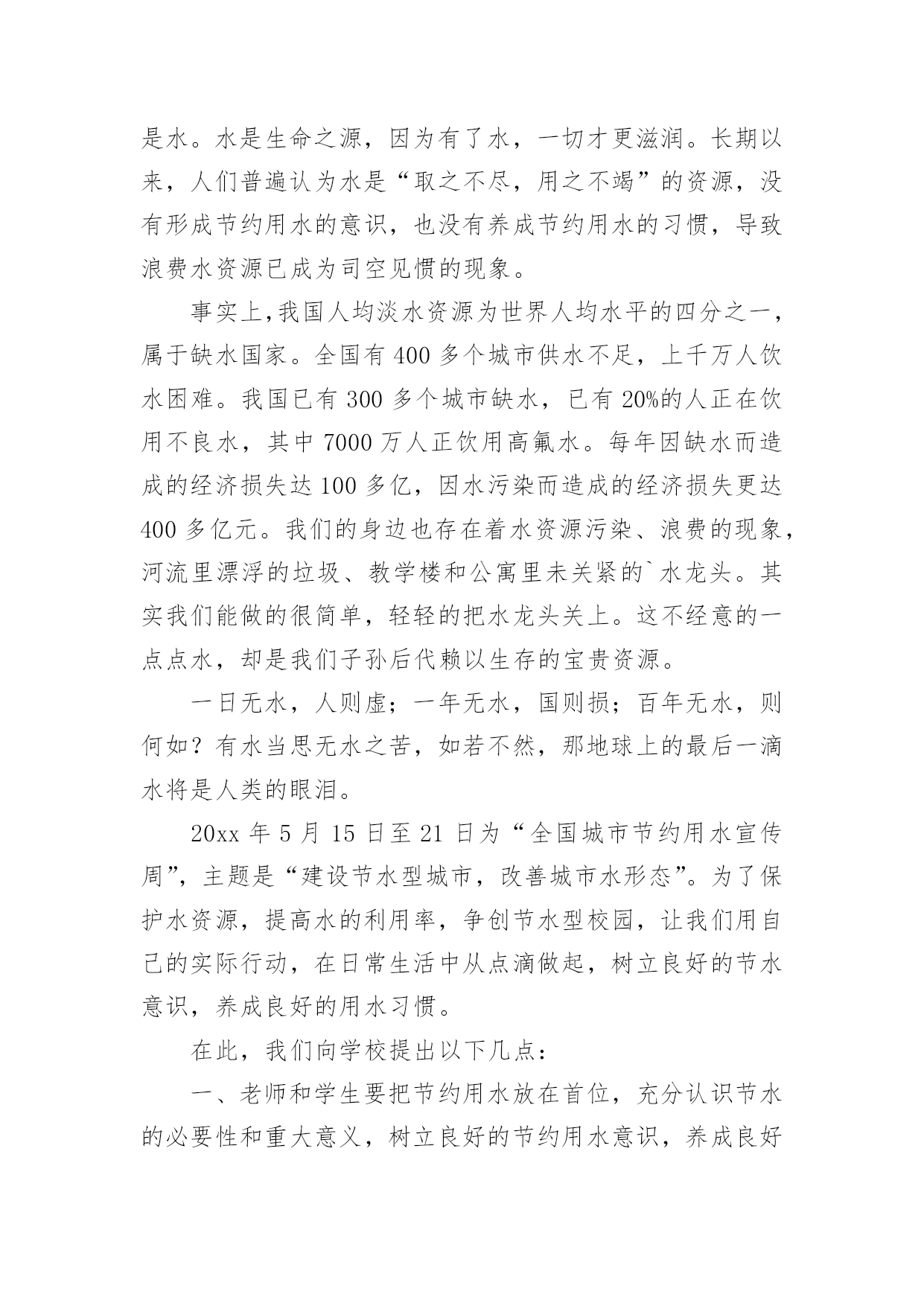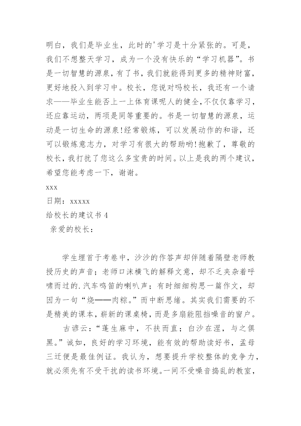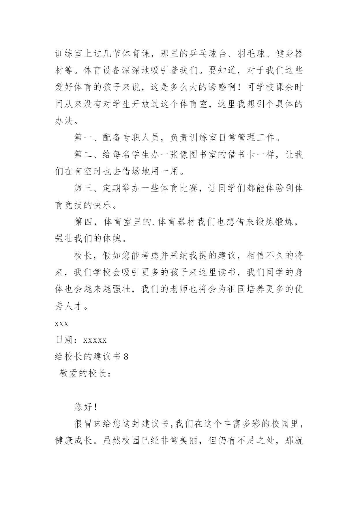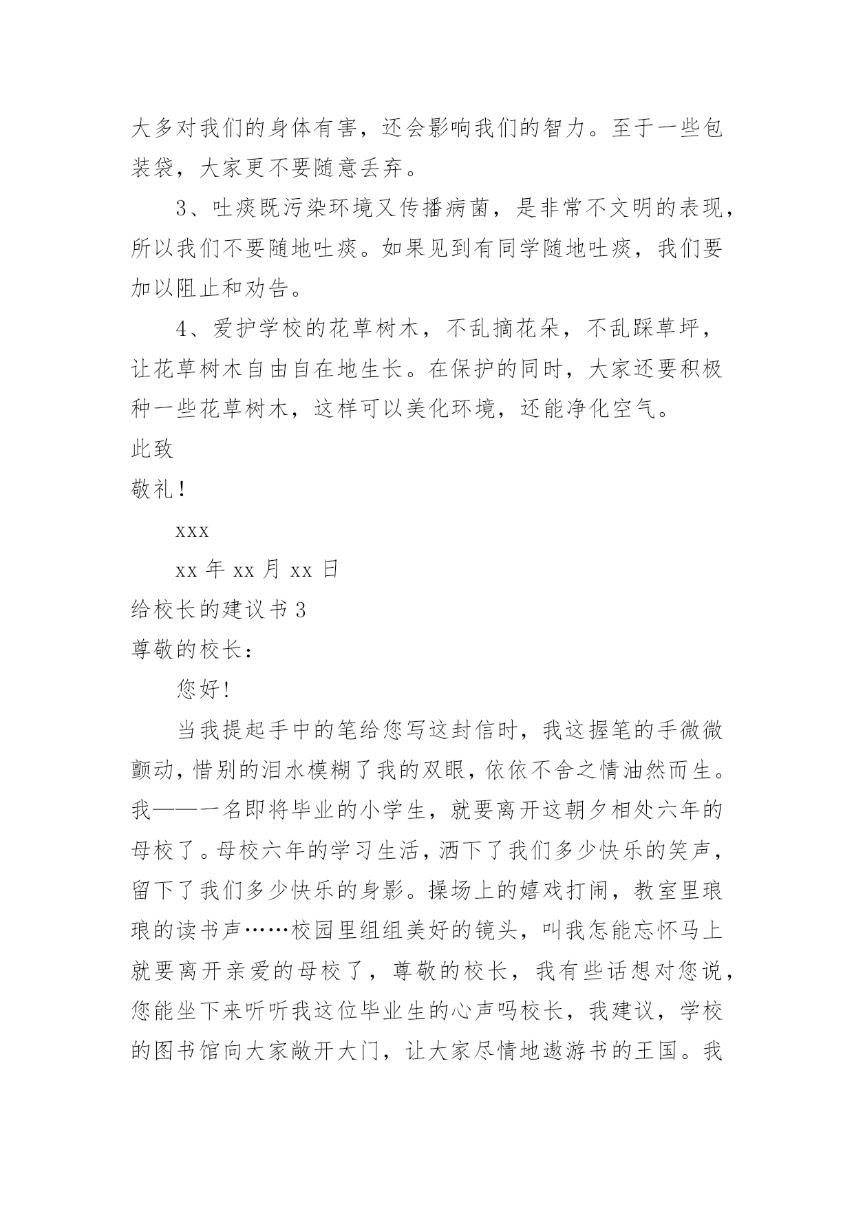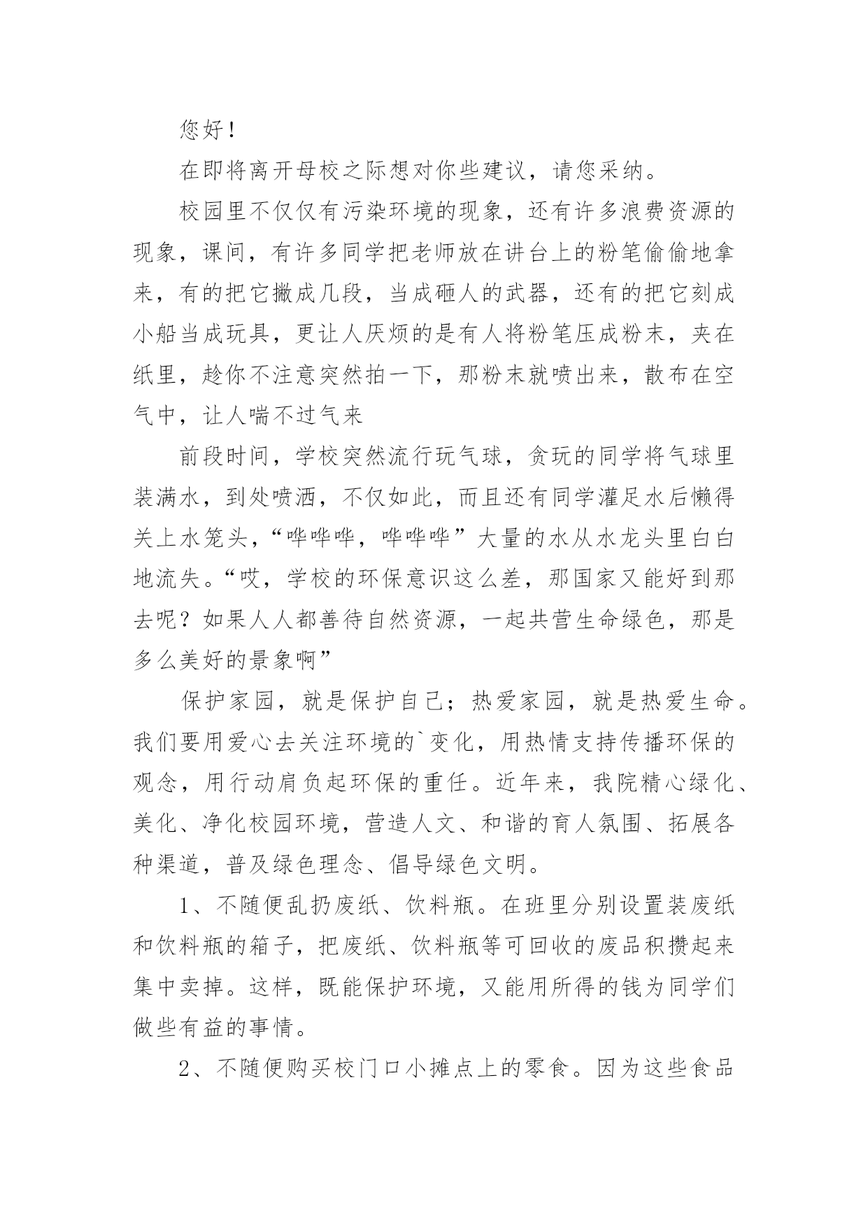 给校长的建议书(精华)给校长的建议书在充满活力,日益开放的今天,我们可以使用建议书的机会越来越多,建议书在写作上具有一定的格式要求。那么一般建议书是怎么写的呢?以下是小编精心整理的给校长的建议书,欢迎大家分享。给校长的建议书1亲爱的校长:您好!我是民主路小学一名六年级的学生,我在这里生活了六年了,虽然民主路小学是南宁市中的一所颇有名气的学校,但是还是有些不足之处,在此,我想给您提出几个建议。第一:学校的大门。我们学校的大门原来改建得很漂亮,安装了崭新的电动门。但是由于民主路的道路窄小,所以要扩建。现在,民主路修好了,为什么我们学校的'大门还没有修好呢同学们每天上学、放学都要出入校门,而学校却不建好校门,会给同学们带来诸多不便——那天,我放学回家,走出大门,就感到大门口尘土飞扬,风一吹,沙子就飘到我的眼睛里……我们应该把学校的大门口建好,弄得漂亮些,这样,如果有领导来,第一眼看到我们学校就会很满意,因为我们的大门很好,代表我们学校内部设施也很好。在此,我设计一个建学校大门的方案:大门口应该是绿色的,代表着我们学校是花园式的学校,学校大门旁边应该挂上校徽,写上我们学校的校则,周围再摆上一些花朵,就更美了。第二:学校的图书室。学校的图书室中的书虽然很多,但是至今还不够全。有一次,我和同学一起到图书室去借书,由于数奥比赛准备到来,我很想借几本关于数奥赛的书,但是,我几乎把整个图书室都翻遍了,就是找不到有讲解数奥题目的书,我沮丧极了。希望学校有关领导能及时地补充图书室里面的书本,满足各位同学渴望读书的需求。还有一次,我来到学校图书室,看到一个小妹妹在找书,我看着她在图书室里走了几个来回,问她要找什么书,她说,要找上次看的一本《鲁滨逊漂流记》的上册,这次找不到下册了,有了头却没有尾。于是,我和她在图书室里找,不一会儿,我就找到了,原来这本书挂在架子的上方,她根本看不到。所以,认为图书室应该把一些低年级同学经常看的书摆在架子下方,方便低年级的同学们寻找。我希望校长能够采纳我的意见,使我们的学校更加美丽。此致敬礼xxx日期:xxxxx给校长的建议书2敬爱的校长:您好!在即将离开母校之际想对你些建议,请您采纳。校园里不仅仅有污染环境的现象,还有许多浪费资源的现象,课间,有许多同学把老师放在讲台上的粉笔偷偷地拿来,有的把它撇成几段,当成砸人的武器,还有的把它刻成小船当成玩具,更让人厌烦的是有人将粉笔压成粉末,夹在纸里,趁你不注意突然拍一下,那粉末就喷出来,散布在空气中,让人喘不过气来前段时间,学校突然流行玩气球,贪玩的同学将气球里装满水,到处喷洒,不仅如此,而且还有同学灌足水后懒得关上水笼头,“哗哗哗,哗哗哗”大量的水从水龙头里白白地流失。“哎,学校的环保意识这么差,那国家又能好到那去呢?如果人人都善待自然资源,一起共营生命绿色,那是多么美好的景象啊”保护家园,就是保护自己;热爱家园,就是热爱生命。我们要用爱心去关注环境的`变化,用热情支持传播环保的观念,用行动肩负起环保的重任。近年来,我院精心绿化、美化、净化校园环境,营造人文、和谐的育人氛围、拓展各种渠道,普及绿色理念、倡导绿色文明。1、不随便乱扔废纸、饮料瓶。在班里分别设置装废纸和饮料瓶的箱子,把废纸、饮料瓶等可回收的废品积攒起来集中卖掉。这样,既能保护环境,又能用所得的钱为同学们做些有益的事情。2、不随便购买校门口小摊点上的零食。因为这些食品大多对我们的身体有害,还会影响我们的智力。至于一些包装袋,大家更不要随意丢弃。3、吐痰既污染环境又传播病菌,是非常不文明的表现,所以我们不要随地吐痰。如果见到有同学随地吐痰,我们要加以阻止和劝告。4、爱护学校的花草树木,不乱摘花朵,不乱踩草坪,让花草树木自由自在地生长。在保护的同时,大家还要积极种一些花草树木,这样可以美化环境,还能净化空气。此致敬礼!xxxxx年xx月xx日给校长的建议书3尊敬的校长:您好!当我提起手中的笔给您写这封信时,我这握笔的手微微颤动,惜别的泪水模糊了我的双眼,依依不舍之情油然而生。我——一名即将毕业的小学生,就要离开这朝夕相处六年的母校了。母校六年的学习生活,洒下了我们多少快乐的笑声,留下了我们多少快乐的身影。操场上的嬉戏打闹,教室里琅琅的读书声……校园里组组美好的镜头,叫我怎能忘怀马上就要离开亲爱的母校了,尊敬的校长,我有些话想对您说,您能坐下来听听我这位毕业生的心声吗校长,我建议,学校的图书馆向大家敞开大门,让大家尽情地遨游书的王国。我明白,我们是毕业生,此时的'学习是十分紧张的。可是,我们不想整天学习,成为一个没有快乐的“学习机器”。书是一切智慧的源泉,有了书,我们就能得到更多的精神财富,更好地投入到学习中。校长,您说对吗校长,我还有一个请求——毕业生能否上一上体育课呢人的健全,不仅仅靠学习,还应靠运动,两项是同等