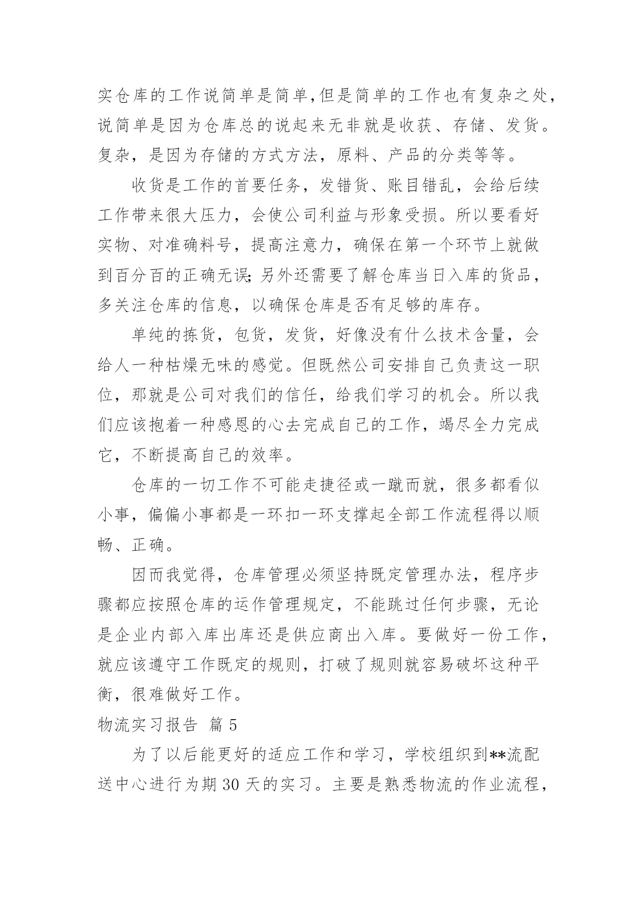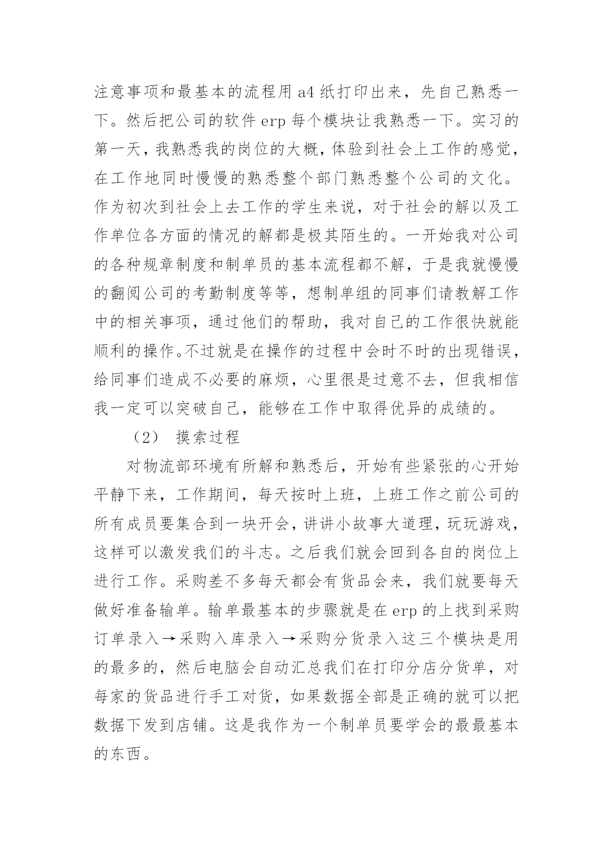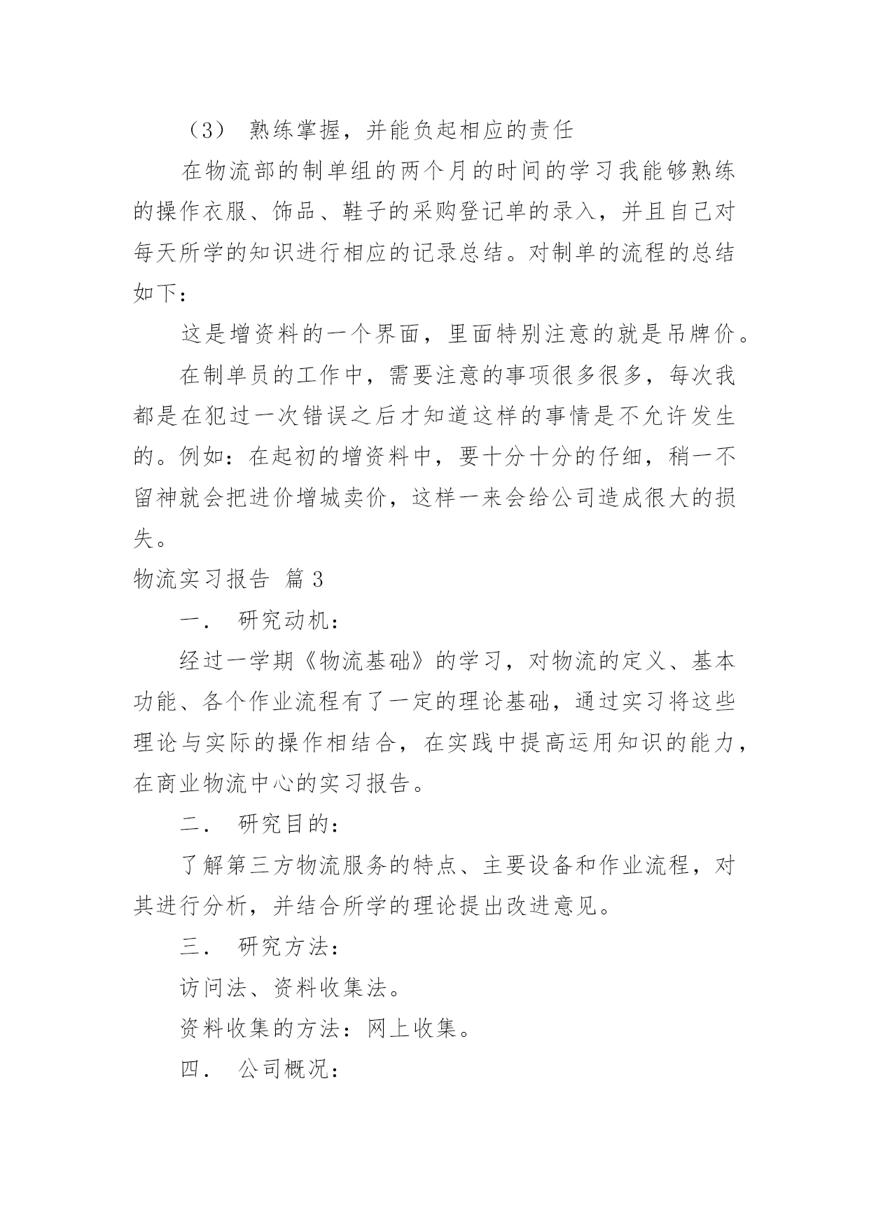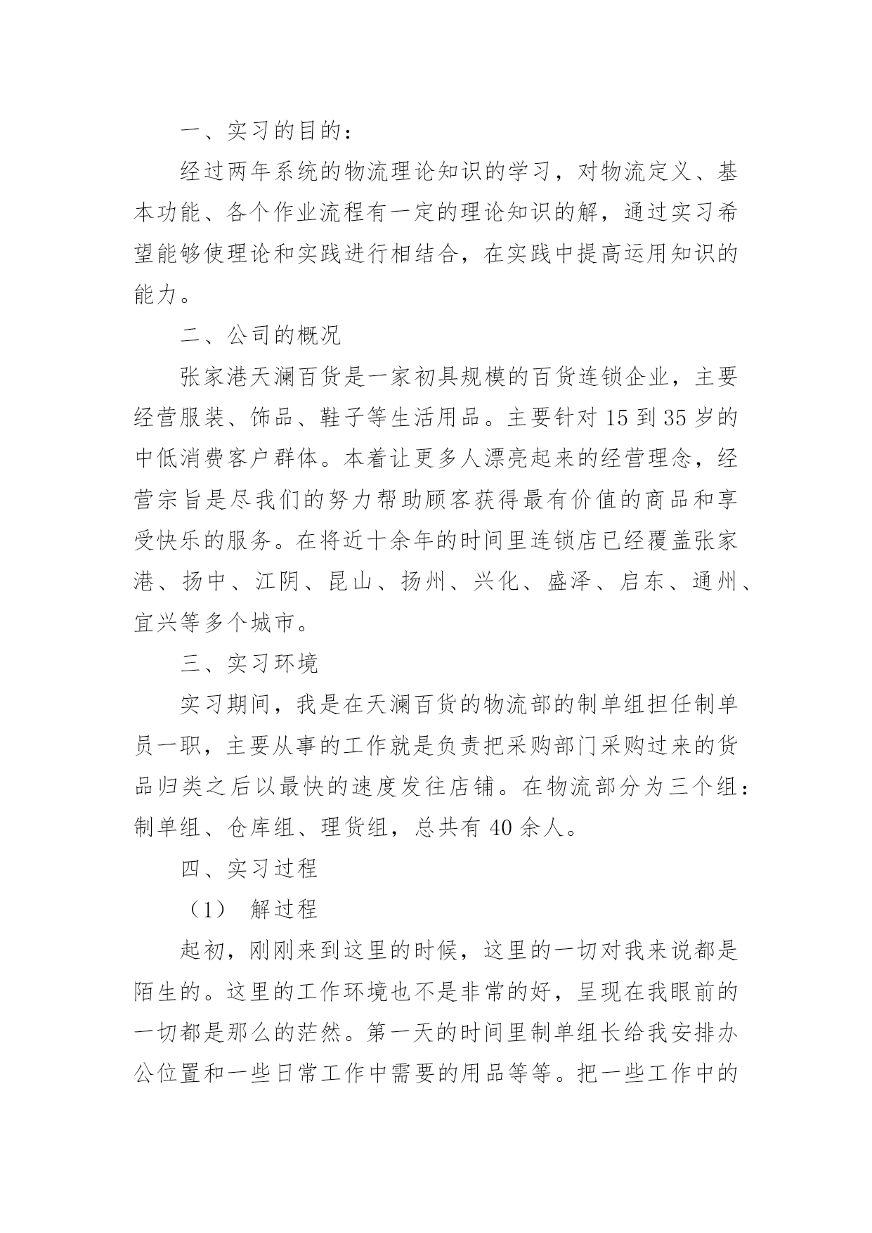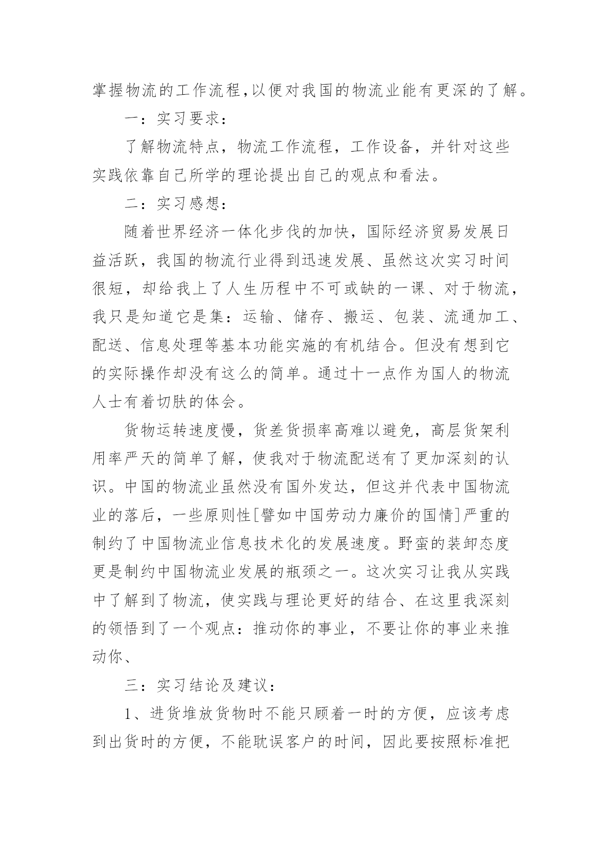 物流实习报告关于物流实习报告模板汇编9篇随着个人的文明素养不断提升,越来越多人会去使用报告,报告中提到的所有信息应该是准确无误的。你所见过的报告是什么样的呢?以下是小编为大家整理的物流实习报告9篇,希望能够帮助到大家。物流实习报告篇1时间过得太快了,这也将是我写的最后一篇周记了,我也要真真正正的离开学校了,以前盼望着上班倒真的离开了,还真有些不舍的,不舍得我的同学,我的宿舍,以及大学校园里的点点滴滴,那里有我青春的印记,有我年少的青涩,离开以后我就真的长大了,背着责任,离开生活两年多的校园在这段实习的日子里,我学到了很多书本上学不到的东西。现在的我不再是那个什么都不懂得小小子了,有自己的见解,也可以独立去面对工作中所遇到的一切问题。不会畏惧一切困难,在实习期间我们接触社会,面对社会上的一切美好的,黑暗的事物。去磨练自己的意志,锻炼自己的各方面才能,发觉自己的潜力。在这段时间,我收获的东西真是数不胜数呀.这将是我以后工作的经验啊物流实习报告篇2一、实习的目的:经过两年系统的物流理论知识的学习,对物流定义、基本功能、各个作业流程有一定的理论知识的解,通过实习希望能够使理论和实践进行相结合,在实践中提高运用知识的能力。二、公司的概况张家港天澜百货是一家初具规模的百货连锁企业,主要经营服装、饰品、鞋子等生活用品。主要针对15到35岁的中低消费客户群体。本着让更多人漂亮起来的经营理念,经营宗旨是尽我们的努力帮助顾客获得最有价值的商品和享受快乐的服务。在将近十余年的时间里连锁店已经覆盖张家港、扬中、江阴、昆山、扬州、兴化、盛泽、启东、通州、宜兴等多个城市。三、实习环境实习期间,我是在天澜百货的物流部的制单组担任制单员一职,主要从事的工作就是负责把采购部门采购过来的货品归类之后以最快的速度发往店铺。在物流部分为三个组:制单组、仓库组、理货组,总共有40余人。四、实习过程(1)解过程起初,刚刚来到这里的时候,这里的一切对我来说都是陌生的。这里的工作环境也不是非常的好,呈现在我眼前的一切都是那么的茫然。第一天的时间里制单组长给我安排办公位置和一些日常工作中需要的用品等等。把一些工作中的注意事项和最基本的流程用a4纸打印出来,先自己熟悉一下。然后把公司的软件erp每个模块让我熟悉一下。实习的第一天,我熟悉我的岗位的大概,体验到社会上工作的感觉,在工作地同时慢慢的熟悉整个部门熟悉整个公司的文化。作为初次到社会上去工作的学生来说,对于社会的解以及工作单位各方面的情况的解都是极其陌生的。一开始我对公司的各种规章制度和制单员的基本流程都不解,于是我就慢慢的翻阅公司的考勤制度等等,想制单组的同事们请教解工作中的相关事项,通过他们的帮助,我对自己的工作很快就能顺利的操作。不过就是在操作的过程中会时不时的出现错误,给同事们造成不必要的麻烦,心里很是过意不去,但我相信我一定可以突破自己,能够在工作中取得优异的成绩的。(2)摸索过程对物流部环境有所解和熟悉后,开始有些紧张的心开始平静下来,工作期间,每天按时上班,上班工作之前公司的所有成员要集合到一块开会,讲讲小故事大道理,玩玩游戏,这样可以激发我们的斗志。之后我们就会回到各自的岗位上进行工作。采购差不多每天都会有货品会来,我们就要每天做好准备输单。输单最基本的步骤就是在erp的上找到采购订单录入→采购入库录入→采购分货录入这三个模块是用的最多的,然后电脑会自动汇总我们在打印分店分货单,对每家的货品进行手工对货,如果数据全部是正确的就可以把数据下发到店铺。这是我作为一个制单员要学会的最最基本的东西。(3)熟练掌握,并能负起相应的责任在物流部的制单组的两个月的时间的学习我能够熟练的操作衣服、饰品、鞋子的采购登记单的录入,并且自己对每天所学的知识进行相应的记录总结。对制单的流程的总结如下:这是增资料的一个界面,里面特别注意的就是吊牌价。在制单员的工作中,需要注意的事项很多很多,每次我都是在犯过一次错误之后才知道这样的事情是不允许发生的。例如:在起初的增资料中,要十分十分的仔细,稍一不留神就会把进价增城卖价,这样一来会给公司造成很大的损失。物流实习报告篇3一.研究动机:经过一学期《物流基础》的学习,对物流的定义、基本功能、各个作业流程有了一定的理论基础,通过实习将这些理论与实际的操作相结合,在实践中提高运用知识的能力,在商业物流中心的实习报告。二.研究目的:了解第三方物流服务的特点、主要设备和作业流程,对其进行分析,并结合所学的理论提出改进意见。三.研究方法:访问法、资料收集法。资料收集的方法:网上收集。四.公司概况:1.基本情况:上海商业物流中心位于曹杨路1500号,交于铜川路,比邻武宁路,交通便捷,与上海西站及其铁路沿线仅一步之遥;地处内环线与外环线之间,距离内环线1.5公里,外环线3.5公里,并且距离沪宁和沪嘉