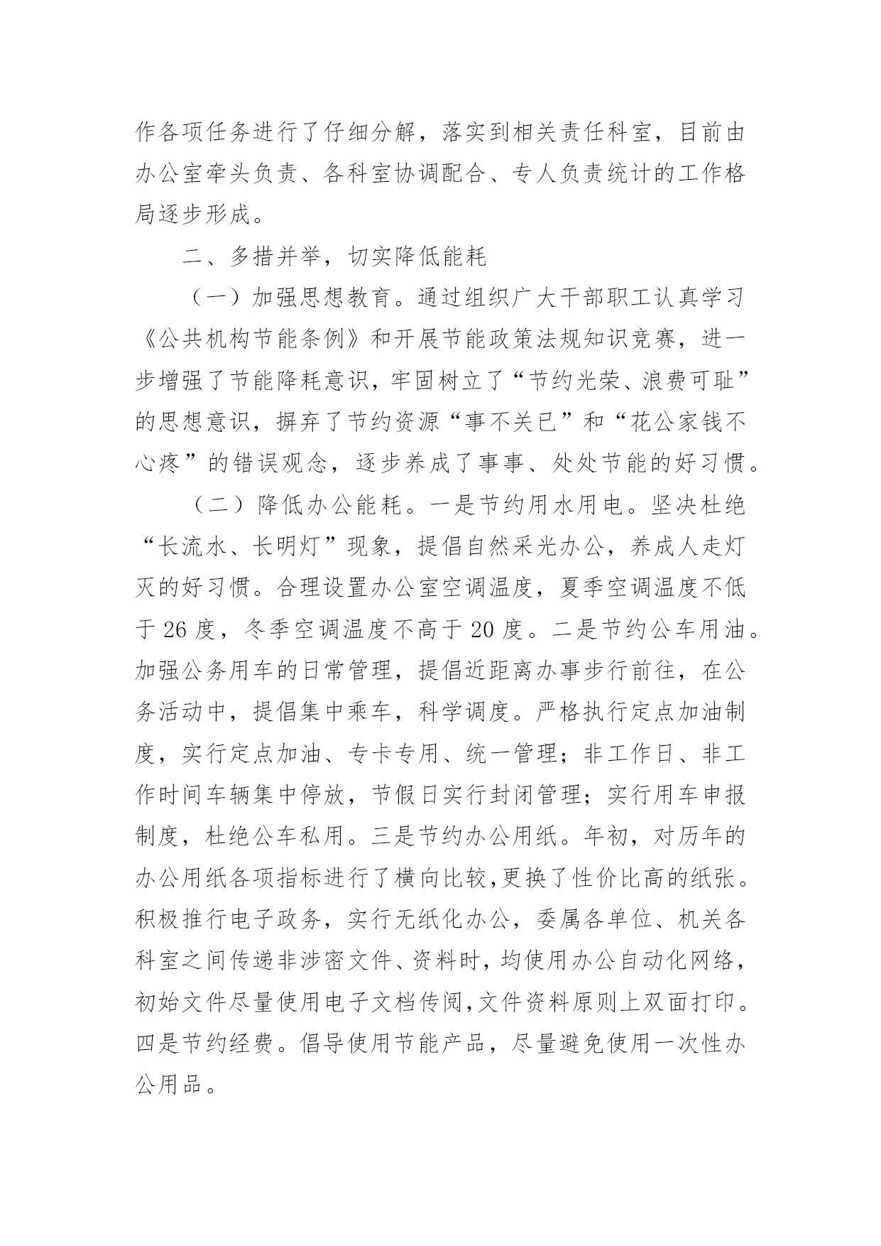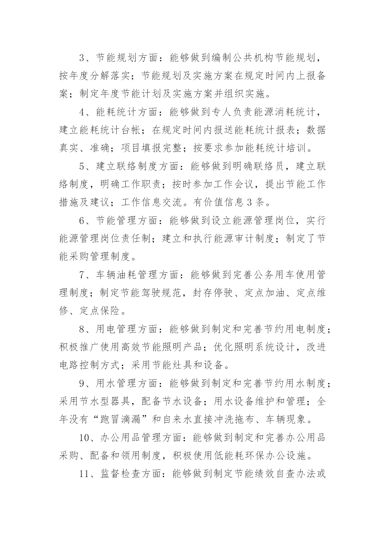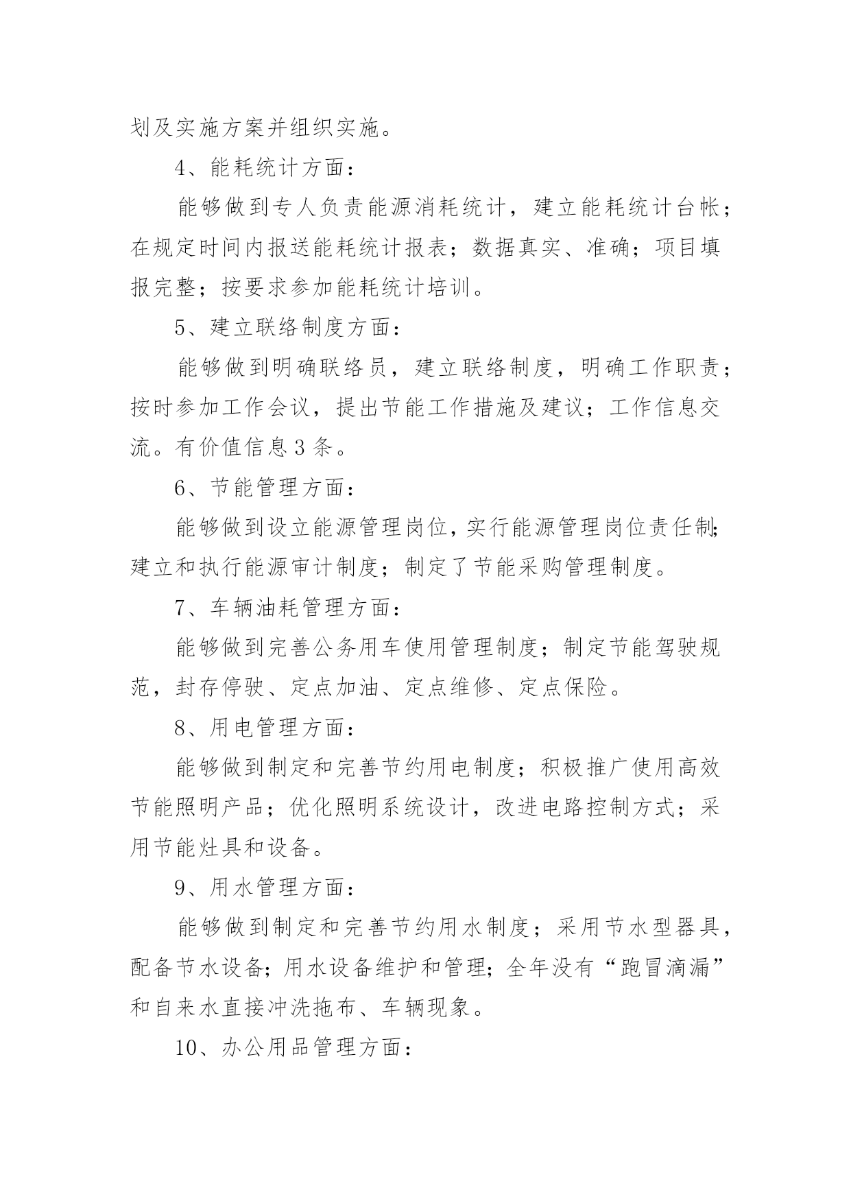 公共机构节能情况自查报告在当下这个社会中,报告的适用范围越来越广泛,报告中提到的所有信息应该是准确无误的。一听到写报告就拖延症懒癌齐复发?以下是小编精心整理的公共机构节能情况自查报告,供大家参考借鉴,希望可以帮助到有需要的朋友。公共机构节能情况自查报告1为了推动公共机构节能,提高公共机构能源利用效率,依法推进全乡公共机构节能工作,乡公共机构节能工作领导小组成员组成节能绩效自查小组,对全乡进行绩效自查。绩效自查采取“听、查、评”的方式进行:听取公共机构节能工作情况汇报、核实验证并根据检查情况按照《xx乡公共机构节能工作绩效考核评分标准》逐项进行打分。自查情况如下:1、组织领导方面:能够做到有管理组织和工作人员;将节能工作纳入全年工作计划,及时研究部署工作。2、宣传和培训方面:能够做到制定宣传培训计划;学习节能知识;全年组织节能宣传活动两次。3、节能规划方面:能够做到编制公共机构节能规划,按年度分解落实;节能规划及实施方案在规定时间内上报备案;制定年度节能计划及实施方案并组织实施。4、能耗统计方面:能够做到专人负责能源消耗统计,建立能耗统计台帐;在规定时间内报送能耗统计报表;数据真实、准确;项目填报完整;按要求参加能耗统计培训。5、建立联络制度方面:能够做到明确联络员,建立联络制度,明确工作职责;按时参加工作会议,提出节能工作措施及建议;工作信息交流。有价值信息3条。6、节能管理方面:能够做到设立能源管理岗位,实行能源管理岗位责任制;建立和执行能源审计制度;制定了节能采购管理制度。7、车辆油耗管理方面:能够做到完善公务用车使用管理制度;制定节能驾驶规范,封存停驶、定点加油、定点维修、定点保险。8、用电管理方面:能够做到制定和完善节约用电制度;积极推广使用高效节能照明产品;优化照明系统设计,改进电路控制方式;采用节能灶具和设备。9、用水管理方面:能够做到制定和完善节约用水制度;采用节水型器具,配备节水设备;用水设备维护和管理;全年没有“跑冒滴漏”和自来水直接冲洗拖布、车辆现象。10、办公用品管理方面:能够做到制定和完善办公用品采购、配备和领用制度,积极使用低能耗环保办公设施。11、监督检查方面:能够做到制定节能绩效自查办法或标准;定期开展节能专项监督检查,奖惩公示。对公共机构节能绩效自查的最终结果予以通报,并评选出公共机构节能工作先进单位和先进个人;对考核成绩不达标的或出现严重能源浪费行为的.予以批评,限期改正并在一个月内向乡政府作出书面报告并提交整改方案。全乡公共机构节能工作全面纳入乡政府绩效自查,占有一定的分值比例,实行量化考核,自查结果作为乡政府对公共机构领导班子和部门领导干部绩效考核评价的重要依据。公共机构节能情况自查报告2按照《xx县人民政府关于深入推进公共机构节能工作的意见》要求,县住建委高度重视,结合自身实际,理清思路、细化措施,对机关各科室及委属各单位的节能工作进行了全面彻查,现将自查情况报告如下:一、高度重视,加强组织领导为进一步加强公共机构节能管理,我委将节能工作纳入重要议事日程,成立了由主要领导任组长,各分管领导任副组长,各科室、单位主要负责人为成员的节能工作推进领导小组,不定期进行督导,对工作中遇到的问题及时进行研究,确保落实好节约资源能源的各项要求。同时,将节能降耗工作各项任务进行了仔细分解,落实到相关责任科室,目前由办公室牵头负责、各科室协调配合、专人负责统计的工作格局逐步形成。二、多措并举,切实降低能耗(一)加强思想教育。通过组织广大干部职工认真学习《公共机构节能条例》和开展节能政策法规知识竞赛,进一步增强了节能降耗意识,牢固树立了“节约光荣、浪费可耻”的思想意识,摒弃了节约资源“事不关已”和“花公家钱不心疼”的错误观念,逐步养成了事事、处处节能的好习惯。(二)降低办公能耗。一是节约用水用电。坚决杜绝“长流水、长明灯”现象,提倡自然采光办公,养成人走灯灭的好习惯。合理设置办公室空调温度,夏季空调温度不低于26度,冬季空调温度不高于20度。二是节约公车用油。加强公务用车的日常管理,提倡近距离办事步行前往,在公务活动中,提倡集中乘车,科学调度。严格执行定点加油制度,实行定点加油、专卡专用、统一管理;非工作日、非工作时间车辆集中停放,节假日实行封闭管理;实行用车申报制度,杜绝公车私用。三是节约办公用纸。年初,对历年的办公用纸各项指标进行了横向比较,更换了性价比高的纸张。积极推行电子政务,实行无纸化办公,委属各单位、机关各科室之间传递非涉密文件、资料时,均使用办公自动化网络,初始文件尽量使用电子文档传阅,文件资料原则上双面打印。四是节约经费。倡导使用节能产品,尽量避免使用一次性办公用品。(三)创新节能机制。每周各科室、单位向办公室报送能源资源统计报表,同步实施能耗监测和统计报告专人负责制,及时掌握全委能源消