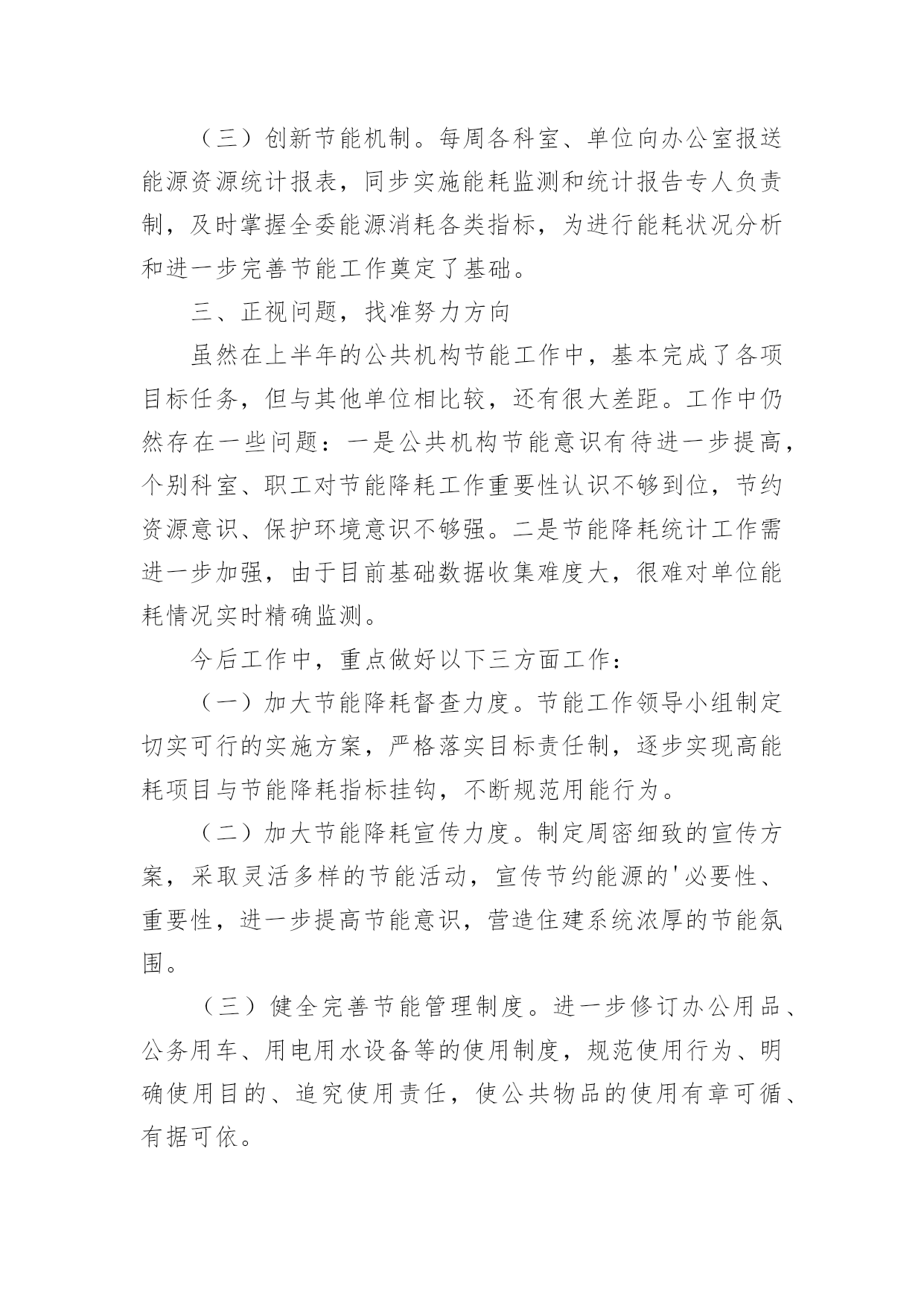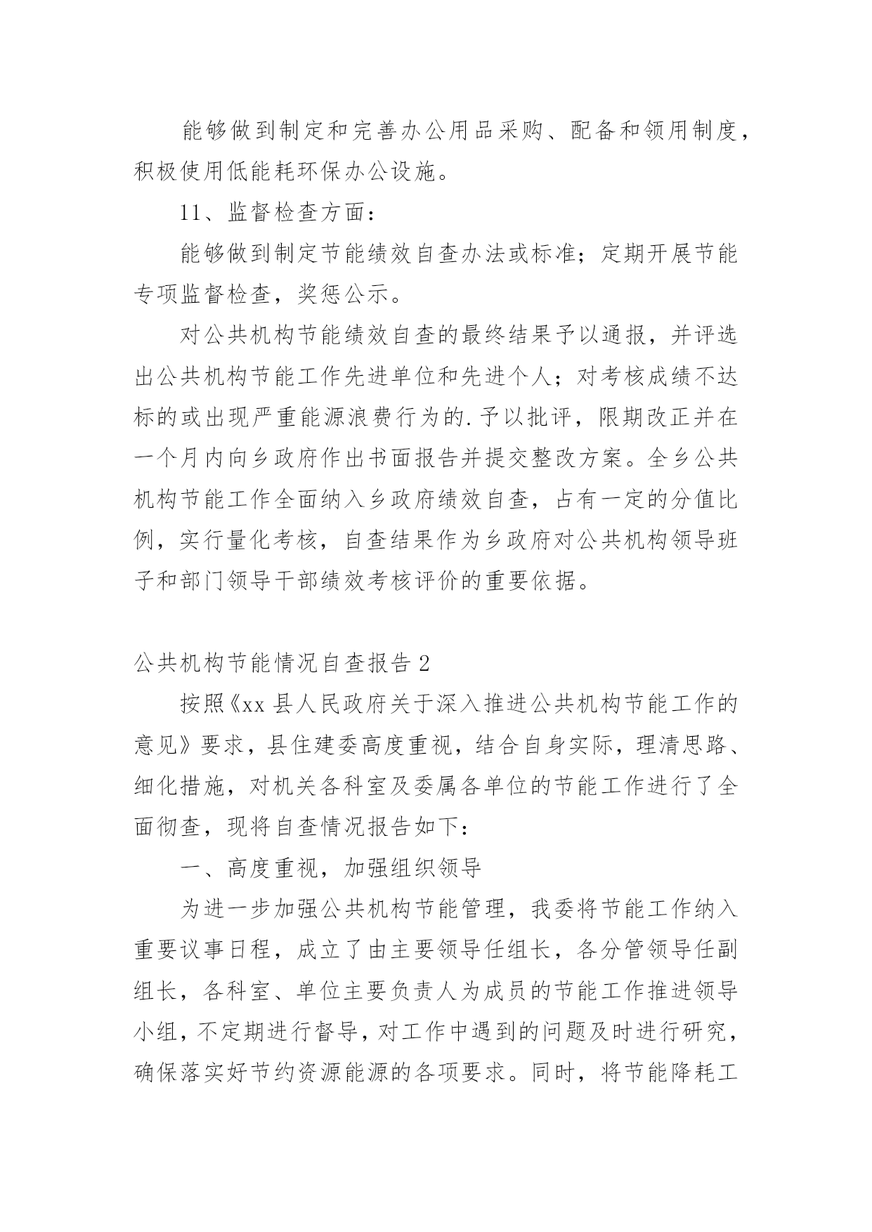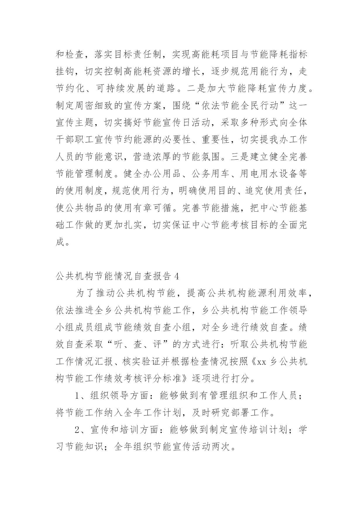 公共机构节能情况自查报告在当下这个社会中,报告的适用范围越来越广泛,报告中提到的所有信息应该是准确无误的。一听到写报告就拖延症懒癌齐复发?以下是小编精心整理的公共机构节能情况自查报告,供大家参考借鉴,希望可以帮助到有需要的朋友。公共机构节能情况自查报告1为了推动公共机构节能,提高公共机构能源利用效率,依法推进全乡公共机构节能工作,乡公共机构节能工作领导小组成员组成节能绩效自查小组,对全乡进行绩效自查。绩效自查采取“听、查、评”的方式进行:听取公共机构节能工作情况汇报、核实验证并根据检查情况按照《xx乡公共机构节能工作绩效考核评分标准》逐项进行打分。自查情况如下:1、组织领导方面:能够做到有管理组织和工作人员;将节能工作纳入全年工作计划,及时研究部署工作。2、宣传和培训方面:能够做到制定宣传培训计划;学习节能知识;全年组织节能宣传活动两次。3、节能规划方面:能够做到编制公共机构节能规划,按年度分解落实;节能规划及实施方案在规定时间内上报备案;制定年度节能计划及实施方案并组织实施。4、能耗统计方面:能够做到专人负责能源消耗统计,建立能耗统计台帐;在规定时间内报送能耗统计报表;数据真实、准确;项目填报完整;按要求参加能耗统计培训。5、建立联络制度方面:能够做到明确联络员,建立联络制度,明确工作职责;按时参加工作会议,提出节能工作措施及建议;工作信息交流。有价值信息3条。6、节能管理方面:能够做到设立能源管理岗位,实行能源管理岗位责任制;建立和执行能源审计制度;制定了节能采购管理制度。7、车辆油耗管理方面:能够做到完善公务用车使用管理制度;制定节能驾驶规范,封存停驶、定点加油、定点维修、定点保险。8、用电管理方面:能够做到制定和完善节约用电制度;积极推广使用高效节能照明产品;优化照明系统设计,改进电路控制方式;采用节能灶具和设备。9、用水管理方面:能够做到制定和完善节约用水制度;采用节水型器具,配备节水设备;用水设备维护和管理;全年没有“跑冒滴漏”和自来水直接冲洗拖布、车辆现象。10、办公用品管理方面:能够做到制定和完善办公用品采购、配备和领用制度,积极使用低能耗环保办公设施。11、监督检查方面:能够做到制定节能绩效自查办法或标准;定期开展节能专项监督检查,奖惩公示。对公共机构节能绩效自查的最终结果予以通报,并评选出公共机构节能工作先进单位和先进个人;对考核成绩不达标的或出现严重能源浪费行为的.予以批评,限期改正并在一个月内向乡政府作出书面报告并提交整改方案。全乡公共机构节能工作全面纳入乡政府绩效自查,占有一定的分值比例,实行量化考核,自查结果作为乡政府对公共机构领导班子和部门领导干部绩效考核评价的重要依据。公共机构节能情况自查报告2按照《xx县人民政府关于深入推进公共机构节能工作的意见》要求,县住建委高度重视,结合自身实际,理清思路、细化措施,对机关各科室及委属各单位的节能工作进行了全面彻查,现将自查情况报告如下:一、高度重视,加强组织领导为进一步加强公共机构节能管理,我委将节能工作纳入重要议事日程,成立了由主要领导任组长,各分管领导任副组长,各科室、单位主要负责人为成员的节能工作推进领导小组,不定期进行督导,对工作中遇到的问题及时进行研究,确保落实好节约资源能源的各项要求。同时,将节能降耗工作各项任务进行了仔细分解,落实到相关责任科室,目前由办公室牵头负责、各科室协调配合、专人负责统计的工作格局逐步形成。二、多措并举,切实降低能耗(一)加强思想教育。通过组织广大干部职工认真学习《公共机构节能条例》和开展节能政策法规知识竞赛,进一步增强了节能降耗意识,牢固树立了“节约光荣、浪费可耻”的思想意识,摒弃了节约资源“事不关已”和“花公家钱不心疼”的错误观念,逐步养成了事事、处处节能的好习惯。(二)降低办公能耗。一是节约用水用电。坚决杜绝“长流水、长明灯”现象,提倡自然采光办公,养成人走灯灭的好习惯。合理设置办公室空调温度,夏季空调温度不低于26度,冬季空调温度不高于20度。二是节约公车用油。加强公务用车的日常管理,提倡近距离办事步行前往,在公务活动中,提倡集中乘车,科学调度。严格执行定点加油制度,实行定点加油、专卡专用、统一管理;非工作日、非工作时间车辆集中停放,节假日实行封闭管理;实行用车申报制度,杜绝公车私用。三是节约办公用纸。年初,对历年的办公用纸各项指标进行了横向比较,更换了性价比高的纸张。积极推行电子政务,实行无纸化办公,委属各单位、机关各科室之间传递非涉密文件、资料时,均使用办公自动化网络,初始文件尽量使用电子文档传阅,文件资料原则上双面打印。四是节约经费。倡导使用节能产品,尽量避免使用一次性办公用品。(三)创新节能机制。每周各科室、单位向办公室报送能源资源统计报表,同步实施能耗监测和统计报告专人负责制,及时掌握全委能源消