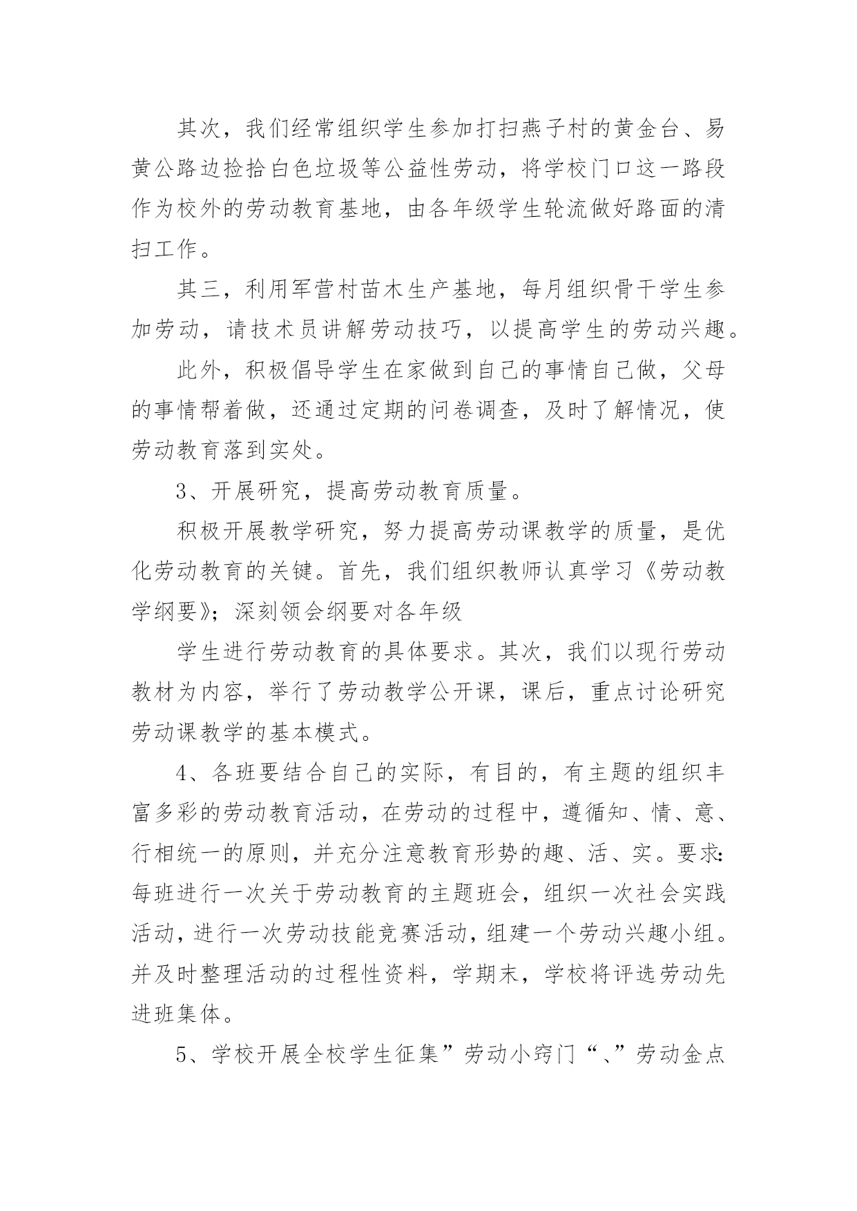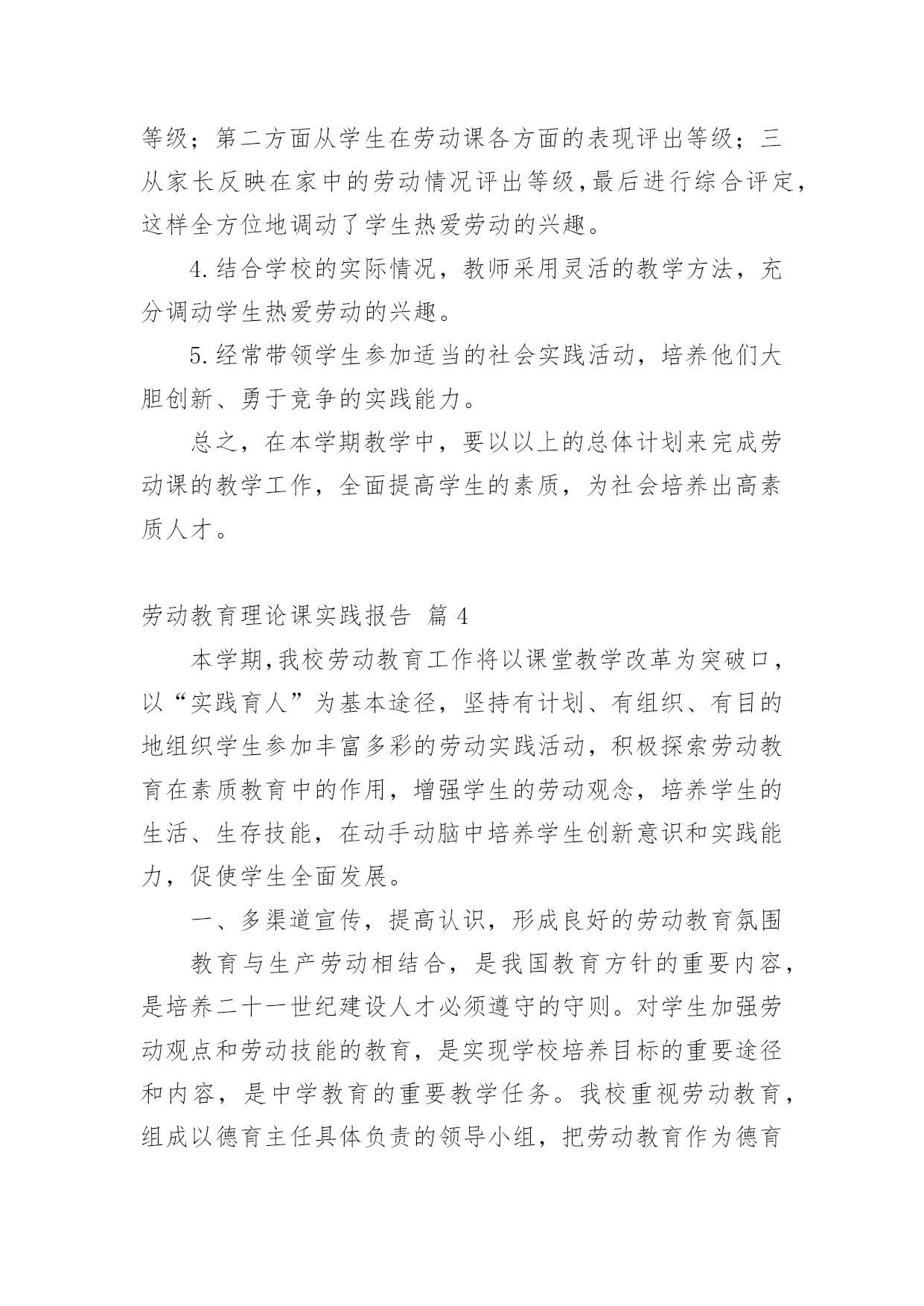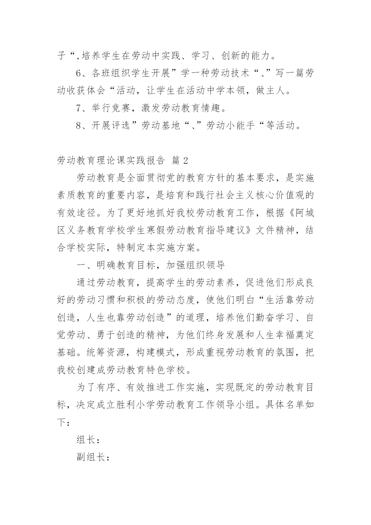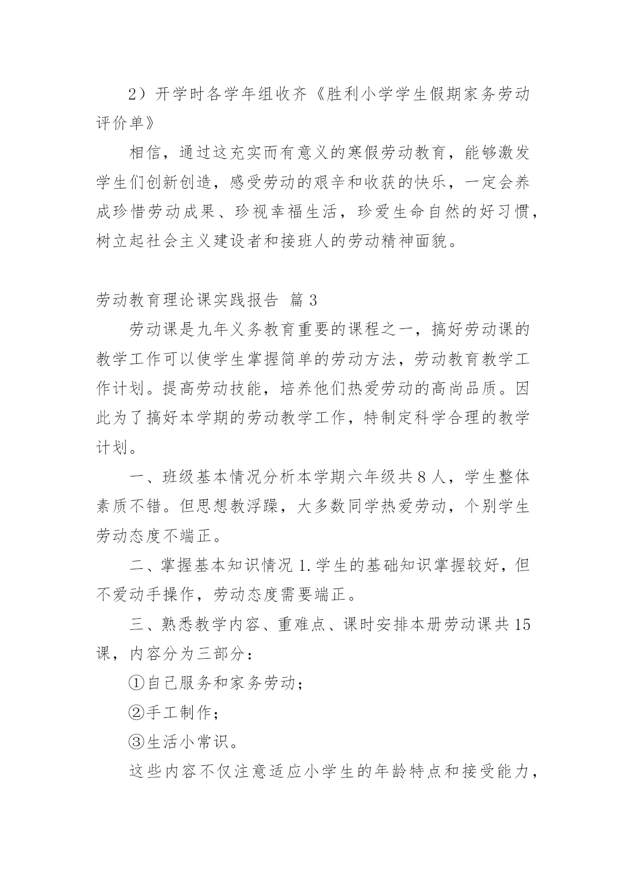 劳动教育理论课实践报告劳动教育理论课实践报告(精选13篇)转眼难忘的社会实践生活就已结束了,想必你的视野也得到了开拓,此时需要写一份实践报告,做好总结。那么如何把实践报告写出新花样呢?以下是小编收集整理的劳动教育理论课实践报告,仅供参考,大家一起来看看吧。劳动教育理论课实践报告篇1一、指导思想:为了认真贯彻中共中央、国务院召开的全国教育工作会议精神,落实《中共中央国务院关于深化教育改革全面推进素质教育的决定》和《面向21世纪教育振兴行动计划》,进一步全面推进素质教育,促进学生的全面发展。二、教育目标:1、从小培养学生的劳动意识及其良好的行为习惯,促进学生健全人格的发展。在家能帮助父母做些力所及的家务劳动。在校能完成打扫卫生等基本的劳动。2、通过劳动基地等劳动,做到良好习惯的培养和不良习惯的矫正相结合,促进学生的健康,使学生掌握一些基本的劳动技术及热爱劳动的品质。3、教师从理论与实践的结合上探讨中小学阶段学生劳动意识的形成、范围及培养途径。三、具体措施:1、加强学习,确立劳动教育的地位。每学期初组织教师进一步学习教育方针,认识“五育‘发展的`整体性和全面性;学习《中共中央关于改革和加强中小学德育工作的通知》和国家教委《关于进一步加强中小学德育工作的几点意见》,从培养目标的高度,更多理解劳动教育的重要性和迫切性。学习《劳动教学纲要》,明确劳动教育的目的、任务和要求。学习各地劳动教育的先进经验,增强教育工作的时代感。同时,利用家长会,宣传劳动教育的意义和劳动教育的重要性,要求家长协助学校开展这方面的教育。做好”三保证“:我们把劳动教育列入工作计划,学期结束时评估优劣。二要订好劳动教材和手工劳动材料,做到人手一册,一人一份,保证劳动教育材料。三要建立劳动教育检查制度,保证劳动教育的正常性。从而确立了劳动教育的地们,促进了劳动教育的顺利开展。2、因地制宜,开辟劳动教育基地。劳动基地是进行劳动教育的物质保证。我们除在劳动课中认真进行爱劳动的教育和手工劳动实践外,还从实际出发,因地制宜,促进劳动基地的开辟与建立。首先,开辟校内的劳动教育基地。我校的外操场,一年要除草数次,以往都是由学校请校外的小工进行清除。近几年来,我们把这项工作作为学生进行劳动锻炼的一项任务,全部由学生承担。学校的绿化带、花坛和草坪,事地也不少,我们将划分给班级包干,负责定期拔草、除虫等工作。其次,我们经常组织学生参加打扫燕子村的黄金台、易黄公路边捡拾白色垃圾等公益性劳动,将学校门口这一路段作为校外的劳动教育基地,由各年级学生轮流做好路面的清扫工作。其三,利用军营村苗木生产基地,每月组织骨干学生参加劳动,请技术员讲解劳动技巧,以提高学生的劳动兴趣。此外,积极倡导学生在家做到自己的事情自己做,父母的事情帮着做,还通过定期的问卷调查,及时了解情况,使劳动教育落到实处。3、开展研究,提高劳动教育质量。积极开展教学研究,努力提高劳动课教学的质量,是优化劳动教育的关键。首先,我们组织教师认真学习《劳动教学纲要》;深刻领会纲要对各年级学生进行劳动教育的具体要求。其次,我们以现行劳动教材为内容,举行了劳动教学公开课,课后,重点讨论研究劳动课教学的基本模式。4、各班要结合自己的实际,有目的,有主题的组织丰富多彩的劳动教育活动,在劳动的过程中,遵循知、情、意、行相统一的原则,并充分注意教育形势的趣、活、实。要求:每班进行一次关于劳动教育的主题班会,组织一次社会实践活动,进行一次劳动技能竞赛活动,组建一个劳动兴趣小组。并及时整理活动的过程性资料,学期末,学校将评选劳动先进班集体。5、学校开展全校学生征集”劳动小窍门“、”劳动金点子“,培养学生在劳动中实践、学习、创新的能力。6、各班组织学生开展”学一种劳动技术“、”写一篇劳动收获体会“活动,让学生在活动中学本领,做主人。7、举行竞赛,激发劳动教育情趣。8、开展评选”劳动基地“、”劳动小能手“等活动。劳动教育理论课实践报告篇2劳动教育是全面贯彻党的教育方针的基本要求,是实施素质教育的重要内容,是培育和践行社会主义核心价值观的有效途径。为了更好地抓好我校劳动教育工作,根据《阿城区义务教育学校学生寒假劳动教育指导建议》文件精神,结合学校实际,特制定本实施方案。一、明确教育目标,加强组织领导通过劳动教育,提高学生的劳动素养,促进他们形成良好的劳动习惯和积极的劳动态度,使他们明白“生活靠劳动创造,人生也靠劳动创造”的道理,培养他们勤奋学习、自觉劳动、勇于创造的精神,为他们终身发展和人生幸福奠定基础。统筹资源,构建模式,形成重视劳动教育的氛围,把我校创建成劳动教育特色学校。为了有序、有效推进工作实施,实现既定的劳动教育目标,决定成立胜利小学劳动教育工作领导小组。具体名单如下:组长:副组长:成员:二、坚持基本原则,发挥育人功能充分发挥劳动综合育人功能,